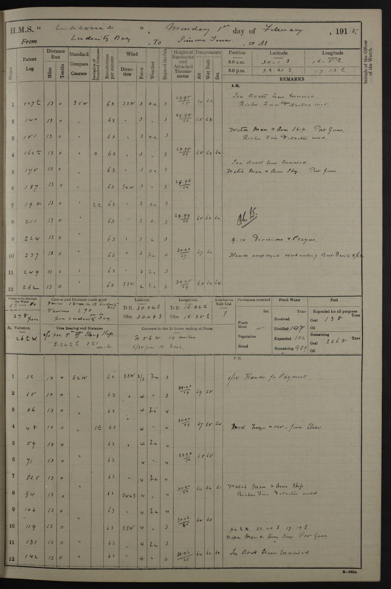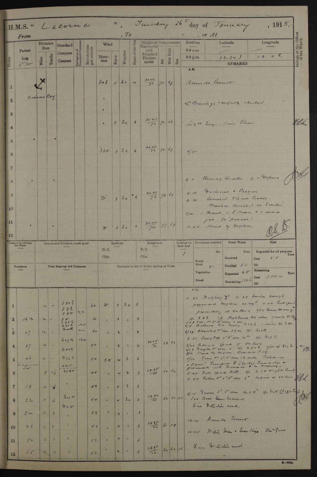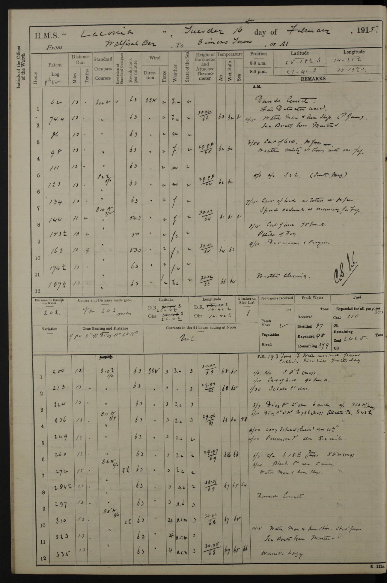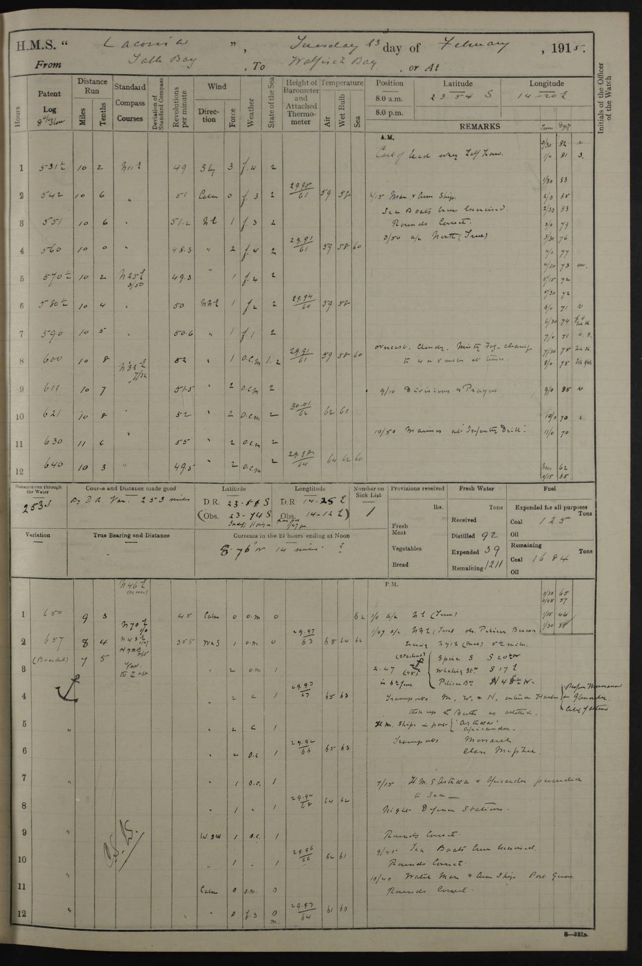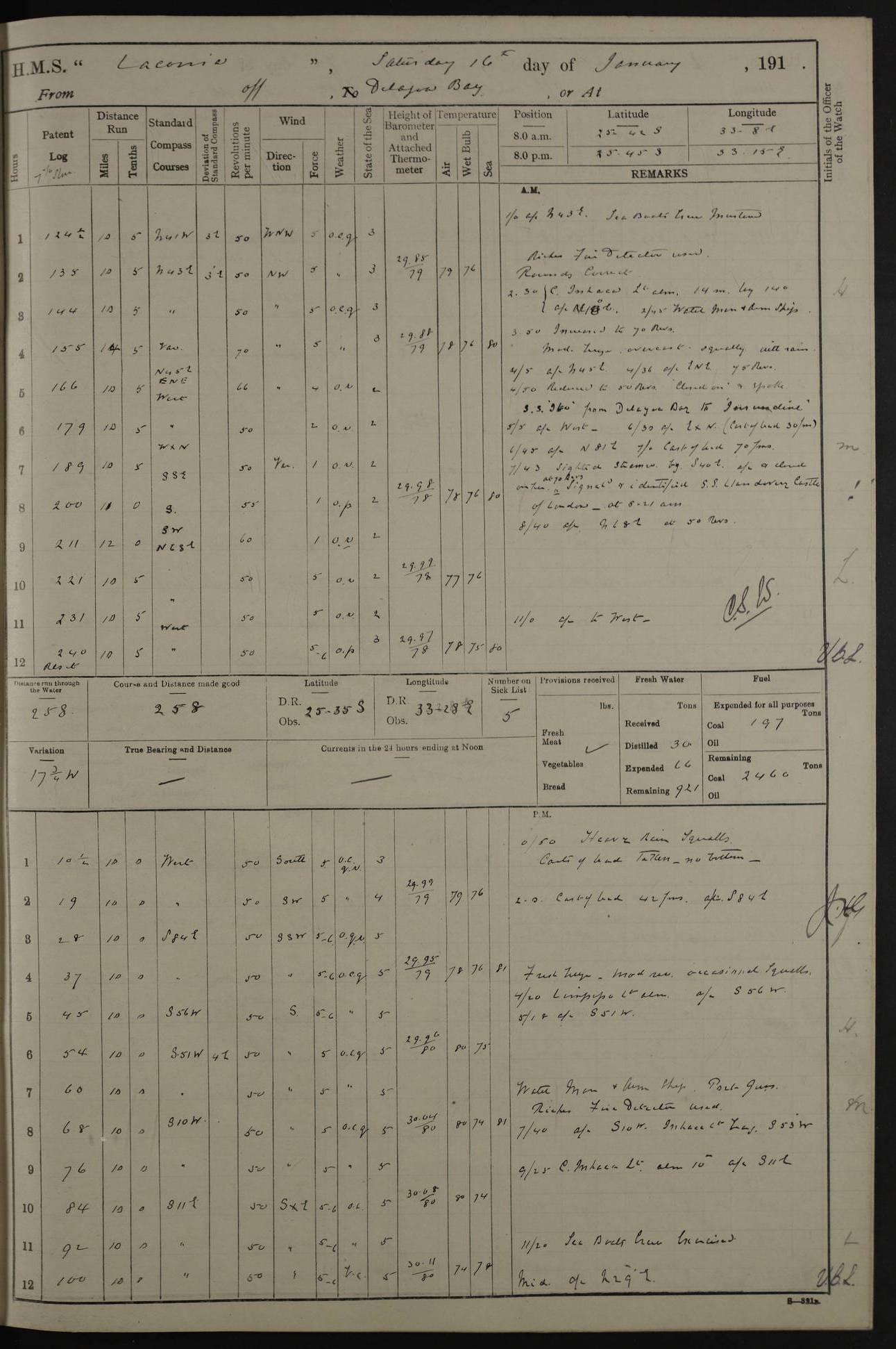 LOGS FOR JANUARY 1916 [Simonstown, Durban, to Kilindini with troops and Durban] 4caf8799cadfd3419701ba89: (http://oldweather.s3.amazonaws.com/ADM_53-45885/ADM 53-45885-001_0.jpg) 4caf8799cadfd3419701ba8a: (http://oldweather.s3.amazonaws.com/ADM_53-45885/ADM 53-45885-001_1.jpg) Cover, Adm. 53/45885, signed WRD Irvine. 4caf8799cadfd3419701ba8b: (http://oldweather.s3.amazonaws.com/ADM_53-45885/ADM 53-45885-002_0.jpg) 4caf8799cadfd3419701ba8c: (http://oldweather.s3.amazonaws.com/ADM_53-45885/ADM 53-45885-002_1.jpg) Dated 10th February 1916, signed CS Wills. 4caf8799cadfd3419701ba8d: (http://oldweather.s3.amazonaws.com/ADM_53-45885/ADM 53-45885-003_0.jpg) 4caf8799cadfd3419701ba8e: (http://oldweather.s3.amazonaws.com/ADM_53-45885/ADM 53-45885-003_1.jpg) 1 January 1916 Simonstown Lat -34.18, Long 18.43 Strong SSE winds, gale force 8 or 9 at times, all day. 10.00am: Commenced coaling. 3.00pm: One SBS to hospital, one Trimmer joined from same. 5.00pm: Read punishment warrants 22 and 23. One Fireman to cells. 7.45pm: Ceased coaling, 515 tons received. Sick list: 1. 4caf8799cadfd3419701ba8f: (http://oldweather.s3.amazonaws.com/ADM_53-45885/ADM 53-45885-004_0.jpg) 2 January 1916 Simonstown Lat -34.18, Long 18.43 SSE winds up to gale force 8 all day. 7.30am: Resumed coaling. 7.00pm: Two Firemen to cells. 8.00pm: Ceased coaling. 4caf8799cadfd3419701ba90: (http://oldweather.s3.amazonaws.com/ADM_53-45885/ADM 53-45885-004_1.jpg) 3 January 1916 Simonstown and at sea Lat -34.43, Long 18.81 Gale force winds at first, gradually abating to f 4 by noon. 7.00am: Wind moderating. 7.35am: Ship canted from berth to dock entrance by dockyard staff. 8.21am: Left dock. 8.33am: Anchored. 9.22am: Weighed and proceeded at full speed. Noon: Courses & DMG, various 23.5 miles. C Hangklip abeam, 2 miles. 2.40pm: Danger Pt Lt abeam, 4.5 miles, a/c S38E. 4.25pm: Quoin Pt abeam, 4 miles, a/c S45E. 6.00pm: C Agulhas abeam, 6 miles, a/c S71E. 8.00pm: Pos. 34º 52’S, 20º 27.5’E. 4caf8799cadfd3419701ba91: (http://oldweather.s3.amazonaws.com/ADM_53-45885/ADM 53-45885-005_0.jpg) 4 January 1916 At sea Lat -34.39, Long 24.44 8.00am: Pos. 34º 35’S, 23º 22’E. A/c S74E. Noon: Courses and DMG, various, 288 miles. 12.35pm: A/c S79E. 1.15pm: Seal Pt Lt bg N73E, land partially obscured by rain. 4.00pm: SS St Egbert passed bound west. 6.13pm: C Recife Lt bg N13E, 6 miles. 8.00pm: Pos. 34º 00’S, 26º 10’E. 8.12pm: Bird I. Lt abeam, 8 miles. 4caf8799cadfd3419701ba92: (http://oldweather.s3.amazonaws.com/ADM_53-45885/ADM 53-45885-005_1.jpg) 5 January 1916 At sea Lat -32.44, Long 28.75 1.11am: Gt Fish Pt Lt bg N36E, a/c N78E. 6.13am: Hood Pt Lt abeam, bg N21W, 6.25 miles. 8.00am: Pos. 32º 53’S, 28º 15’E. Noon: Courses and DMG, various, 251 miles. 4.25pm: A/c N67E. 5.53pm: C Hermes Lt abeam, bg N22W, 5 miles. 8.00pm: Pos. 31º 28.5’S, 29º 53.5’E. 10.10pm: HMS Armadale Castle passed bound South. 11.30pm: A/c N56E. 4caf8799cadfd3419701ba94: (http://oldweather.s3.amazonaws.com/ADM_53-45885/ADM 53-45885-006_1.jpg) 6 January 1916 At sea and alongside quay, shed H, Durban Lat -29.87, Long 31.02 12.30am: Shepstone Lt bg N40E. 2.16am: Same abeam, bg N32W, 5.5 miles. 8.59am: Pilot aboard. 9.30am: Alongside quay, two tugs assisting. 10.30am: Commenced coaling. Coaling from railway waggons on quayside and lighters on the starboard side, local labour. Noon: Courses and DMG, various, 200 miles. 4.05pm: 93 libertymen landed. 9.00pm: Libertymen returned, 17 absentees. 9.30pm: Two Firemen placed under sentry’s charge. 4caf8799cadfd3419701ba95: (http://oldweather.s3.amazonaws.com/ADM_53-45885/ADM 53-45885-007_0.jpg) 7 January 1916 Alongside quay, shed H, Durban Lat -29.87, Long 31.02 Coaling throughout. 7.40am: HMS Hyacinth arrived. 5.00pm: Fireman Fitzpatrick released from cells and resumed duty. 11.00pm: Shore carpenters landed. 4caf8799cadfd3419701ba96: (http://oldweather.s3.amazonaws.com/ADM_53-45885/ADM 53-45885-007_1.jpg) 8 January 1916 Alongside quay, shed H, Durban Lat -29.87, Long 31.02 1.00am: 10 absentees returned. 6.00am: Troops embarking. 9.00am: Taking in ammunition. 1.30pm: Libertymen landed. 2.00pm: Four Trimmers joined from shore to replace deserters. 9.00pm: Libertymen returned, 18 absentees. 4caf8799cadfd3419701ba97: (http://oldweather.s3.amazonaws.com/ADM_53-45885/ADM 53-45885-008_0.jpg) 9 January 1916 Durban and at sea Lat -29.87, Long 31.02 10.20am: Received three bags of mail for Mombasa and hoisting in troops baggage. 1.00pm: Troops embarked, 5th and 6th SAI, total 2,591. 4.00pm: Let go and proceeded, assisted by two tugs. 4.38pm: Pilot left. Set course N70E. 11.05pm: C St Lucia Lt bg N32E. 4caf8799cadfd3419701ba98: (http://oldweather.s3.amazonaws.com/ADM_53-45885/ADM 53-45885-008_1.jpg) 10 January 1916 At sea Lat -26.67, Long 34.14 12.55am: St Lucia Lt abeam, 14 miles, a/c N52E. 8.00am: Pos. 27º 26’S, 33º 34’E. 9.30am: HMS Trent passed bound South. Noon: Courses and DMG, various, 256.5 miles. 6.35pm: SS Student, Liverpool, passed. 8.00pm: Pos. 25º 16’S, 35º 20’E. 10.25pm: A/c N47E. 4caf8799cadfd3419701ba99: (http://oldweather.s3.amazonaws.com/ADM_53-45885/ADM 53-45885-009_0.jpg) 11 January 1916 At sea Lat -22.24, Long 37.39 Heavy swell and fresh SE winds f5-6 at times, all day. 6.15am: Entered tropics. 8.00am: Pos. 23º 07.5’S, 36º 50’E. Noon: Course and DMG, N34E, 320 miles. A/c N40E. 5.10pm: Read punishment warrant No 24. 8.00pm: Pos. 20º 35’S, 38º 26’E. 4caf8799cadfd3419701ba9a: (http://oldweather.s3.amazonaws.com/ADM_53-45885/ADM 53-45885-009_1.jpg) 12 January 1916 At sea Lat -16.97, Long 40.19 8.00am: Pos. 17º 48’S, 37º 43’E. Noon: Course and DMG, N26.5E, 353 miles. A/c N33E. 8.00pm: Pos. 15º 15’S, 41º 00’E. Mozambique Lt bg N38W. 4caf8799cadfd3419701ba9b: (http://oldweather.s3.amazonaws.com/ADM_53-45885/ADM 53-45885-010_0.jpg) 13 January 1916 At sea Lat -11.64, Long 40.99 8.00am: Pos. 12º 31S, 40º 57E. Noon: Courses and DMG, various, 330.5 miles. 4.30pm: Estimated C Del