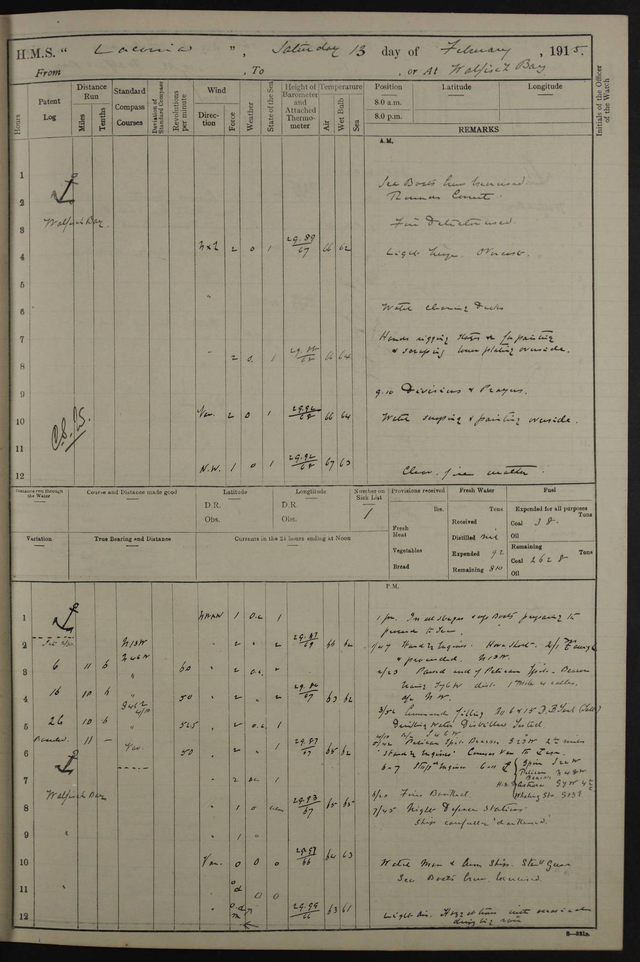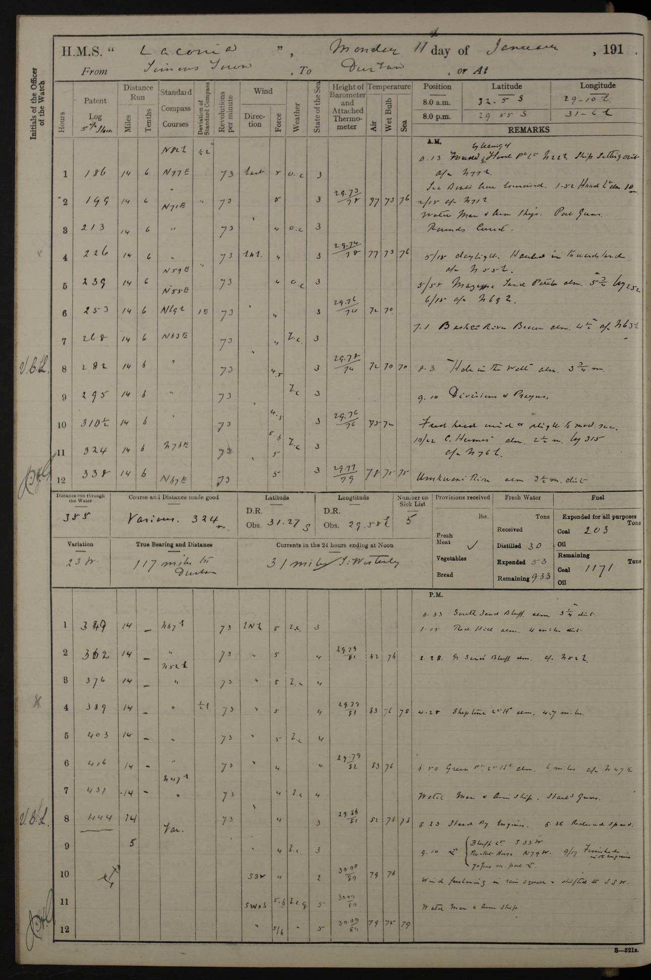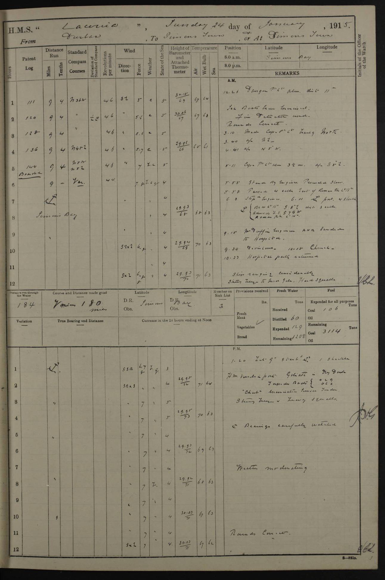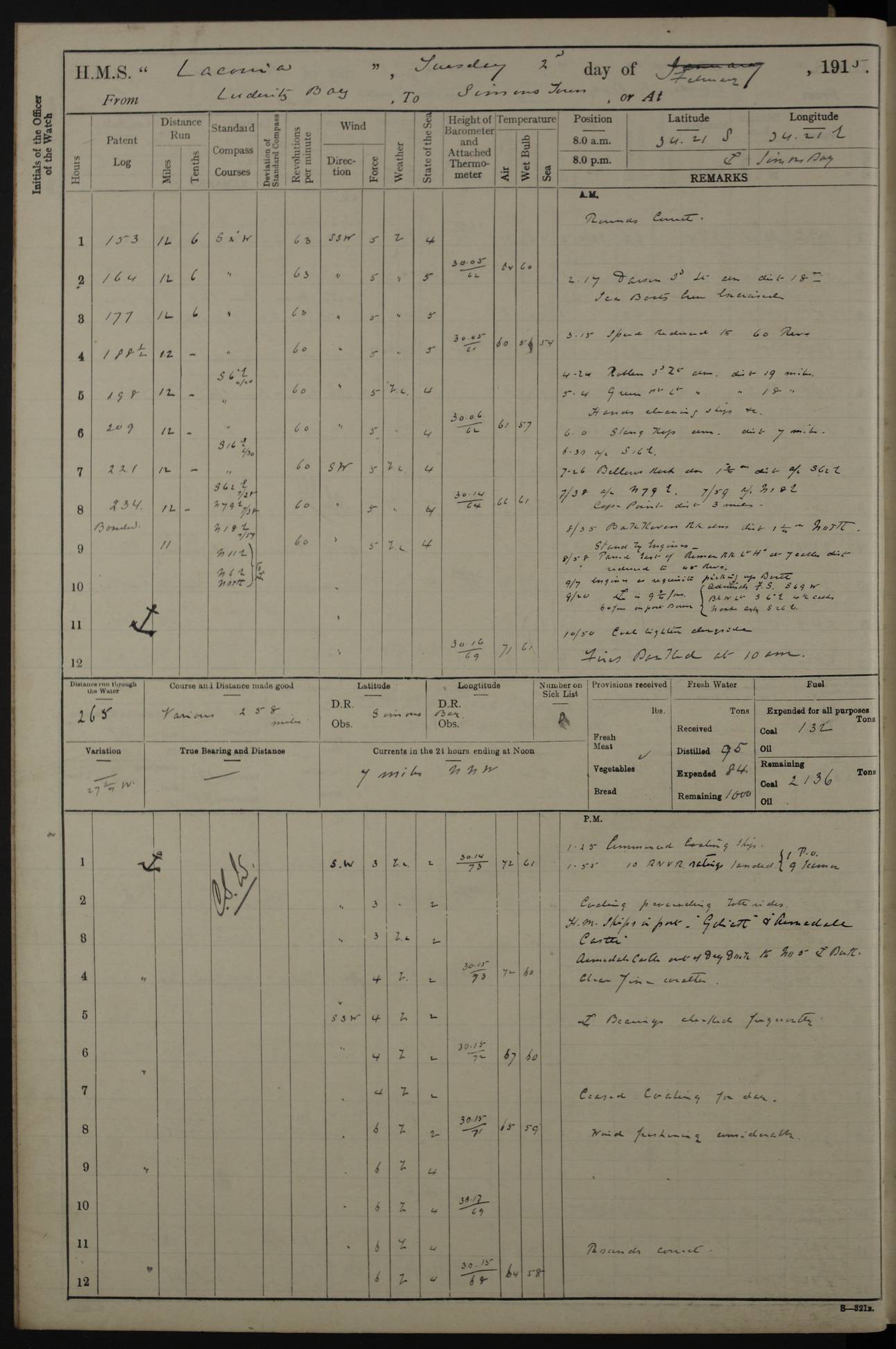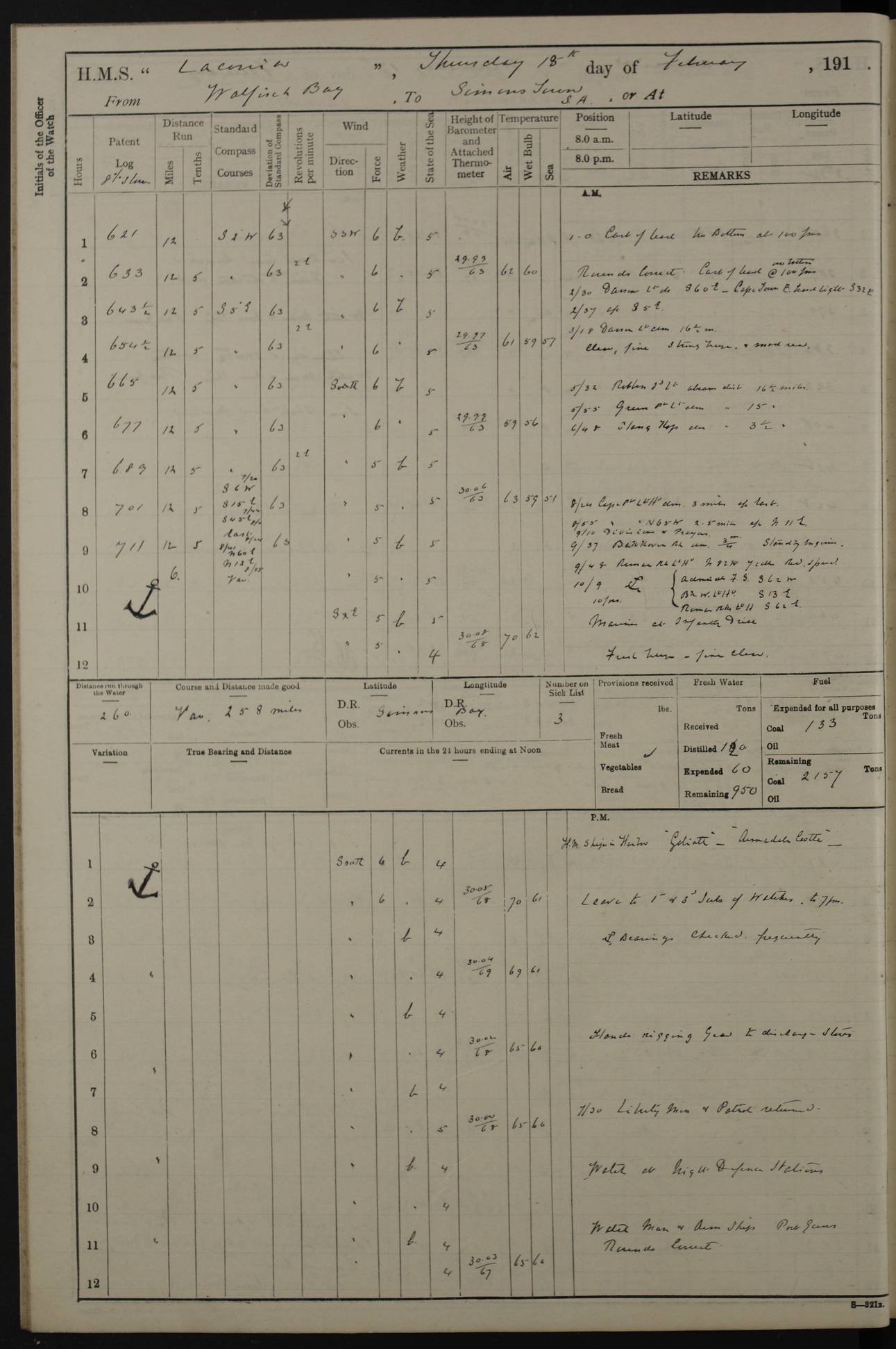 LOGS FOR JANUARY 1916 [Simonstown, Durban, to Kilindini with troops and Durban] 4caf8799cadfd3419701ba89: (http://oldweather.s3.amazonaws.com/ADM_53-45885/ADM 53-45885-001_0.jpg) 4caf8799cadfd3419701ba8a: (http://oldweather.s3.amazonaws.com/ADM_53-45885/ADM 53-45885-001_1.jpg) Cover, Adm. 53/45885, signed WRD Irvine. 4caf8799cadfd3419701ba8b: (http://oldweather.s3.amazonaws.com/ADM_53-45885/ADM 53-45885-002_0.jpg) 4caf8799cadfd3419701ba8c: (http://oldweather.s3.amazonaws.com/ADM_53-45885/ADM 53-45885-002_1.jpg) Dated 10th February 1916, signed CS Wills. 4caf8799cadfd3419701ba8d: (http://oldweather.s3.amazonaws.com/ADM_53-45885/ADM 53-45885-003_0.jpg) 4caf8799cadfd3419701ba8e: (http://oldweather.s3.amazonaws.com/ADM_53-45885/ADM 53-45885-003_1.jpg) 1 January 1916 Simonstown Lat -34.18, Long 18.43 Strong SSE winds, gale force 8 or 9 at times, all day. 10.00am: Commenced coaling. 3.00pm: One SBS to hospital, one Trimmer joined from same. 5.00pm: Read punishment warrants 22 and 23. One Fireman to cells. 7.45pm: Ceased coaling, 515 tons received. Sick list: 1. 4caf8799cadfd3419701ba8f: (http://oldweather.s3.amazonaws.com/ADM_53-45885/ADM 53-45885-004_0.jpg) 2 January 1916 Simonstown Lat -34.18, Long 18.43 SSE winds up to gale force 8 all day. 7.30am: Resumed coaling. 7.00pm: Two Firemen to cells. 8.00pm: Ceased coaling. 4caf8799cadfd3419701ba90: (http://oldweather.s3.amazonaws.com/ADM_53-45885/ADM 53-45885-004_1.jpg) 3 January 1916 Simonstown and at sea Lat -34.43, Long 18.81 Gale force winds at first, gradually abating to f 4 by noon. 7.00am: Wind moderating. 7.35am: Ship canted from berth to dock entrance by dockyard staff. 8.21am: Left dock. 8.33am: Anchored. 9.22am: Weighed and proceeded at full speed. Noon: Courses & DMG, various 23.5 miles. C Hangklip abeam, 2 miles. 2.40pm: Danger Pt Lt abeam, 4.5 miles, a/c S38E. 4.25pm: Quoin Pt abeam, 4 miles, a/c S45E. 6.00pm: C Agulhas abeam, 6 miles, a/c S71E. 8.00pm: Pos. 34º 52’S, 20º 27.5’E. 4caf8799cadfd3419701ba91: (http://oldweather.s3.amazonaws.com/ADM_53-45885/ADM 53-45885-005_0.jpg) 4 January 1916 At sea Lat -34.39, Long 24.44 8.00am: Pos. 34º 35’S, 23º 22’E. A/c S74E. Noon: Courses and DMG, various, 288 miles. 12.35pm: A/c S79E. 1.15pm: Seal Pt Lt bg N73E, land partially obscured by rain. 4.00pm: SS St Egbert passed bound west. 6.13pm: C Recife Lt bg N13E, 6 miles. 8.00pm: Pos. 34º 00’S, 26º 10’E. 8.12pm: Bird I. Lt abeam, 8 miles. 4caf8799cadfd3419701ba92: (http://oldweather.s3.amazonaws.com/ADM_53-45885/ADM 53-45885-005_1.jpg) 5 January 1916 At sea Lat -32.44, Long 28.75 1.11am: Gt Fish Pt Lt bg N36E, a/c N78E. 6.13am: Hood Pt Lt abeam, bg N21W, 6.25 miles. 8.00am: Pos. 32º 53’S, 28º 15’E. Noon: Courses and DMG, various, 251 miles. 4.25pm: A/c N67E. 5.53pm: C Hermes Lt abeam, bg N22W, 5 miles. 8.00pm: Pos. 31º 28.5’S, 29º 53.5’E. 10.10pm: HMS Armadale Castle passed bound South. 11.30pm: A/c N56E. 4caf8799cadfd3419701ba94: (http://oldweather.s3.amazonaws.com/ADM_53-45885/ADM 53-45885-006_1.jpg) 6 January 1916 At sea and alongside quay, shed H, Durban Lat -29.87, Long 31.02 12.30am: Shepstone Lt bg N40E. 2.16am: Same abeam, bg N32W, 5.5 miles. 8.59am: Pilot aboard. 9.30am: Alongside quay, two tugs assisting. 10.30am: Commenced coaling. Coaling from railway waggons on quayside and lighters on the starboard side, local labour. Noon: Courses and DMG, various, 200 miles. 4.05pm: 93 libertymen landed. 9.00pm: Libertymen returned, 17 absentees. 9.30pm: Two Firemen placed under sentry’s charge. 4caf8799cadfd3419701ba95: (http://oldweather.s3.amazonaws.com/ADM_53-45885/ADM 53-45885-007_0.jpg) 7 January 1916 Alongside quay, shed H, Durban Lat -29.87, Long 31.02 Coaling throughout. 7.40am: HMS Hyacinth arrived. 5.00pm: Fireman Fitzpatrick released from cells and resumed duty. 11.00pm: Shore carpenters landed. 4caf8799cadfd3419701ba96: (http://oldweather.s3.amazonaws.com/ADM_53-45885/ADM 53-45885-007_1.jpg) 8 January 1916 Alongside quay, shed H, Durban Lat -29.87, Long 31.02 1.00am: 10 absentees returned. 6.00am: Troops embarking. 9.00am: Taking in ammunition. 1.30pm: Libertymen landed. 2.00pm: Four Trimmers joined from shore to replace deserters. 9.00pm: Libertymen returned, 18 absentees. 4caf8799cadfd3419701ba97: (http://oldweather.s3.amazonaws.com/ADM_53-45885/ADM 53-45885-008_0.jpg) 9 January 1916 Durban and at sea Lat -29.87, Long 31.02 10.20am: Received three bags of mail for Mombasa and hoisting in troops baggage. 1.00pm: Troops embarked, 5th and 6th SAI, total 2,591. 4.00pm: Let go and proceeded, assisted by two tugs. 4.38pm: Pilot left. Set course N70E. 11.05pm: C St Lucia Lt bg N32E. 4caf8799cadfd3419701ba98: (http://oldweather.s3.amazonaws.com/ADM_53-45885/ADM 53-45885-008_1.jpg) 10 January 1916 At sea Lat -26.67, Long 34.14 12.55am: St Lucia Lt abeam, 14 miles, a/c N52E. 8.00am: Pos. 27º 26’S, 33º 34’E. 9.30am: HMS Trent passed bound South. Noon: Courses and DMG, various, 256.5 miles. 6.35pm: SS Student, Liverpool, passed. 8.00pm: Pos. 25º 16’S, 35º 20’E. 10.25pm: A/c N47E. 4caf8799cadfd3419701ba99: (http://oldweather.s3.amazonaws.com/ADM_53-45885/ADM 53-45885-009_0.jpg) 11 January 1916 At sea Lat -22.24, Long 37.39 Heavy swell and fresh SE winds f5-6 at times, all day. 6.15am: Entered tropics. 8.00am: Pos. 23º 07.5’S, 36º 50’E. Noon: Course and DMG, N34E, 320 miles. A/c N40E. 5.10pm: Read punishment warrant No 24. 8.00pm: Pos. 20º 35’S, 38º 26’E. 4caf8799cadfd3419701ba9a: (http://oldweather.s3.amazonaws.com/ADM_53-45885/ADM 53-45885-009_1.jpg) 12 January 1916 At sea Lat -16.97, Long 40.19 8.00am: Pos. 17º 48’S, 37º 43’E. Noon: Course and DMG, N26.5E, 353 miles. A/c N33E. 8.00pm: Pos. 15º 15’S, 41º 00’E. Mozambique Lt bg N38W. 4caf8799cadfd3419701ba9b: (http://oldweather.s3.amazonaws.com/ADM_53-45885/ADM 53-45885-010_0.jpg) 13 January 1916 At sea Lat -11.64, Long 40.99 8.00am: Pos. 12º 31S, 40º 57E. Noon: Courses and DMG, various, 330.5 miles. 4.30pm: Estimated C Del