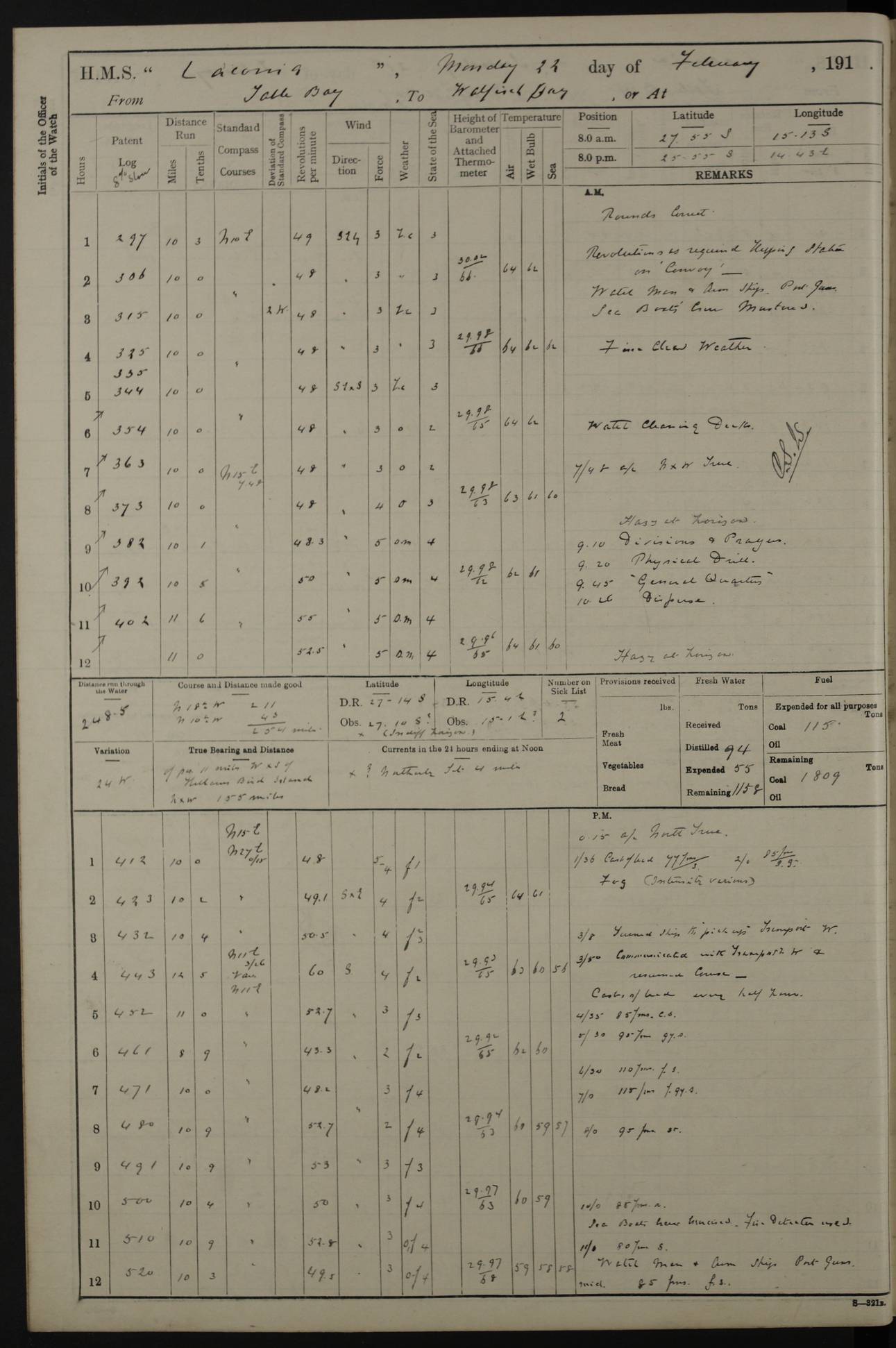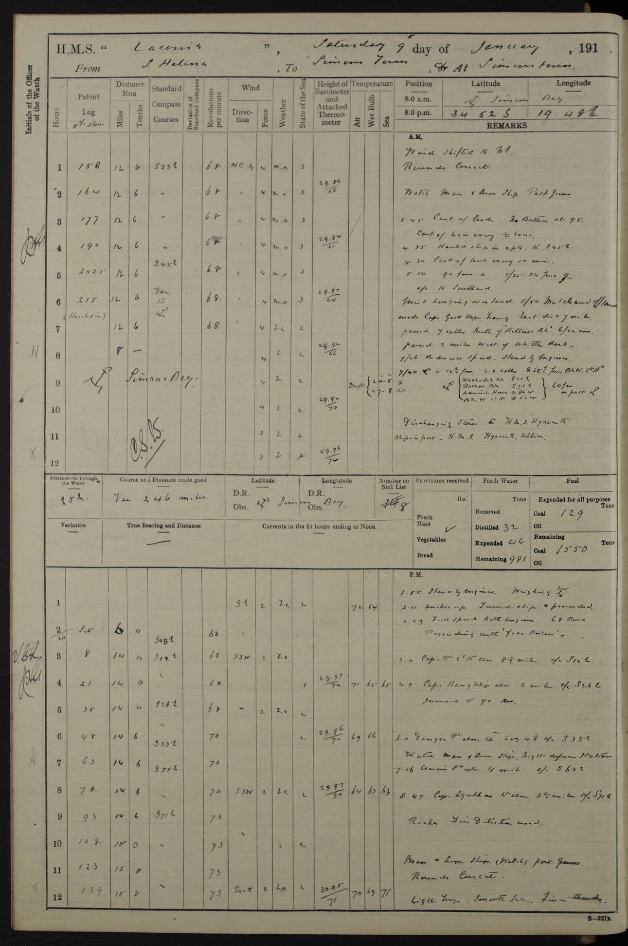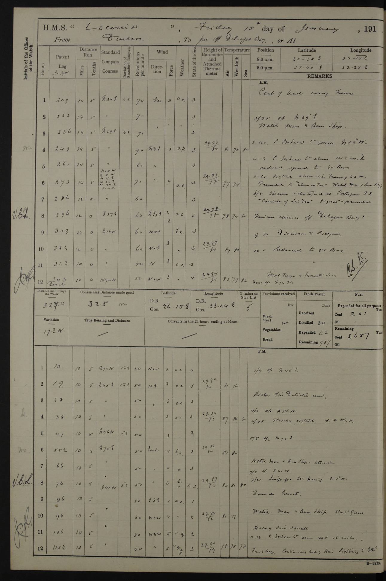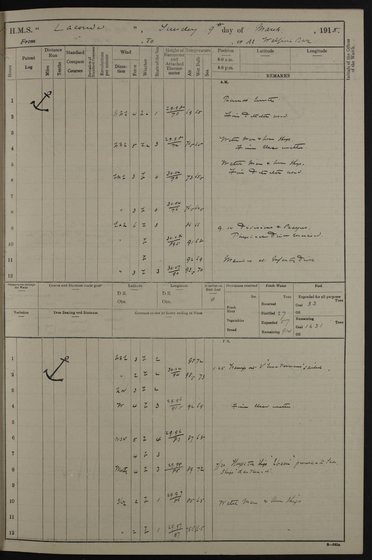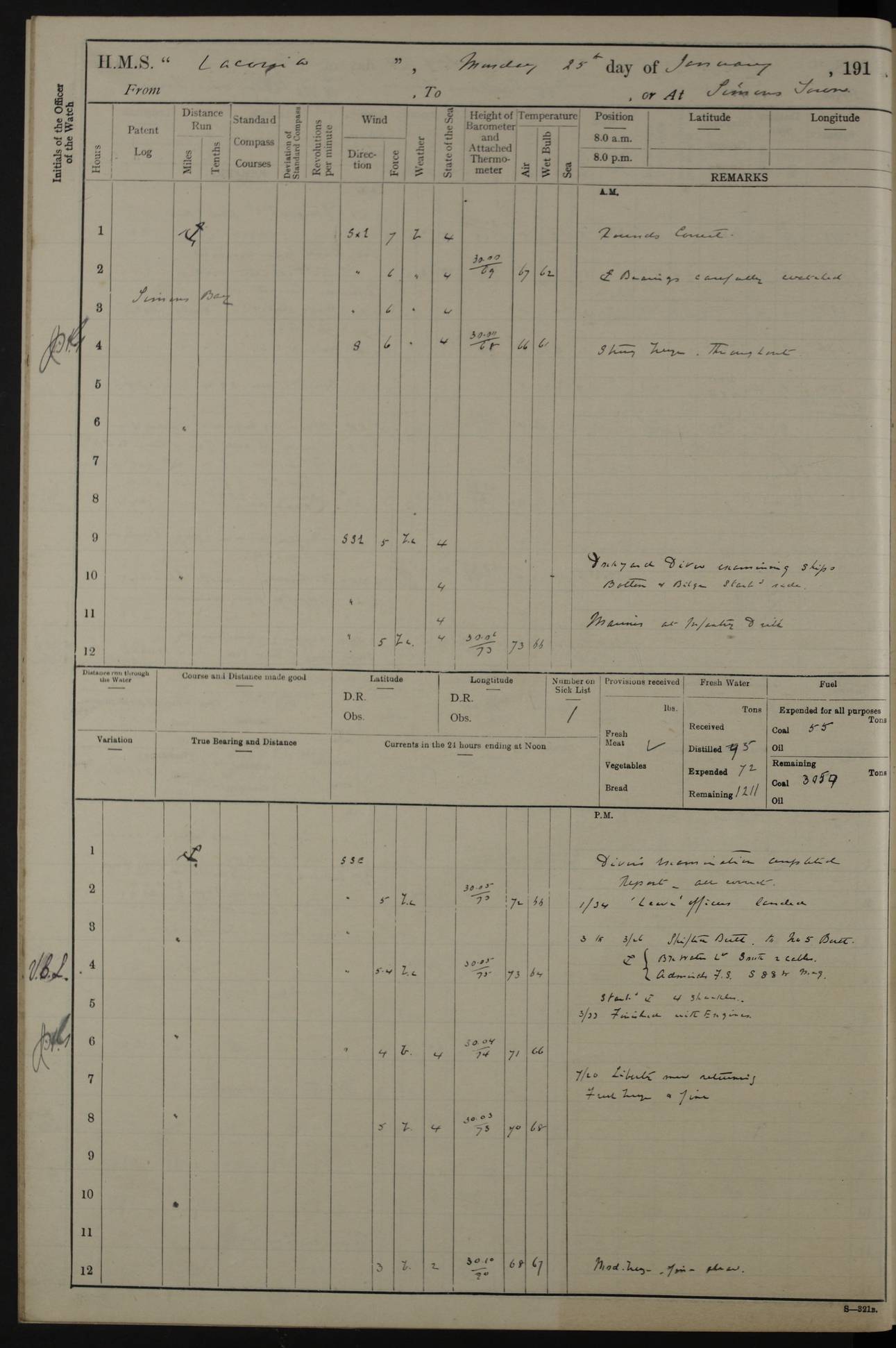 LOGS FOR JANUARY 1916 [Simonstown, Durban, to Kilindini with troops and Durban] 4caf8799cadfd3419701ba89: (http://oldweather.s3.amazonaws.com/ADM_53-45885/ADM 53-45885-001_0.jpg) 4caf8799cadfd3419701ba8a: (http://oldweather.s3.amazonaws.com/ADM_53-45885/ADM 53-45885-001_1.jpg) Cover, Adm. 53/45885, signed WRD Irvine. 4caf8799cadfd3419701ba8b: (http://oldweather.s3.amazonaws.com/ADM_53-45885/ADM 53-45885-002_0.jpg) 4caf8799cadfd3419701ba8c: (http://oldweather.s3.amazonaws.com/ADM_53-45885/ADM 53-45885-002_1.jpg) Dated 10th February 1916, signed CS Wills. 4caf8799cadfd3419701ba8d: (http://oldweather.s3.amazonaws.com/ADM_53-45885/ADM 53-45885-003_0.jpg) 4caf8799cadfd3419701ba8e: (http://oldweather.s3.amazonaws.com/ADM_53-45885/ADM 53-45885-003_1.jpg) 1 January 1916 Simonstown Lat -34.18, Long 18.43 Strong SSE winds, gale force 8 or 9 at times, all day. 10.00am: Commenced coaling. 3.00pm: One SBS to hospital, one Trimmer joined from same. 5.00pm: Read punishment warrants 22 and 23. One Fireman to cells. 7.45pm: Ceased coaling, 515 tons received. Sick list: 1. 4caf8799cadfd3419701ba8f: (http://oldweather.s3.amazonaws.com/ADM_53-45885/ADM 53-45885-004_0.jpg) 2 January 1916 Simonstown Lat -34.18, Long 18.43 SSE winds up to gale force 8 all day. 7.30am: Resumed coaling. 7.00pm: Two Firemen to cells. 8.00pm: Ceased coaling. 4caf8799cadfd3419701ba90: (http://oldweather.s3.amazonaws.com/ADM_53-45885/ADM 53-45885-004_1.jpg) 3 January 1916 Simonstown and at sea Lat -34.43, Long 18.81 Gale force winds at first, gradually abating to f 4 by noon. 7.00am: Wind moderating. 7.35am: Ship canted from berth to dock entrance by dockyard staff. 8.21am: Left dock. 8.33am: Anchored. 9.22am: Weighed and proceeded at full speed. Noon: Courses & DMG, various 23.5 miles. C Hangklip abeam, 2 miles. 2.40pm: Danger Pt Lt abeam, 4.5 miles, a/c S38E. 4.25pm: Quoin Pt abeam, 4 miles, a/c S45E. 6.00pm: C Agulhas abeam, 6 miles, a/c S71E. 8.00pm: Pos. 34º 52’S, 20º 27.5’E. 4caf8799cadfd3419701ba91: (http://oldweather.s3.amazonaws.com/ADM_53-45885/ADM 53-45885-005_0.jpg) 4 January 1916 At sea Lat -34.39, Long 24.44 8.00am: Pos. 34º 35’S, 23º 22’E. A/c S74E. Noon: Courses and DMG, various, 288 miles. 12.35pm: A/c S79E. 1.15pm: Seal Pt Lt bg N73E, land partially obscured by rain. 4.00pm: SS St Egbert passed bound west. 6.13pm: C Recife Lt bg N13E, 6 miles. 8.00pm: Pos. 34º 00’S, 26º 10’E. 8.12pm: Bird I. Lt abeam, 8 miles. 4caf8799cadfd3419701ba92: (http://oldweather.s3.amazonaws.com/ADM_53-45885/ADM 53-45885-005_1.jpg) 5 January 1916 At sea Lat -32.44, Long 28.75 1.11am: Gt Fish Pt Lt bg N36E, a/c N78E. 6.13am: Hood Pt Lt abeam, bg N21W, 6.25 miles. 8.00am: Pos. 32º 53’S, 28º 15’E. Noon: Courses and DMG, various, 251 miles. 4.25pm: A/c N67E. 5.53pm: C Hermes Lt abeam, bg N22W, 5 miles. 8.00pm: Pos. 31º 28.5’S, 29º 53.5’E. 10.10pm: HMS Armadale Castle passed bound South. 11.30pm: A/c N56E. 4caf8799cadfd3419701ba94: (http://oldweather.s3.amazonaws.com/ADM_53-45885/ADM 53-45885-006_1.jpg) 6 January 1916 At sea and alongside quay, shed H, Durban Lat -29.87, Long 31.02 12.30am: Shepstone Lt bg N40E. 2.16am: Same abeam, bg N32W, 5.5 miles. 8.59am: Pilot aboard. 9.30am: Alongside quay, two tugs assisting. 10.30am: Commenced coaling. Coaling from railway waggons on quayside and lighters on the starboard side, local labour. Noon: Courses and DMG, various, 200 miles. 4.05pm: 93 libertymen landed. 9.00pm: Libertymen returned, 17 absentees. 9.30pm: Two Firemen placed under sentry’s charge. 4caf8799cadfd3419701ba95: (http://oldweather.s3.amazonaws.com/ADM_53-45885/ADM 53-45885-007_0.jpg) 7 January 1916 Alongside quay, shed H, Durban Lat -29.87, Long 31.02 Coaling throughout. 7.40am: HMS Hyacinth arrived. 5.00pm: Fireman Fitzpatrick released from cells and resumed duty. 11.00pm: Shore carpenters landed. 4caf8799cadfd3419701ba96: (http://oldweather.s3.amazonaws.com/ADM_53-45885/ADM 53-45885-007_1.jpg) 8 January 1916 Alongside quay, shed H, Durban Lat -29.87, Long 31.02 1.00am: 10 absentees returned. 6.00am: Troops embarking. 9.00am: Taking in ammunition. 1.30pm: Libertymen landed. 2.00pm: Four Trimmers joined from shore to replace deserters. 9.00pm: Libertymen returned, 18 absentees. 4caf8799cadfd3419701ba97: (http://oldweather.s3.amazonaws.com/ADM_53-45885/ADM 53-45885-008_0.jpg) 9 January 1916 Durban and at sea Lat -29.87, Long 31.02 10.20am: Received three bags of mail for Mombasa and hoisting in troops baggage. 1.00pm: Troops embarked, 5th and 6th SAI, total 2,591. 4.00pm: Let go and proceeded, assisted by two tugs. 4.38pm: Pilot left. Set course N70E. 11.05pm: C St Lucia Lt bg N32E. 4caf8799cadfd3419701ba98: (http://oldweather.s3.amazonaws.com/ADM_53-45885/ADM 53-45885-008_1.jpg) 10 January 1916 At sea Lat -26.67, Long 34.14 12.55am: St Lucia Lt abeam, 14 miles, a/c N52E. 8.00am: Pos. 27º 26’S, 33º 34’E. 9.30am: HMS Trent passed bound South. Noon: Courses and DMG, various, 256.5 miles. 6.35pm: SS Student, Liverpool, passed. 8.00pm: Pos. 25º 16’S, 35º 20’E. 10.25pm: A/c N47E. 4caf8799cadfd3419701ba99: (http://oldweather.s3.amazonaws.com/ADM_53-45885/ADM 53-45885-009_0.jpg) 11 January 1916 At sea Lat -22.24, Long 37.39 Heavy swell and fresh SE winds f5-6 at times, all day. 6.15am: Entered tropics. 8.00am: Pos. 23º 07.5’S, 36º 50’E. Noon: Course and DMG, N34E, 320 miles. A/c N40E. 5.10pm: Read punishment warrant No 24. 8.00pm: Pos. 20º 35’S, 38º 26’E. 4caf8799cadfd3419701ba9a: (http://oldweather.s3.amazonaws.com/ADM_53-45885/ADM 53-45885-009_1.jpg) 12 January 1916 At sea Lat -16.97, Long 40.19 8.00am: Pos. 17º 48’S, 37º 43’E. Noon: Course and DMG, N26.5E, 353 miles. A/c N33E. 8.00pm: Pos. 15º 15’S, 41º 00’E. Mozambique Lt bg N38W. 4caf8799cadfd3419701ba9b: (http://oldweather.s3.amazonaws.com/ADM_53-45885/ADM 53-45885-010_0.jpg) 13 January 1916 At sea Lat -11.64, Long 40.99 8.00am: Pos. 12º 31S, 40º 57E. Noon: Courses and DMG, various, 330.5 miles. 4.30pm: Estimated C Del