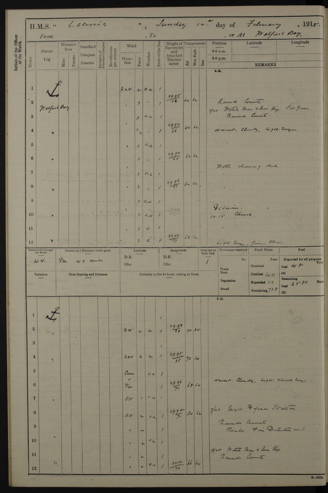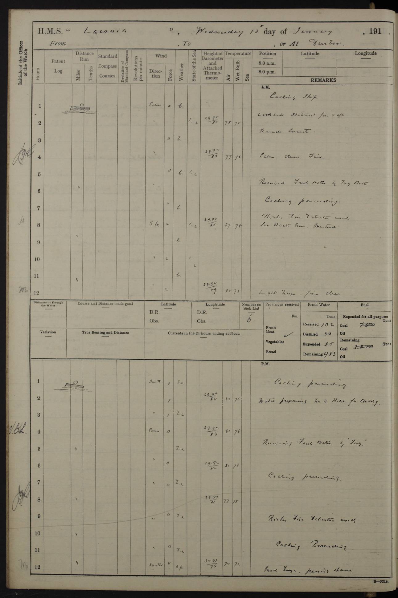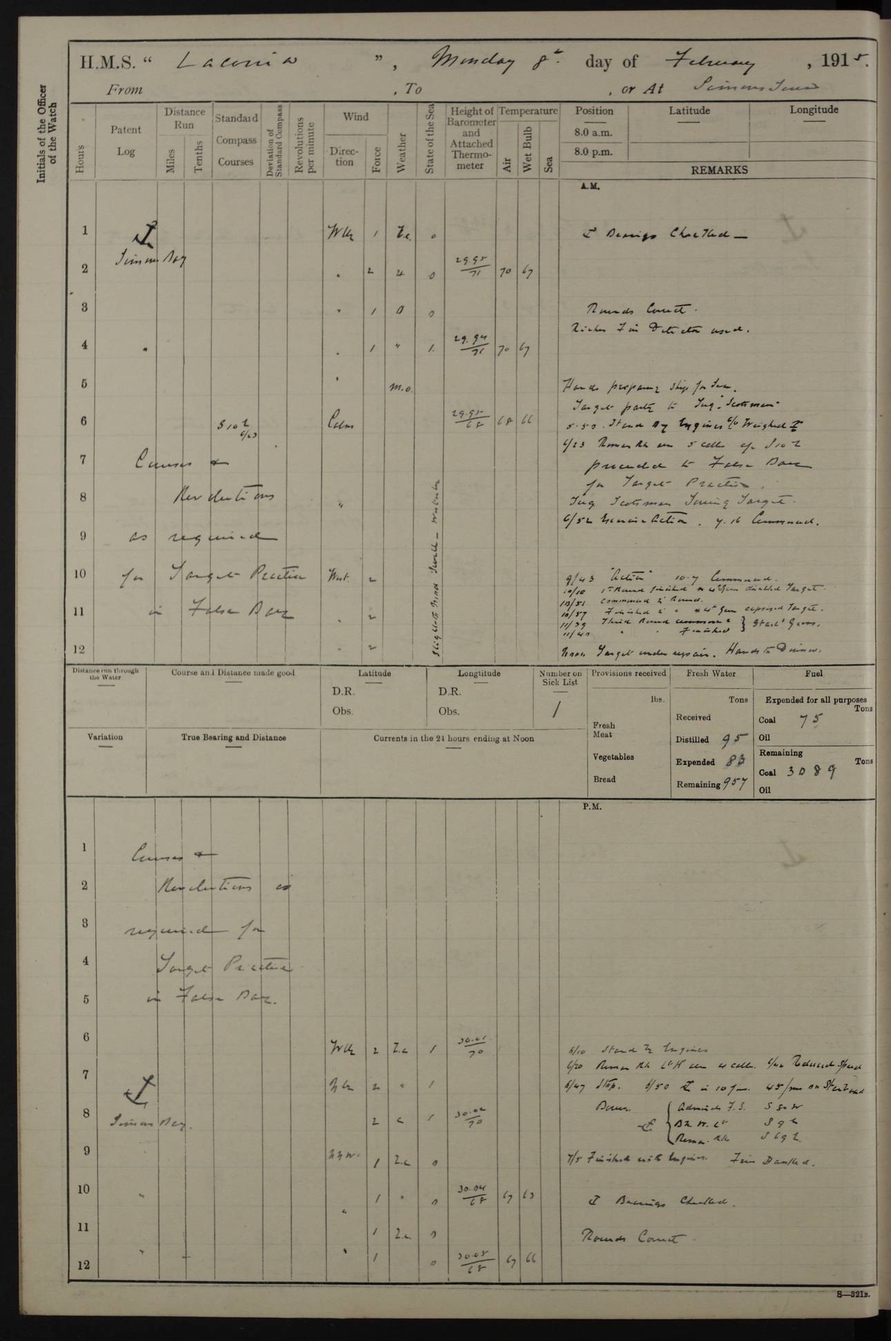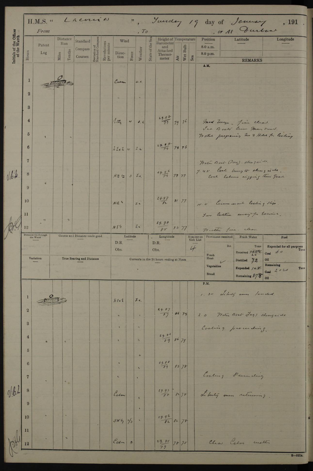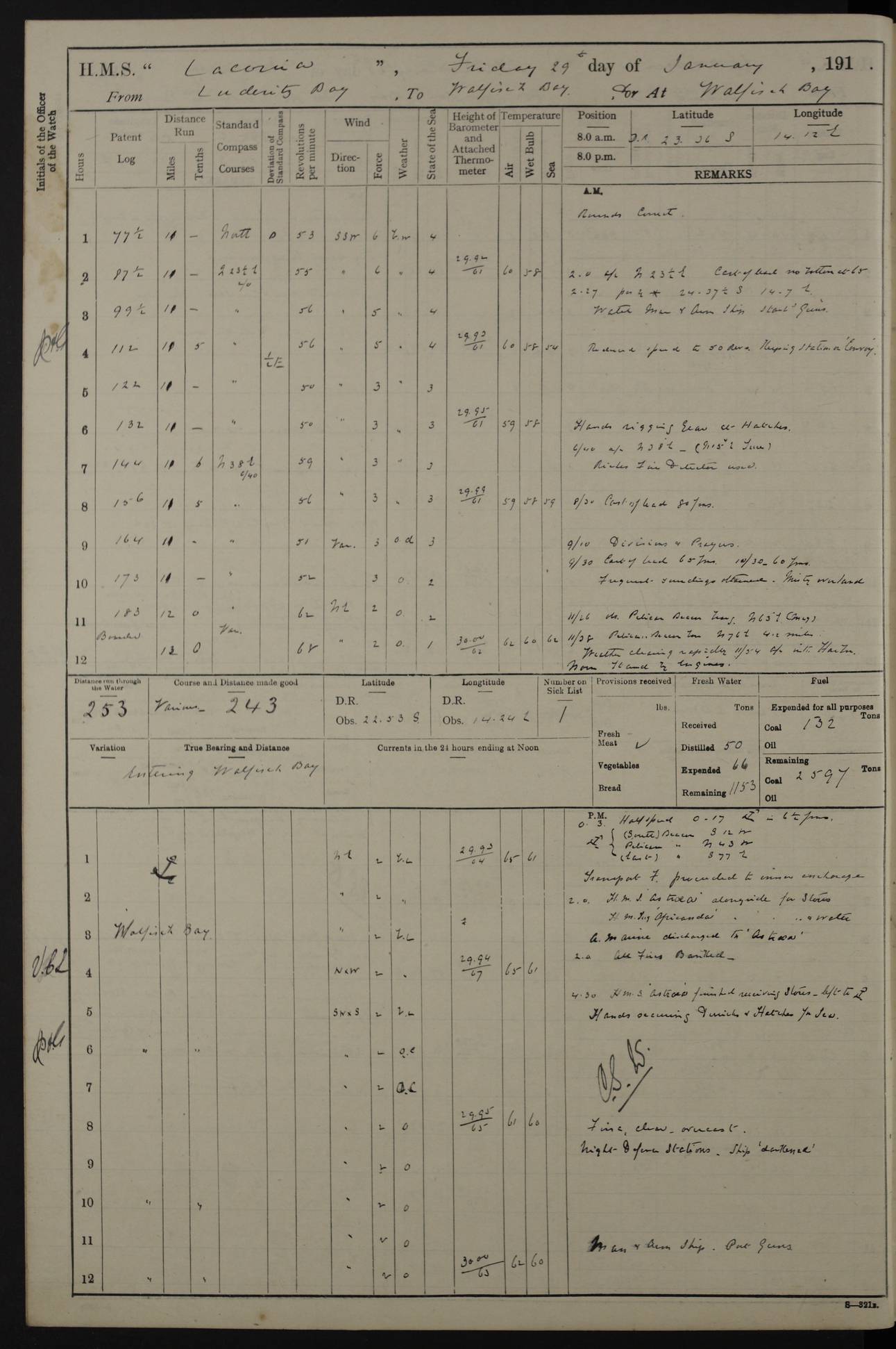 LOGS FOR JANUARY 1916 [Simonstown, Durban, to Kilindini with troops and Durban] 4caf8799cadfd3419701ba89: (http://oldweather.s3.amazonaws.com/ADM_53-45885/ADM 53-45885-001_0.jpg) 4caf8799cadfd3419701ba8a: (http://oldweather.s3.amazonaws.com/ADM_53-45885/ADM 53-45885-001_1.jpg) Cover, Adm. 53/45885, signed WRD Irvine. 4caf8799cadfd3419701ba8b: (http://oldweather.s3.amazonaws.com/ADM_53-45885/ADM 53-45885-002_0.jpg) 4caf8799cadfd3419701ba8c: (http://oldweather.s3.amazonaws.com/ADM_53-45885/ADM 53-45885-002_1.jpg) Dated 10th February 1916, signed CS Wills. 4caf8799cadfd3419701ba8d: (http://oldweather.s3.amazonaws.com/ADM_53-45885/ADM 53-45885-003_0.jpg) 4caf8799cadfd3419701ba8e: (http://oldweather.s3.amazonaws.com/ADM_53-45885/ADM 53-45885-003_1.jpg) 1 January 1916 Simonstown Lat -34.18, Long 18.43 Strong SSE winds, gale force 8 or 9 at times, all day. 10.00am: Commenced coaling. 3.00pm: One SBS to hospital, one Trimmer joined from same. 5.00pm: Read punishment warrants 22 and 23. One Fireman to cells. 7.45pm: Ceased coaling, 515 tons received. Sick list: 1. 4caf8799cadfd3419701ba8f: (http://oldweather.s3.amazonaws.com/ADM_53-45885/ADM 53-45885-004_0.jpg) 2 January 1916 Simonstown Lat -34.18, Long 18.43 SSE winds up to gale force 8 all day. 7.30am: Resumed coaling. 7.00pm: Two Firemen to cells. 8.00pm: Ceased coaling. 4caf8799cadfd3419701ba90: (http://oldweather.s3.amazonaws.com/ADM_53-45885/ADM 53-45885-004_1.jpg) 3 January 1916 Simonstown and at sea Lat -34.43, Long 18.81 Gale force winds at first, gradually abating to f 4 by noon. 7.00am: Wind moderating. 7.35am: Ship canted from berth to dock entrance by dockyard staff. 8.21am: Left dock. 8.33am: Anchored. 9.22am: Weighed and proceeded at full speed. Noon: Courses & DMG, various 23.5 miles. C Hangklip abeam, 2 miles. 2.40pm: Danger Pt Lt abeam, 4.5 miles, a/c S38E. 4.25pm: Quoin Pt abeam, 4 miles, a/c S45E. 6.00pm: C Agulhas abeam, 6 miles, a/c S71E. 8.00pm: Pos. 34º 52’S, 20º 27.5’E. 4caf8799cadfd3419701ba91: (http://oldweather.s3.amazonaws.com/ADM_53-45885/ADM 53-45885-005_0.jpg) 4 January 1916 At sea Lat -34.39, Long 24.44 8.00am: Pos. 34º 35’S, 23º 22’E. A/c S74E. Noon: Courses and DMG, various, 288 miles. 12.35pm: A/c S79E. 1.15pm: Seal Pt Lt bg N73E, land partially obscured by rain. 4.00pm: SS St Egbert passed bound west. 6.13pm: C Recife Lt bg N13E, 6 miles. 8.00pm: Pos. 34º 00’S, 26º 10’E. 8.12pm: Bird I. Lt abeam, 8 miles. 4caf8799cadfd3419701ba92: (http://oldweather.s3.amazonaws.com/ADM_53-45885/ADM 53-45885-005_1.jpg) 5 January 1916 At sea Lat -32.44, Long 28.75 1.11am: Gt Fish Pt Lt bg N36E, a/c N78E. 6.13am: Hood Pt Lt abeam, bg N21W, 6.25 miles. 8.00am: Pos. 32º 53’S, 28º 15’E. Noon: Courses and DMG, various, 251 miles. 4.25pm: A/c N67E. 5.53pm: C Hermes Lt abeam, bg N22W, 5 miles. 8.00pm: Pos. 31º 28.5’S, 29º 53.5’E. 10.10pm: HMS Armadale Castle passed bound South. 11.30pm: A/c N56E. 4caf8799cadfd3419701ba94: (http://oldweather.s3.amazonaws.com/ADM_53-45885/ADM 53-45885-006_1.jpg) 6 January 1916 At sea and alongside quay, shed H, Durban Lat -29.87, Long 31.02 12.30am: Shepstone Lt bg N40E. 2.16am: Same abeam, bg N32W, 5.5 miles. 8.59am: Pilot aboard. 9.30am: Alongside quay, two tugs assisting. 10.30am: Commenced coaling. Coaling from railway waggons on quayside and lighters on the starboard side, local labour. Noon: Courses and DMG, various, 200 miles. 4.05pm: 93 libertymen landed. 9.00pm: Libertymen returned, 17 absentees. 9.30pm: Two Firemen placed under sentry’s charge. 4caf8799cadfd3419701ba95: (http://oldweather.s3.amazonaws.com/ADM_53-45885/ADM 53-45885-007_0.jpg) 7 January 1916 Alongside quay, shed H, Durban Lat -29.87, Long 31.02 Coaling throughout. 7.40am: HMS Hyacinth arrived. 5.00pm: Fireman Fitzpatrick released from cells and resumed duty. 11.00pm: Shore carpenters landed. 4caf8799cadfd3419701ba96: (http://oldweather.s3.amazonaws.com/ADM_53-45885/ADM 53-45885-007_1.jpg) 8 January 1916 Alongside quay, shed H, Durban Lat -29.87, Long 31.02 1.00am: 10 absentees returned. 6.00am: Troops embarking. 9.00am: Taking in ammunition. 1.30pm: Libertymen landed. 2.00pm: Four Trimmers joined from shore to replace deserters. 9.00pm: Libertymen returned, 18 absentees. 4caf8799cadfd3419701ba97: (http://oldweather.s3.amazonaws.com/ADM_53-45885/ADM 53-45885-008_0.jpg) 9 January 1916 Durban and at sea Lat -29.87, Long 31.02 10.20am: Received three bags of mail for Mombasa and hoisting in troops baggage. 1.00pm: Troops embarked, 5th and 6th SAI, total 2,591. 4.00pm: Let go and proceeded, assisted by two tugs. 4.38pm: Pilot left. Set course N70E. 11.05pm: C St Lucia Lt bg N32E. 4caf8799cadfd3419701ba98: (http://oldweather.s3.amazonaws.com/ADM_53-45885/ADM 53-45885-008_1.jpg) 10 January 1916 At sea Lat -26.67, Long 34.14 12.55am: St Lucia Lt abeam, 14 miles, a/c N52E. 8.00am: Pos. 27º 26’S, 33º 34’E. 9.30am: HMS Trent passed bound South. Noon: Courses and DMG, various, 256.5 miles. 6.35pm: SS Student, Liverpool, passed. 8.00pm: Pos. 25º 16’S, 35º 20’E. 10.25pm: A/c N47E. 4caf8799cadfd3419701ba99: (http://oldweather.s3.amazonaws.com/ADM_53-45885/ADM 53-45885-009_0.jpg) 11 January 1916 At sea Lat -22.24, Long 37.39 Heavy swell and fresh SE winds f5-6 at times, all day. 6.15am: Entered tropics. 8.00am: Pos. 23º 07.5’S, 36º 50’E. Noon: Course and DMG, N34E, 320 miles. A/c N40E. 5.10pm: Read punishment warrant No 24. 8.00pm: Pos. 20º 35’S, 38º 26’E. 4caf8799cadfd3419701ba9a: (http://oldweather.s3.amazonaws.com/ADM_53-45885/ADM 53-45885-009_1.jpg) 12 January 1916 At sea Lat -16.97, Long 40.19 8.00am: Pos. 17º 48’S, 37º 43’E. Noon: Course and DMG, N26.5E, 353 miles. A/c N33E. 8.00pm: Pos. 15º 15’S, 41º 00’E. Mozambique Lt bg N38W. 4caf8799cadfd3419701ba9b: (http://oldweather.s3.amazonaws.com/ADM_53-45885/ADM 53-45885-010_0.jpg) 13 January 1916 At sea Lat -11.64, Long 40.99 8.00am: Pos. 12º 31S, 40º 57E. Noon: Courses and DMG, various, 330.5 miles. 4.30pm: Estimated C Del