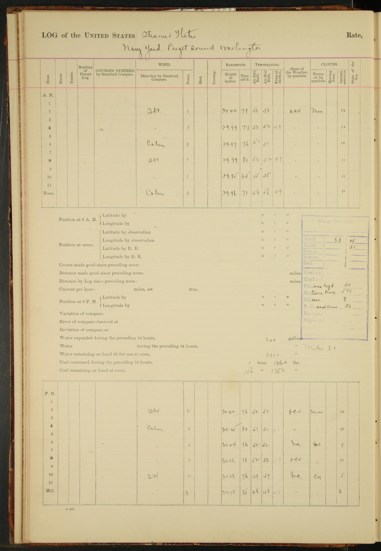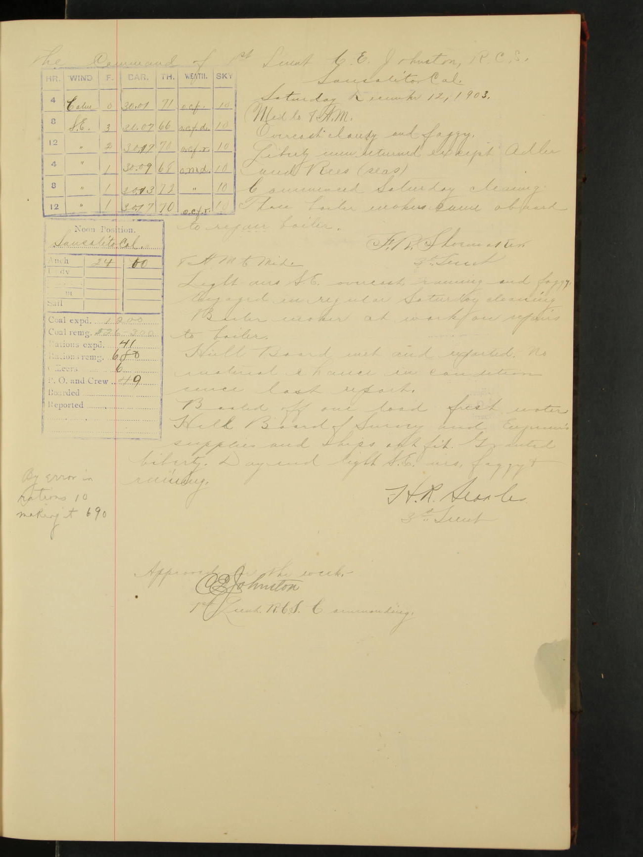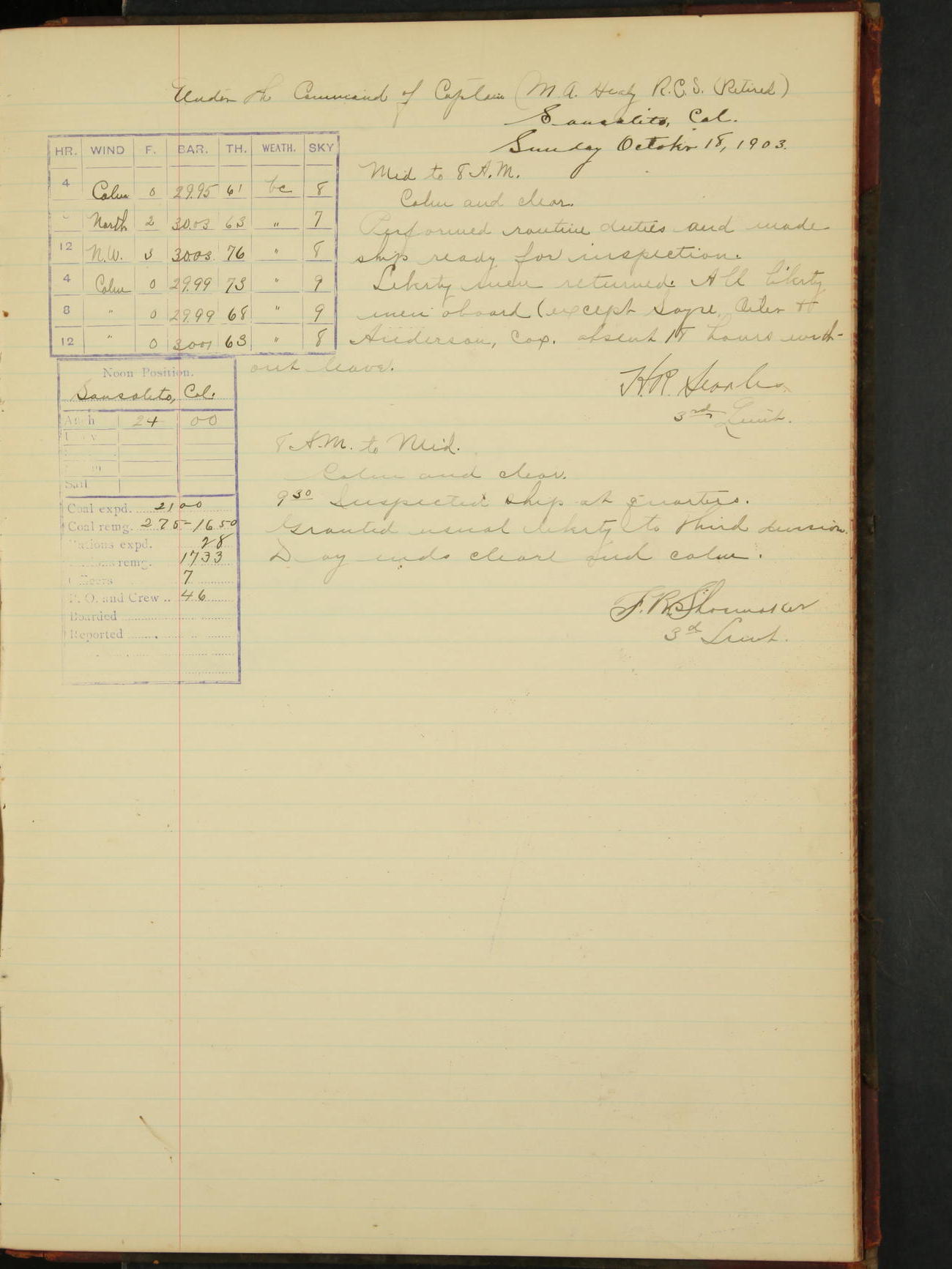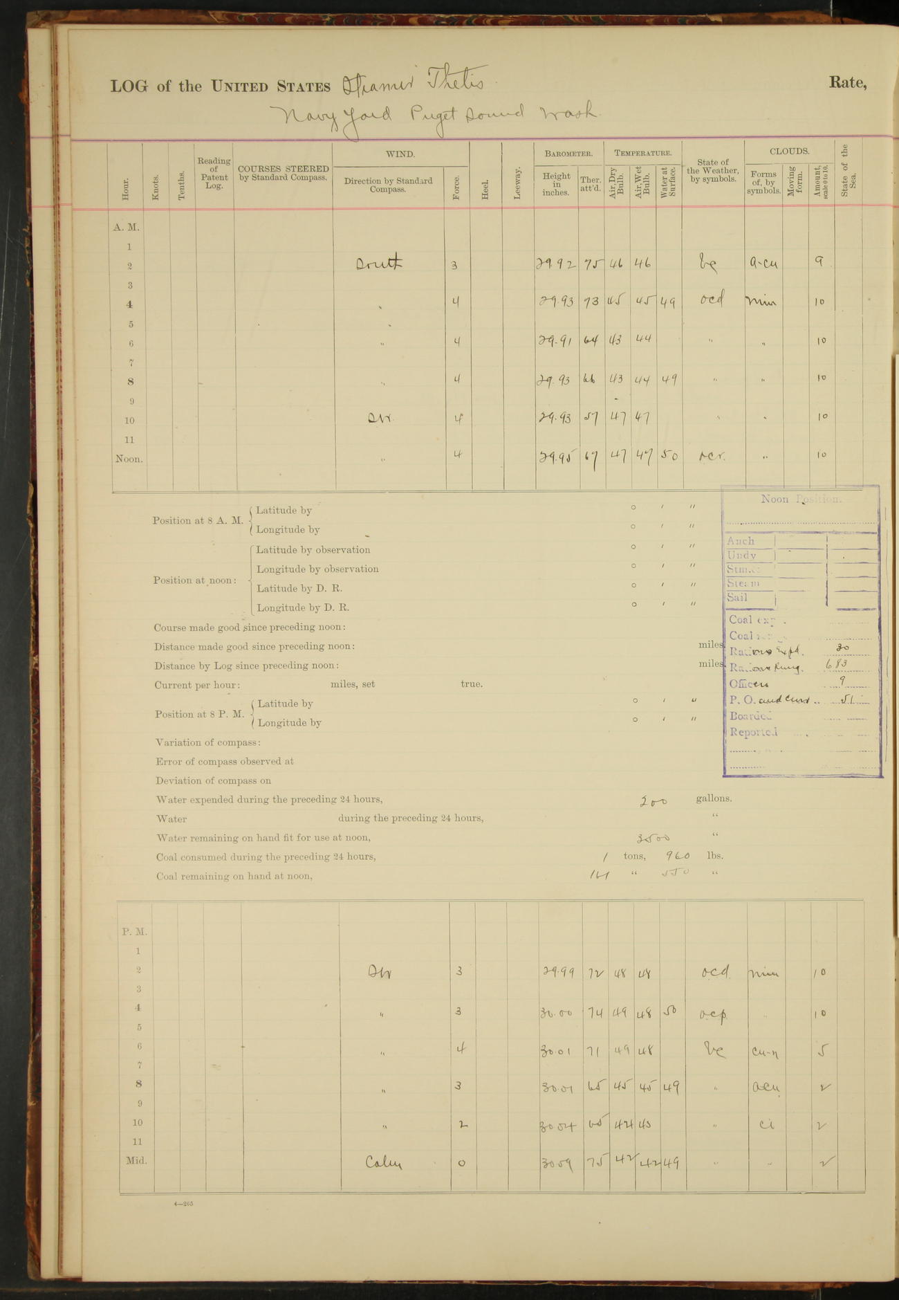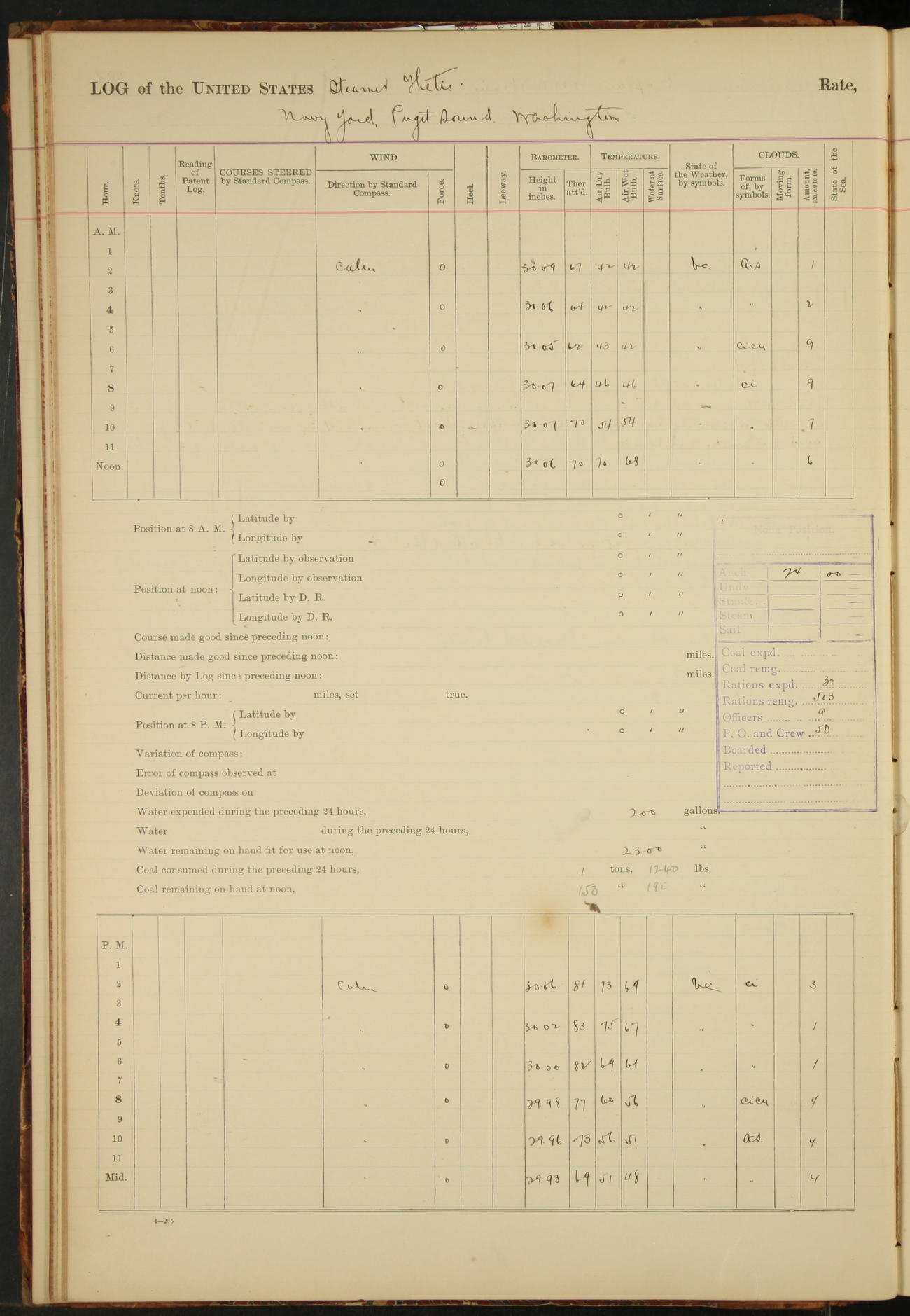 12.00: Barometer continuing to fall and weather showing every indication of growing worse, ordered main boiler filled with salt water and steam raised as rapidly as could be done without injury to boiler. Officers and liberty men detained on shore by heavy wind and rough sea.