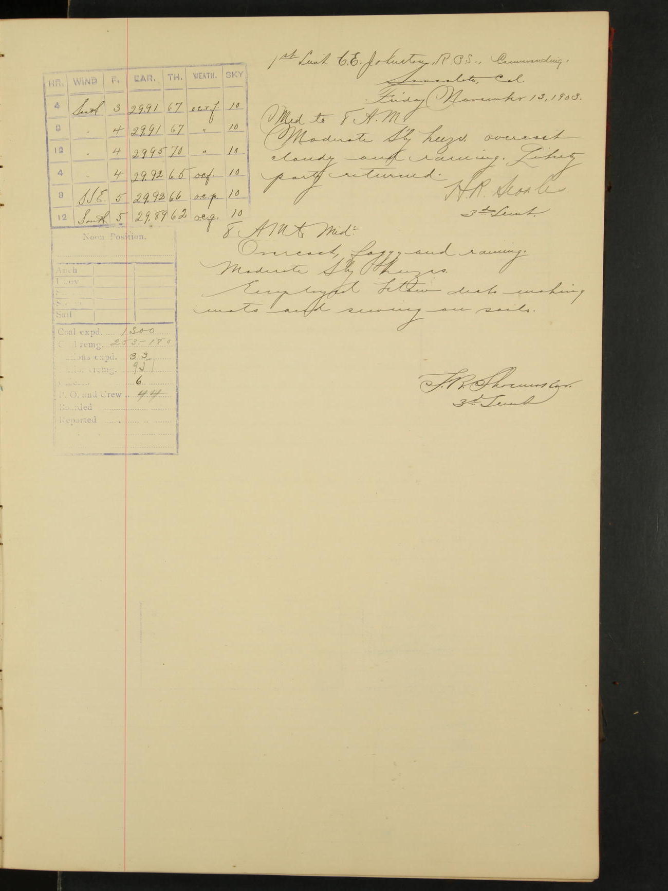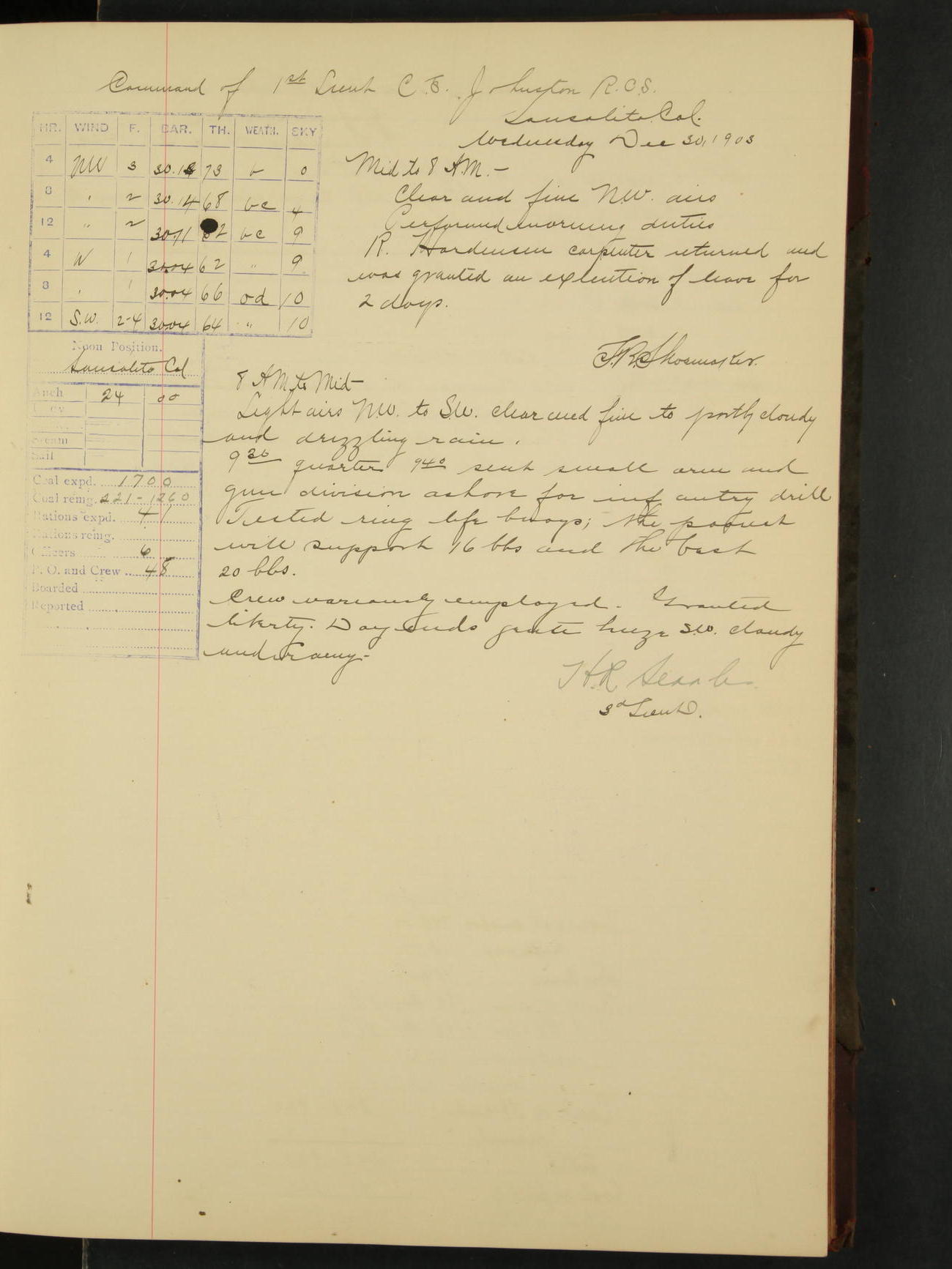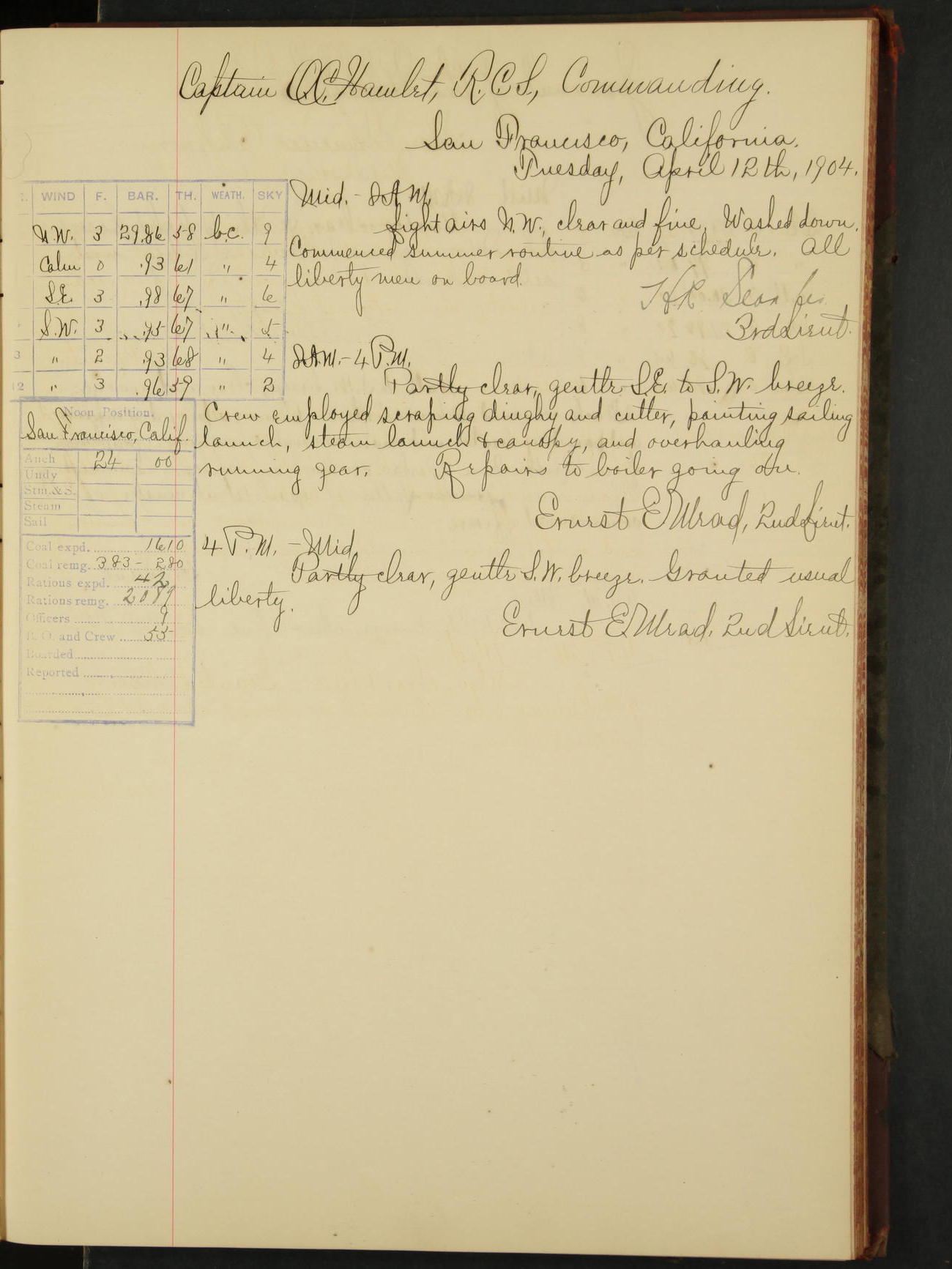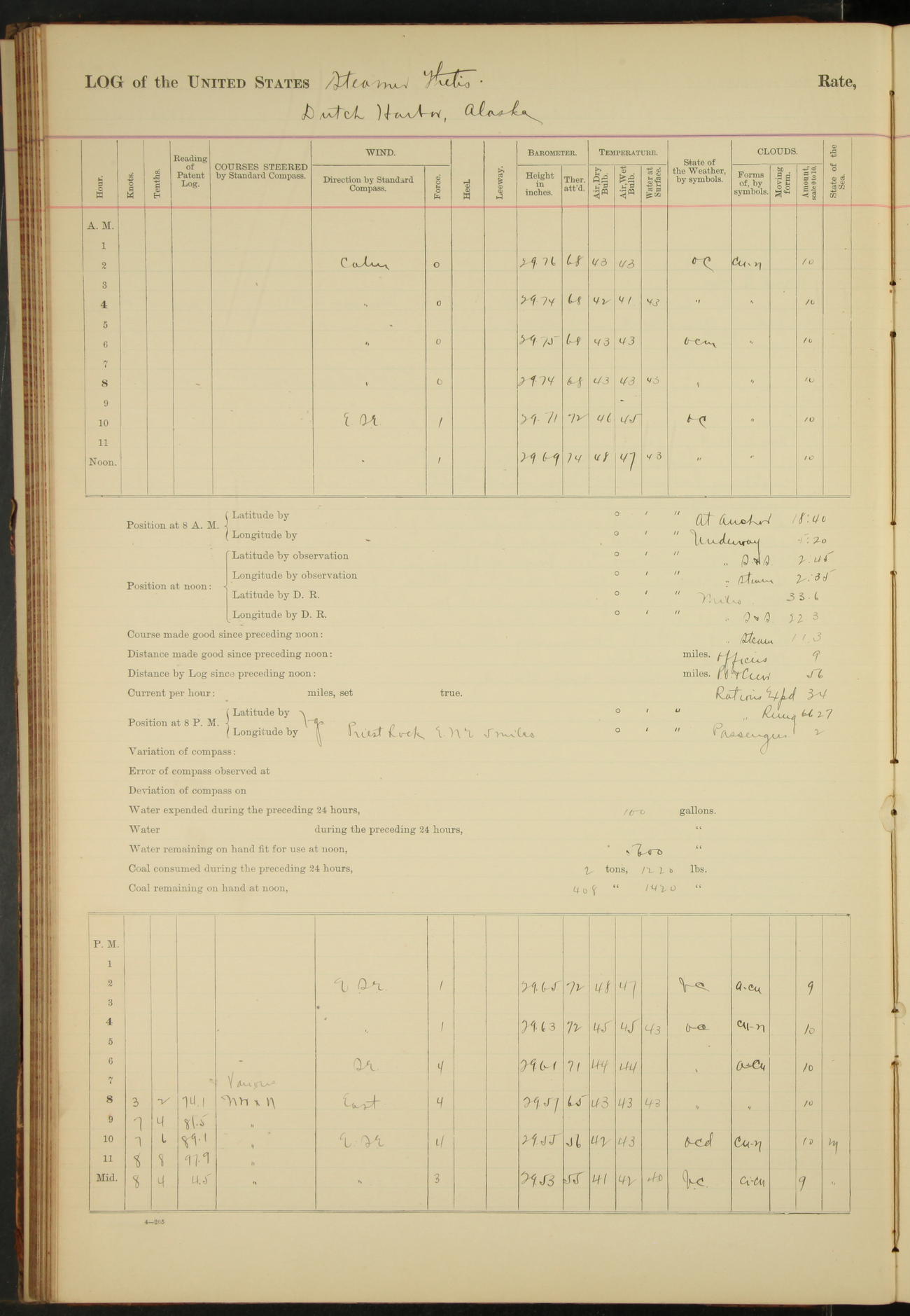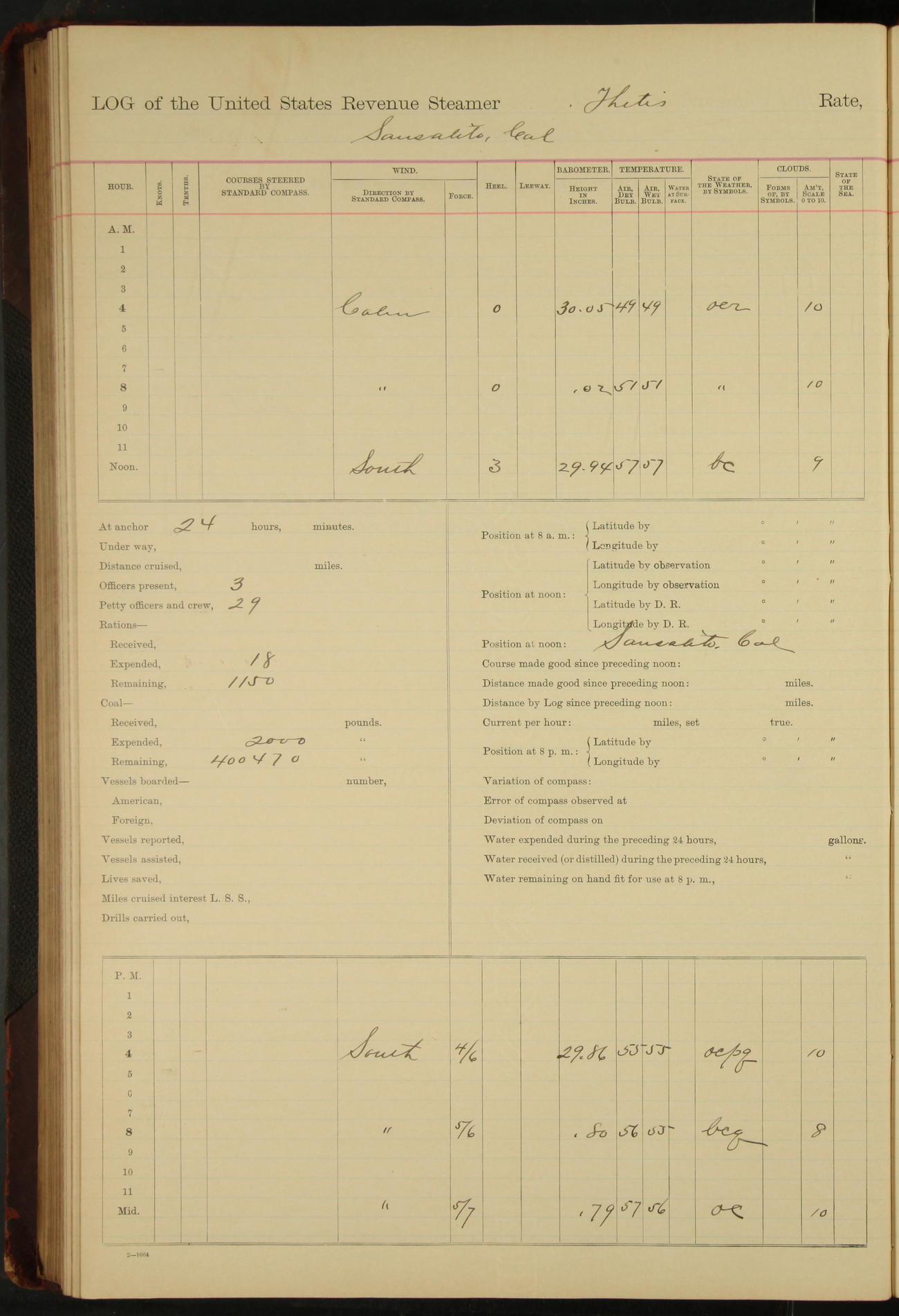 12.00: Barometer continuing to fall and weather showing every indication of growing worse, ordered main boiler filled with salt water and steam raised as rapidly as could be done without injury to boiler. Officers and liberty men detained on shore by heavy wind and rough sea.