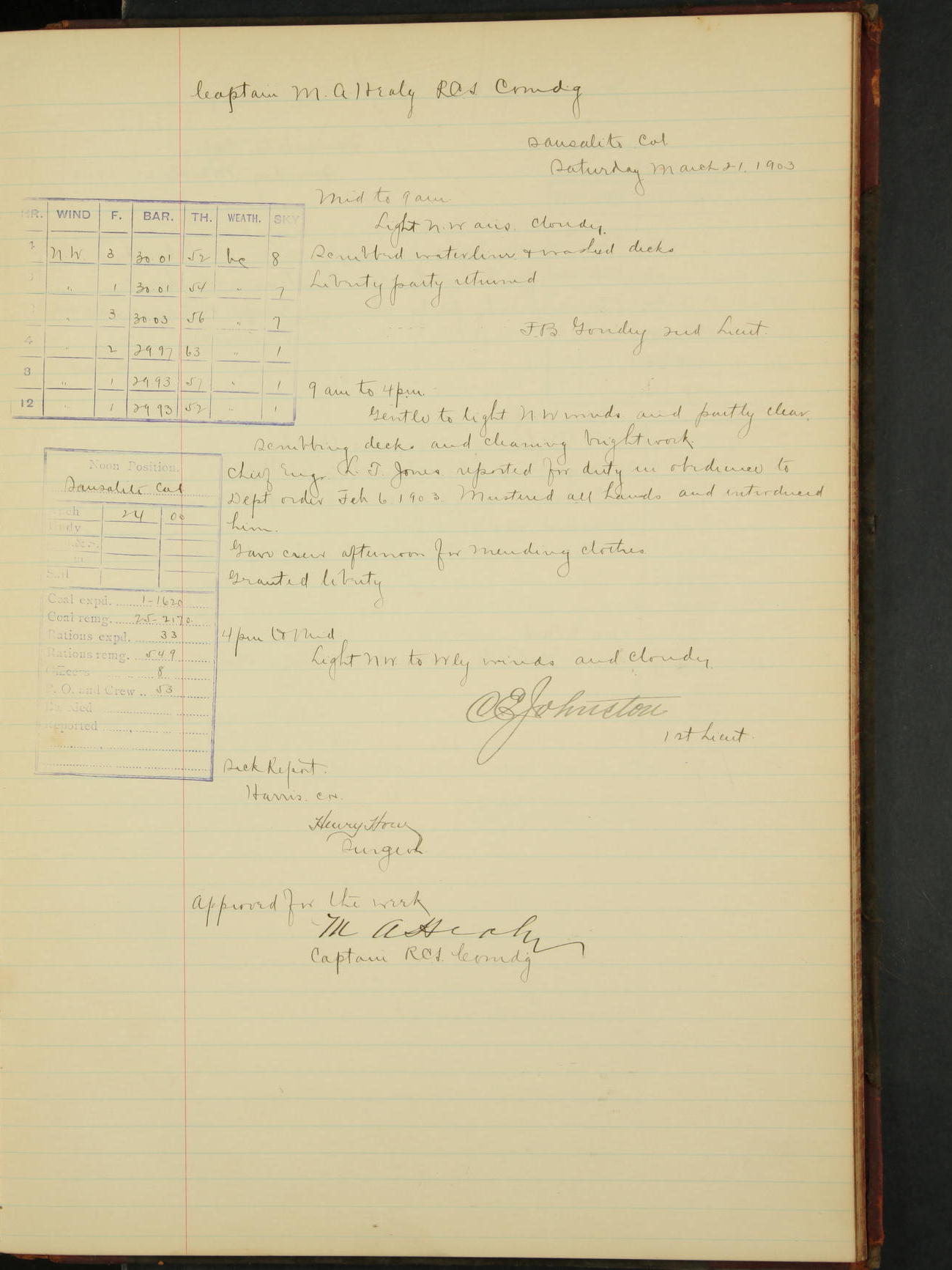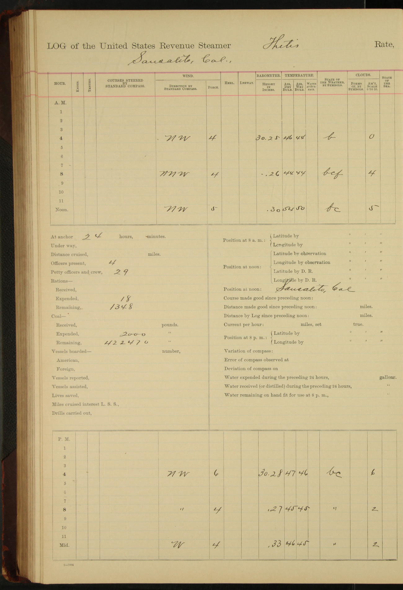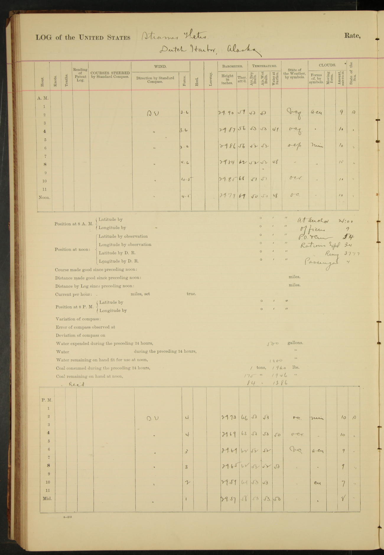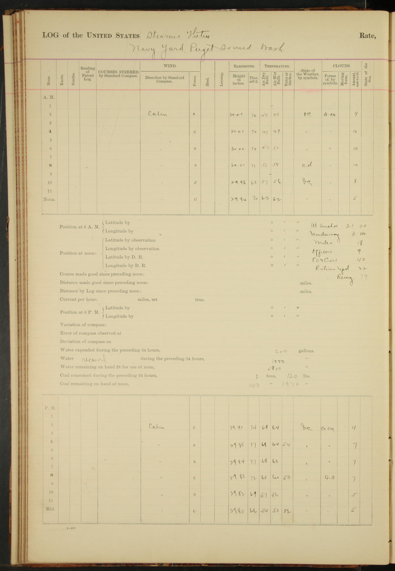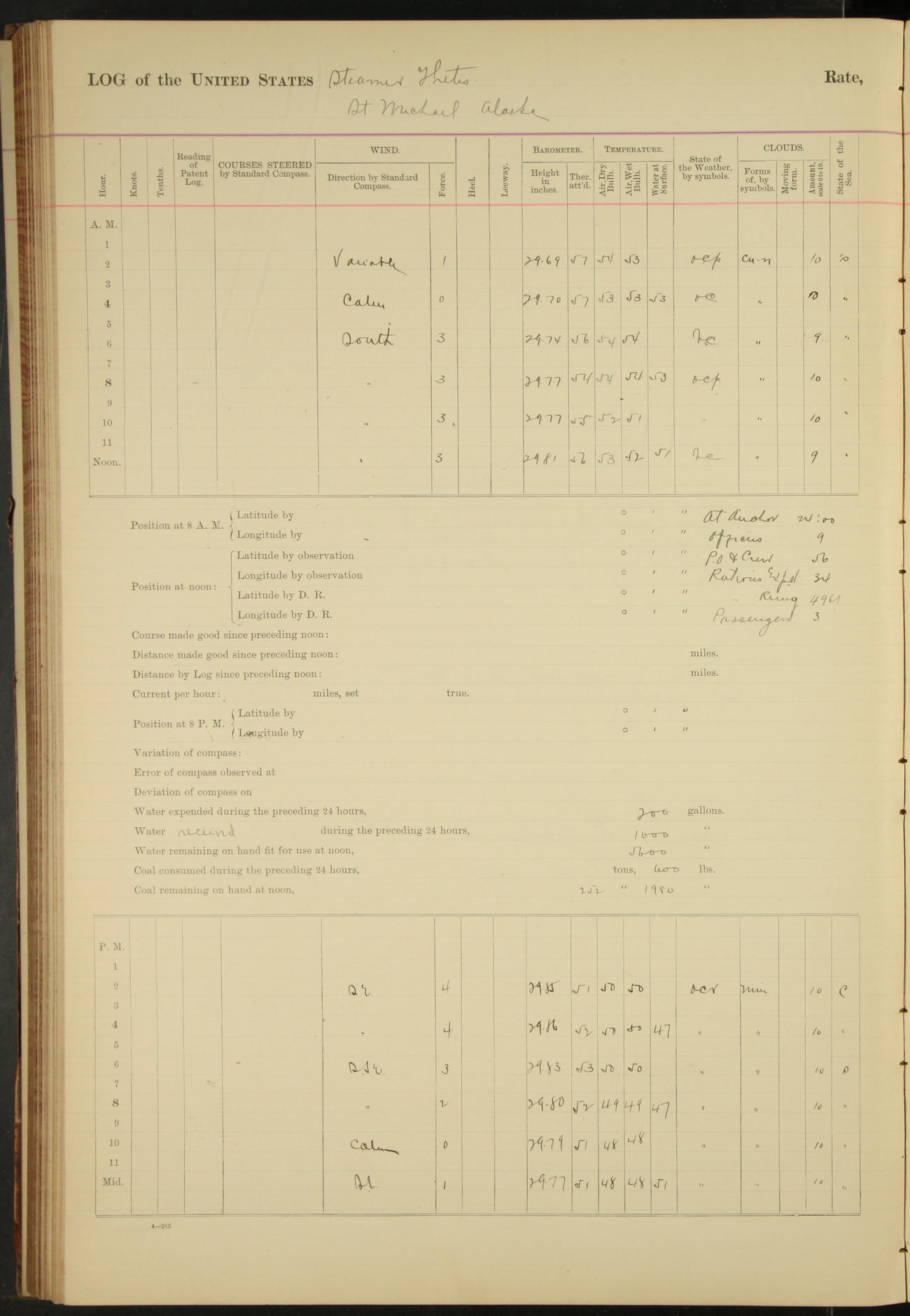 12.00: Barometer continuing to fall and weather showing every indication of growing worse, ordered main boiler filled with salt water and steam raised as rapidly as could be done without injury to boiler. Officers and liberty men detained on shore by heavy wind and rough sea.