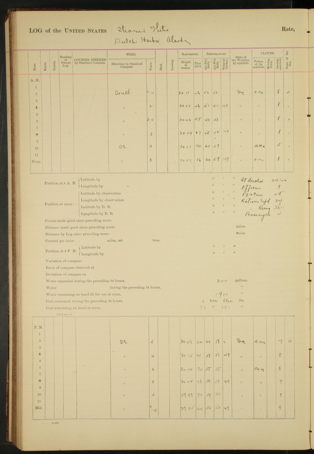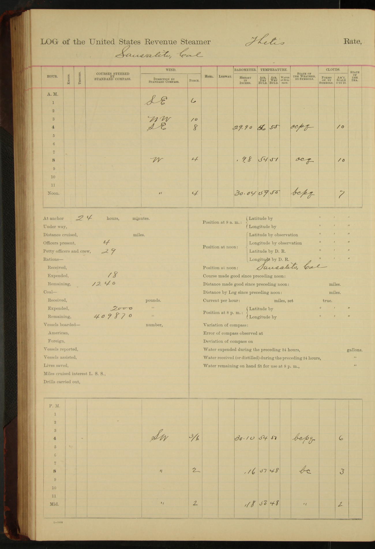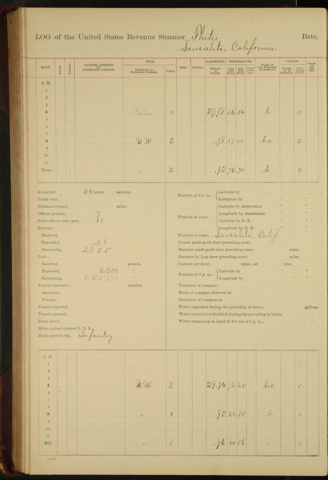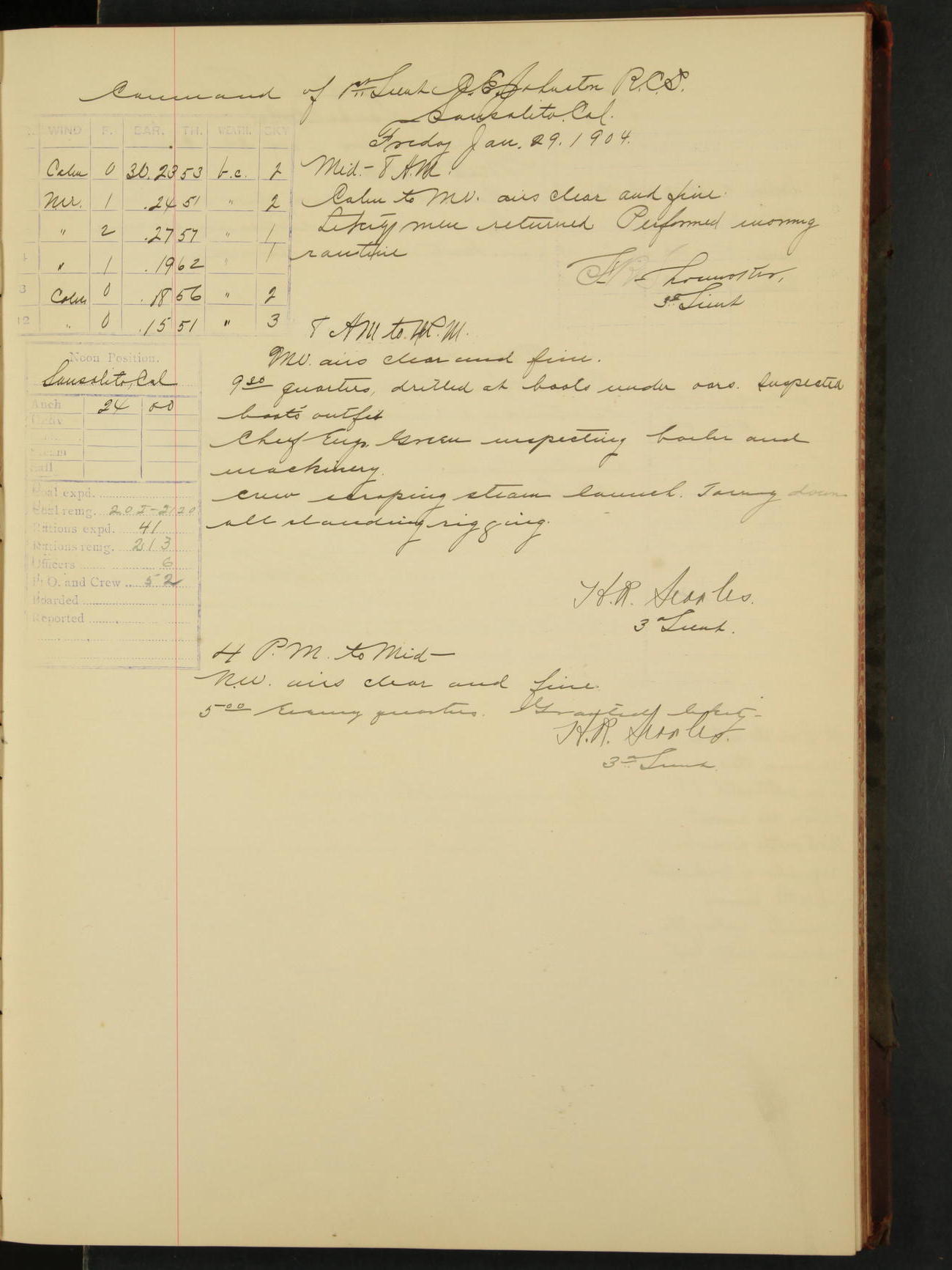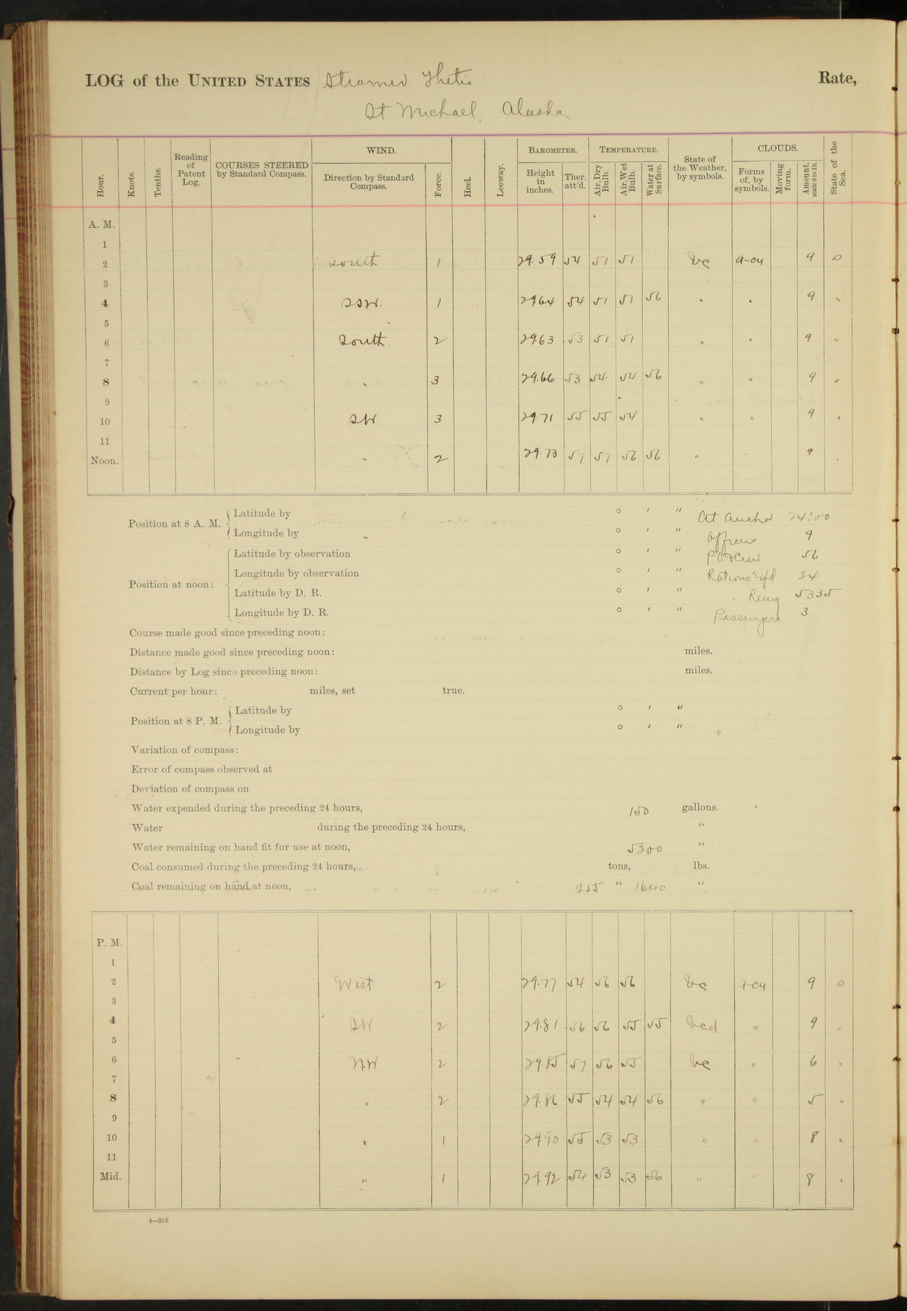 12.00: Barometer continuing to fall and weather showing every indication of growing worse, ordered main boiler filled with salt water and steam raised as rapidly as could be done without injury to boiler. Officers and liberty men detained on shore by heavy wind and rough sea.