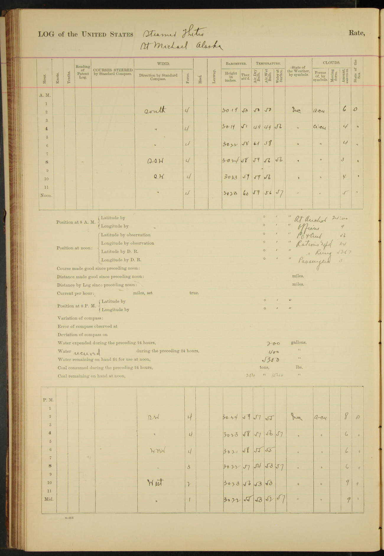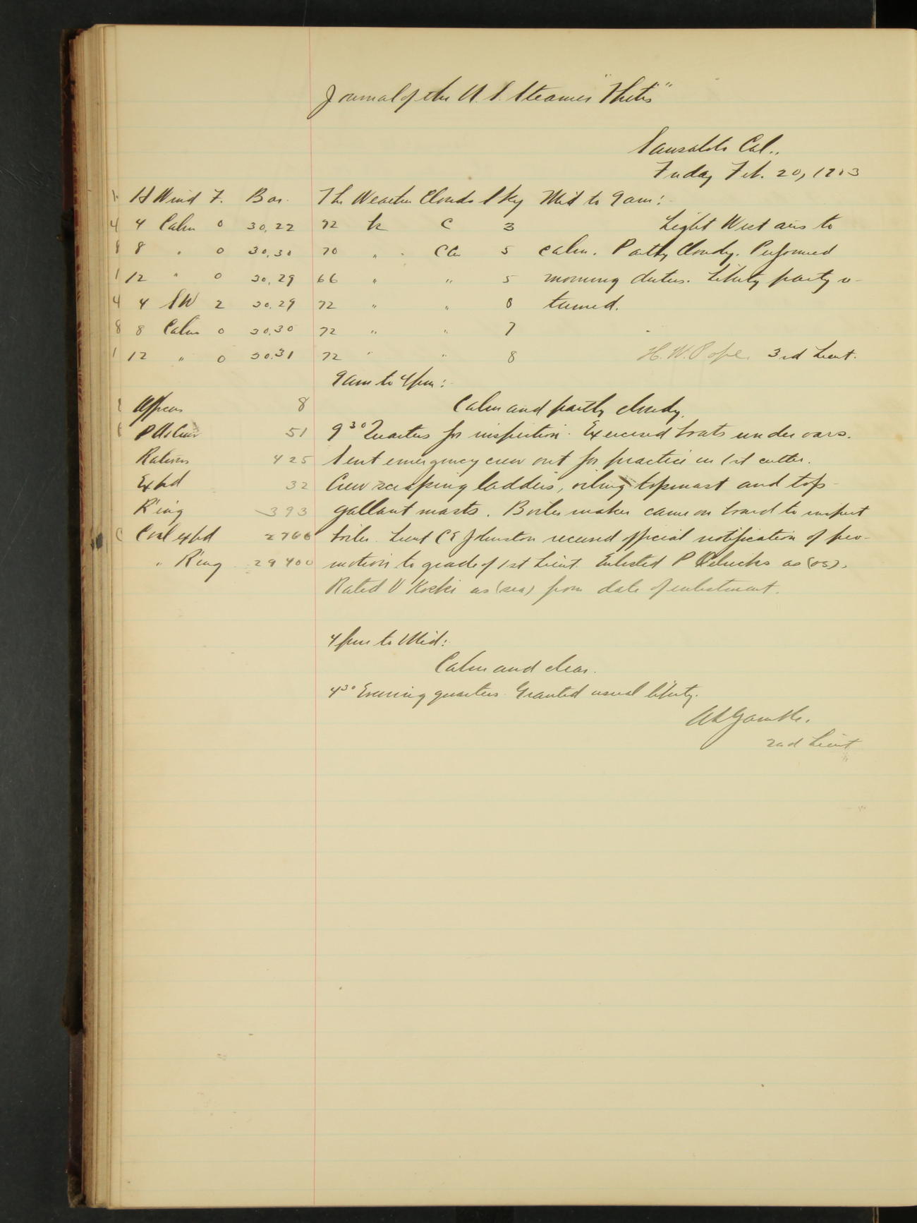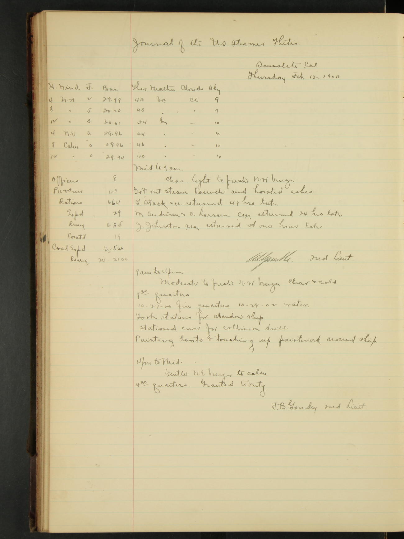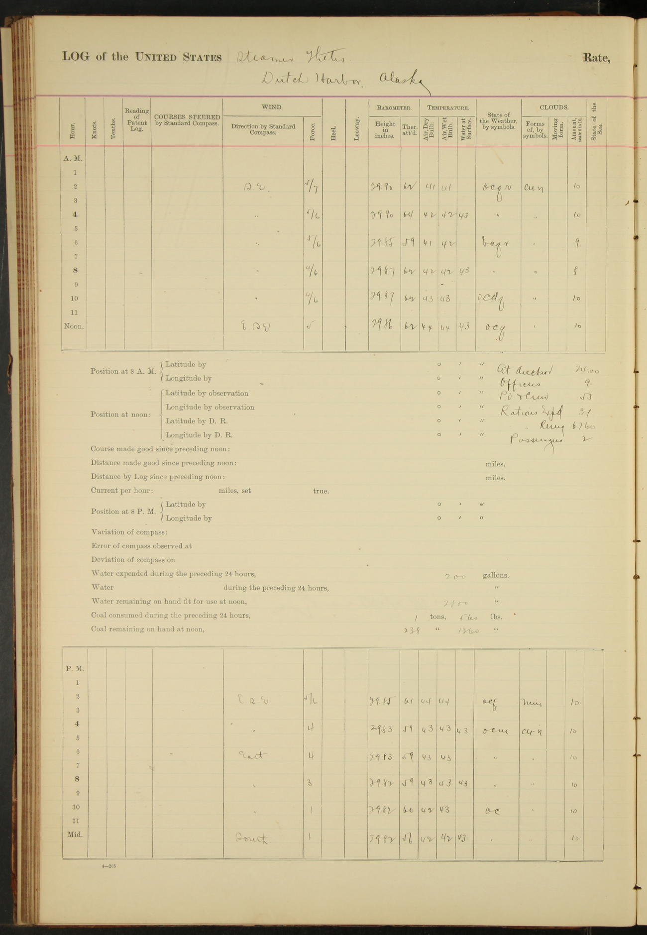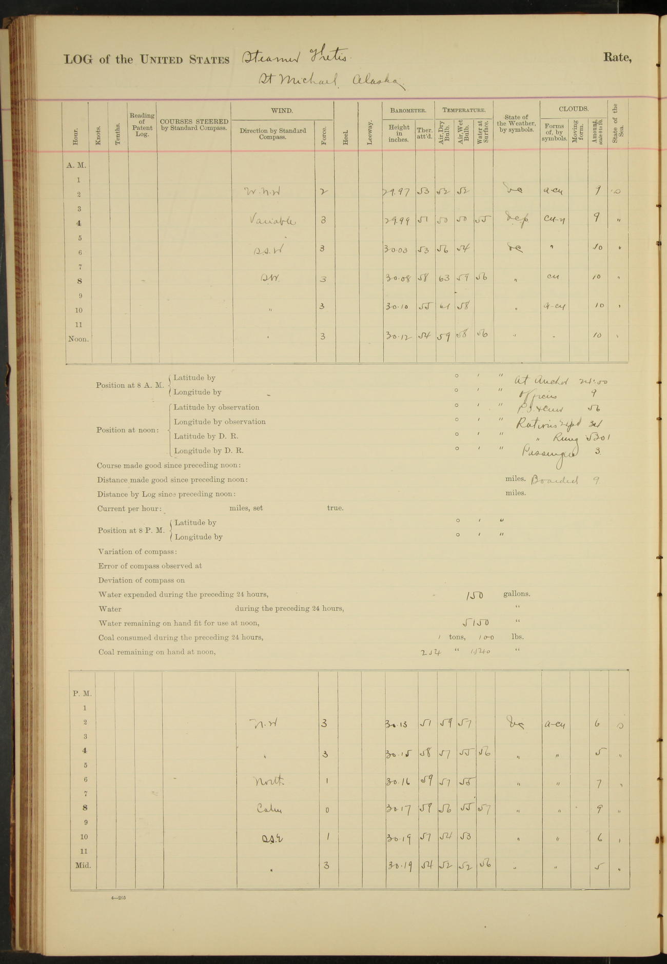 12.00: Barometer continuing to fall and weather showing every indication of growing worse, ordered main boiler filled with salt water and steam raised as rapidly as could be done without injury to boiler. Officers and liberty men detained on shore by heavy wind and rough sea.
