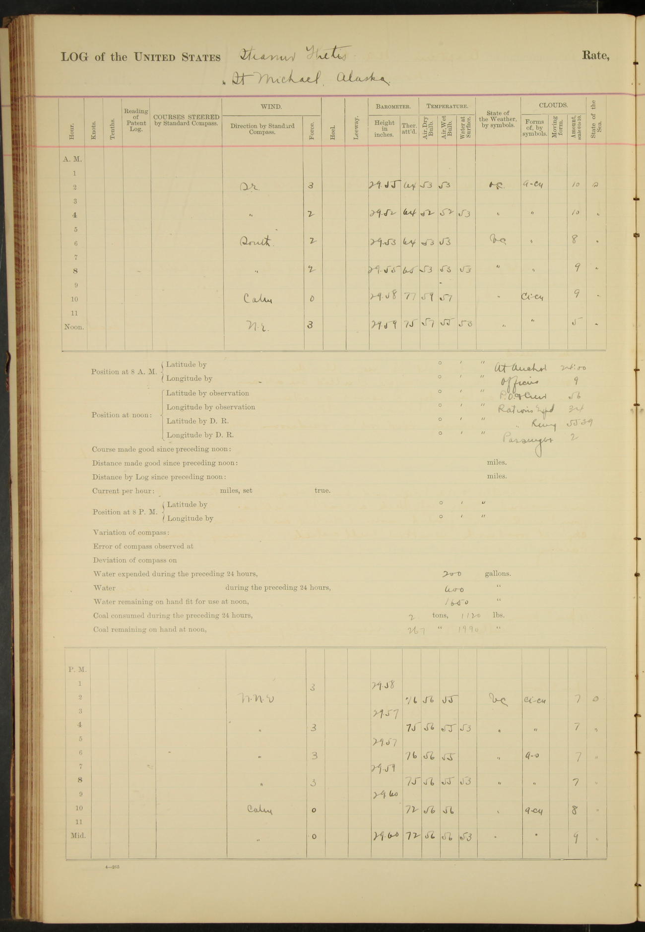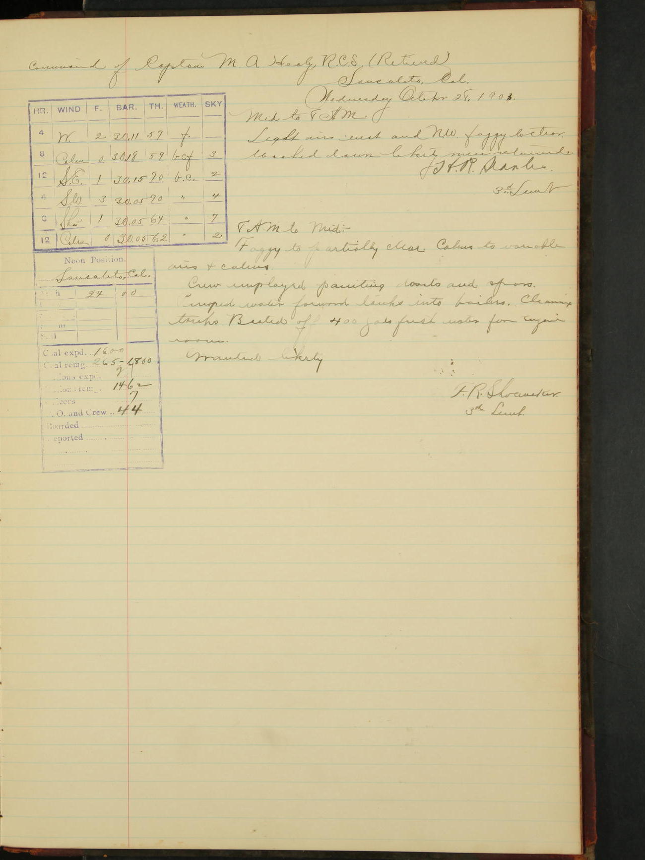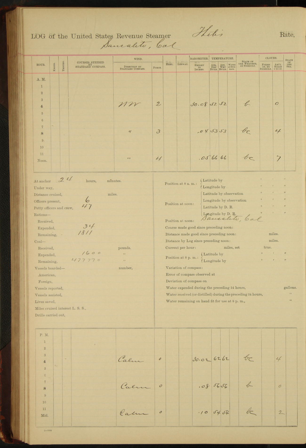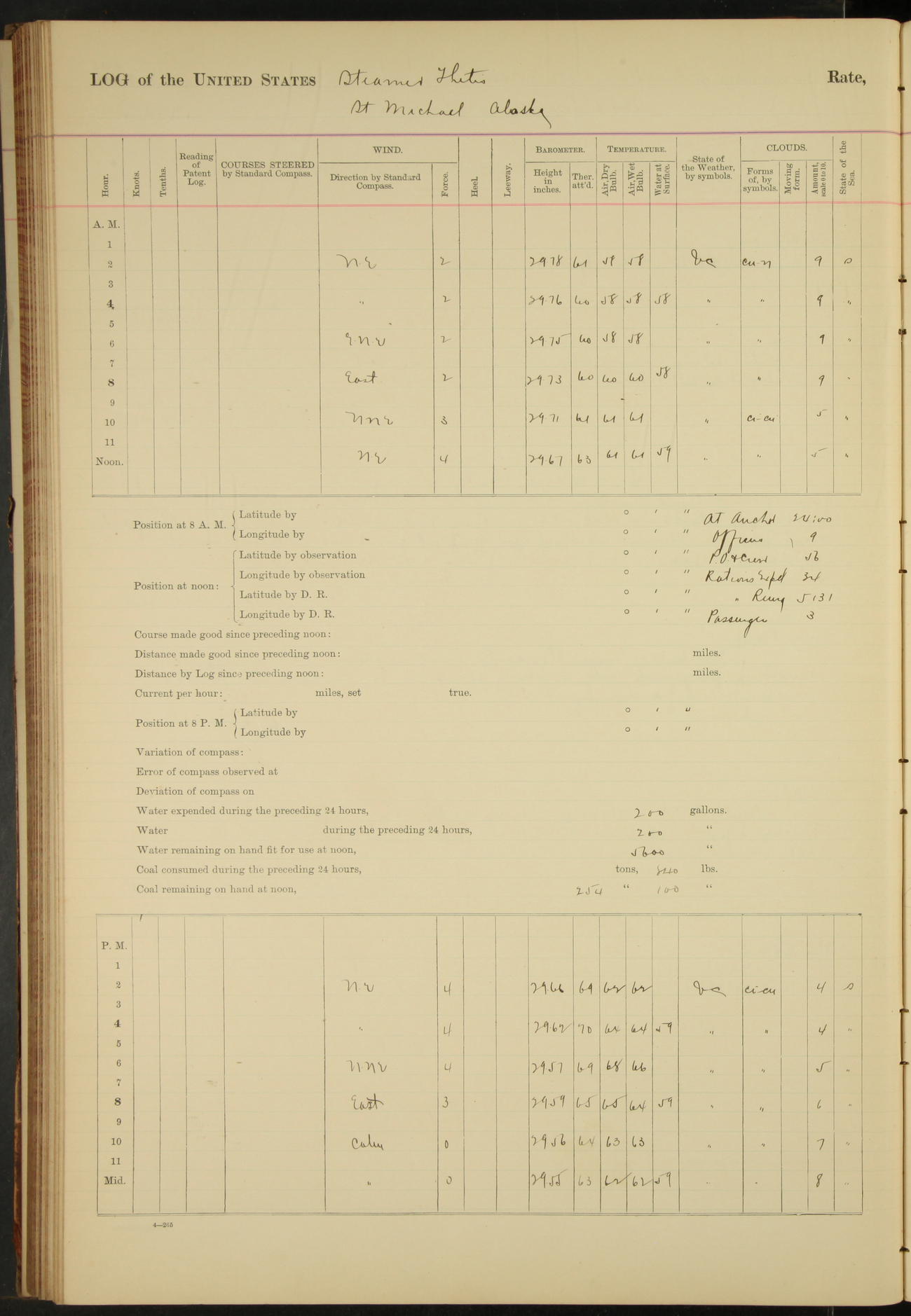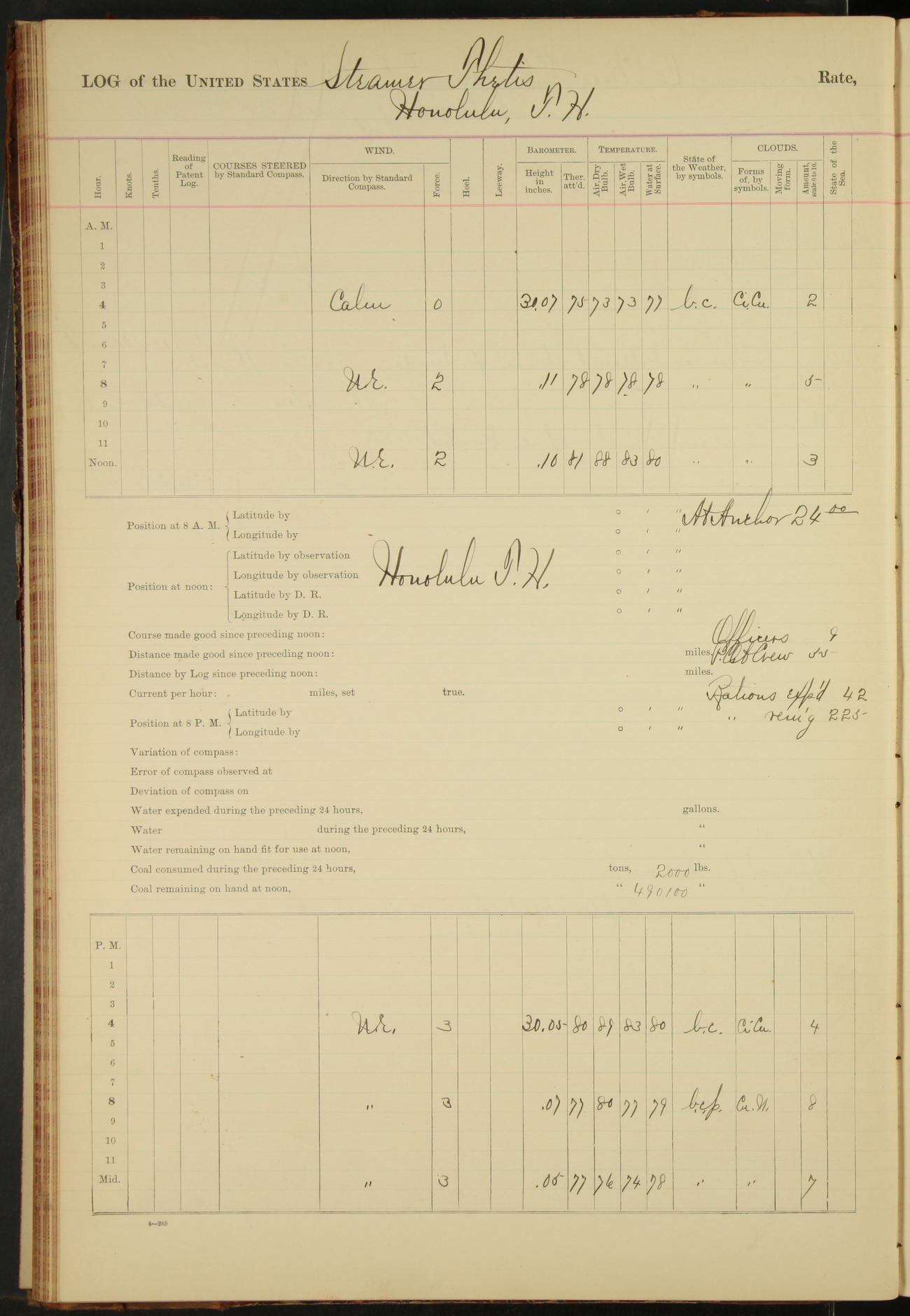 12.00: Barometer continuing to fall and weather showing every indication of growing worse, ordered main boiler filled with salt water and steam raised as rapidly as could be done without injury to boiler. Officers and liberty men detained on shore by heavy wind and rough sea.