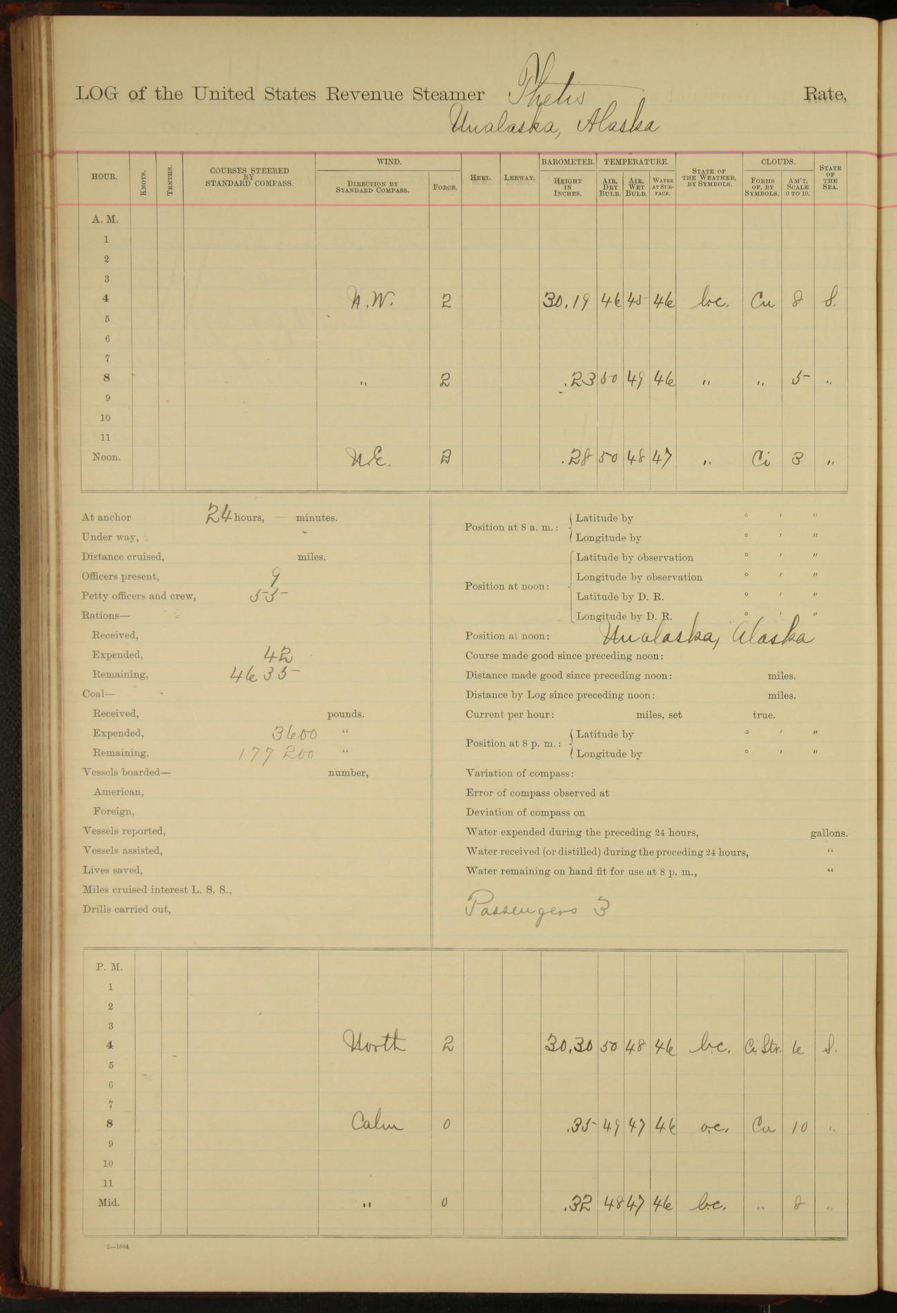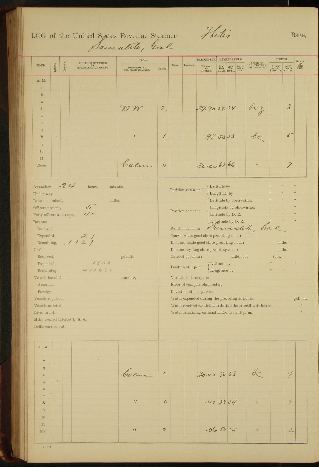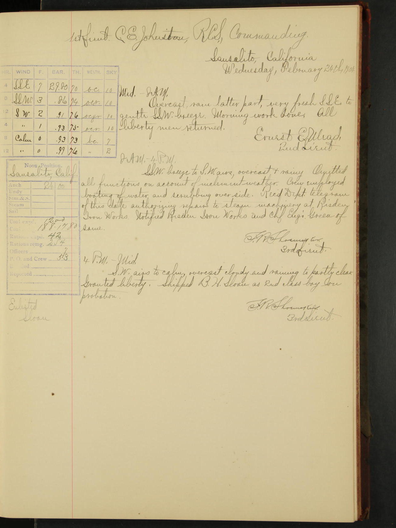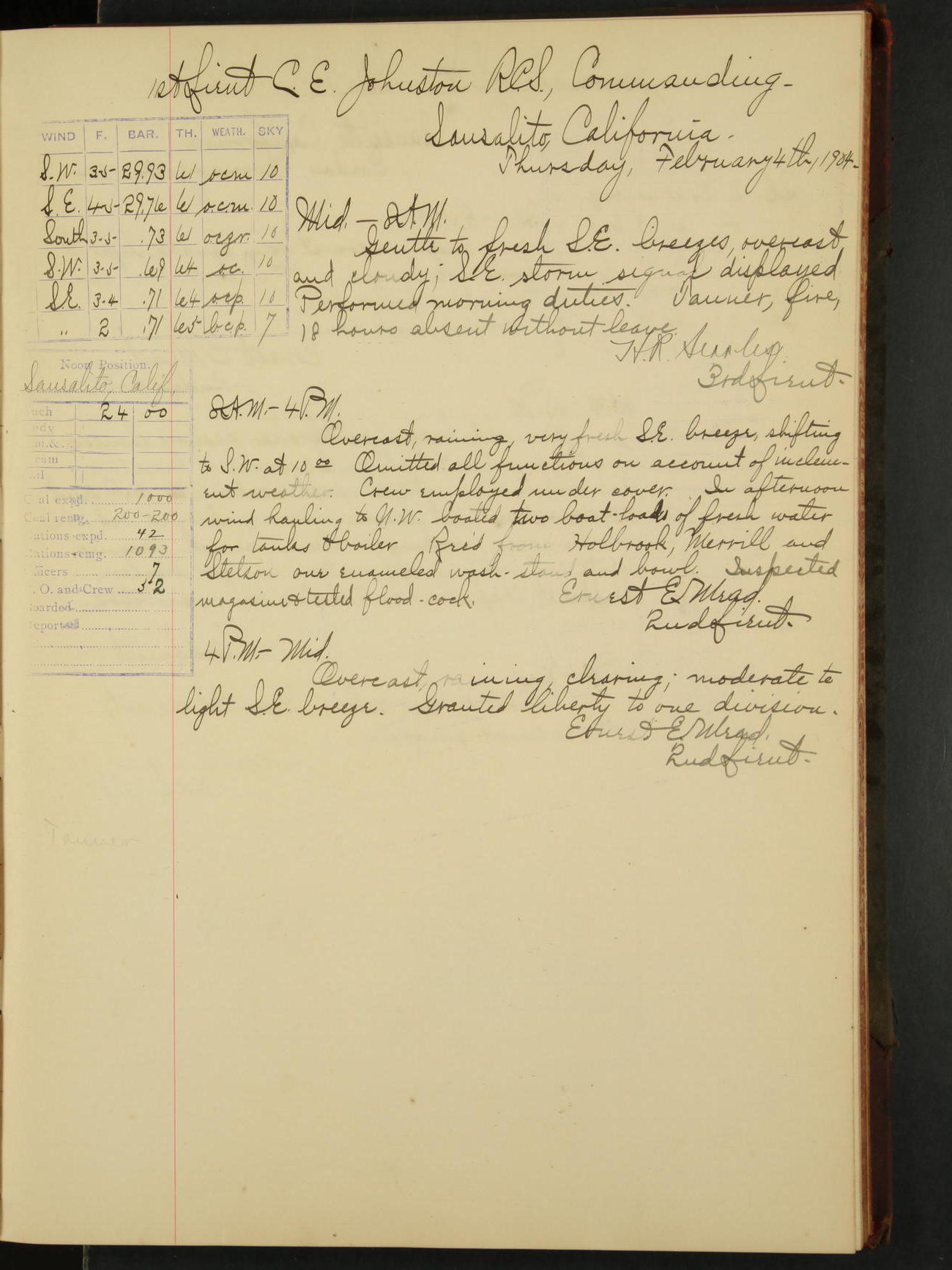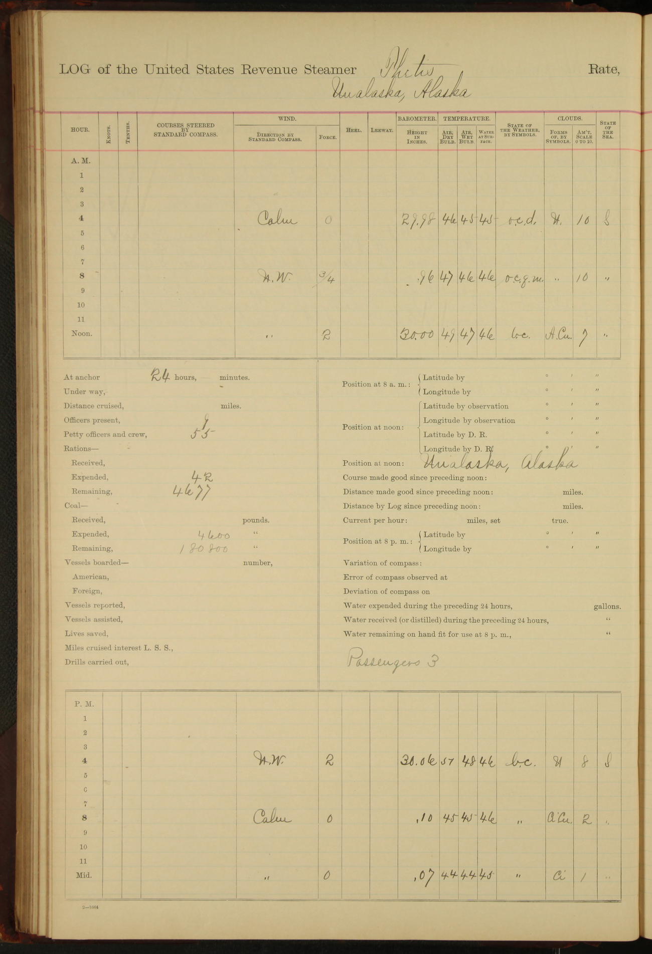 12.00: Barometer continuing to fall and weather showing every indication of growing worse, ordered main boiler filled with salt water and steam raised as rapidly as could be done without injury to boiler. Officers and liberty men detained on shore by heavy wind and rough sea.