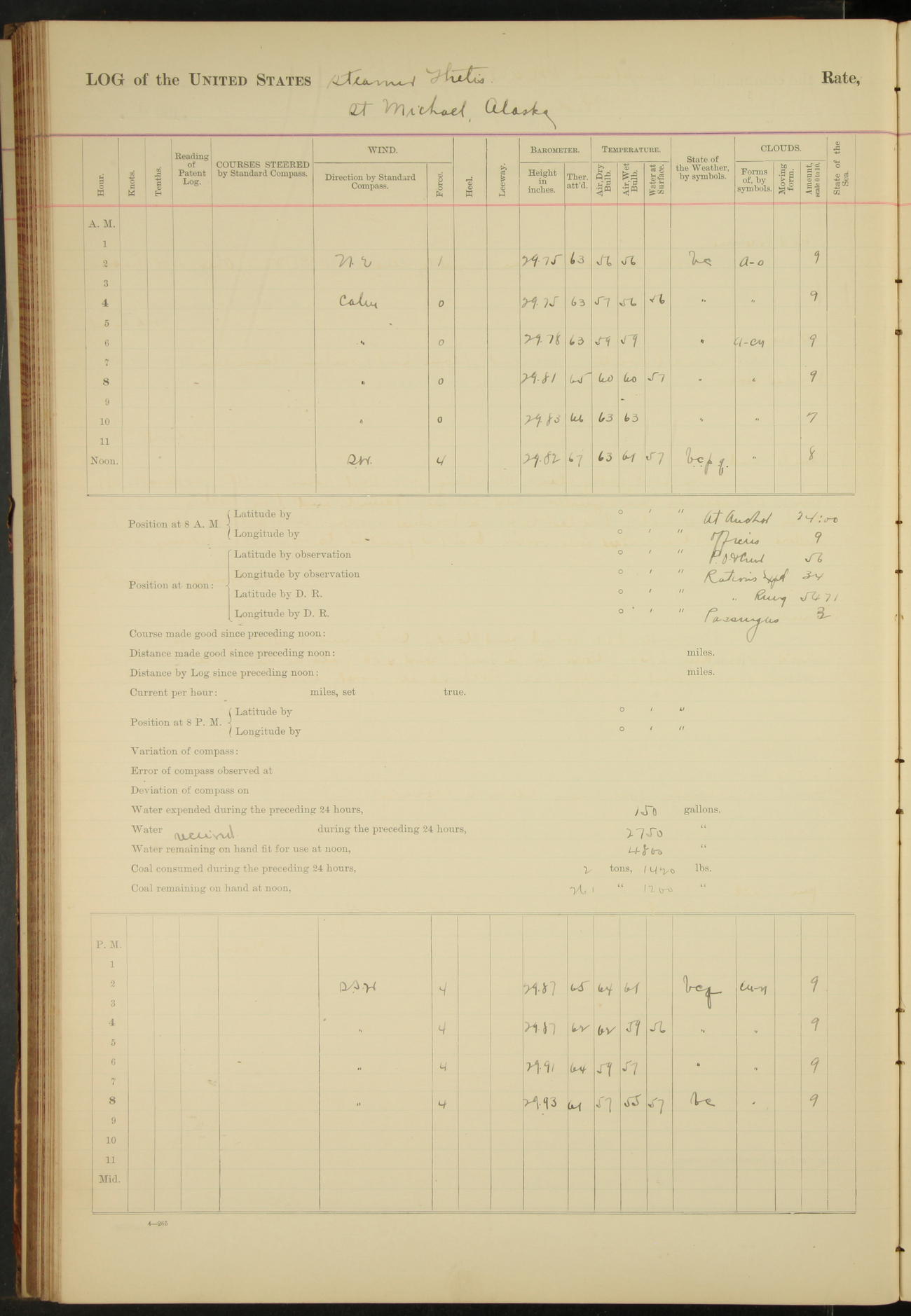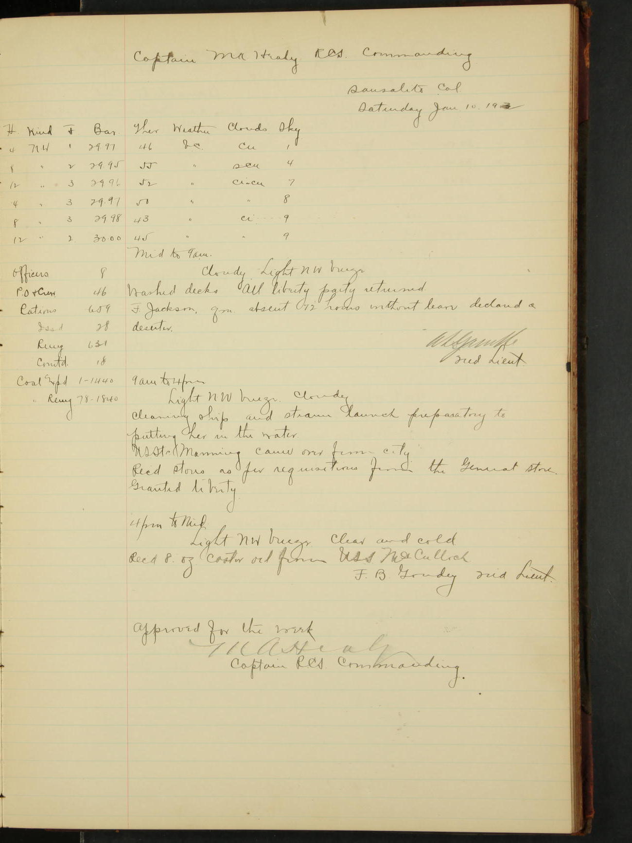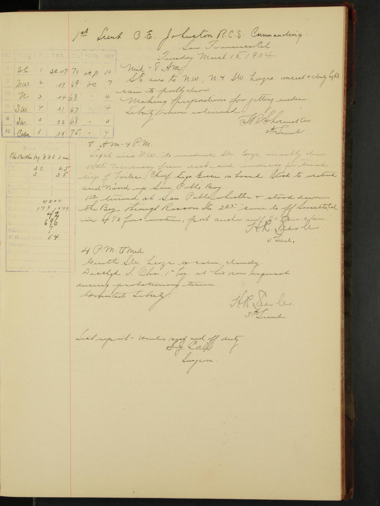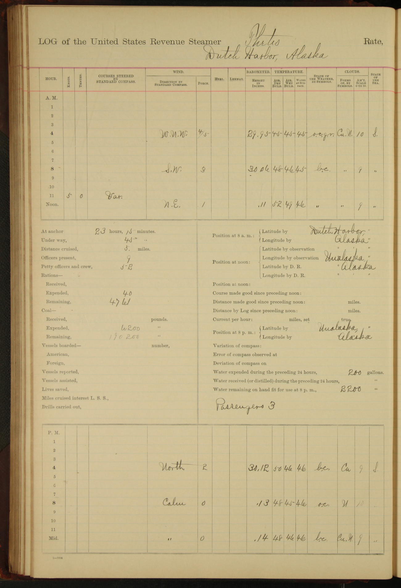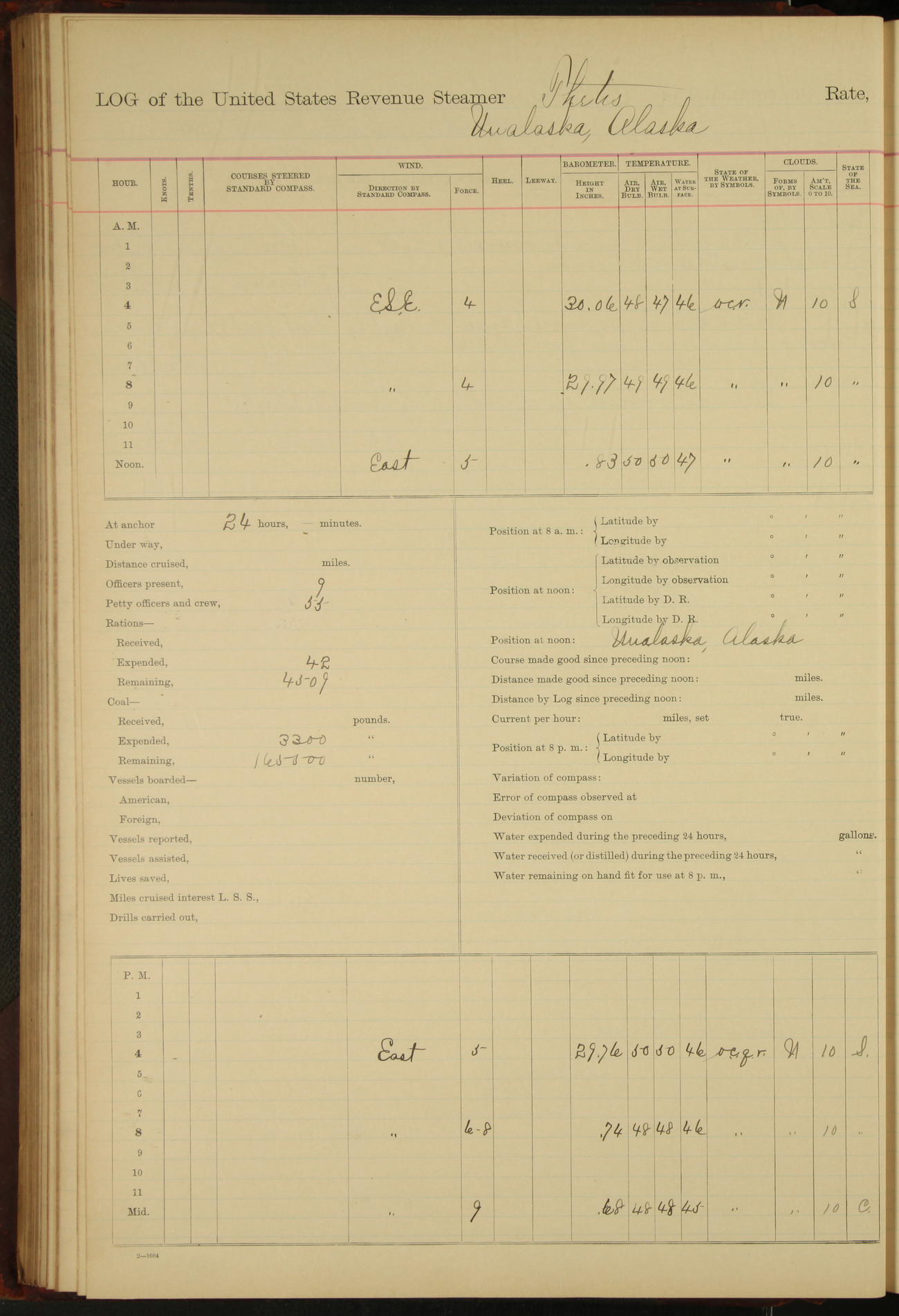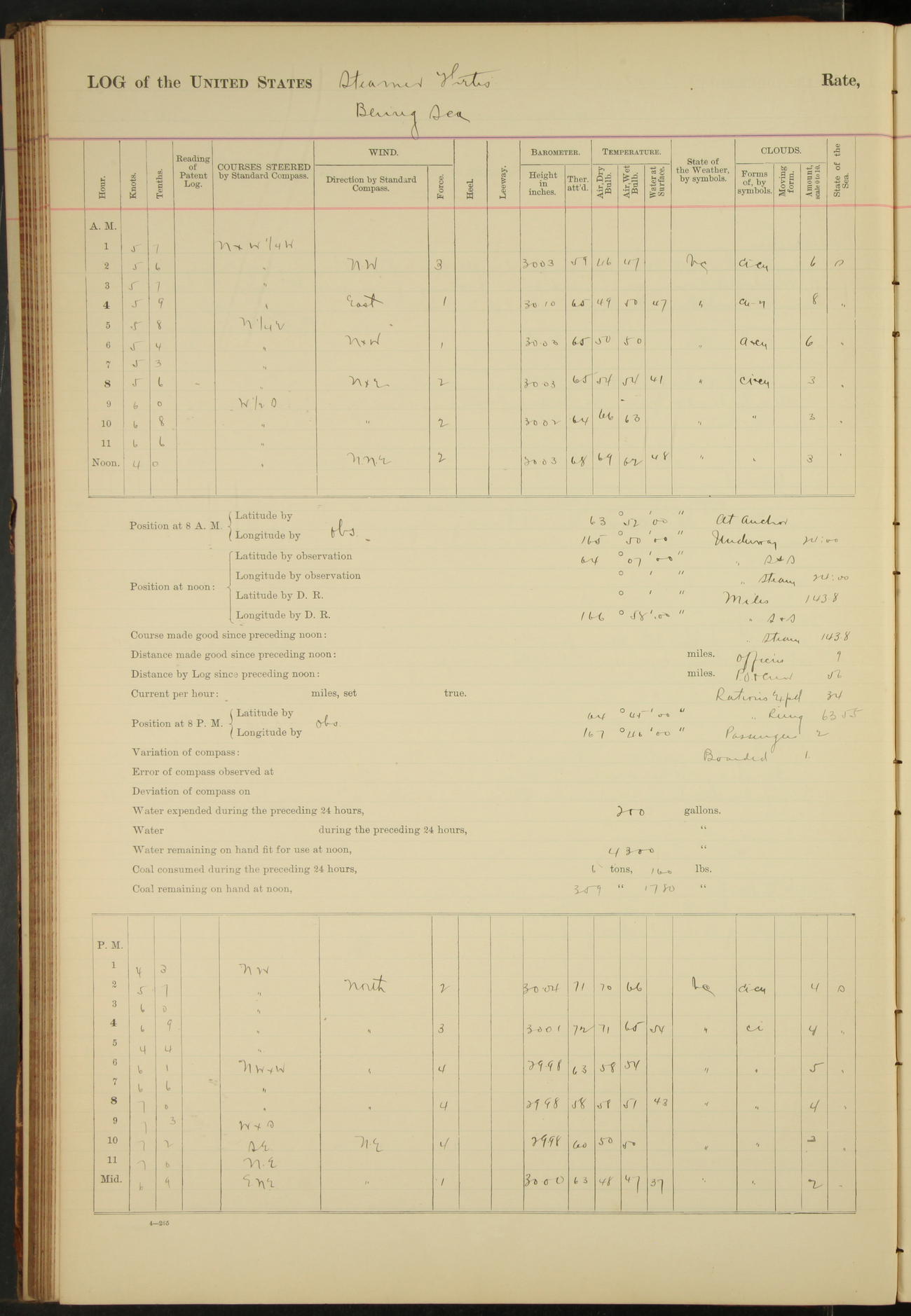 12.00: Barometer continuing to fall and weather showing every indication of growing worse, ordered main boiler filled with salt water and steam raised as rapidly as could be done without injury to boiler. Officers and liberty men detained on shore by heavy wind and rough sea.