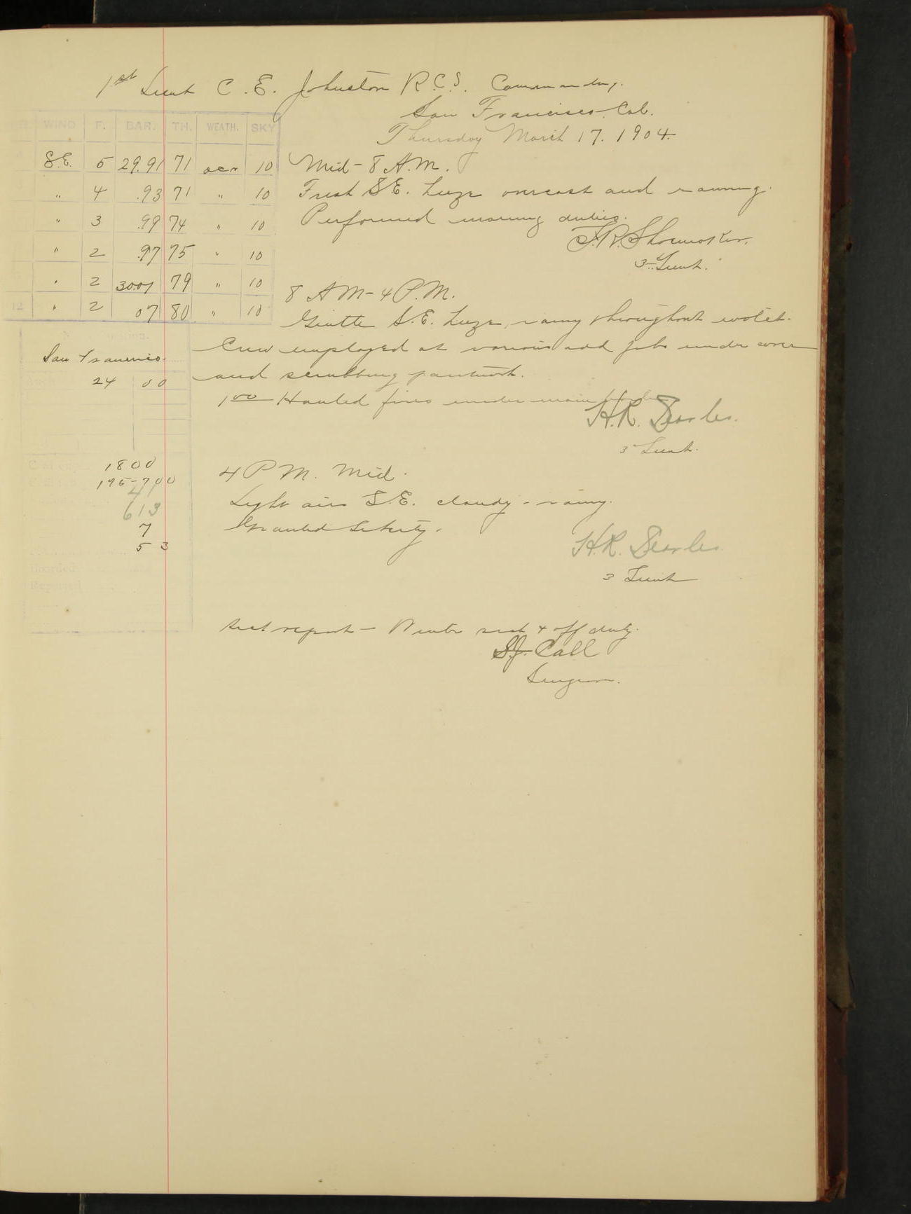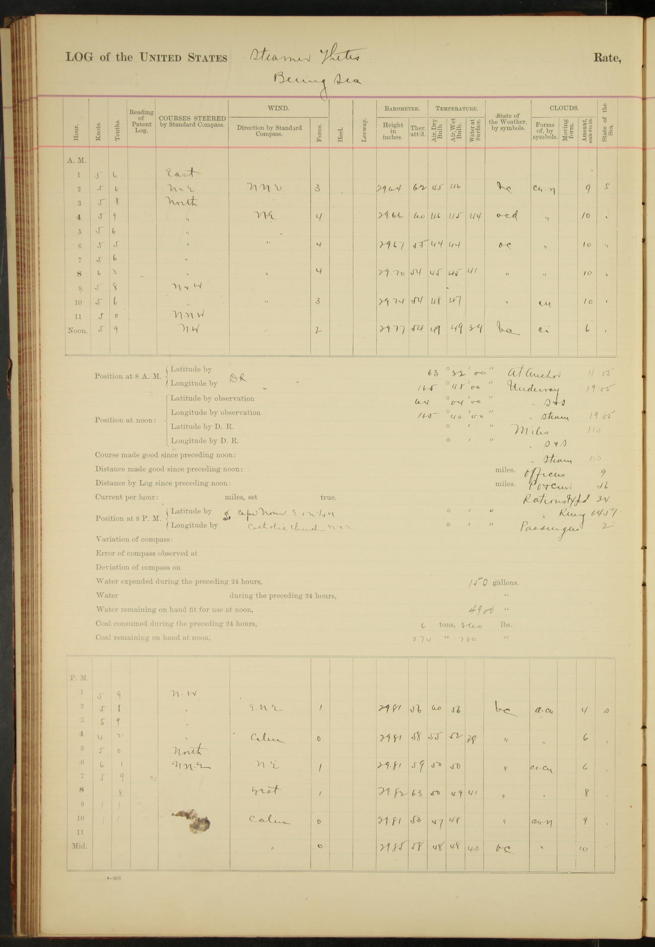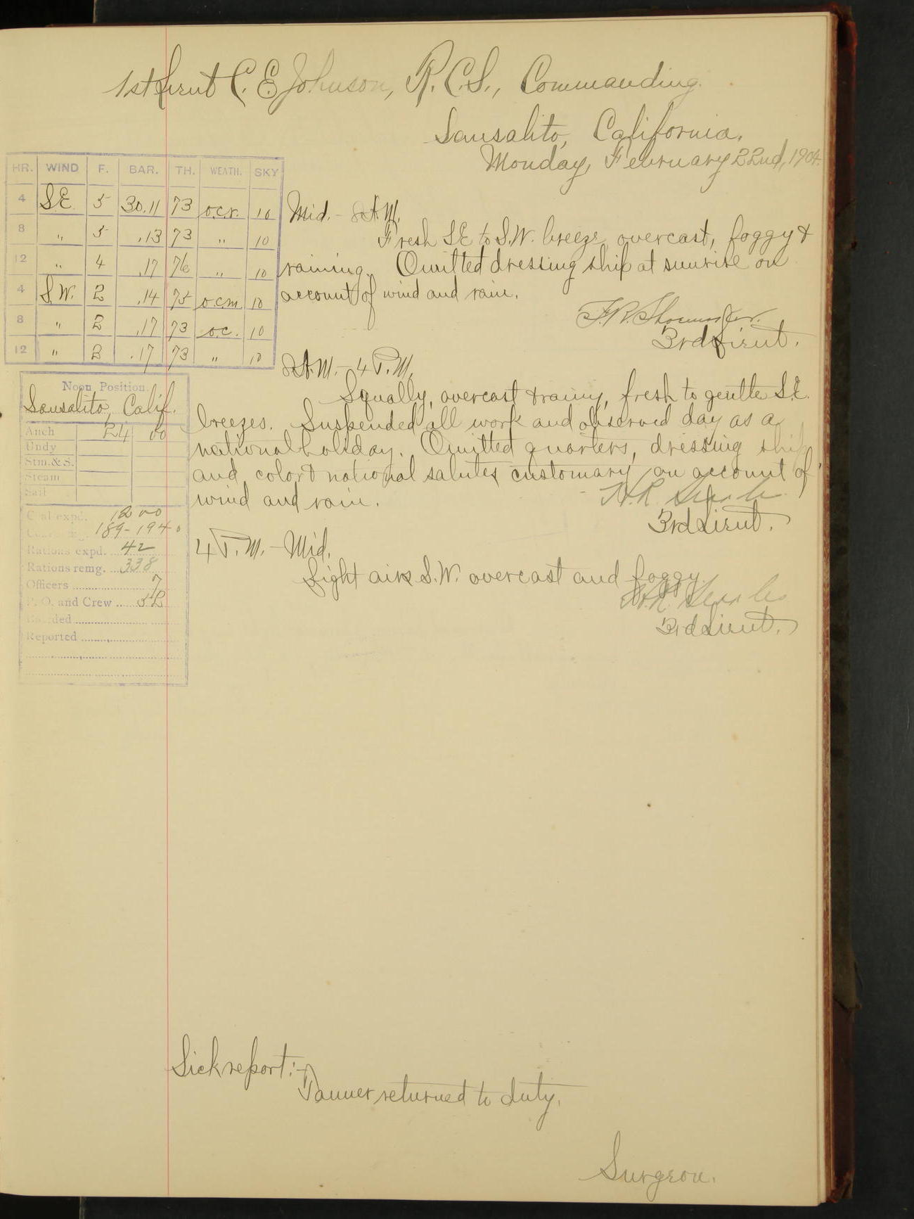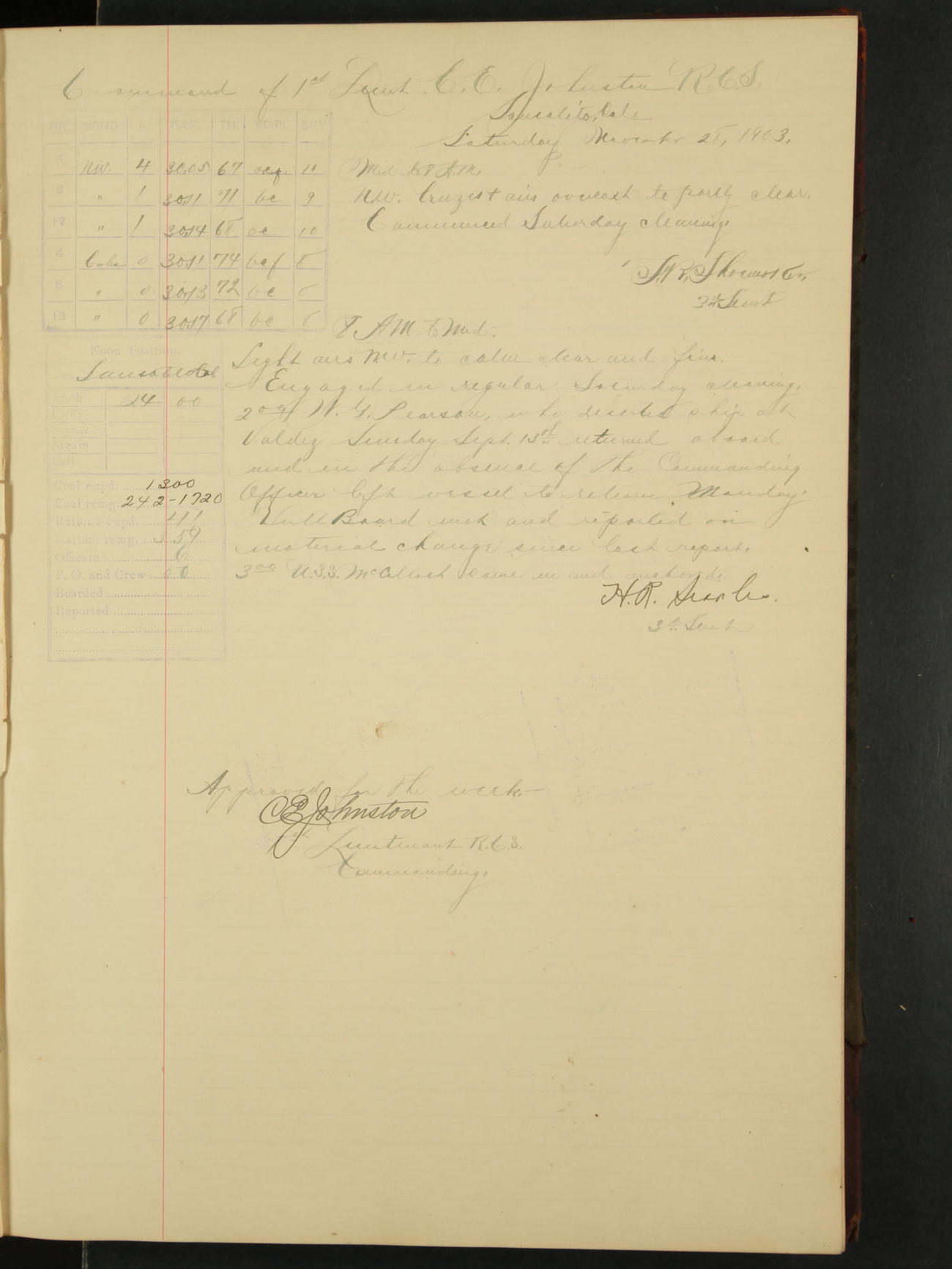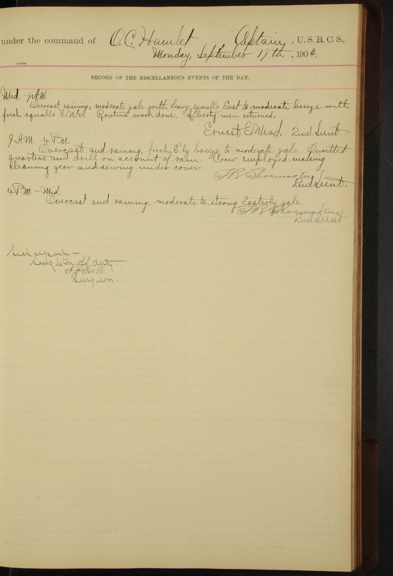12.00: Barometer continuing to fall and weather showing every indication of growing worse, ordered main boiler filled with salt water and steam raised as rapidly as could be done without injury to boiler. Officers and liberty men detained on shore by heavy wind and rough sea.