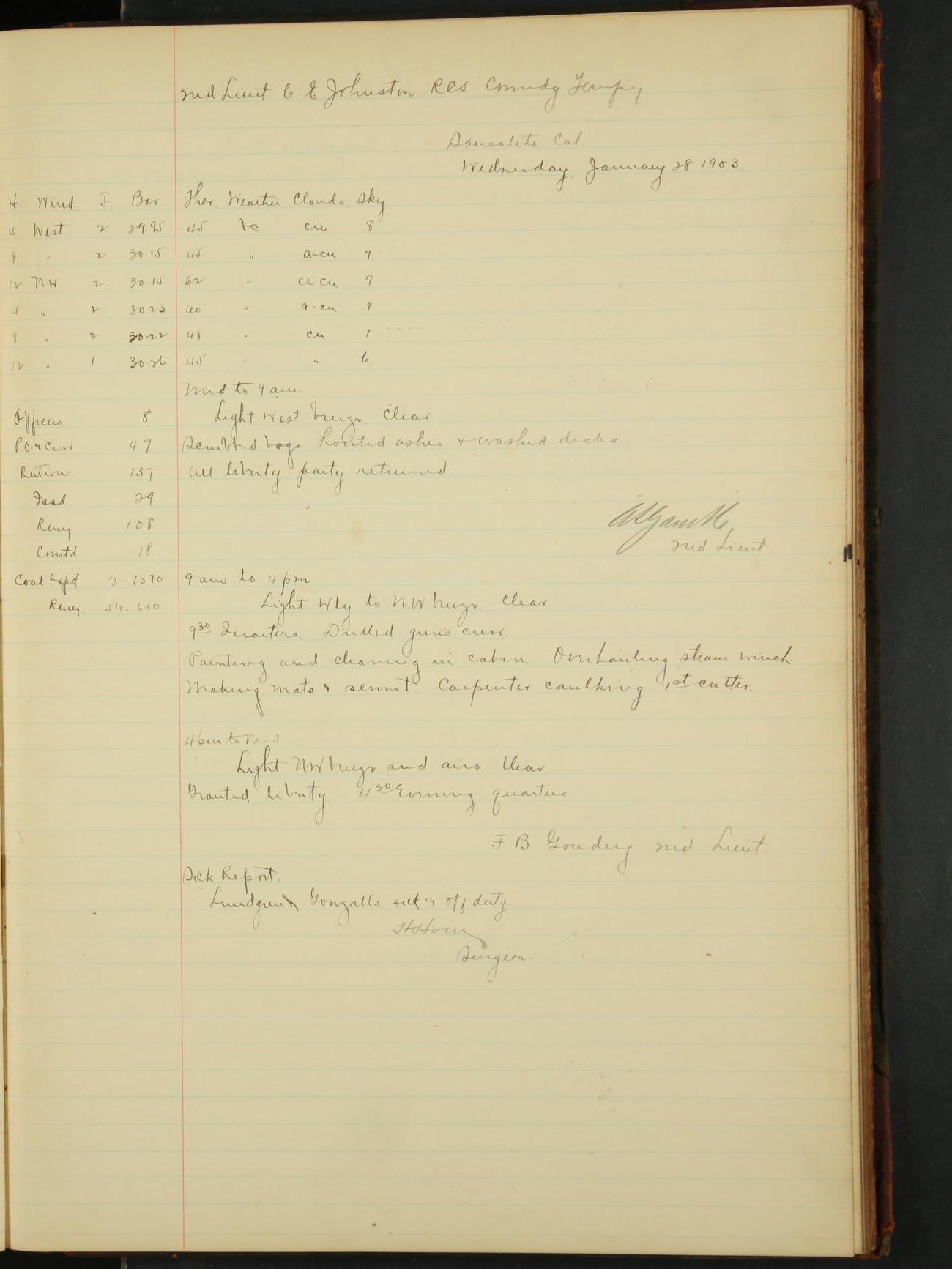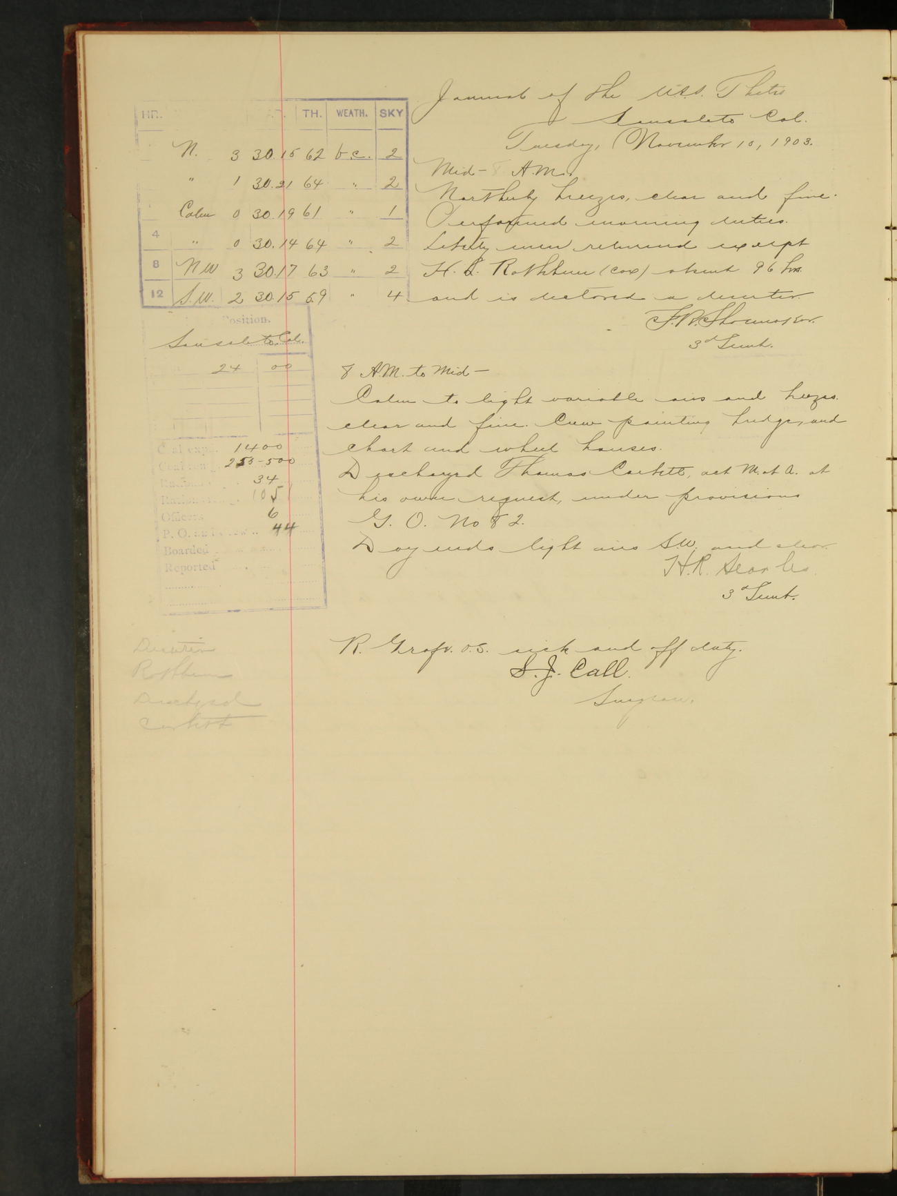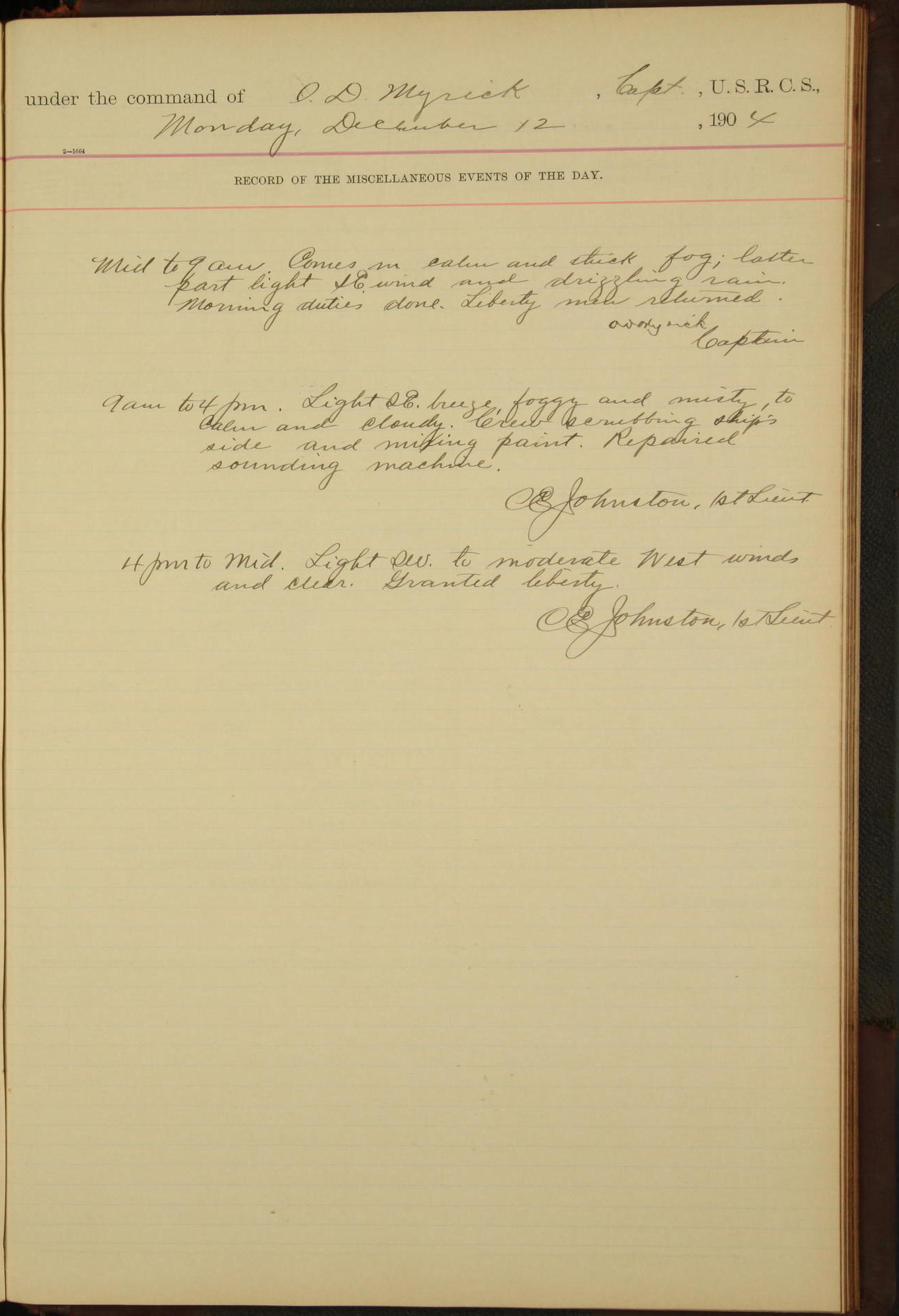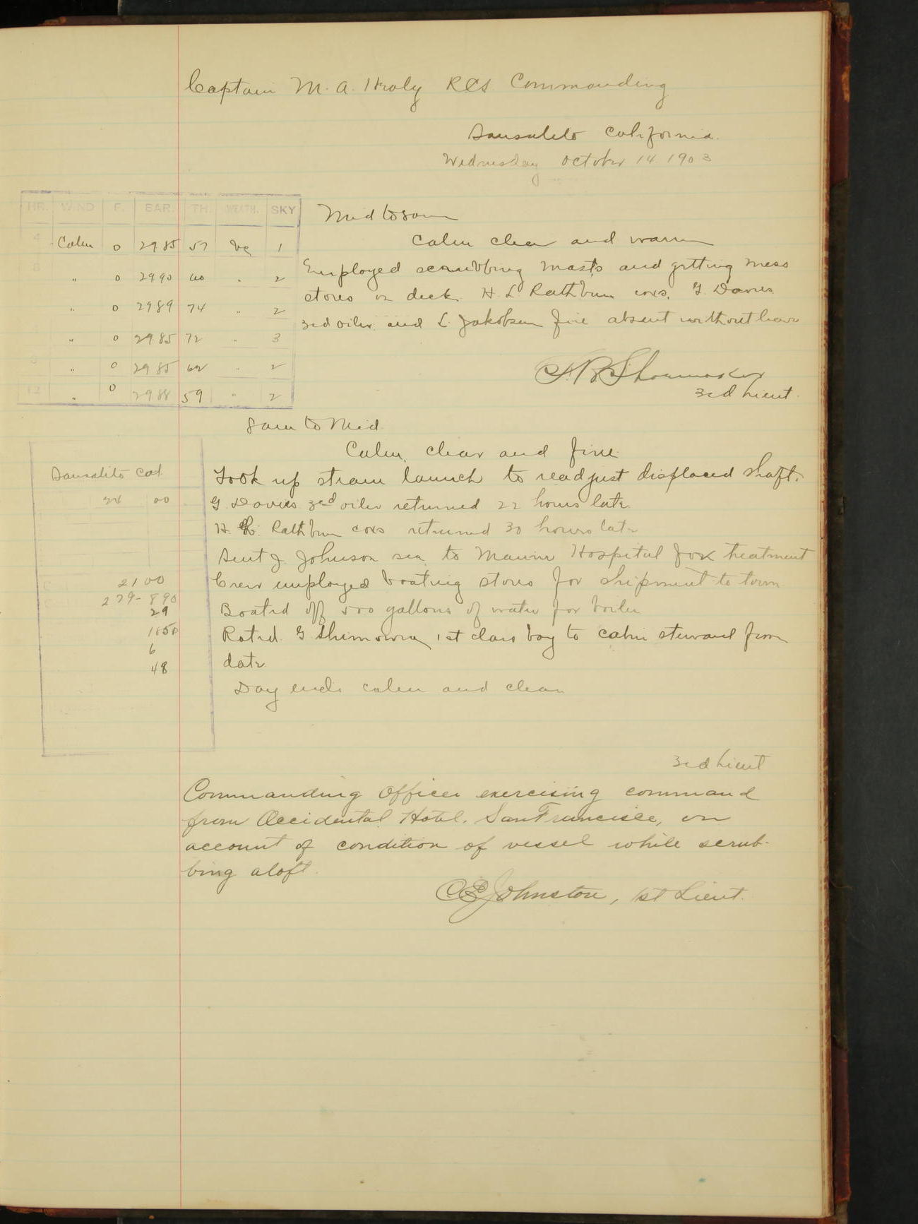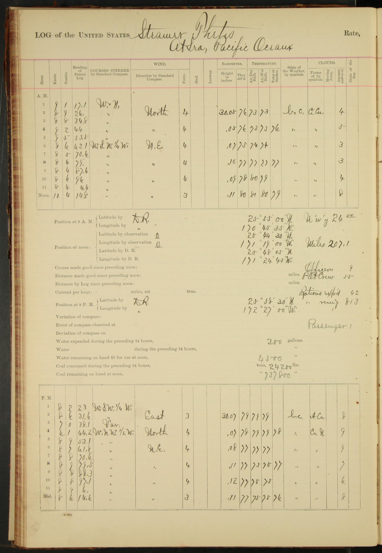 12.00: Barometer continuing to fall and weather showing every indication of growing worse, ordered main boiler filled with salt water and steam raised as rapidly as could be done without injury to boiler. Officers and liberty men detained on shore by heavy wind and rough sea.