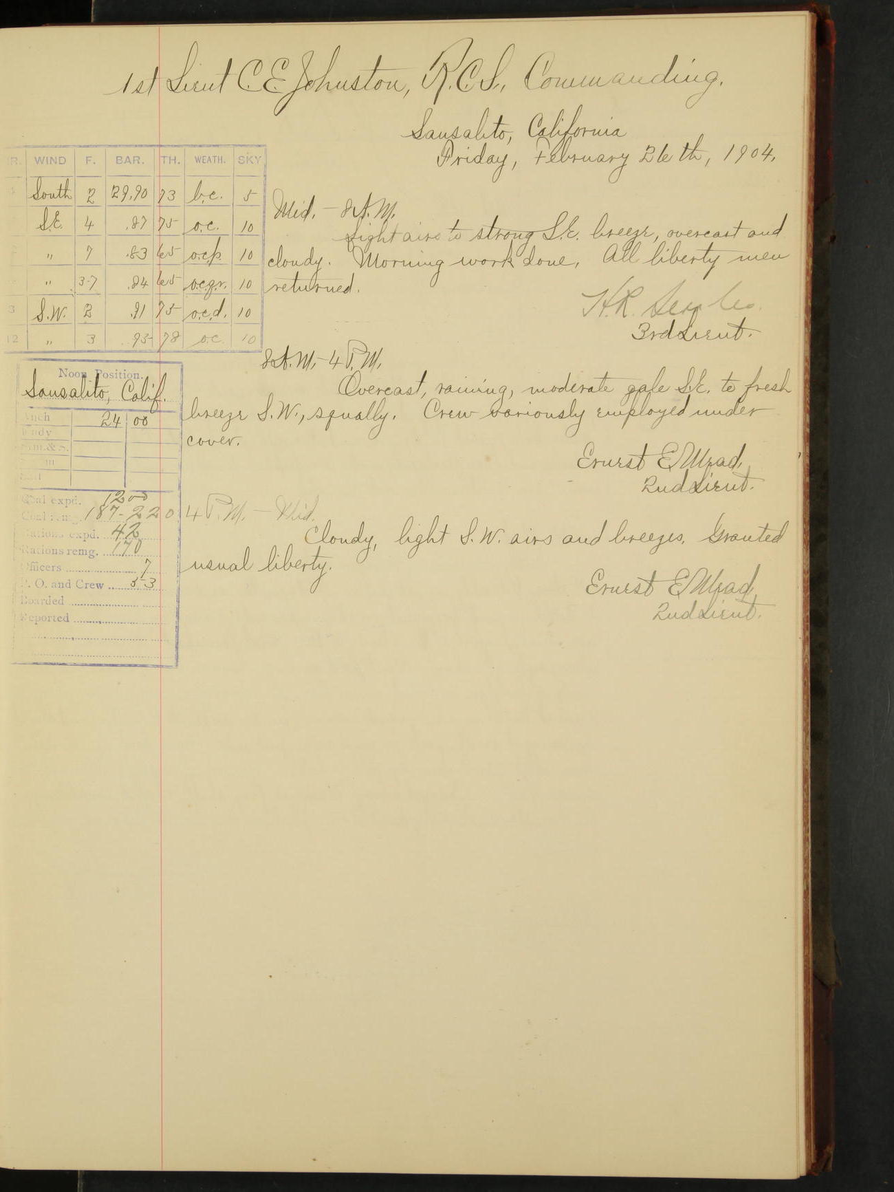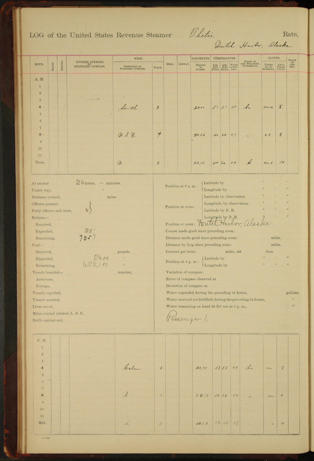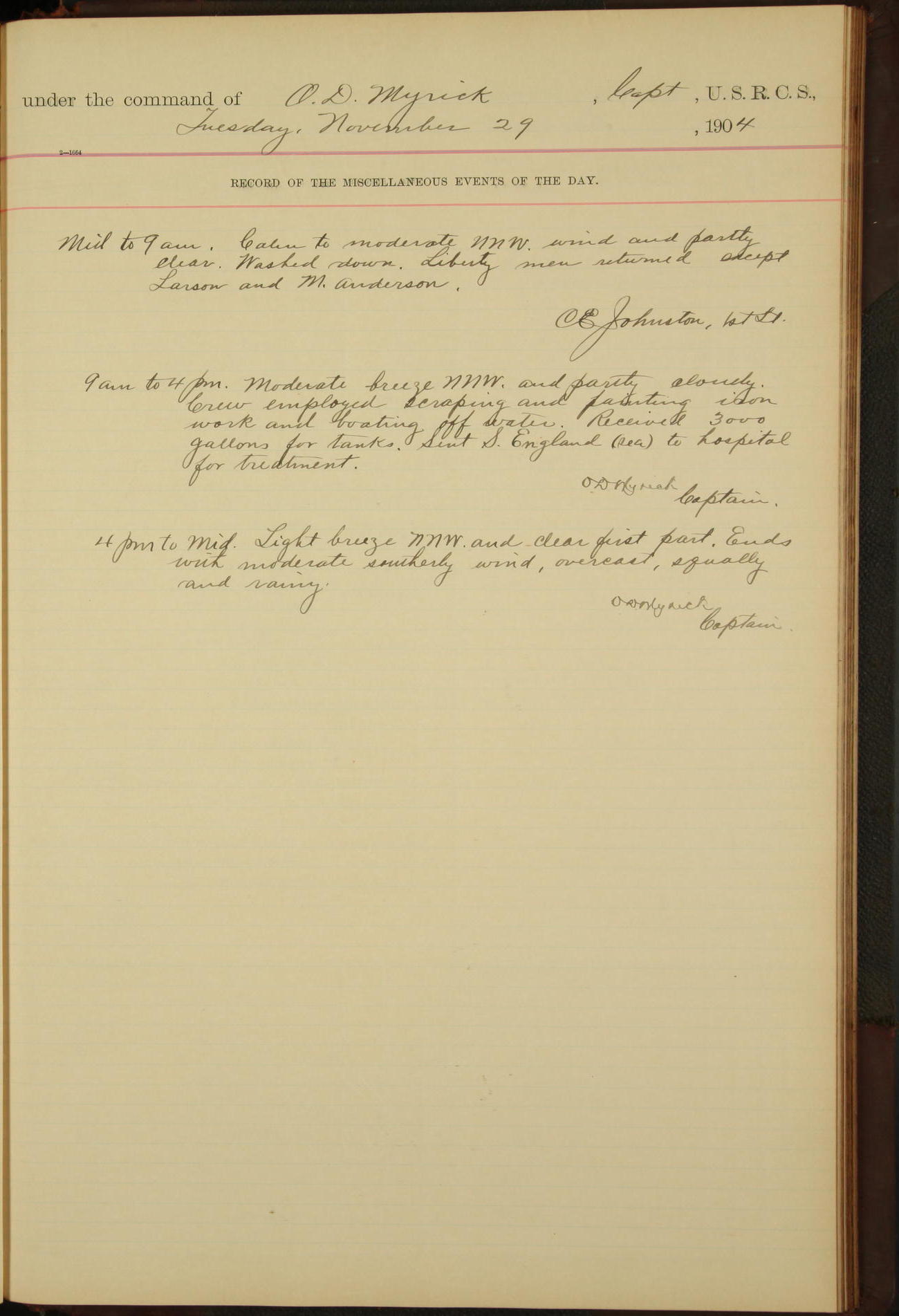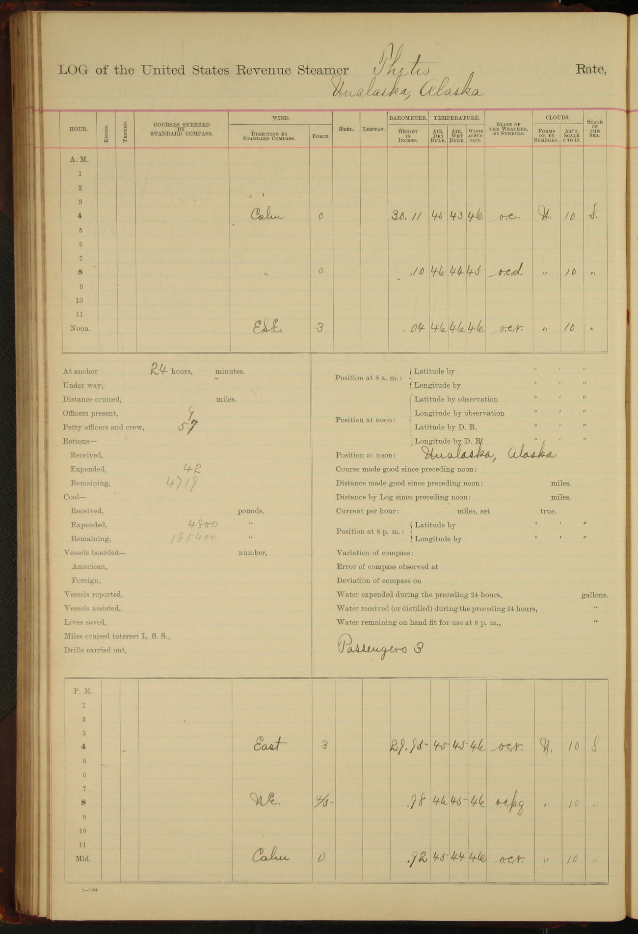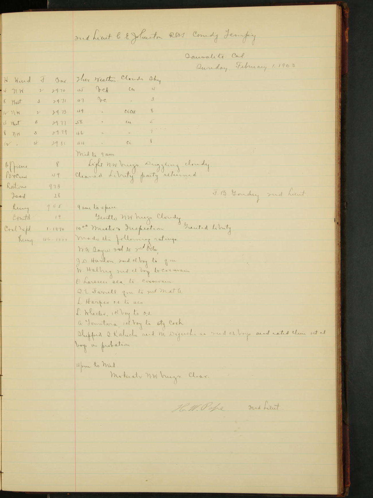 12.00: Barometer continuing to fall and weather showing every indication of growing worse, ordered main boiler filled with salt water and steam raised as rapidly as could be done without injury to boiler. Officers and liberty men detained on shore by heavy wind and rough sea.