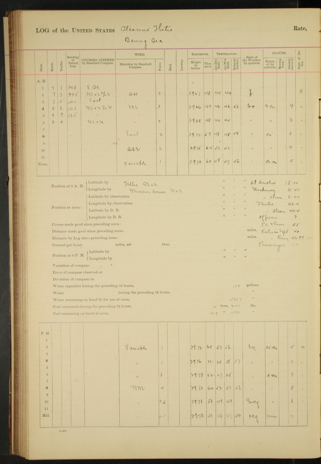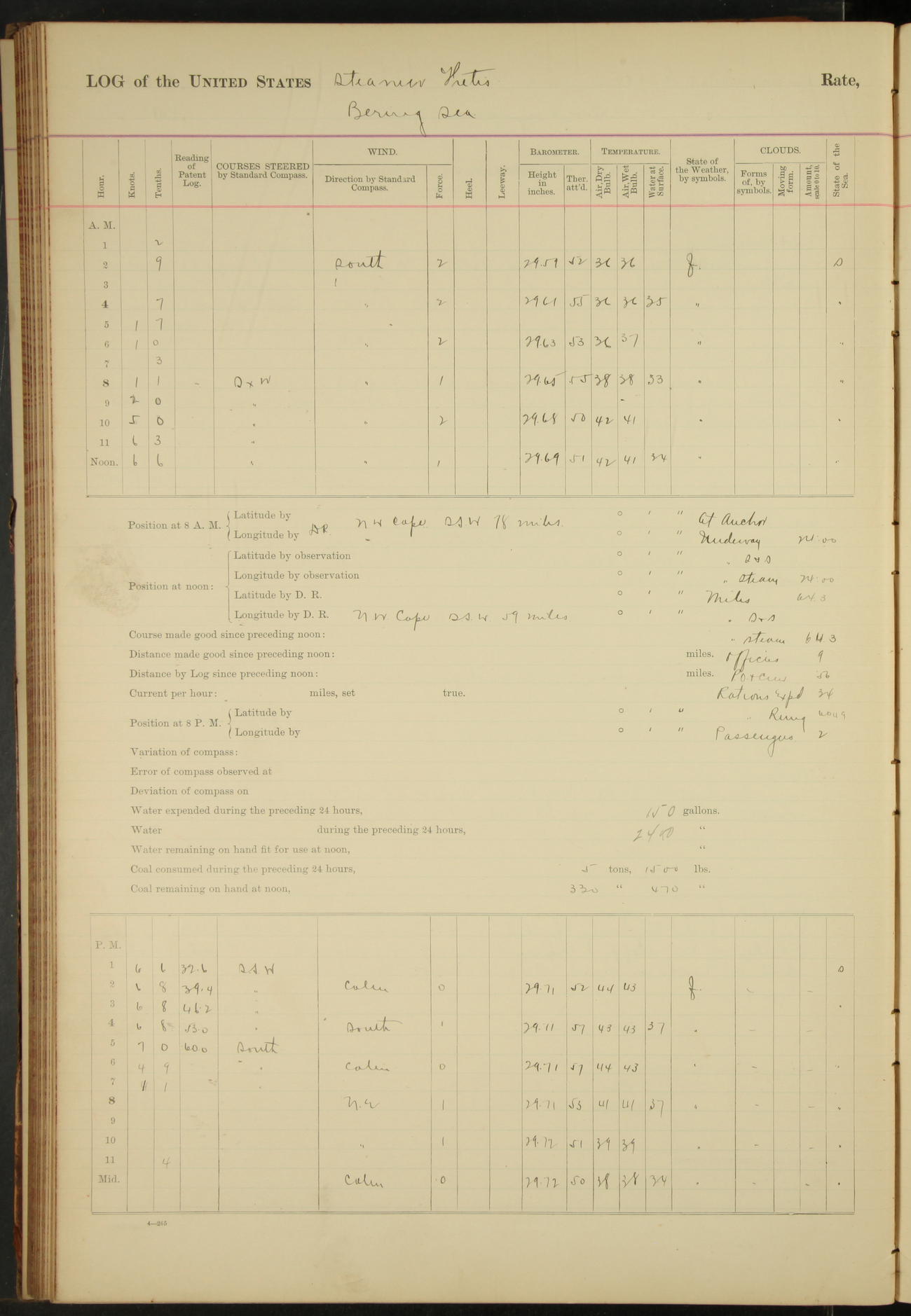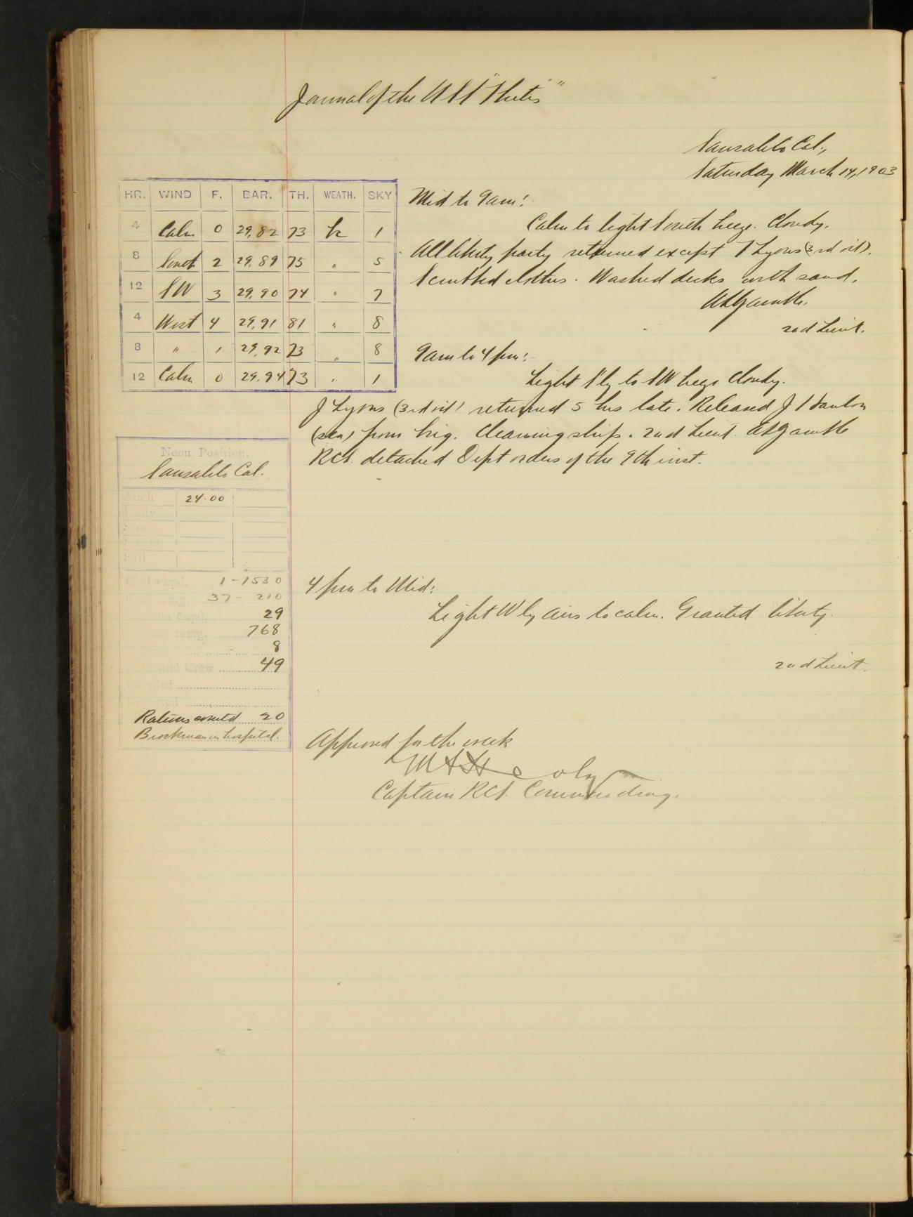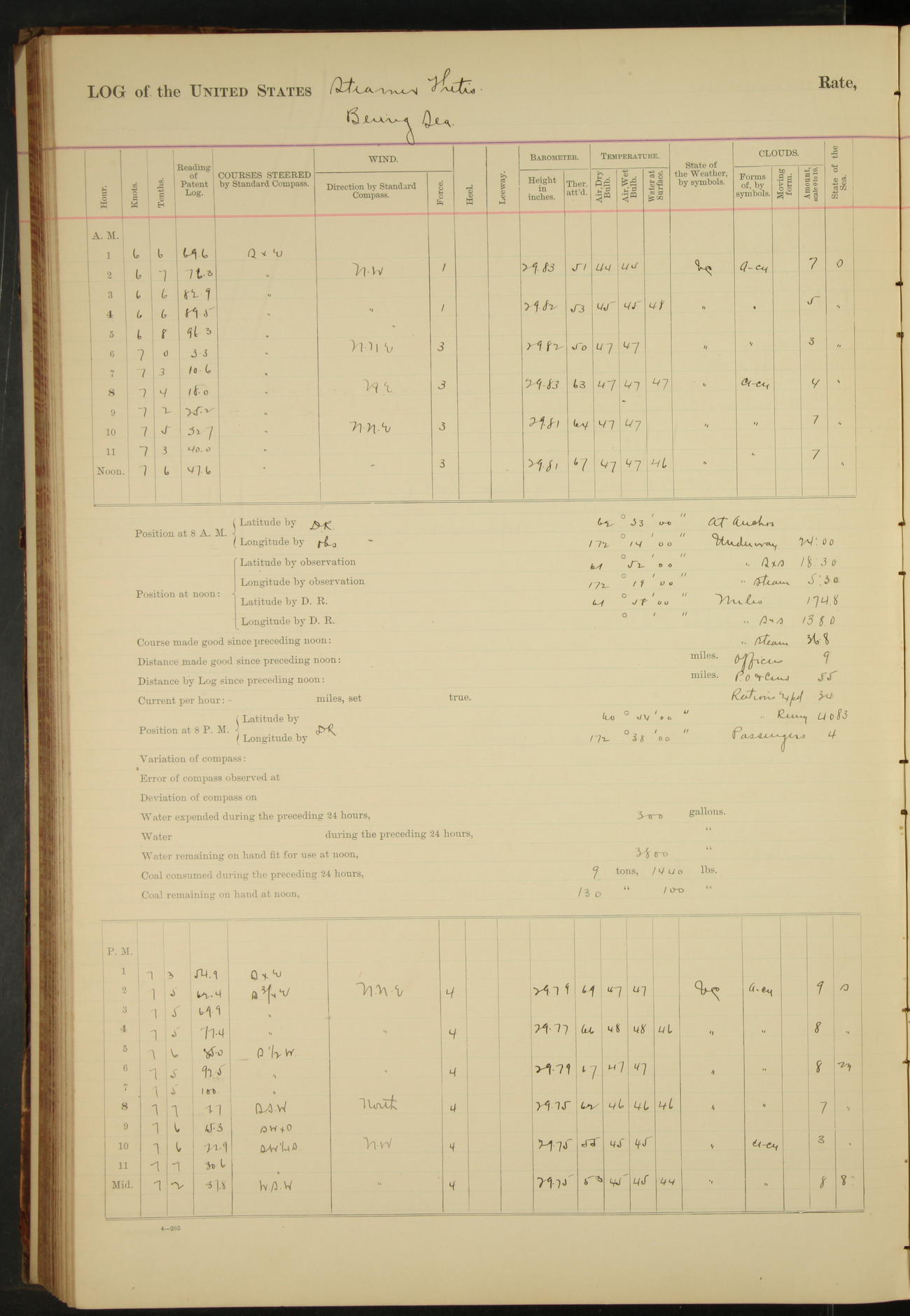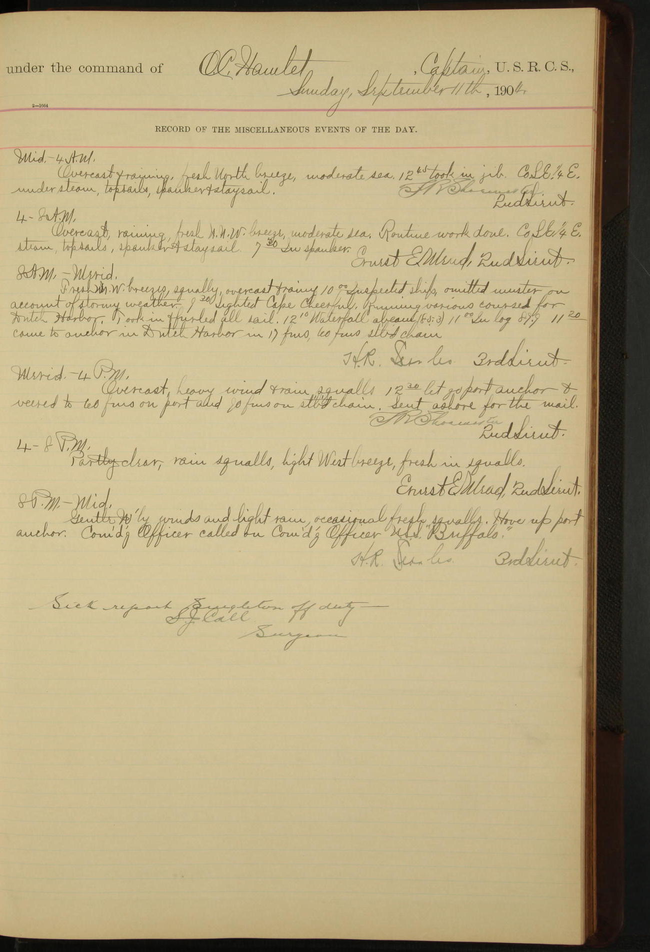 12.00: Barometer continuing to fall and weather showing every indication of growing worse, ordered main boiler filled with salt water and steam raised as rapidly as could be done without injury to boiler. Officers and liberty men detained on shore by heavy wind and rough sea.