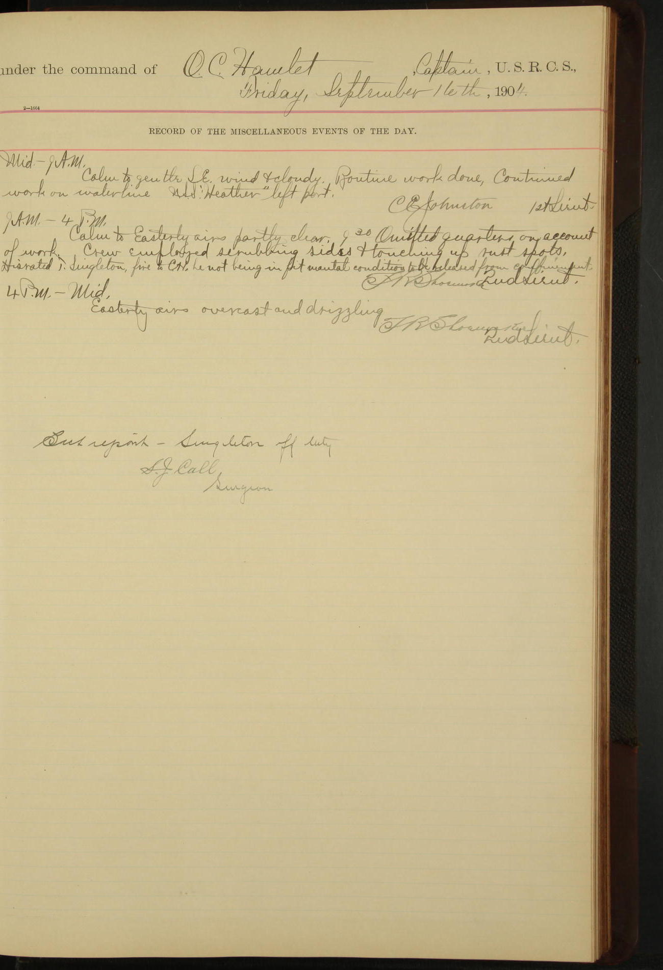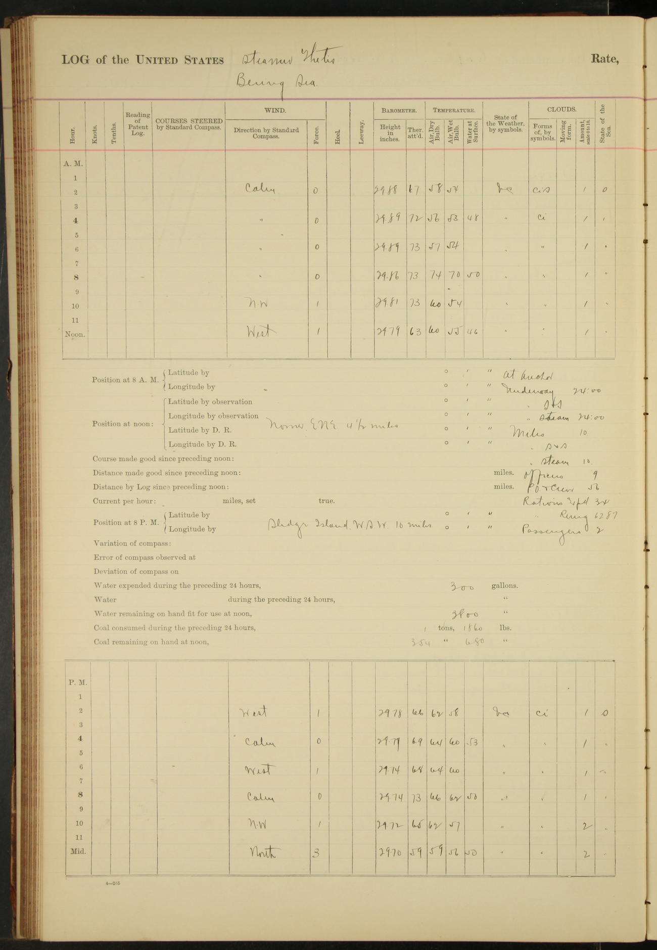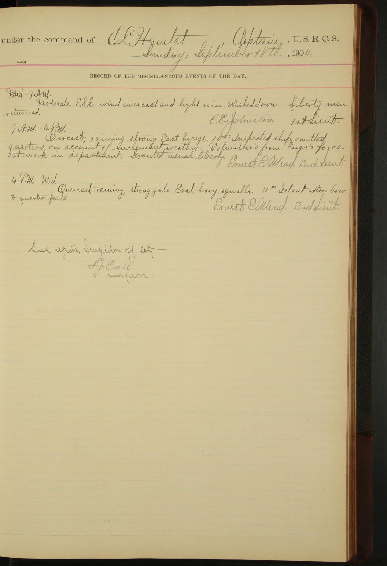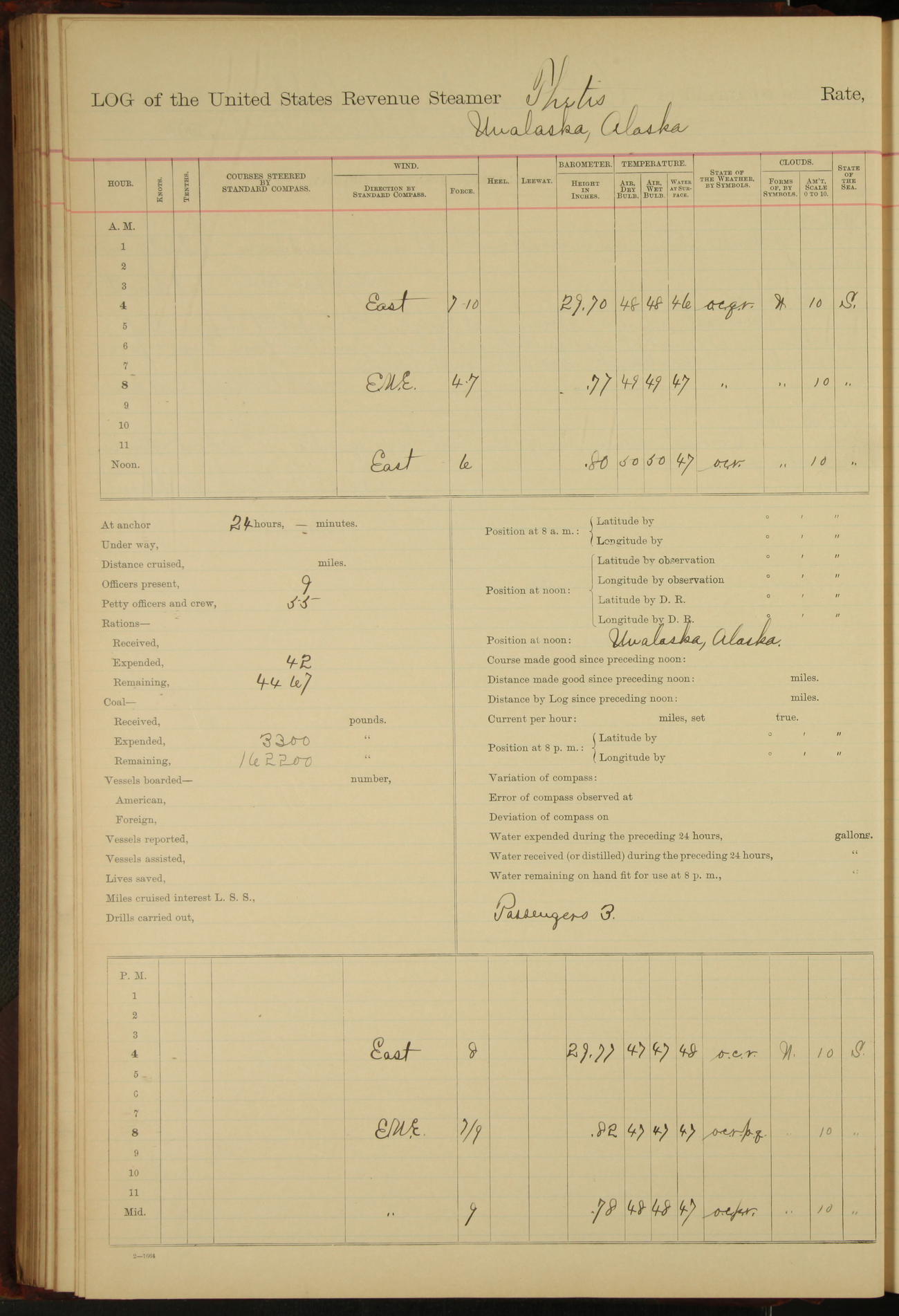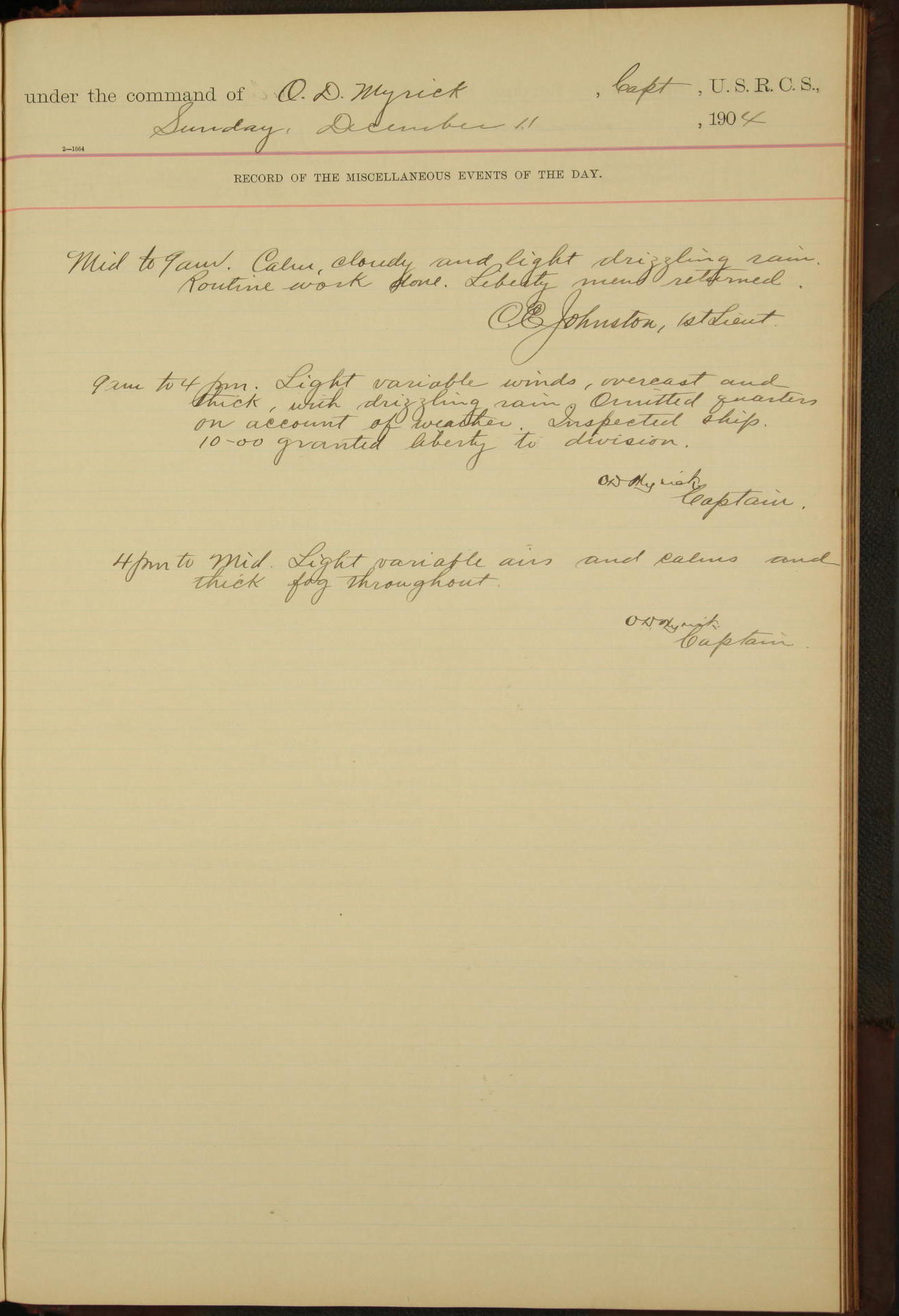 12.00: Barometer continuing to fall and weather showing every indication of growing worse, ordered main boiler filled with salt water and steam raised as rapidly as could be done without injury to boiler. Officers and liberty men detained on shore by heavy wind and rough sea.