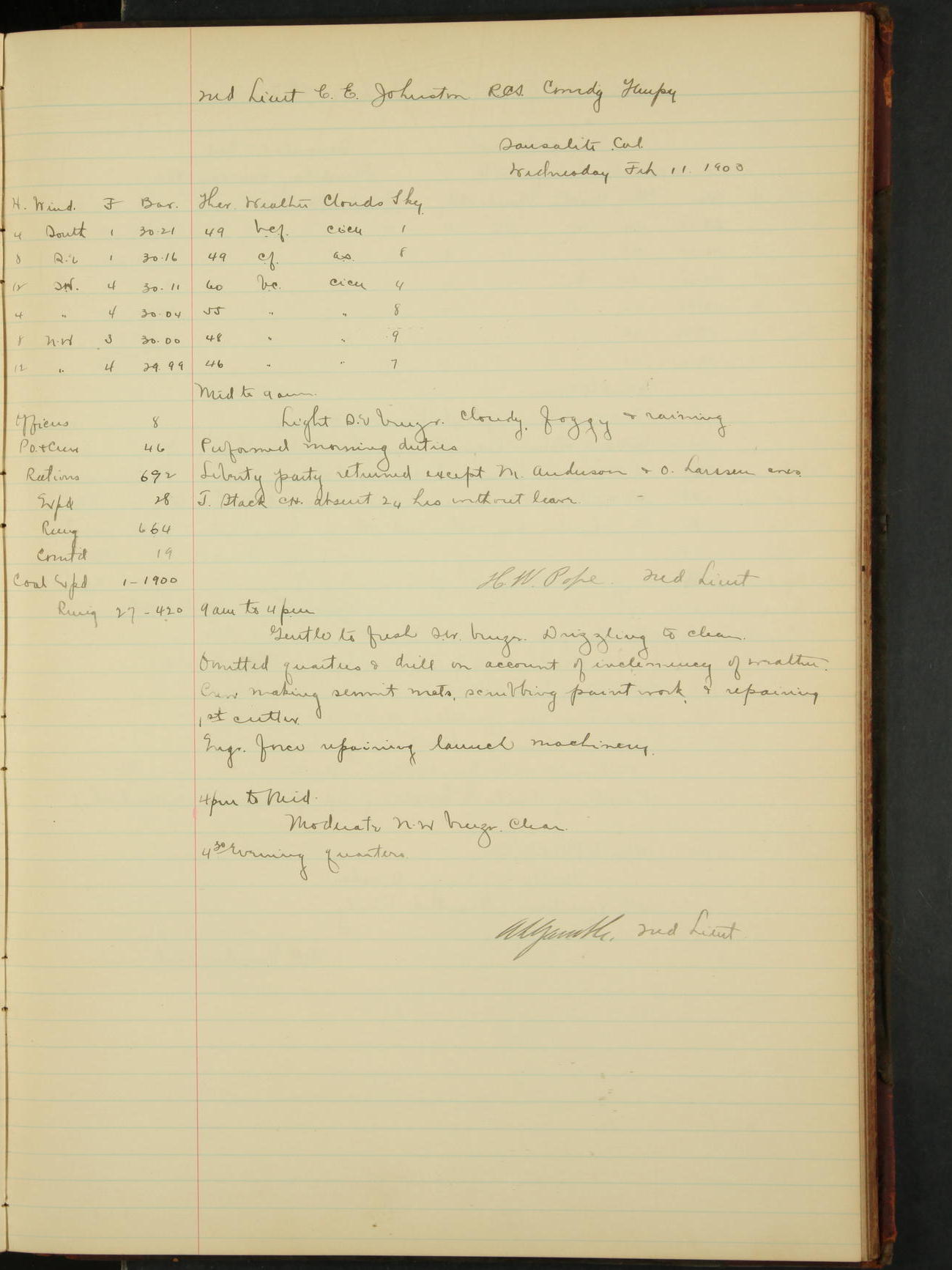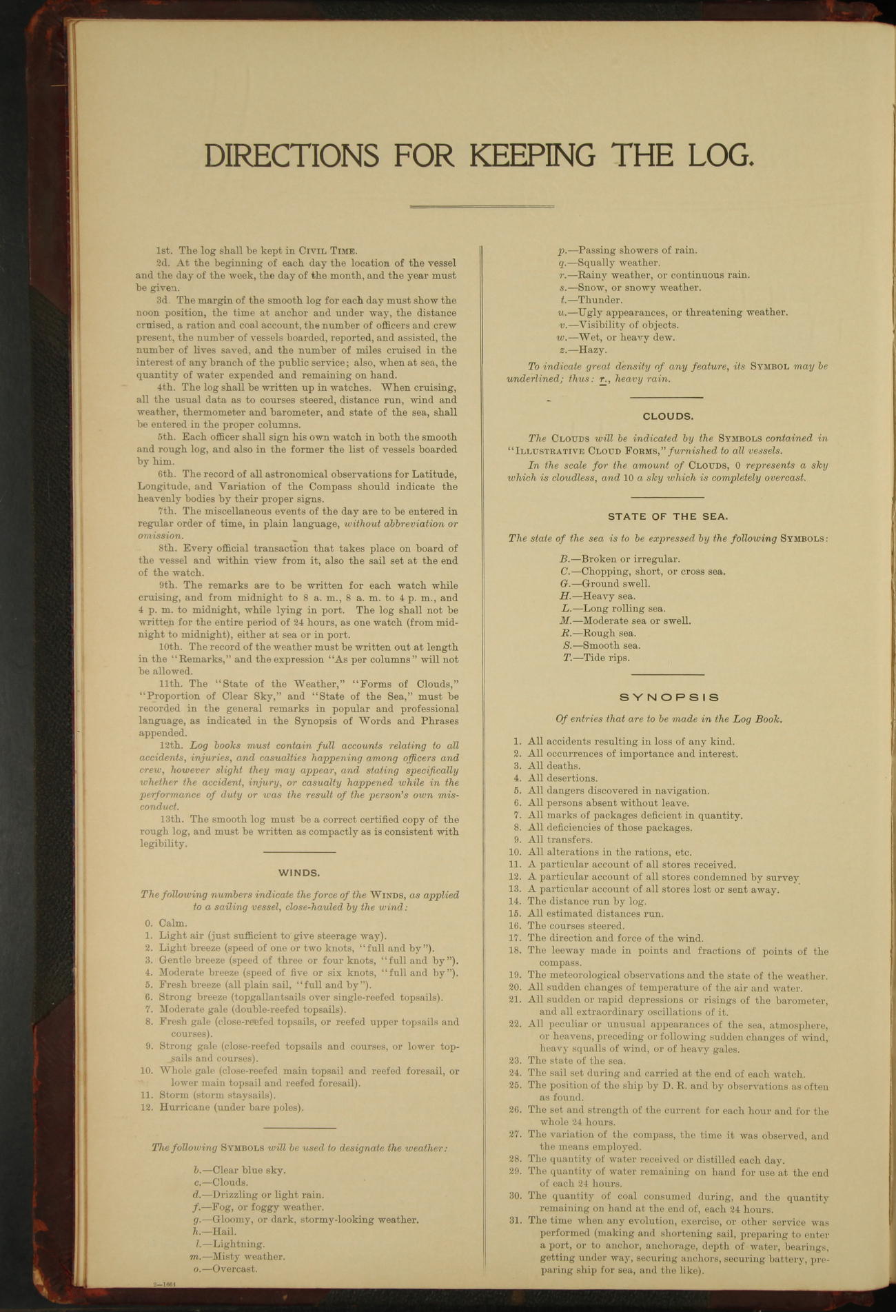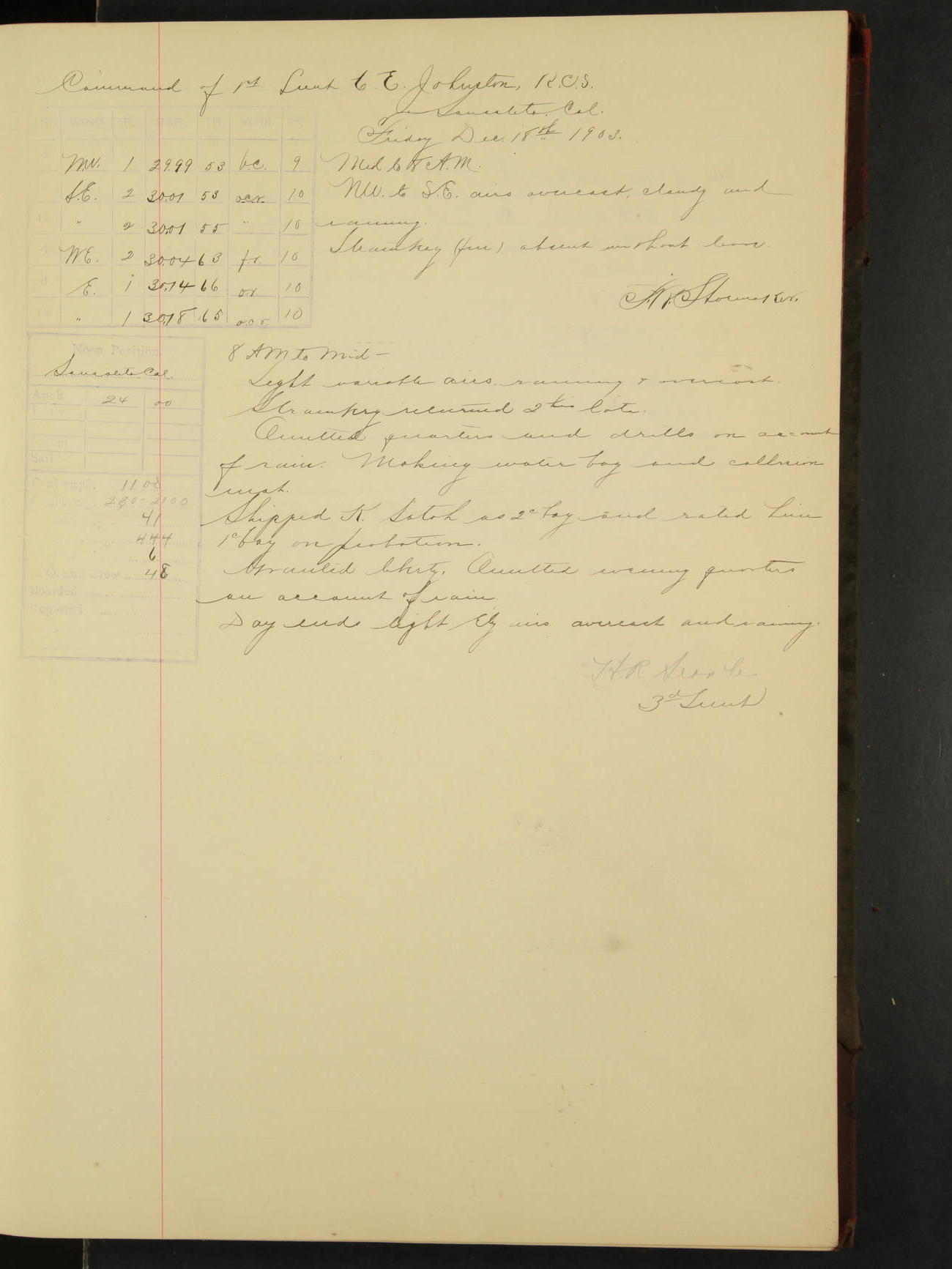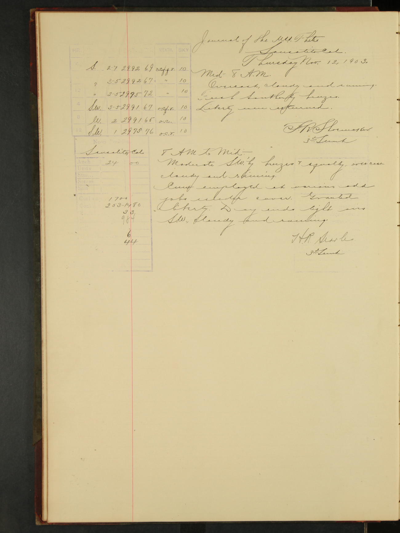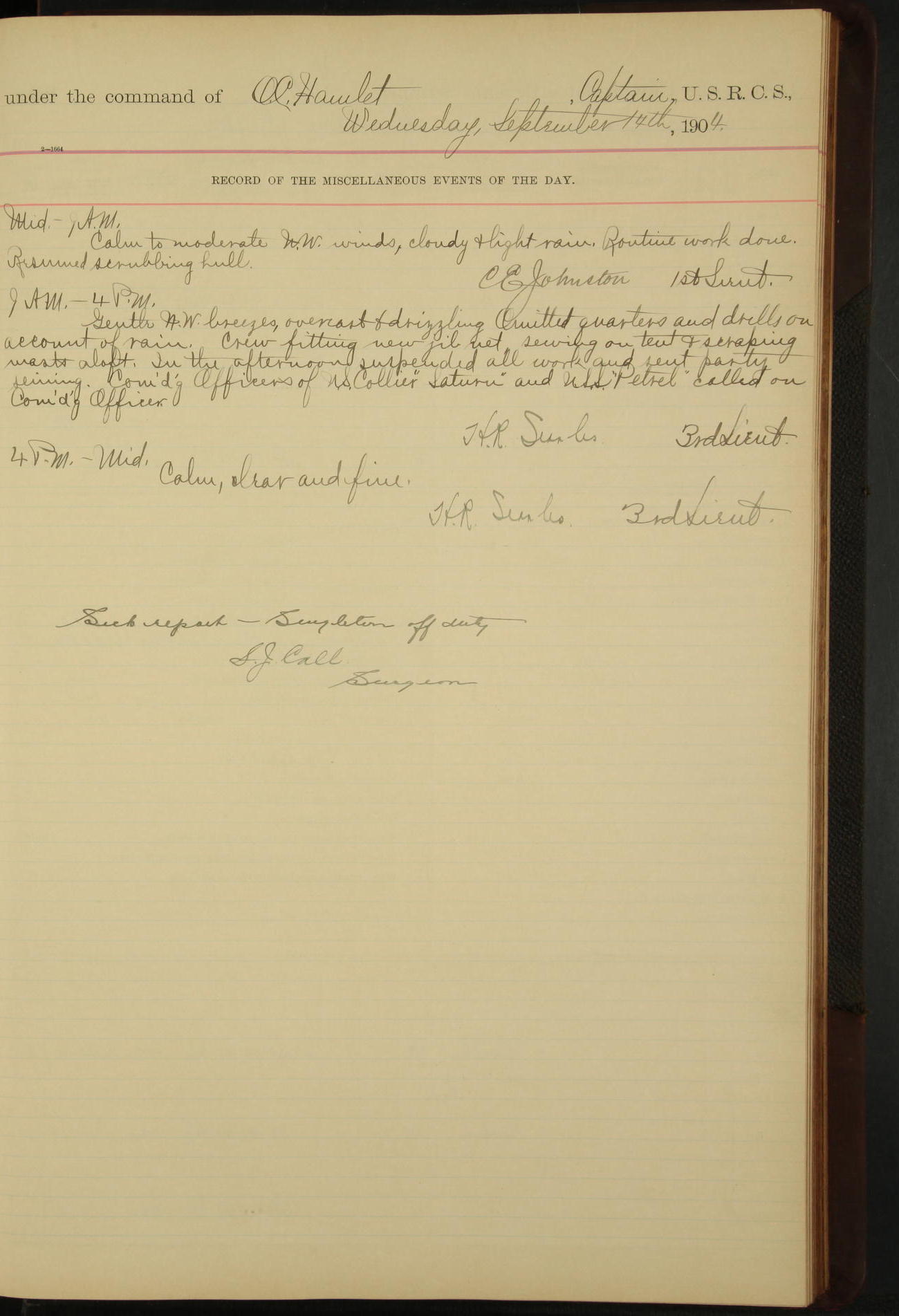 12.00: Barometer continuing to fall and weather showing every indication of growing worse, ordered main boiler filled with salt water and steam raised as rapidly as could be done without injury to boiler. Officers and liberty men detained on shore by heavy wind and rough sea.