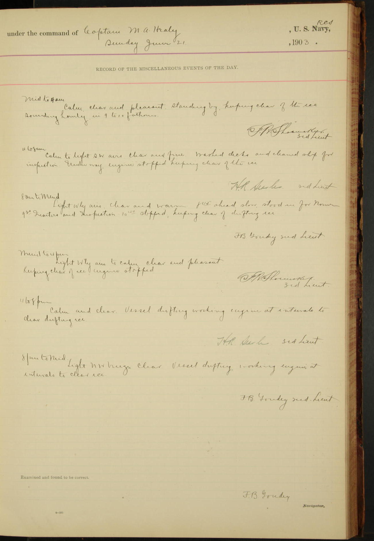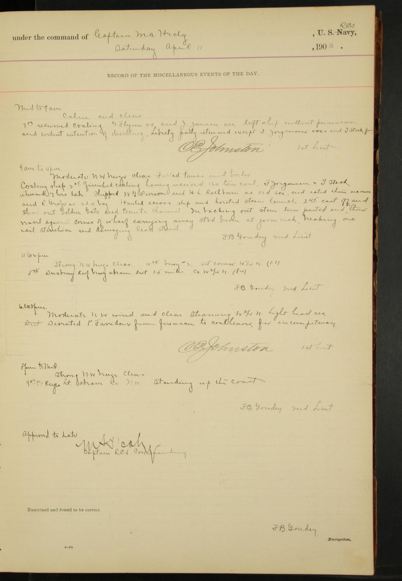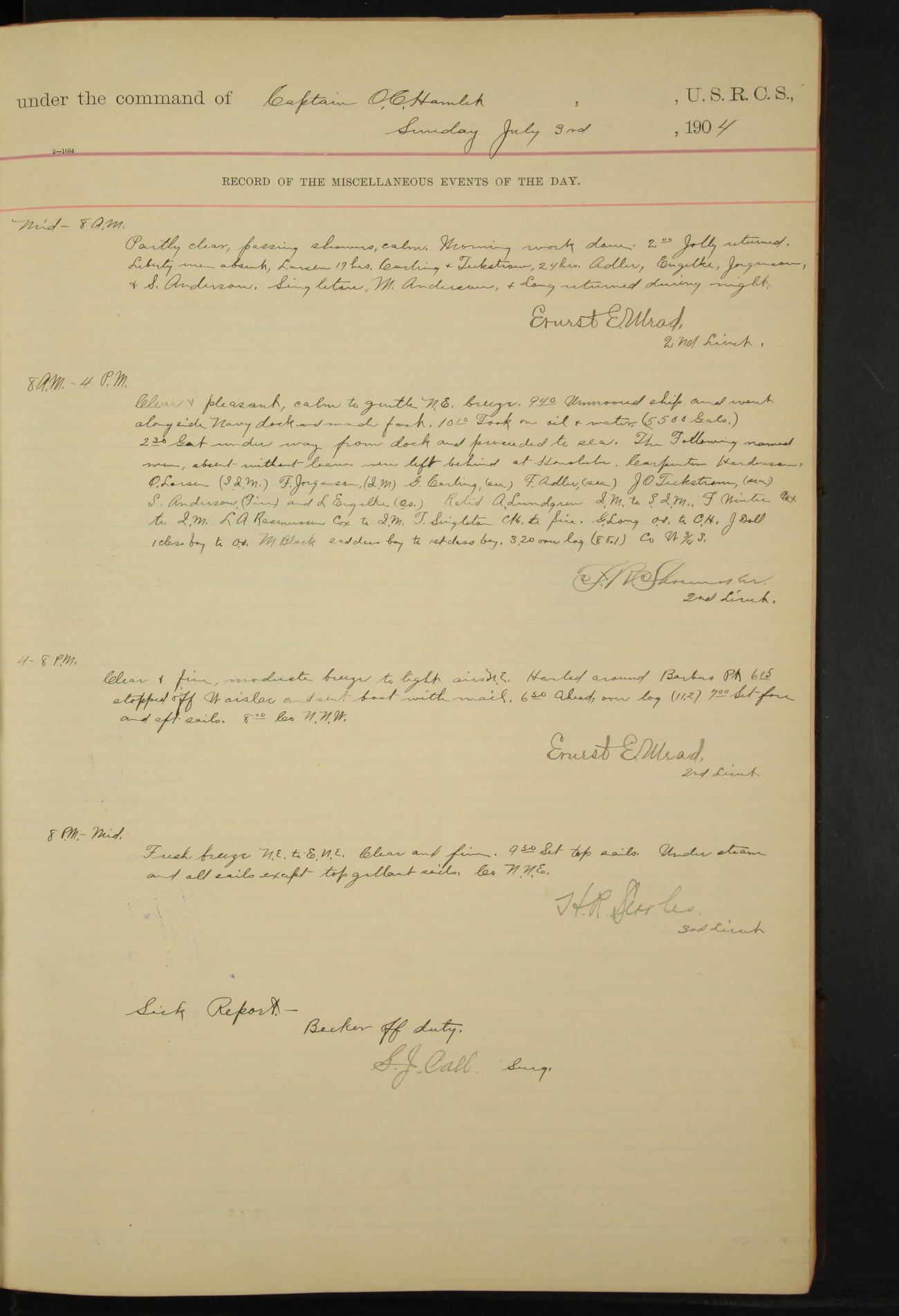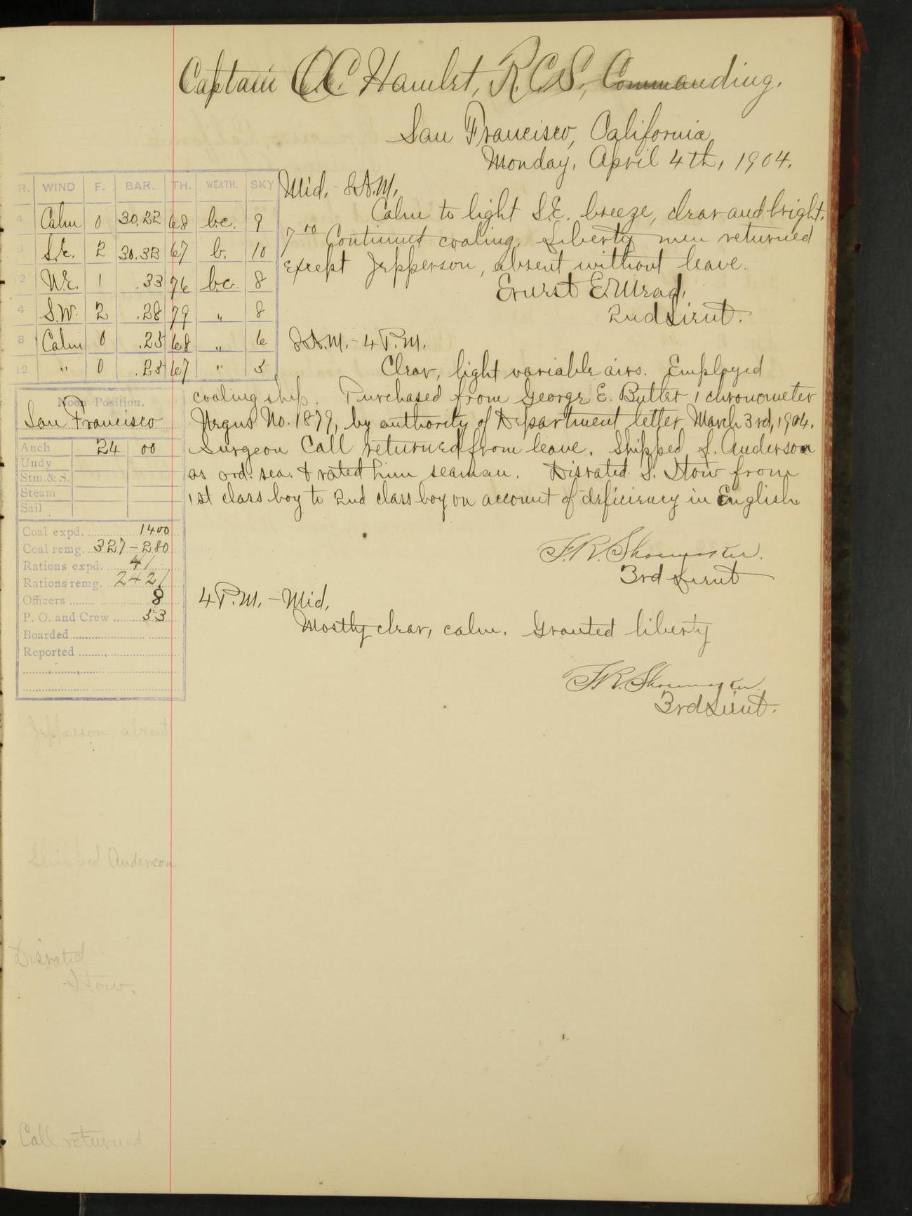 F. Nordland [Nordlund in log] (Seaman), Oscar Larsen (Seaman), and L. Jakobsen (Seaman) absent 24 hours without leave.