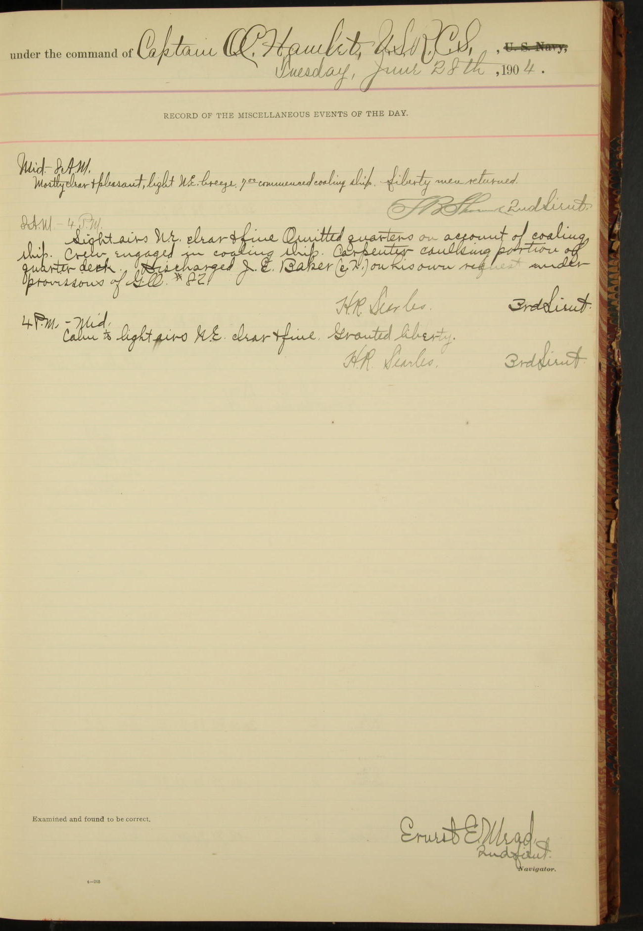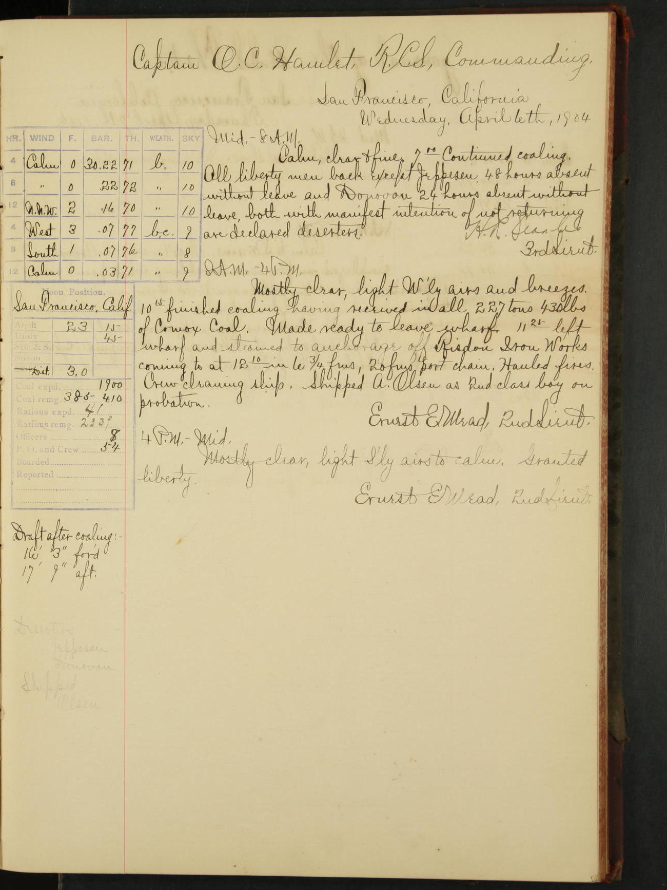 H. Brewster, Coal Heaver, absent 72 hours without leave, declared a deserter.
