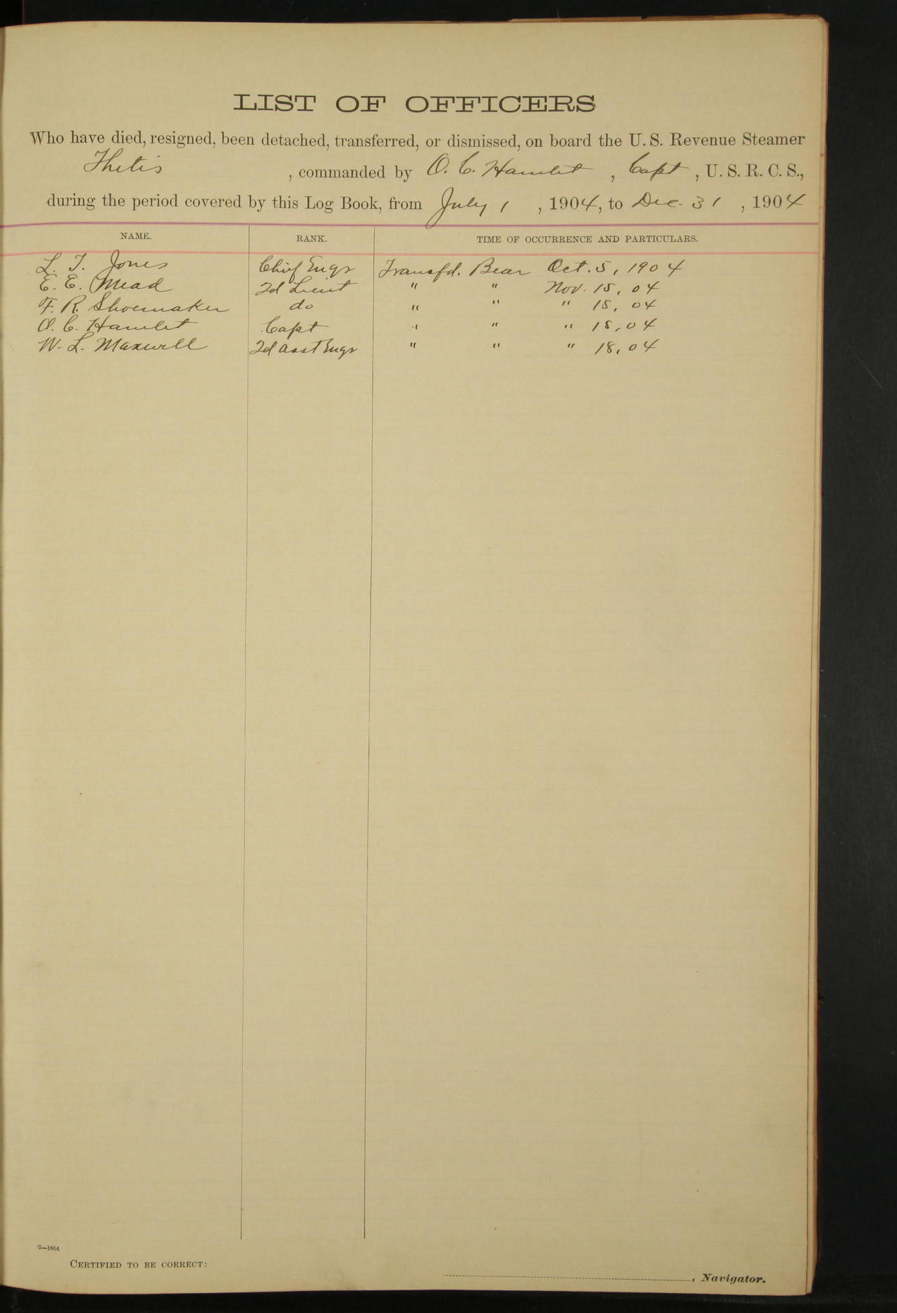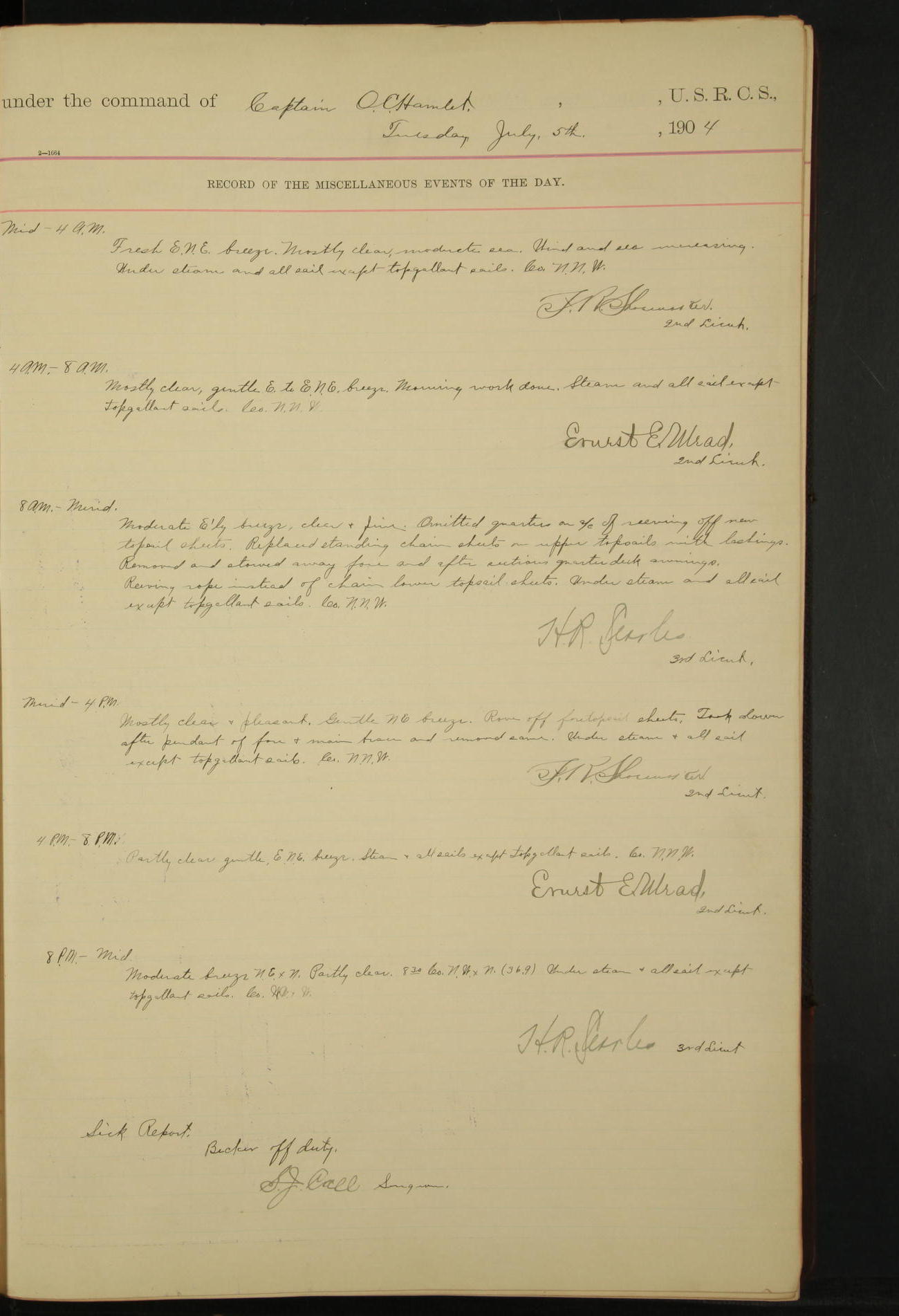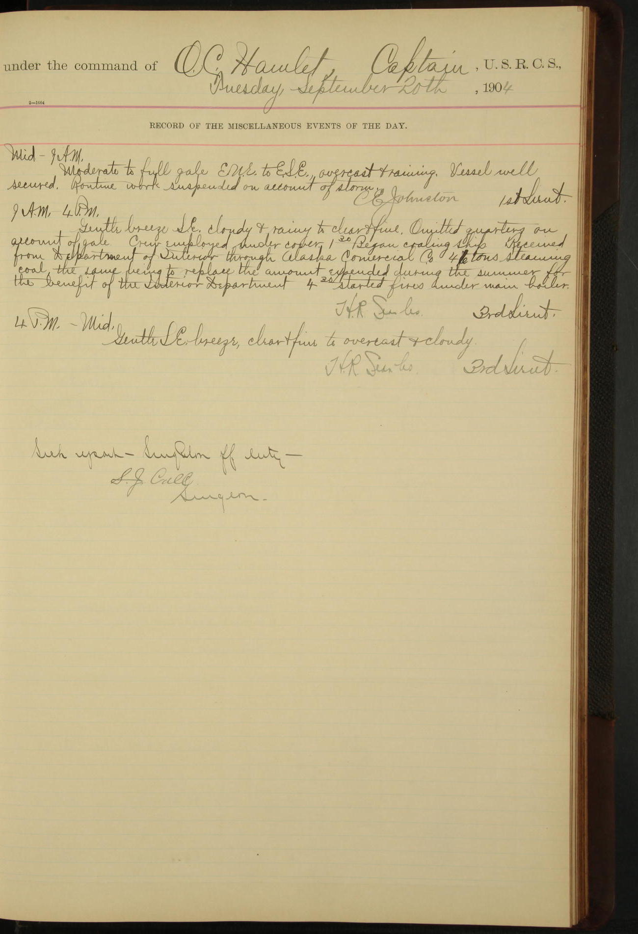 Assistant Engineer E.W. Davis left for temporary duty on USRC "McCulloch" in obedience to telegram of yesterday.