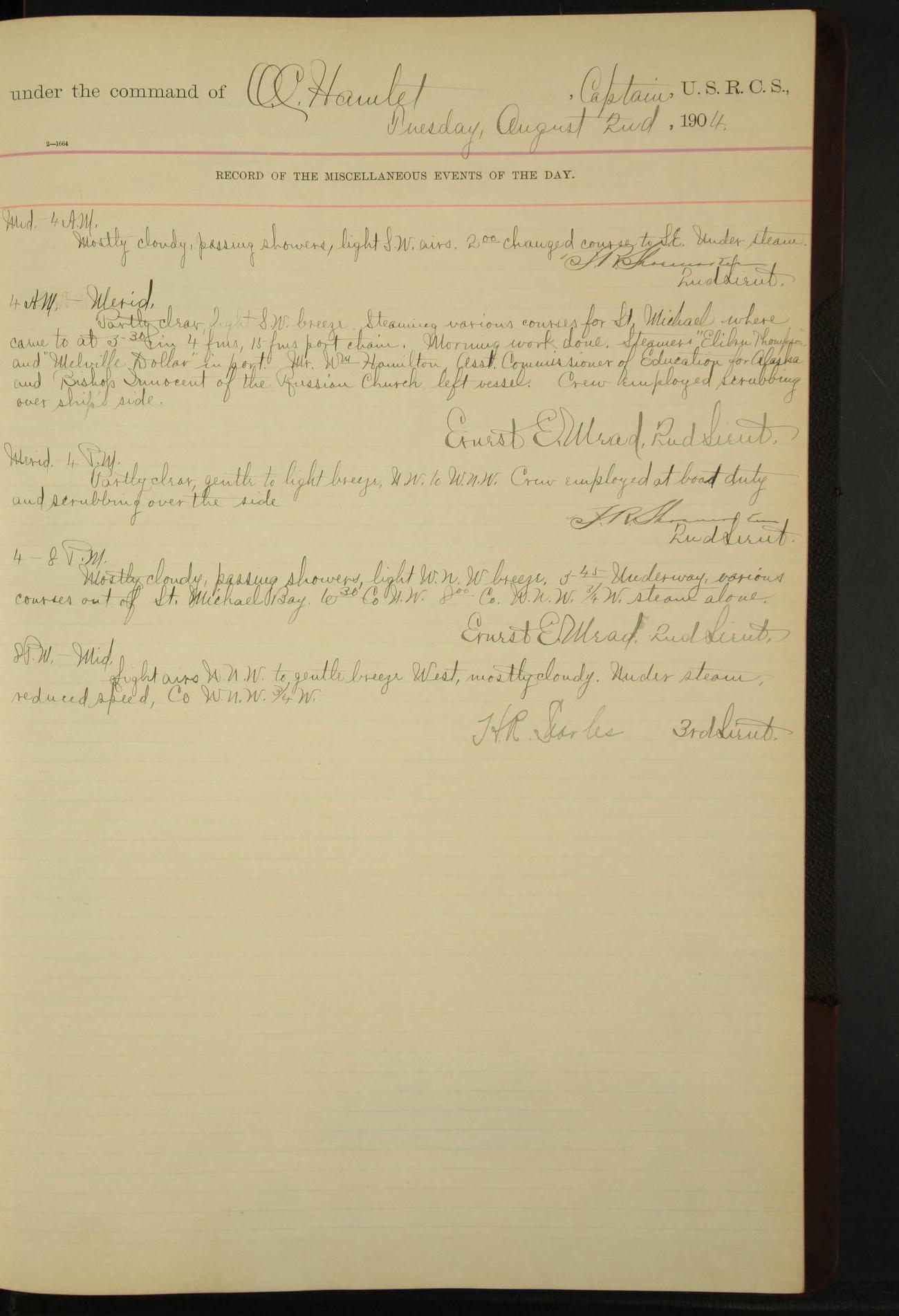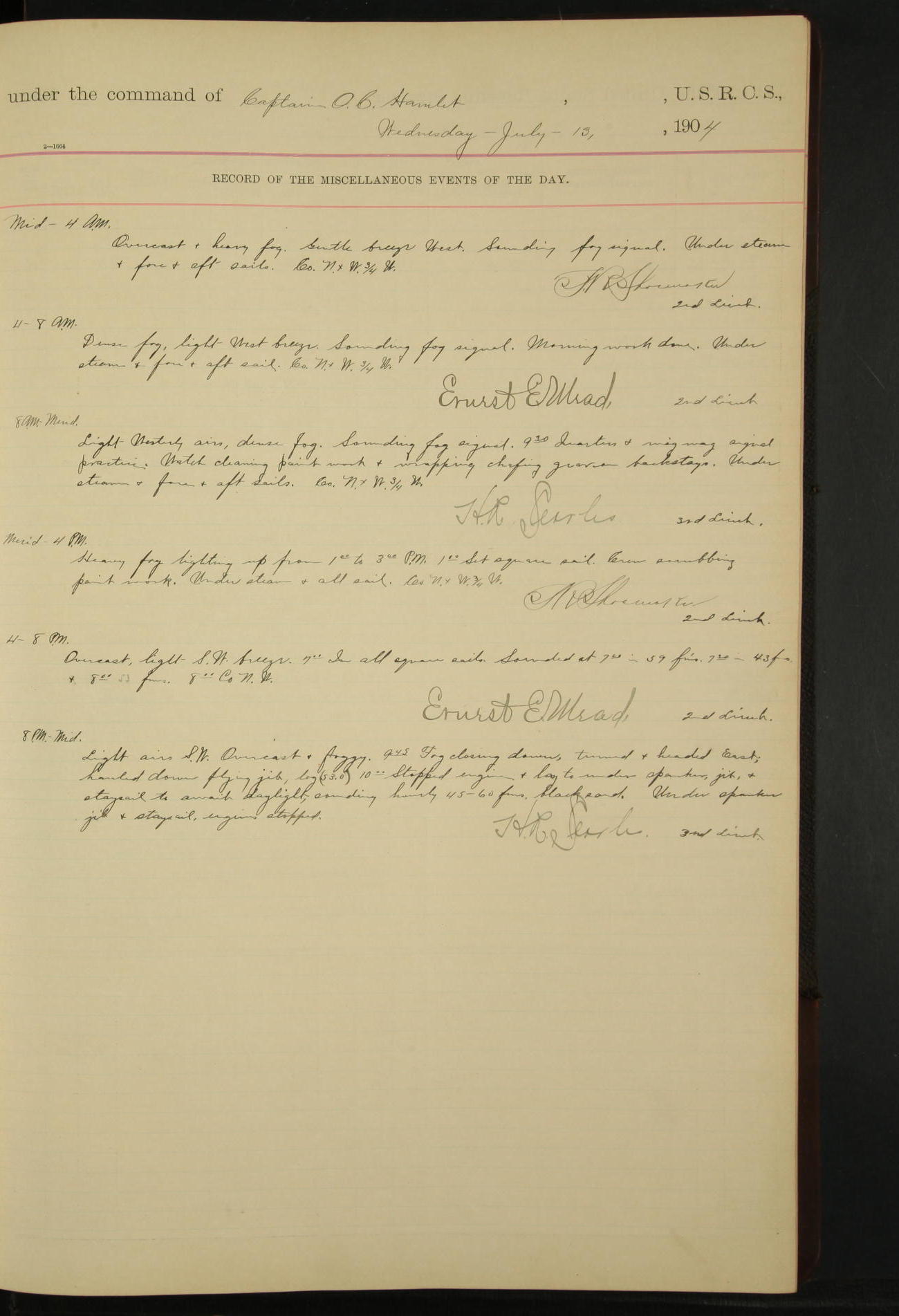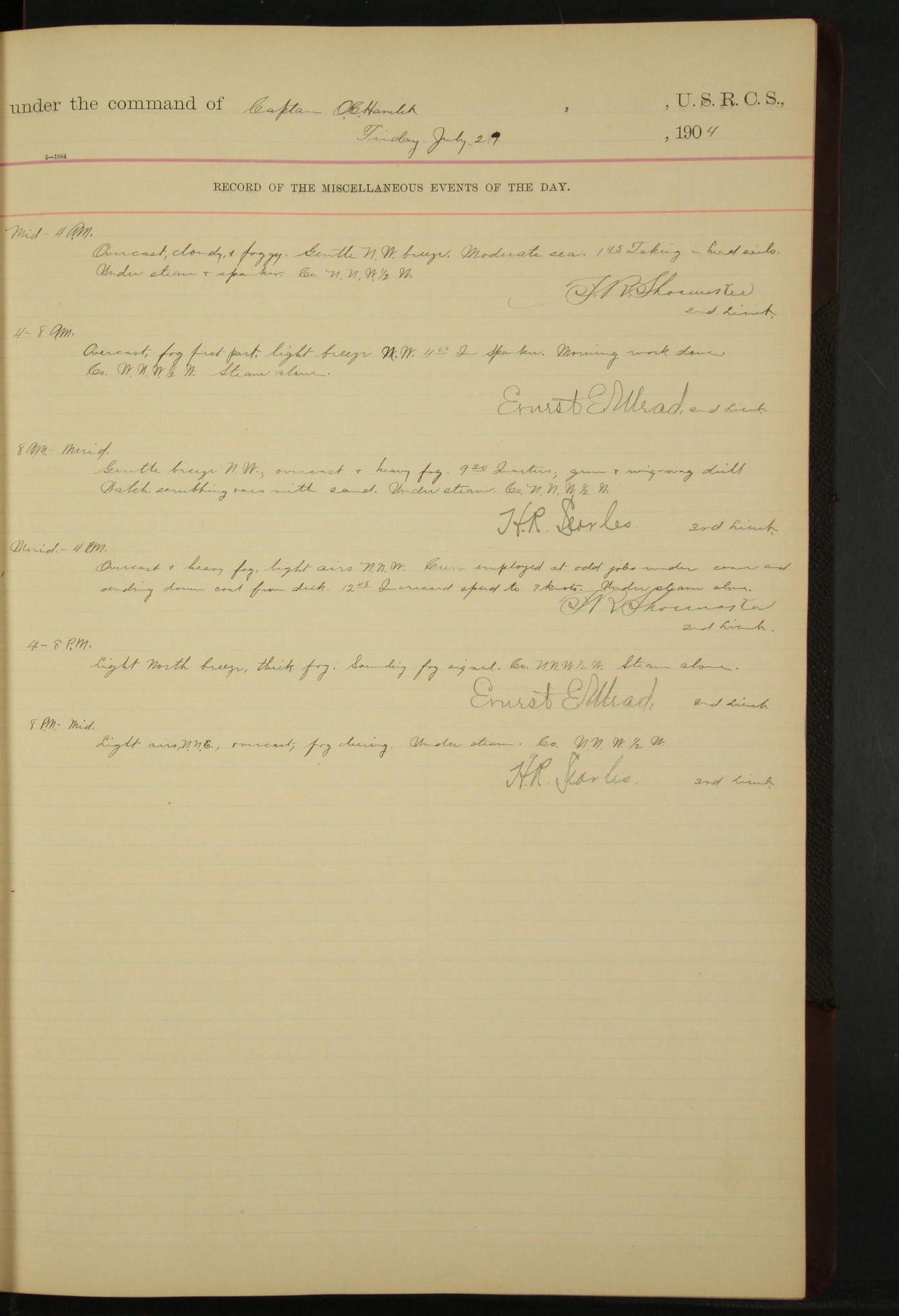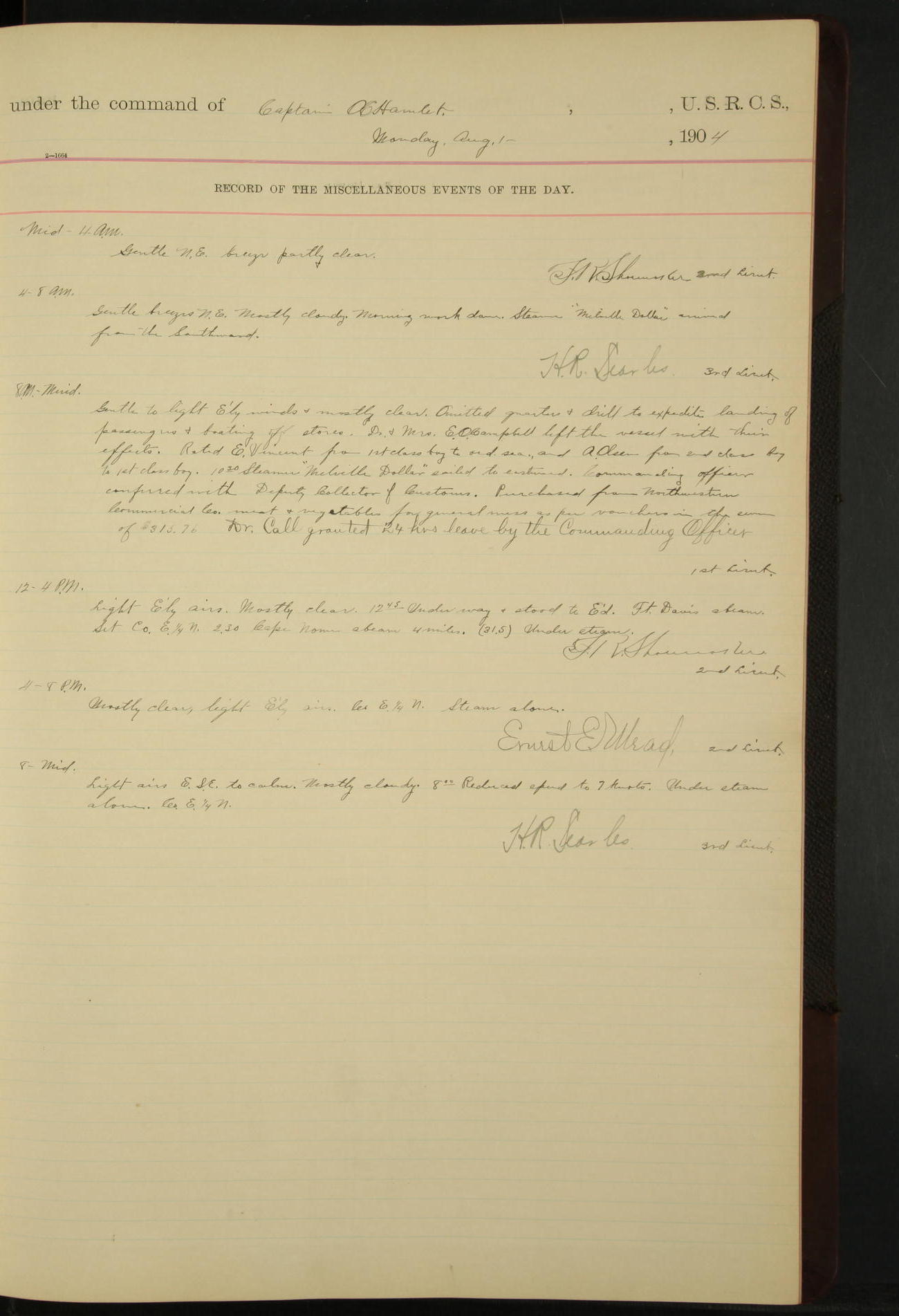 Assistant Engineer E.W. Davis left for temporary duty on USRC "McCulloch" in obedience to telegram of yesterday.