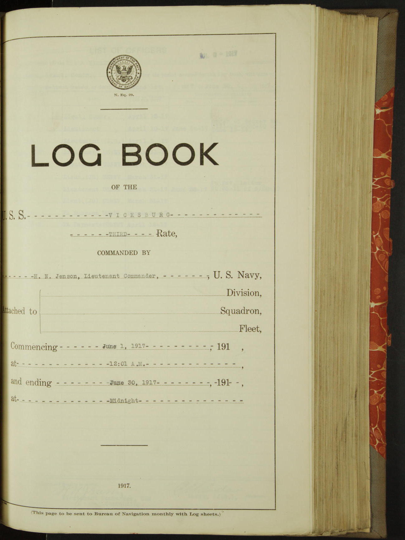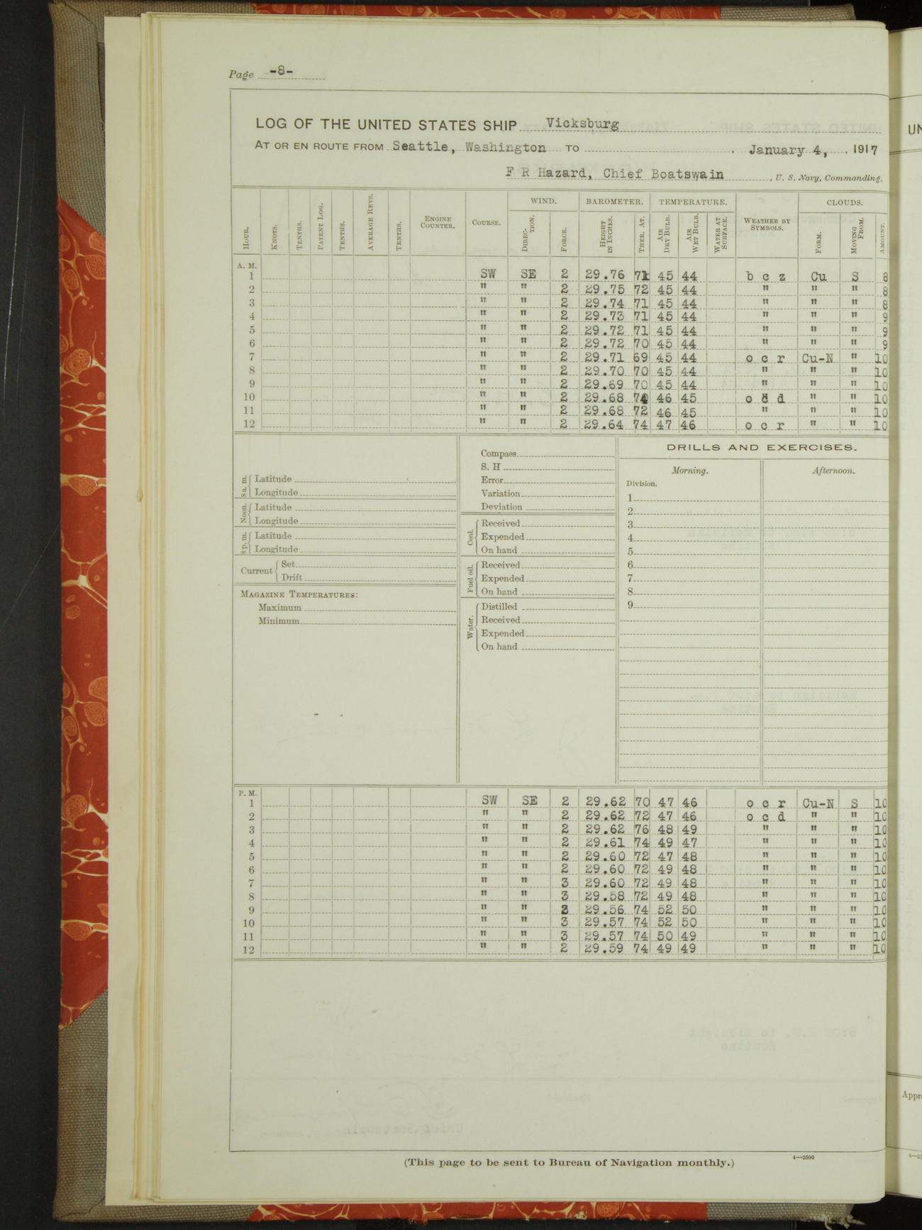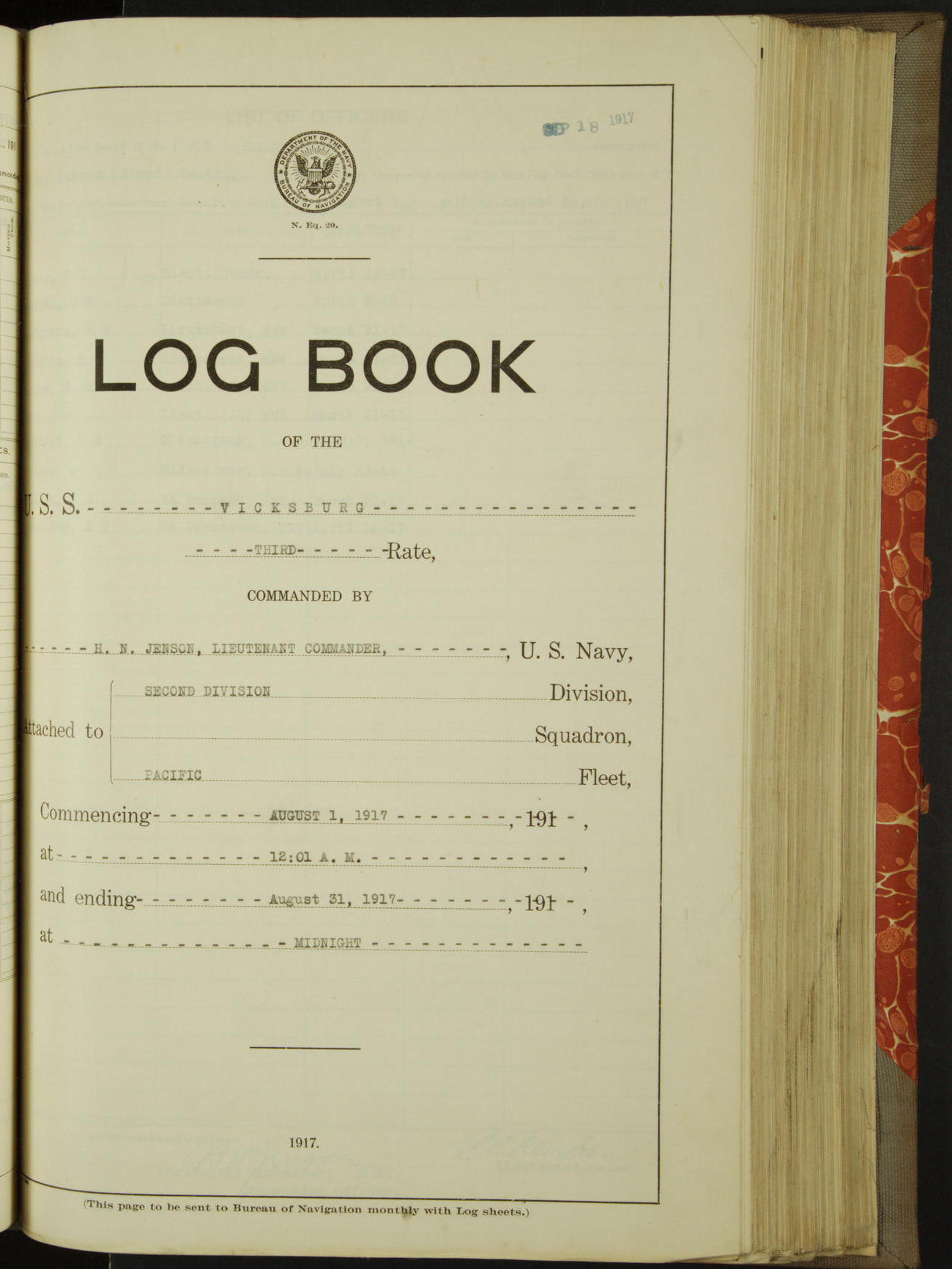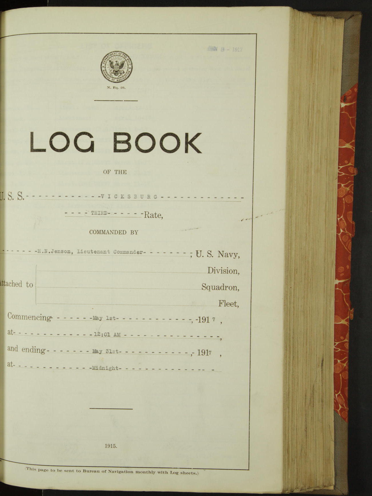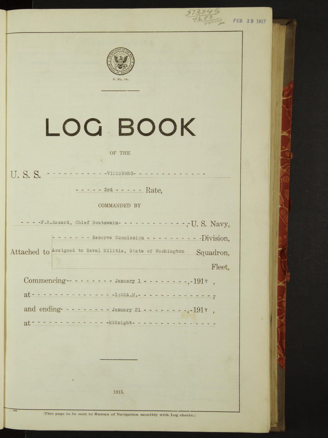 Log book of the USS "Vicksburg", 3rd rate, commanded by F R Hazard, Chief Boatswain, US Navy, attahced to reserve commission division, assigned to Naval Militia, State of Washington Squadron, Commencing January 1st, 1917, at 1.0am, and ending January 31st, 1917, at Midnight