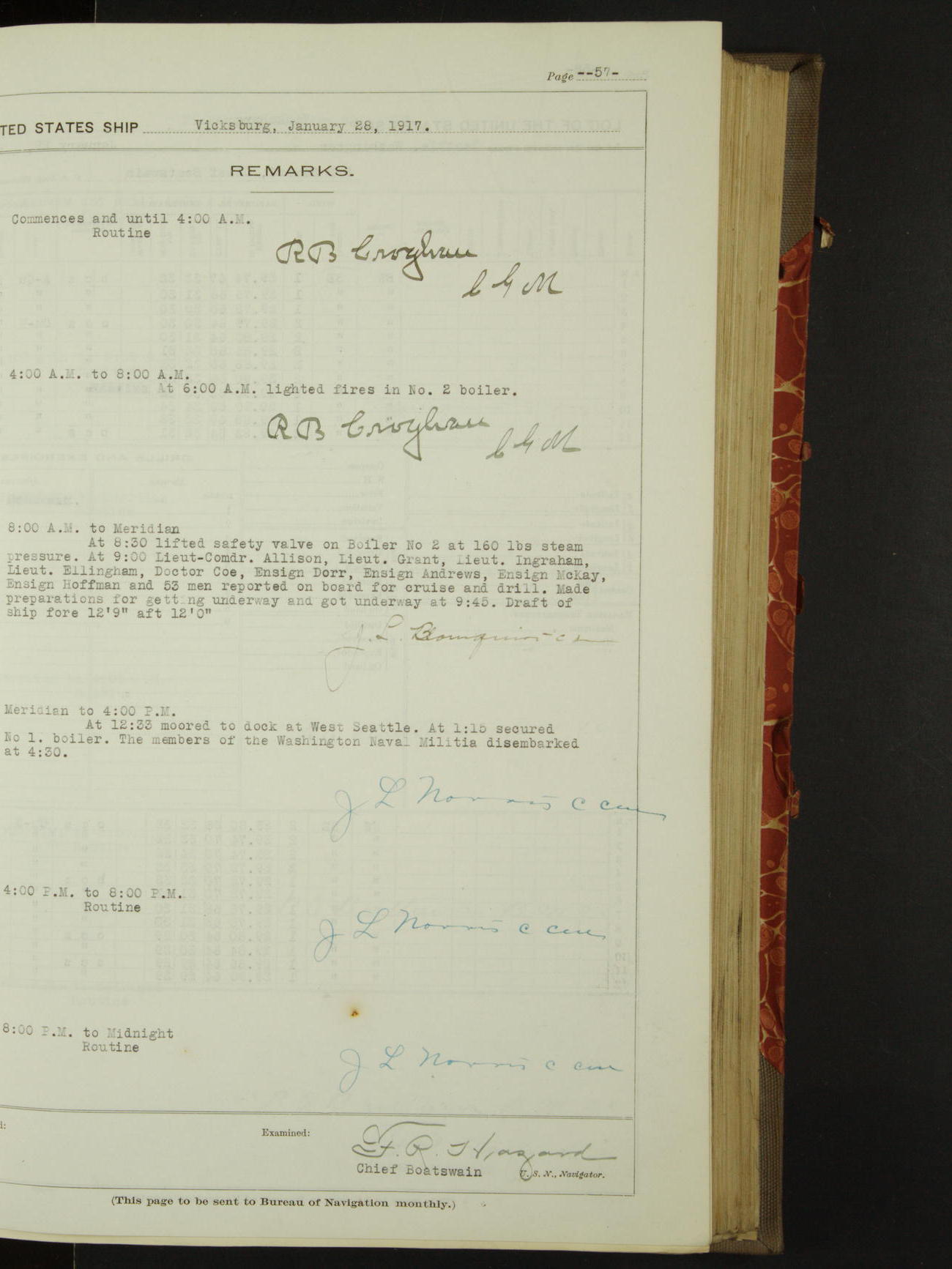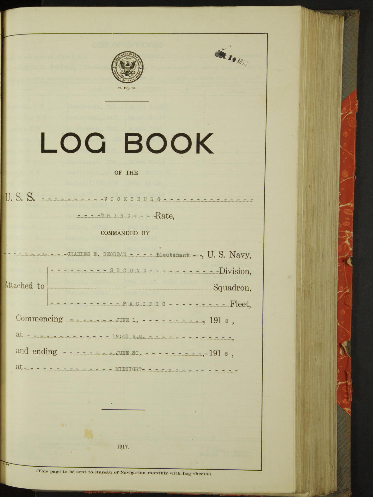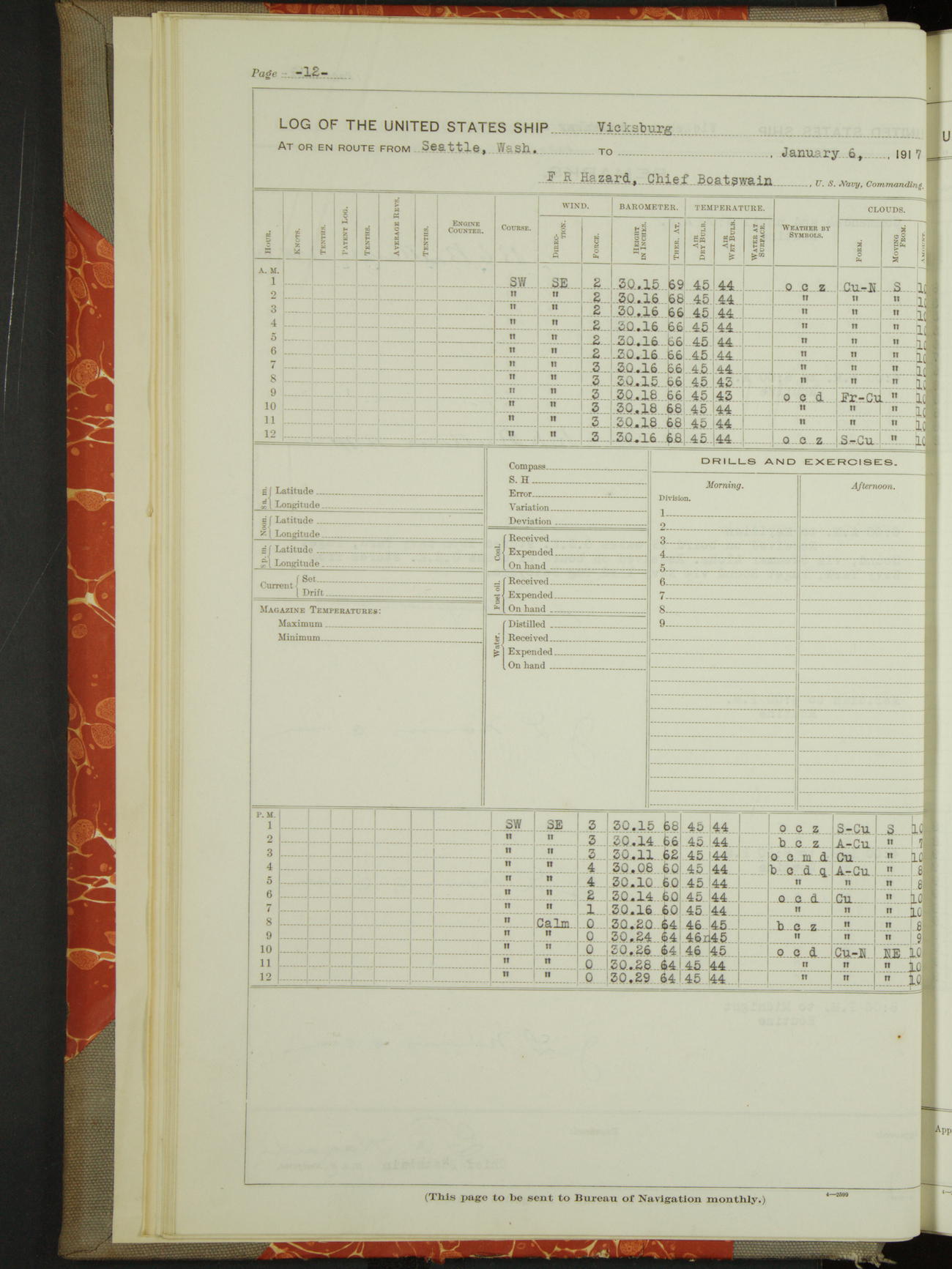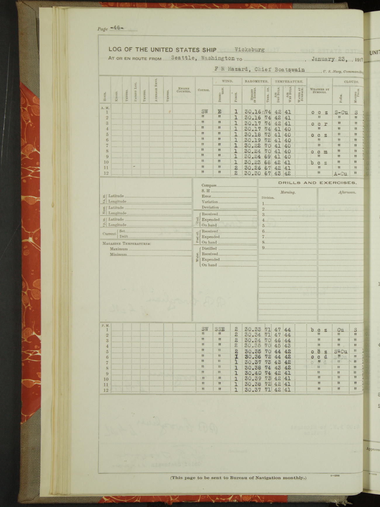 Log book of the USS "Vicksburg", 3rd rate, commanded by F R Hazard, Chief Boatswain, US Navy, attahced to reserve commission division, assigned to Naval Militia, State of Washington Squadron, Commencing January 1st, 1917, at 1.0am, and ending January 31st, 1917, at Midnight