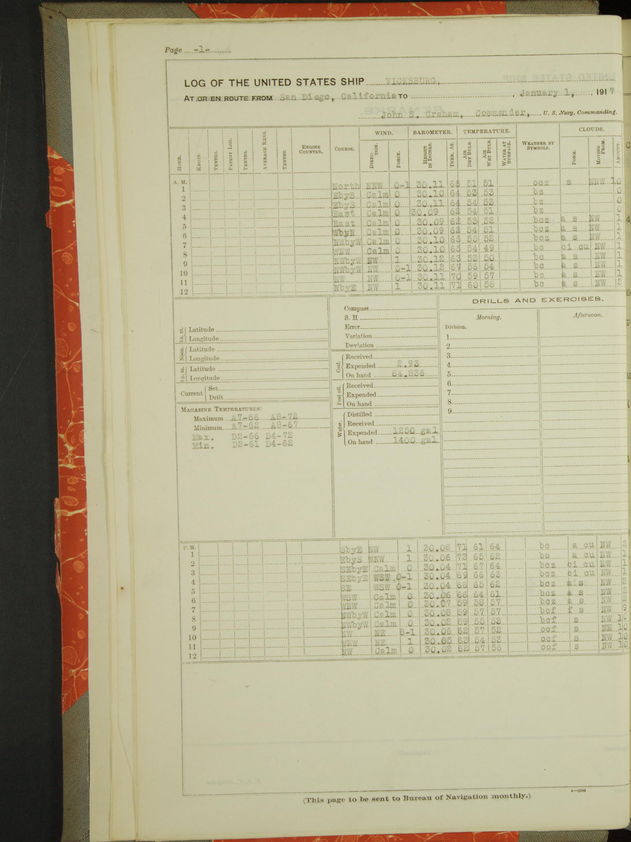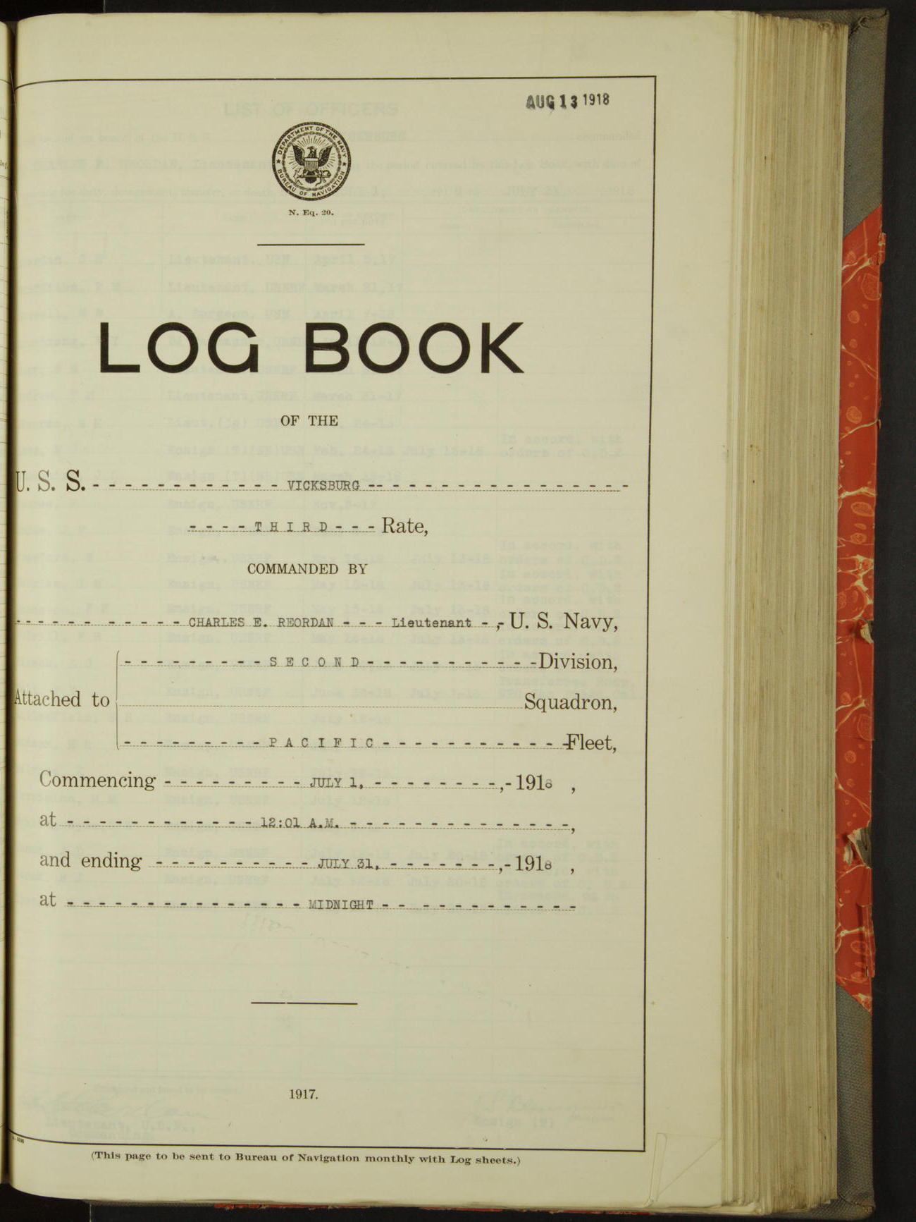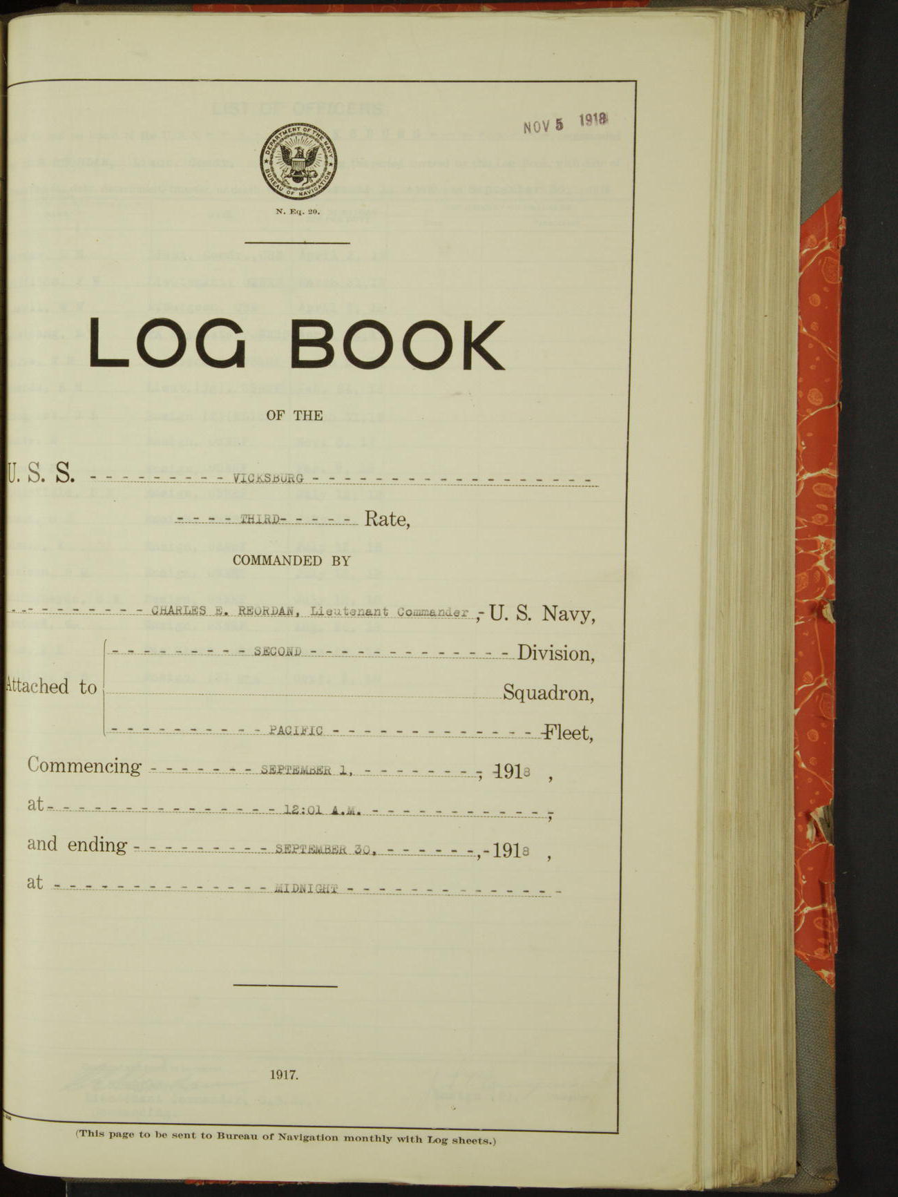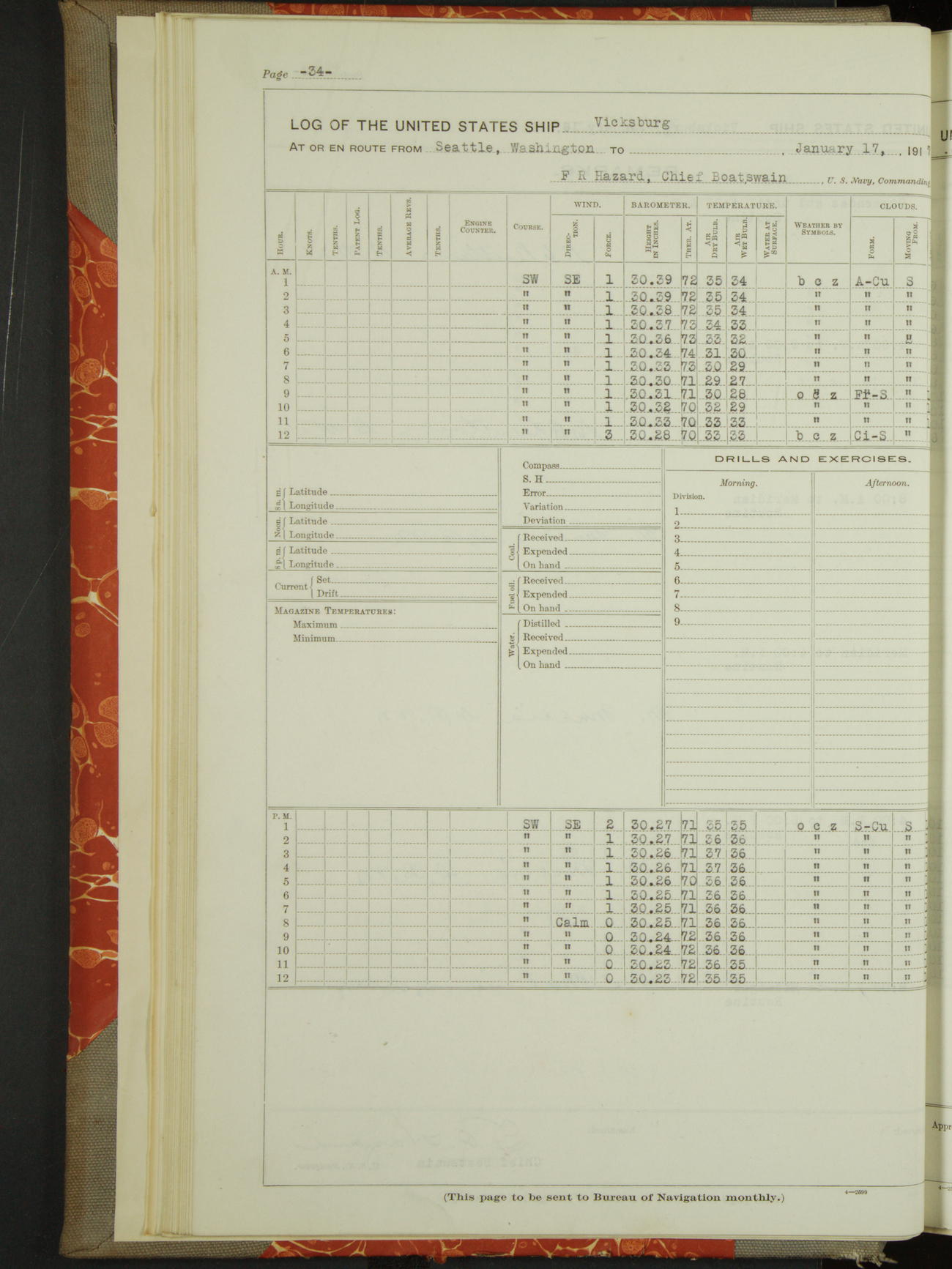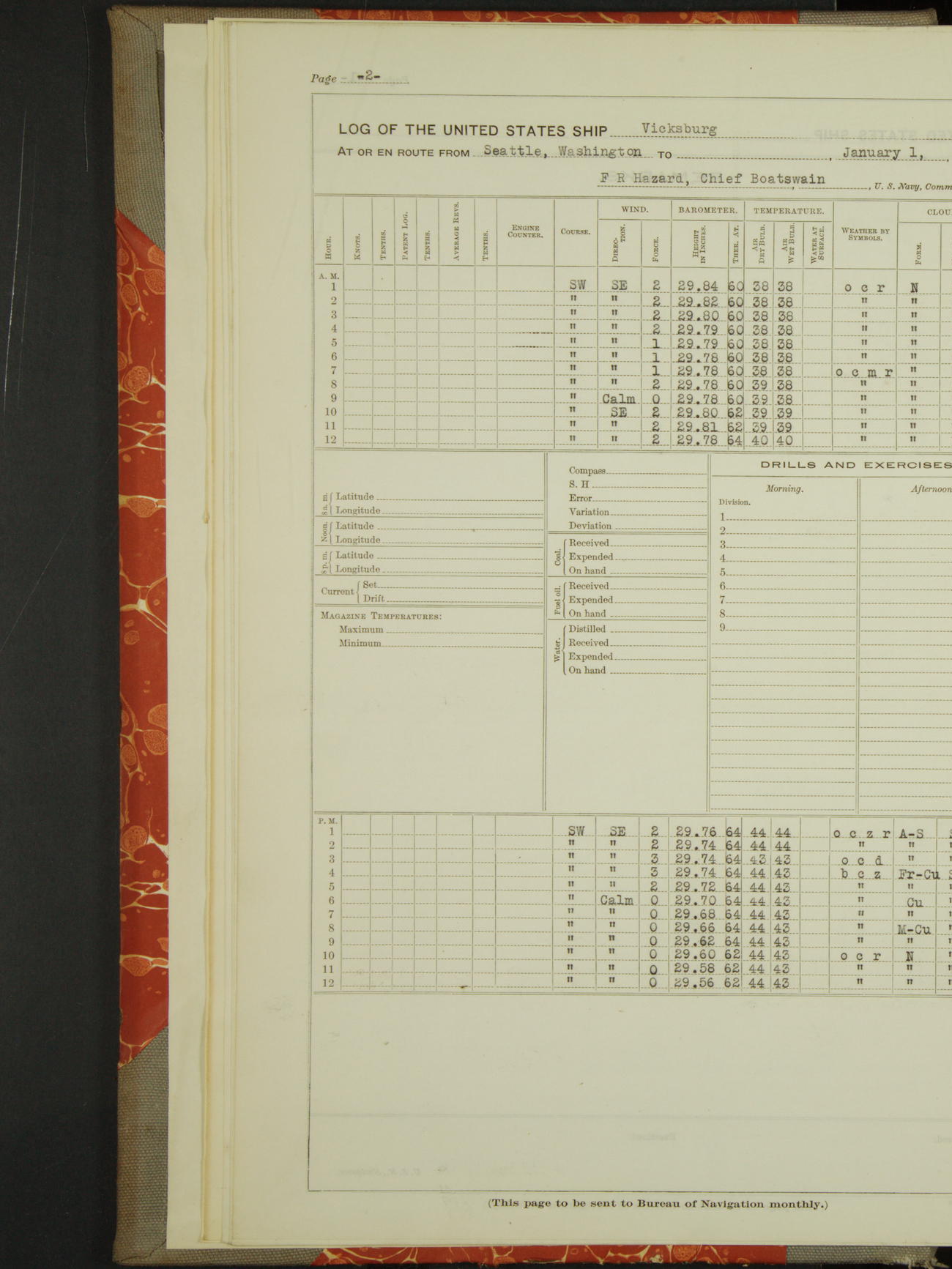 Log book of the USS "Vicksburg", 3rd rate, commanded by F R Hazard, Chief Boatswain, US Navy, attahced to reserve commission division, assigned to Naval Militia, State of Washington Squadron, Commencing January 1st, 1917, at 1.0am, and ending January 31st, 1917, at Midnight