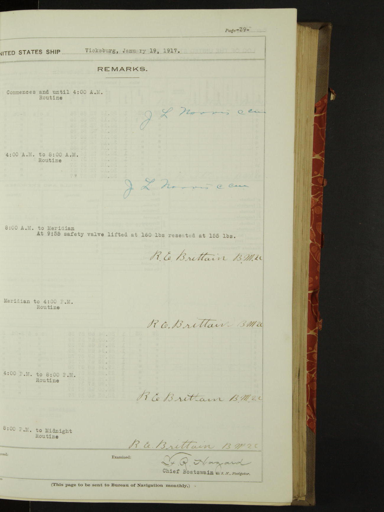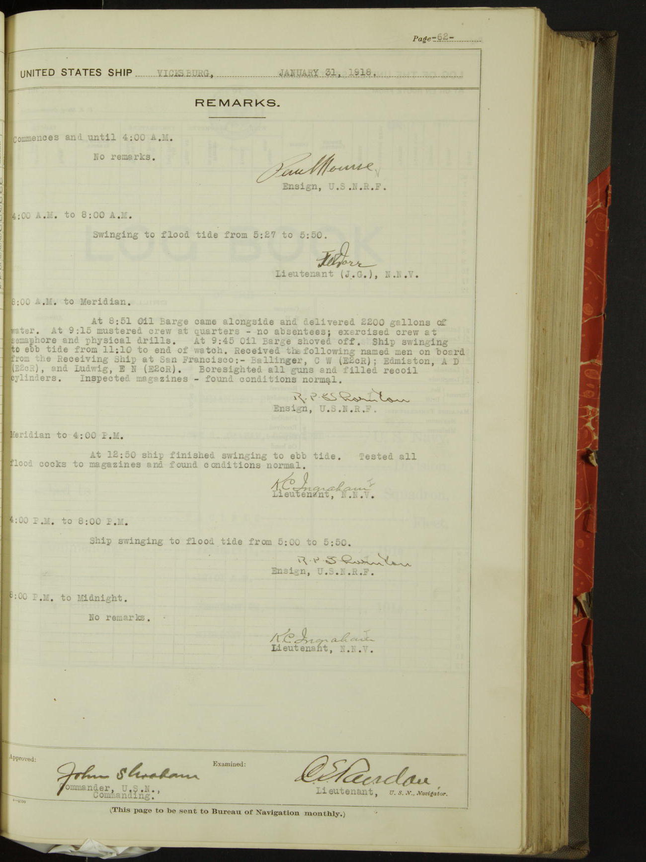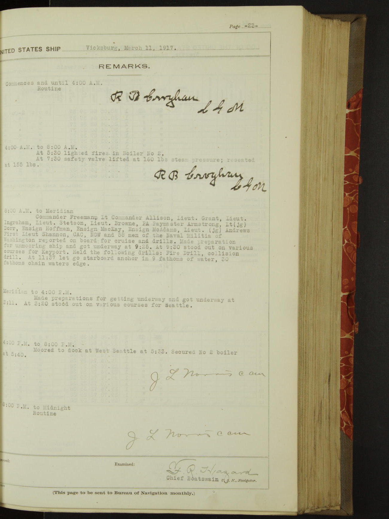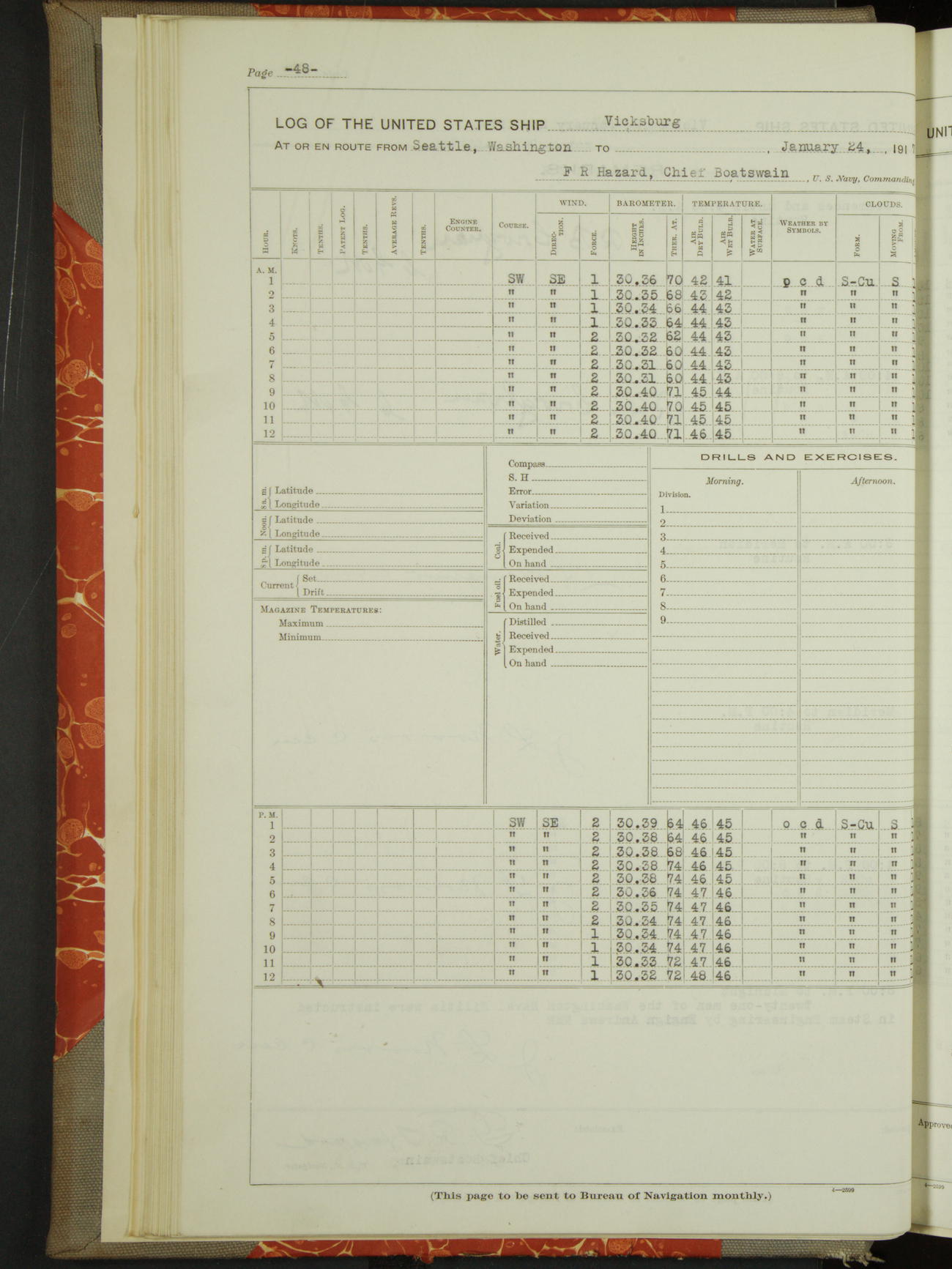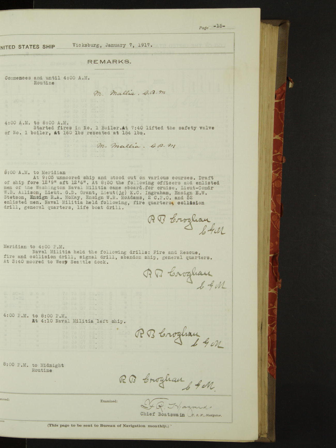 Log book of the USS "Vicksburg", 3rd rate, commanded by F R Hazard, Chief Boatswain, US Navy, attahced to reserve commission division, assigned to Naval Militia, State of Washington Squadron, Commencing January 1st, 1917, at 1.0am, and ending January 31st, 1917, at Midnight