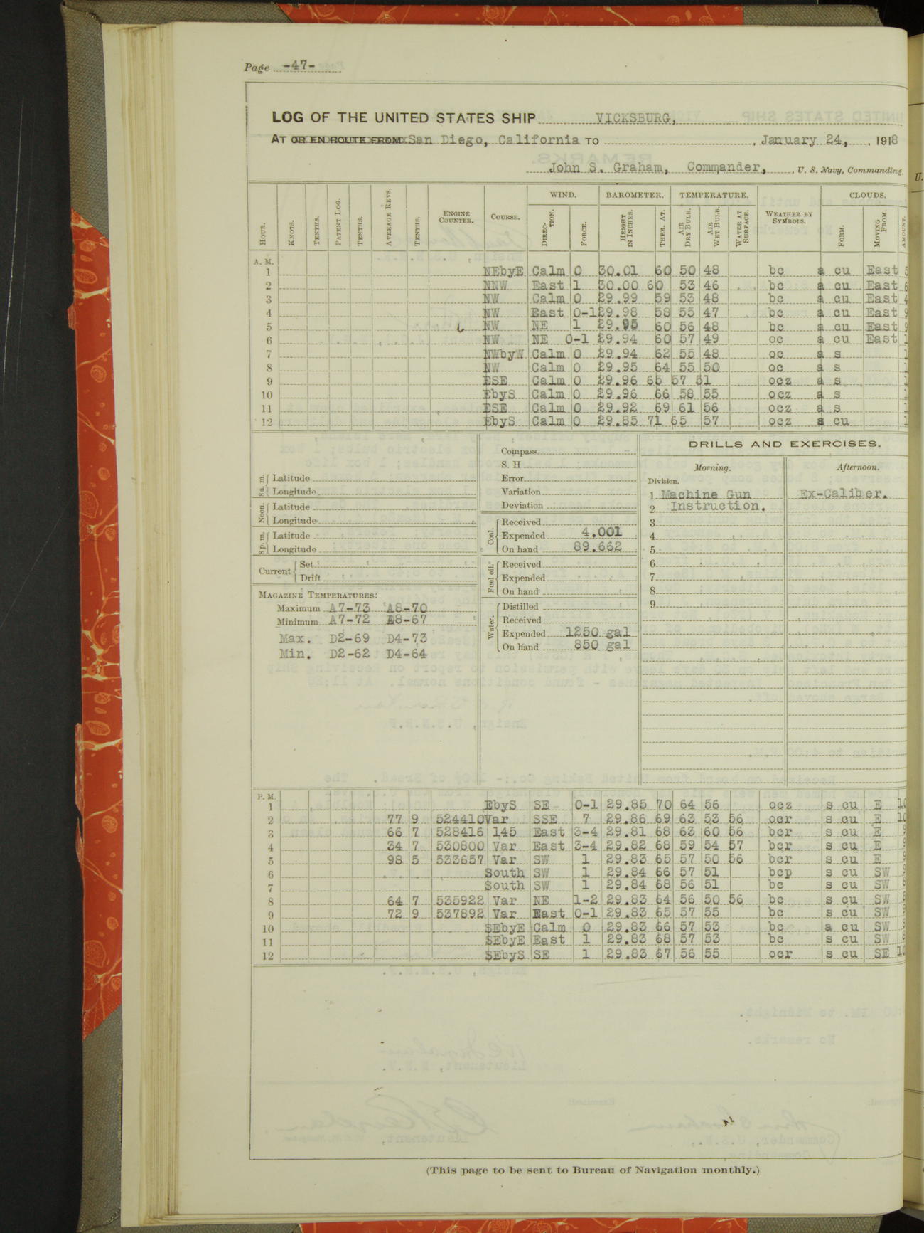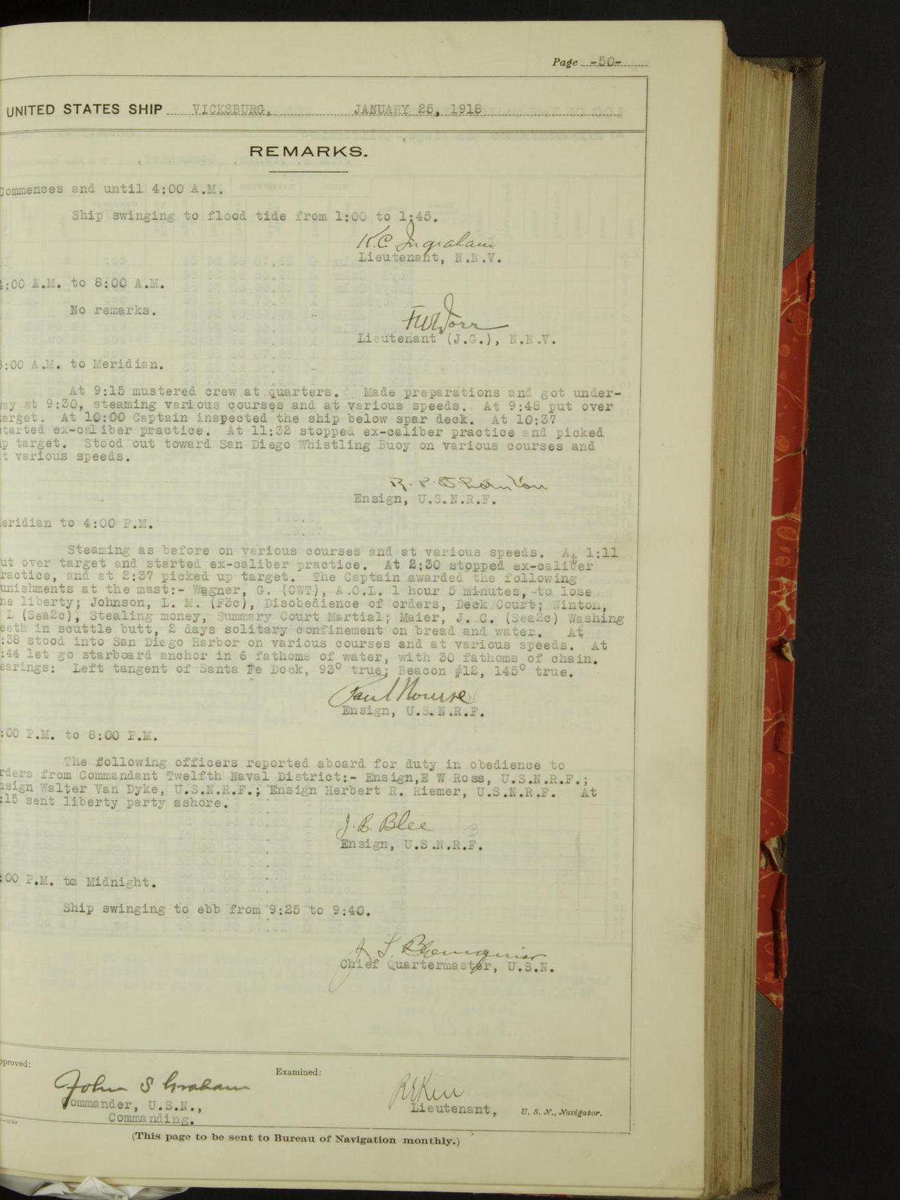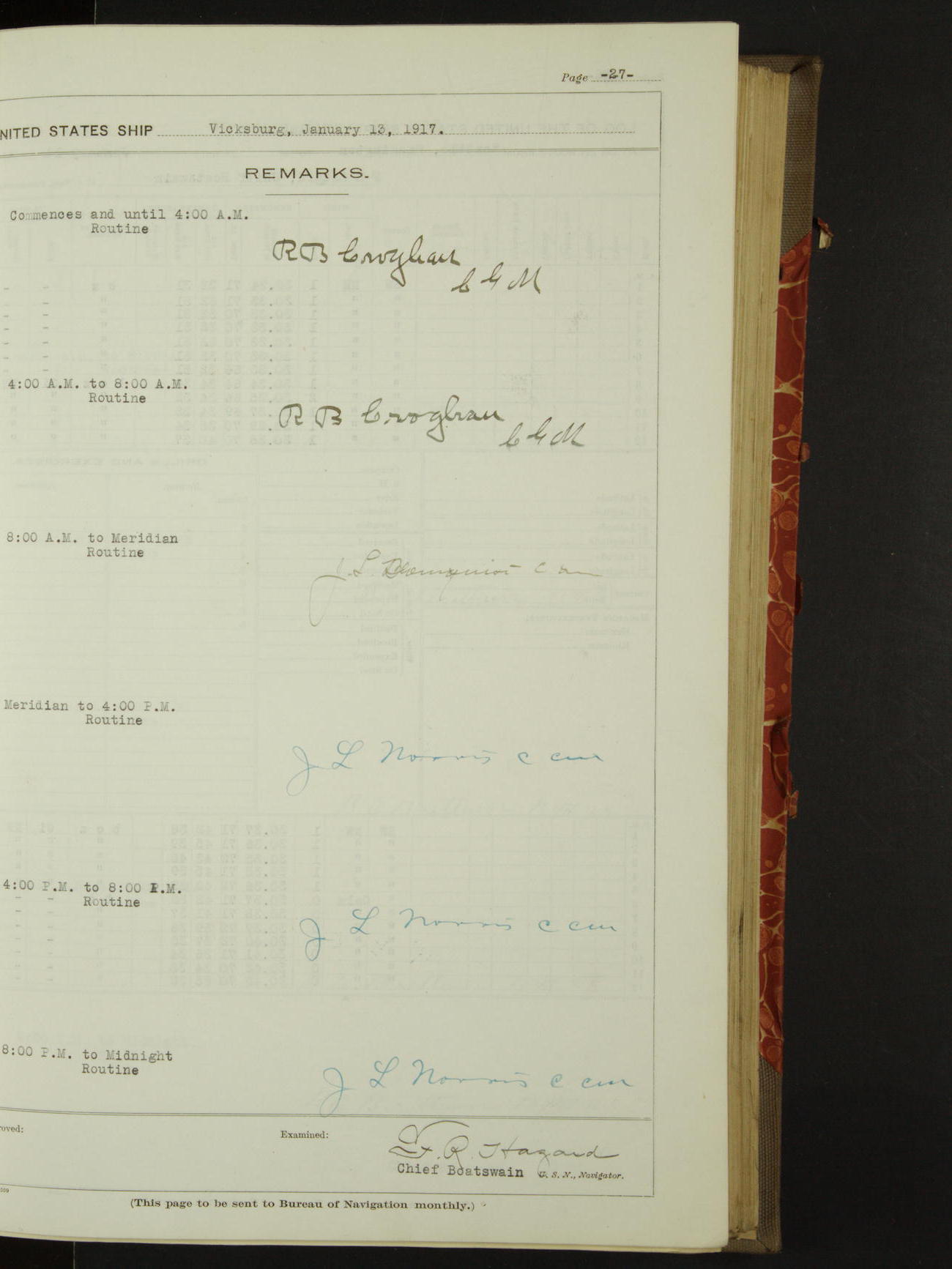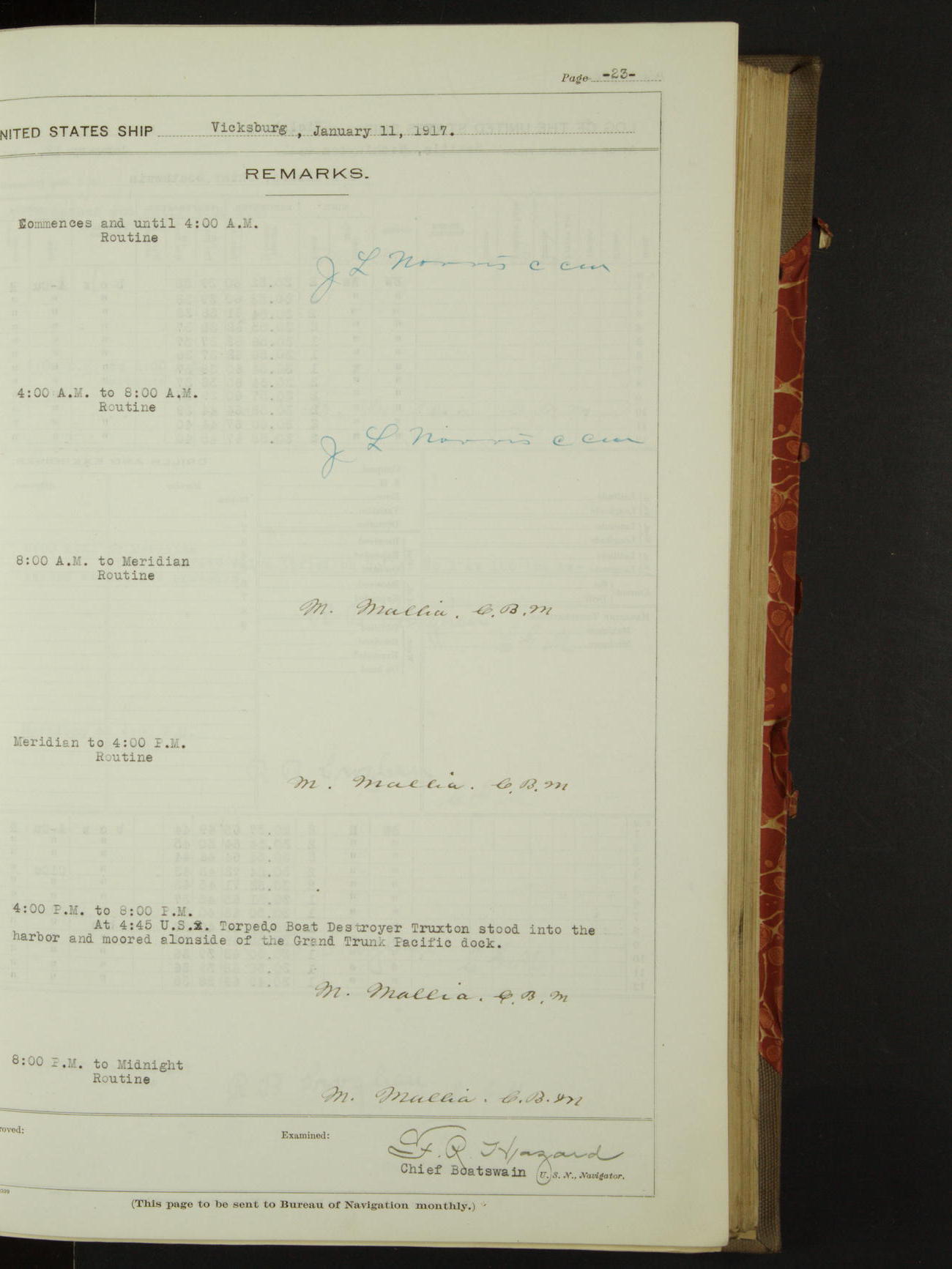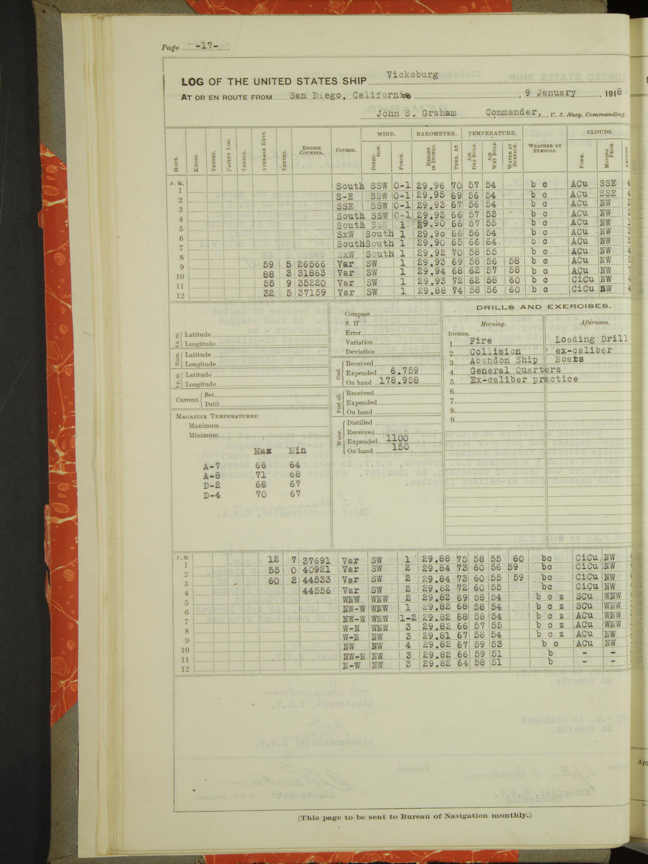 Log book of the USS "Vicksburg", 3rd rate, commanded by F R Hazard, Chief Boatswain, US Navy, attahced to reserve commission division, assigned to Naval Militia, State of Washington Squadron, Commencing January 1st, 1917, at 1.0am, and ending January 31st, 1917, at Midnight