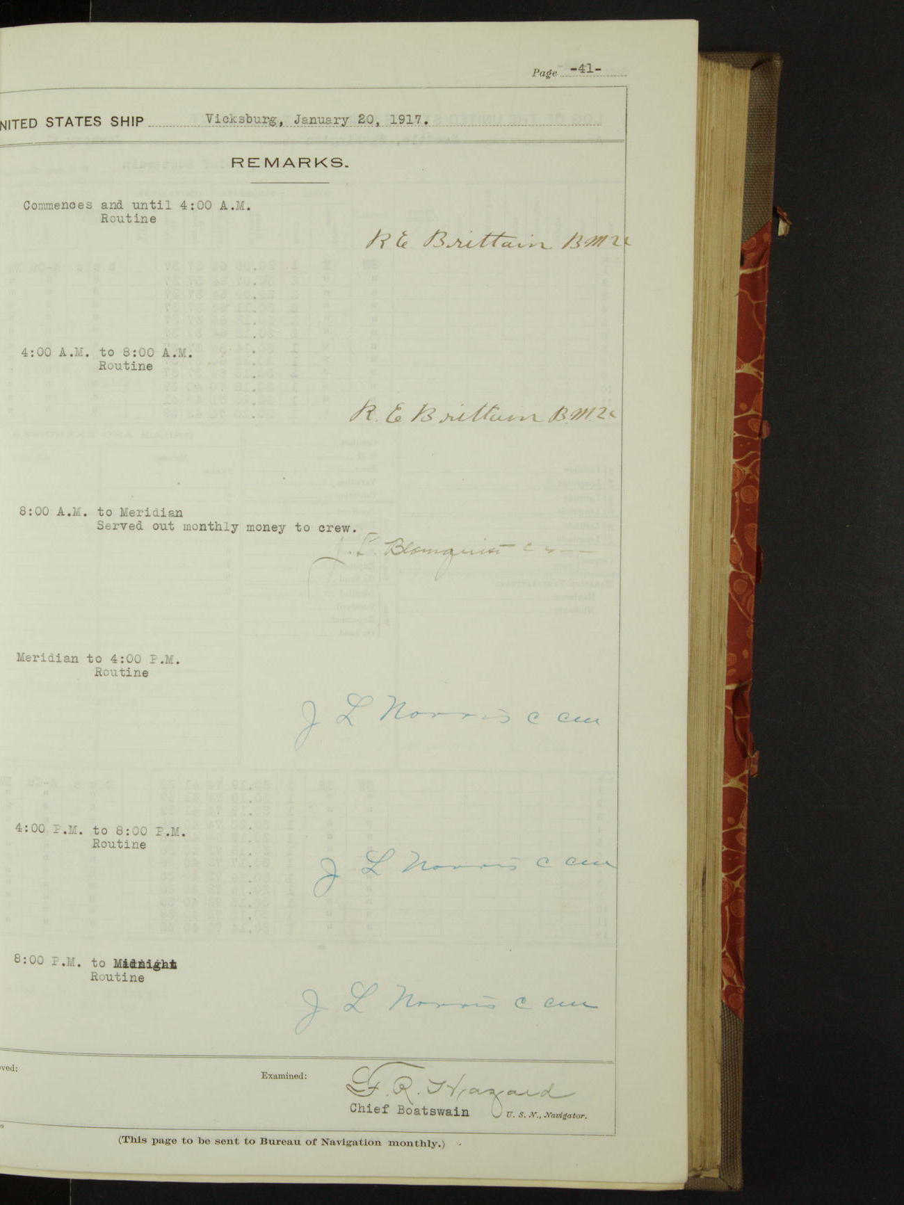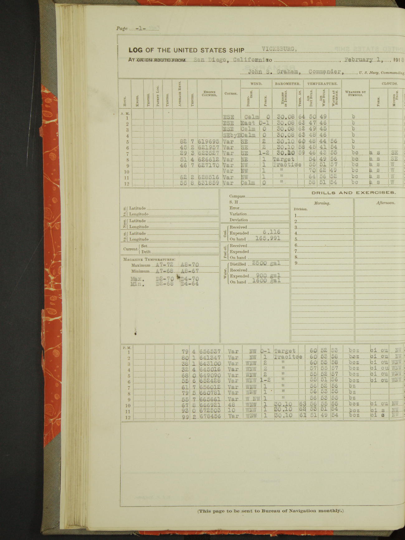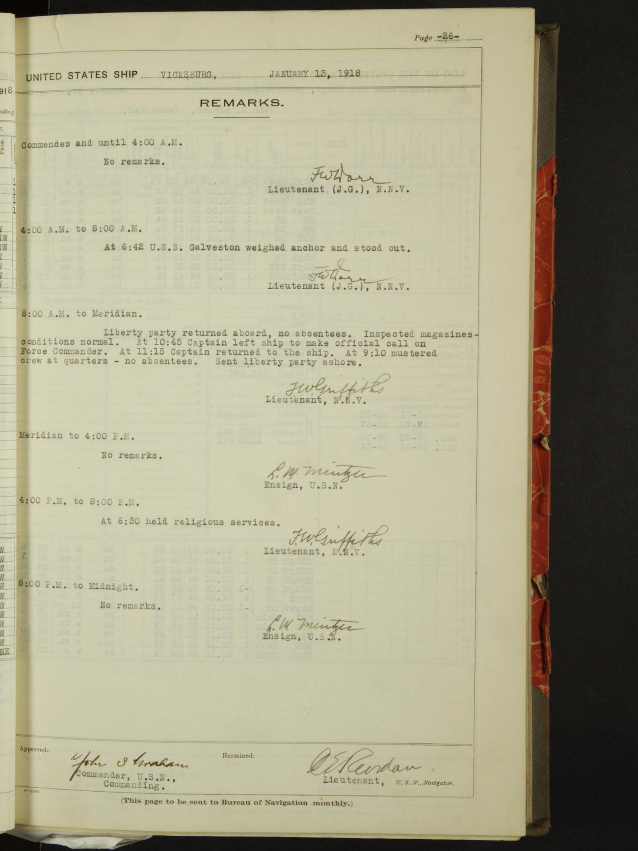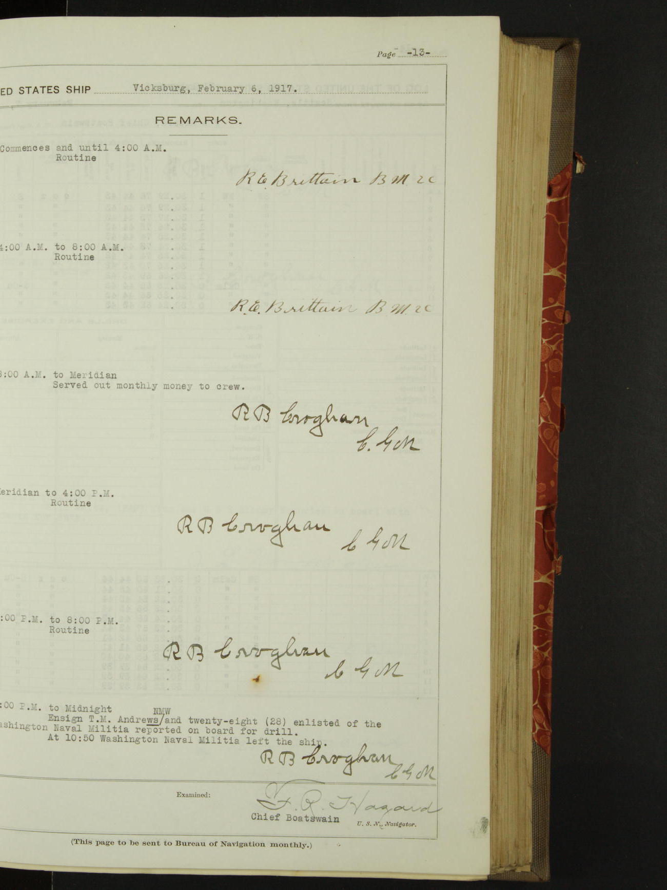 Log book of the USS "Vicksburg", 3rd rate, commanded by F R Hazard, Chief Boatswain, US Navy, attahced to reserve commission division, assigned to Naval Militia, State of Washington Squadron, Commencing January 1st, 1917, at 1.0am, and ending January 31st, 1917, at Midnight