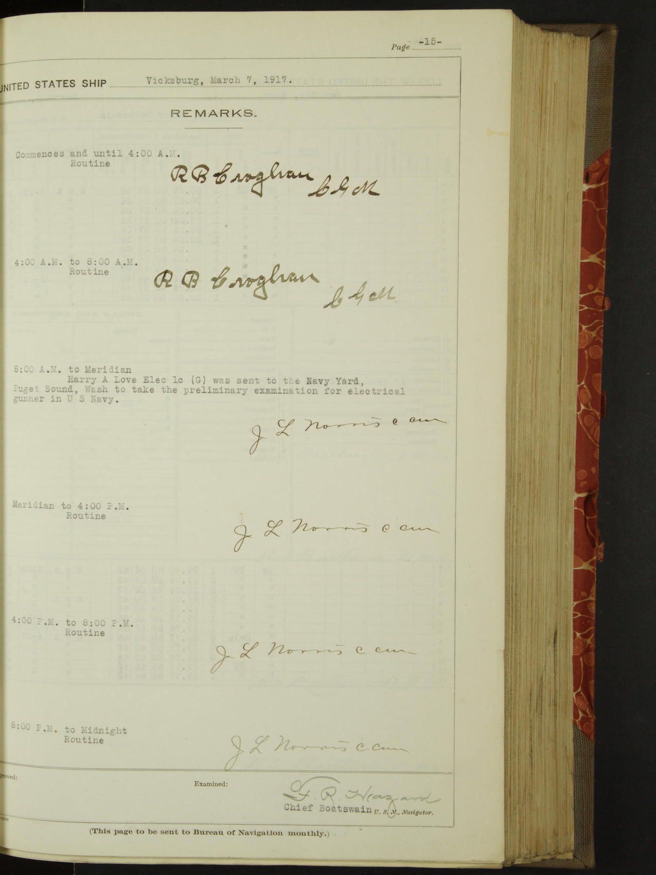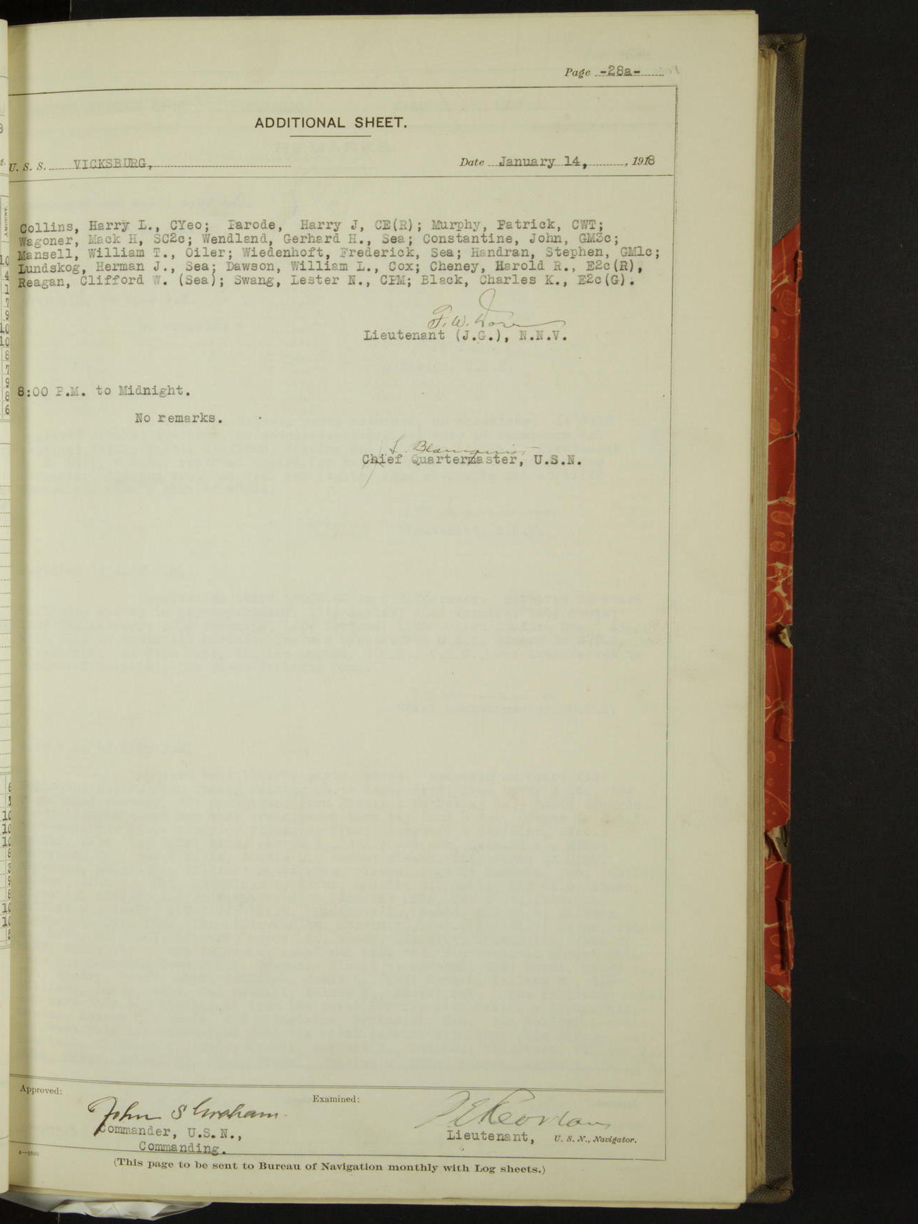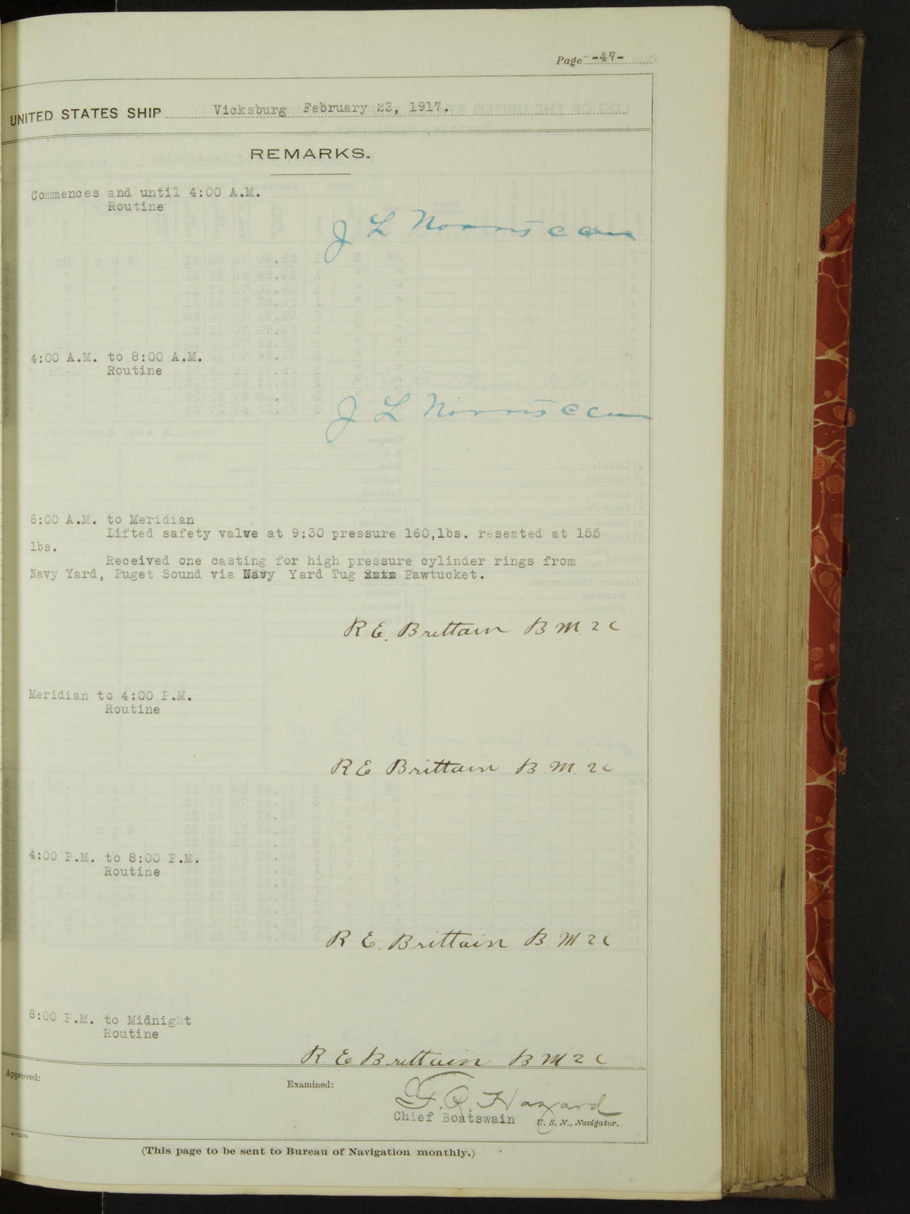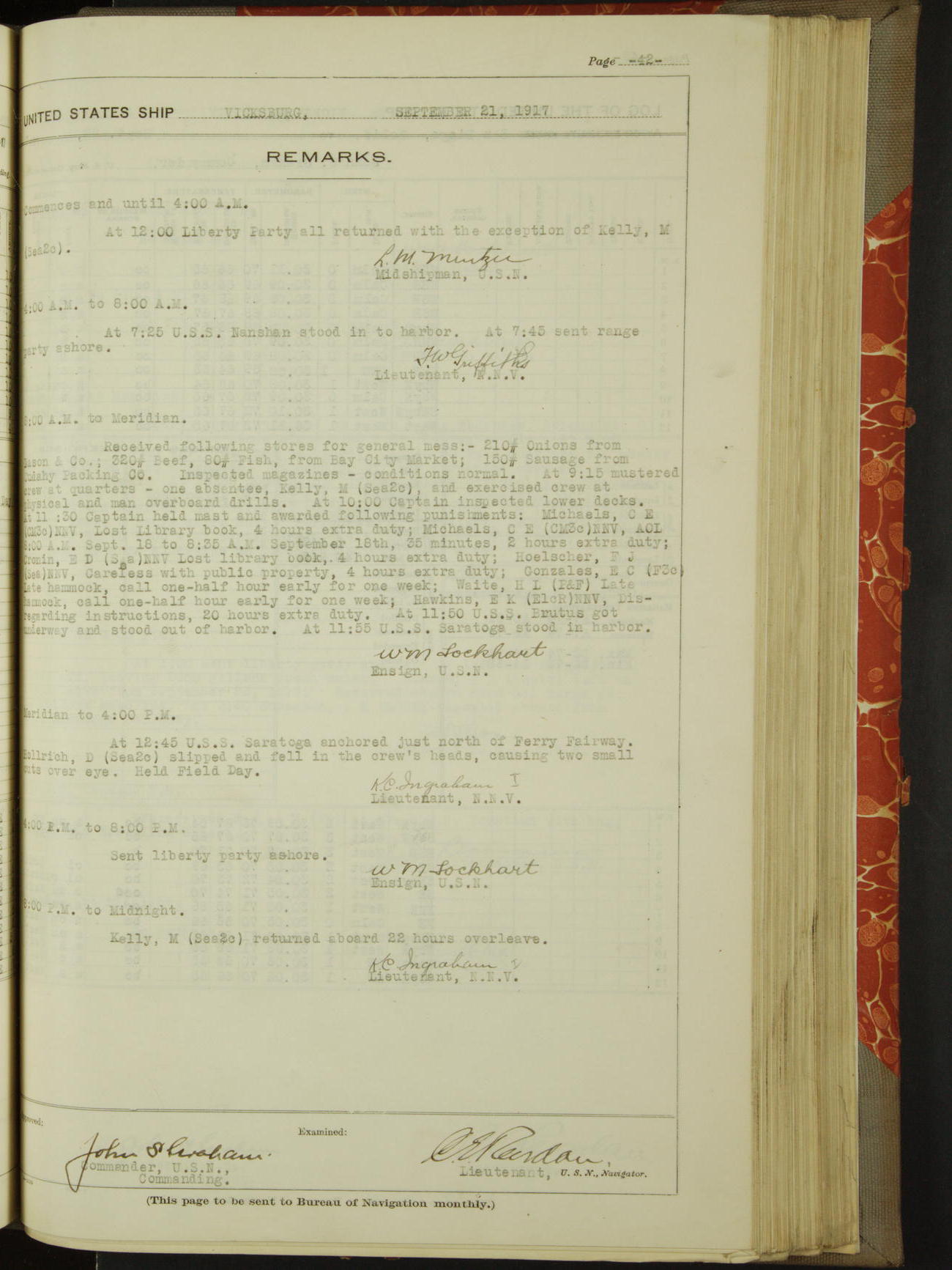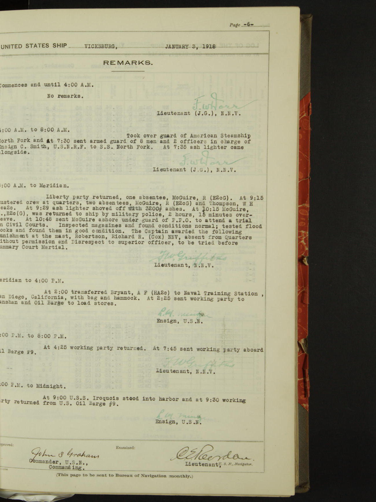 Log book of the USS "Vicksburg", 3rd rate, commanded by F R Hazard, Chief Boatswain, US Navy, attahced to reserve commission division, assigned to Naval Militia, State of Washington Squadron, Commencing January 1st, 1917, at 1.0am, and ending January 31st, 1917, at Midnight