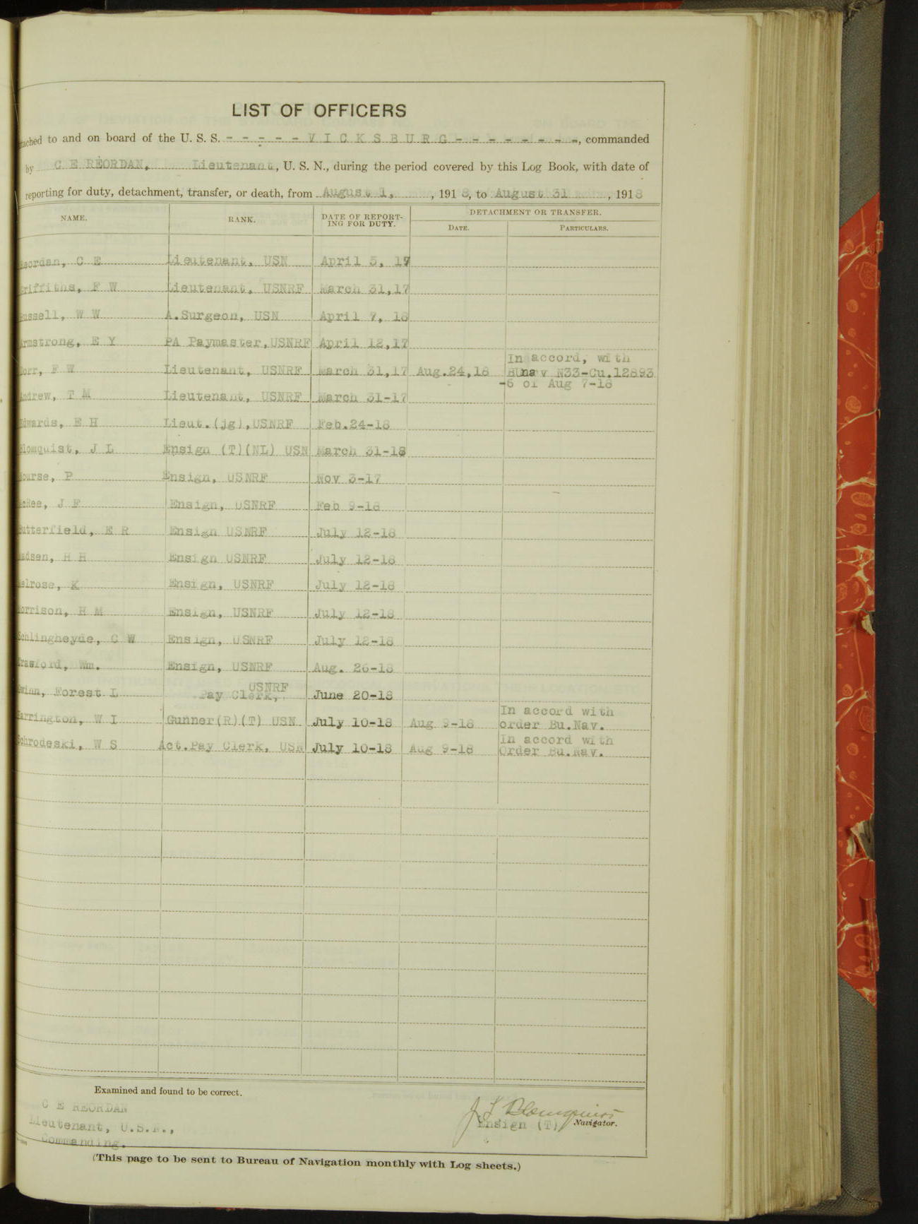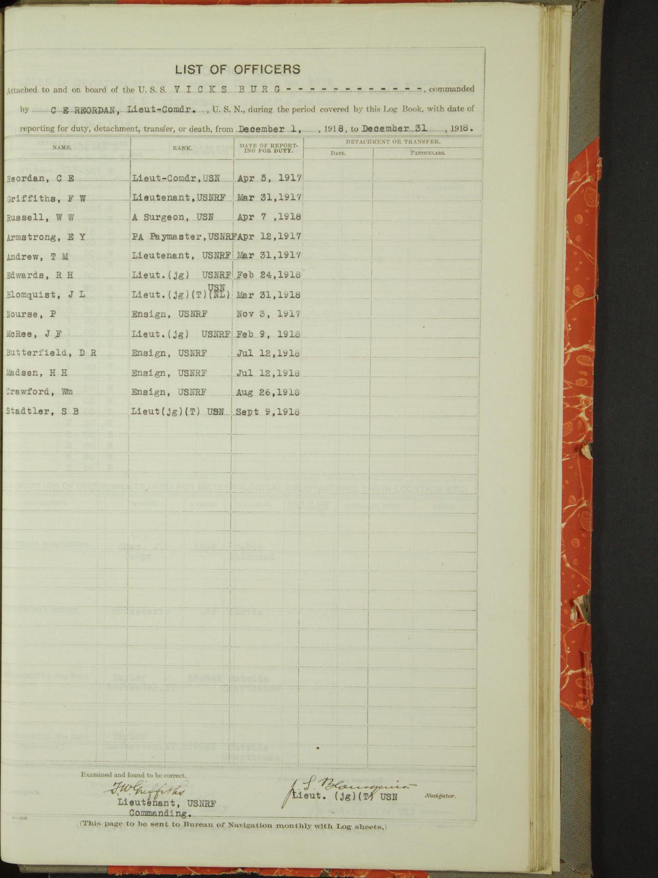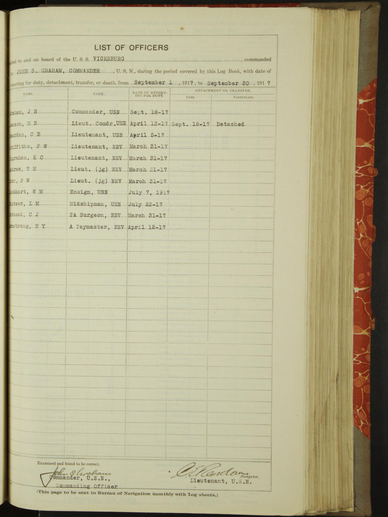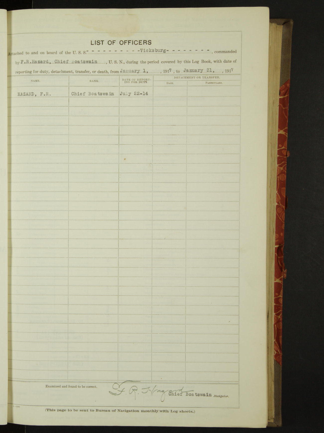 List of Officers attached to and on board of the USS "Vicksburg", commanded by F R Hazard, Chief Boatswain, USN, during the period covered by this Log book with date of reporting for duty, detachment, transfer or death from January 1st, 1917, to January 31st, 1917