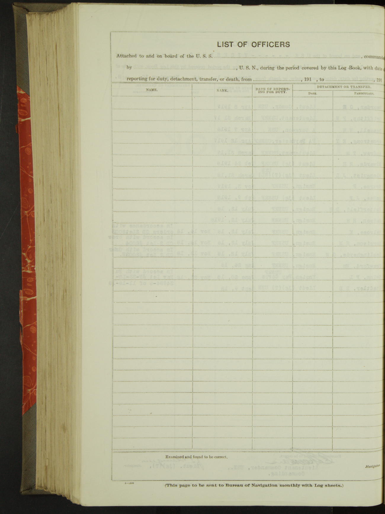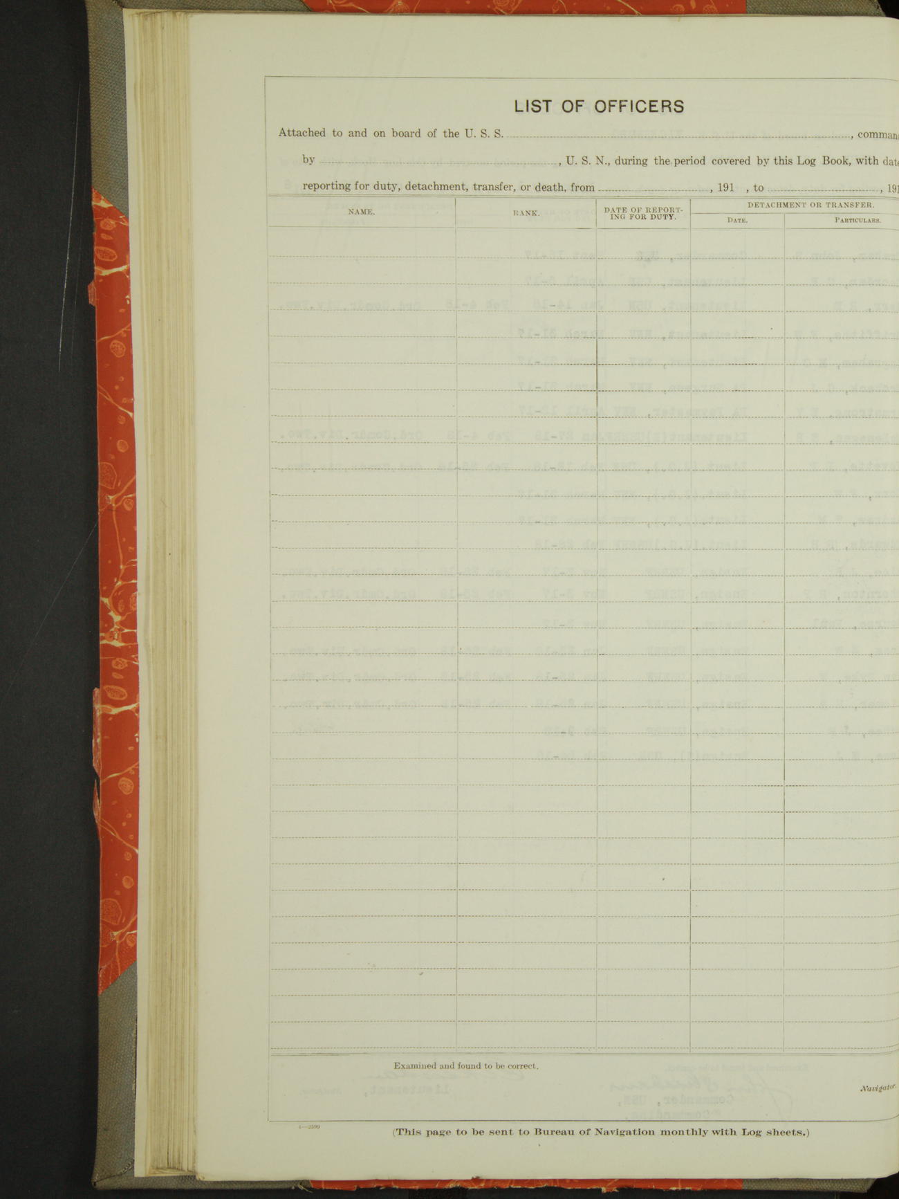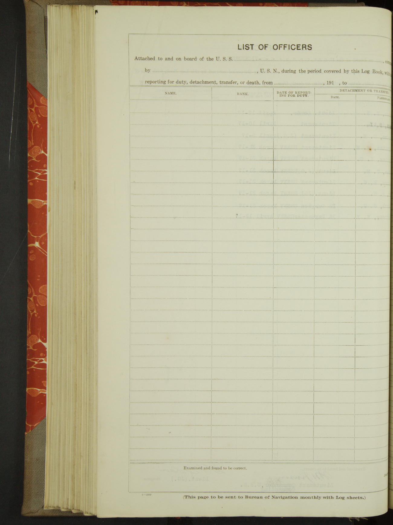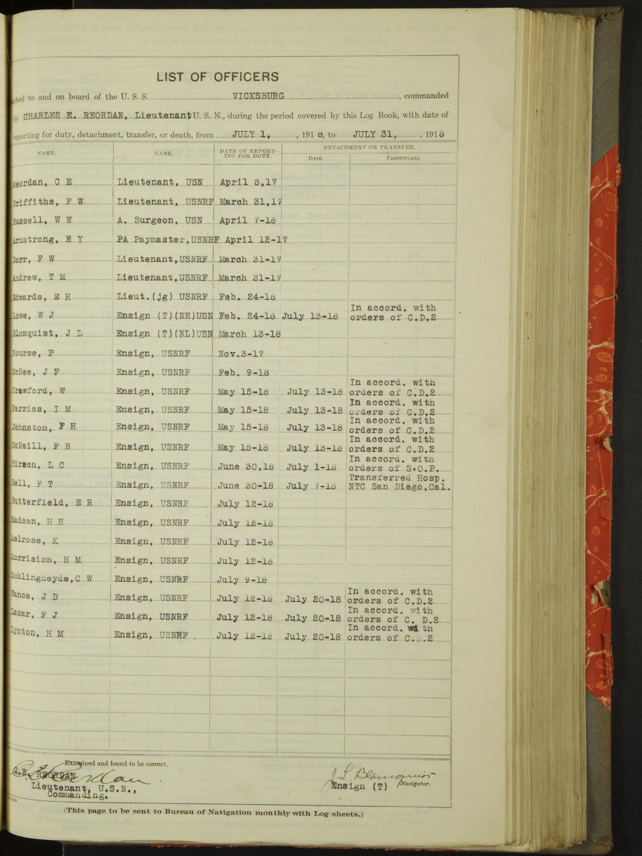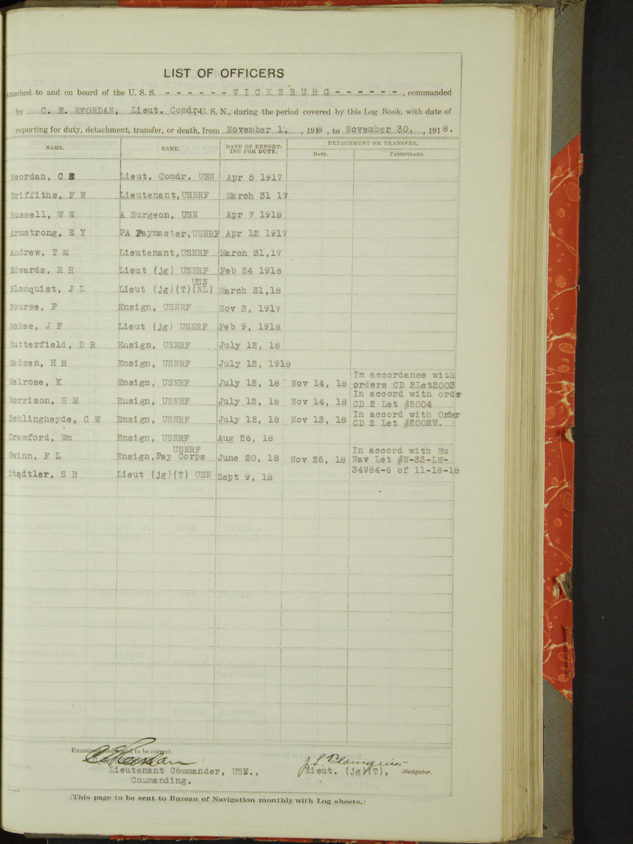 List of Officers attached to and on board of the USS "Vicksburg", commanded by F R Hazard, Chief Boatswain, USN, during the period covered by this Log book with date of reporting for duty, detachment, transfer or death from January 1st, 1917, to January 31st, 1917