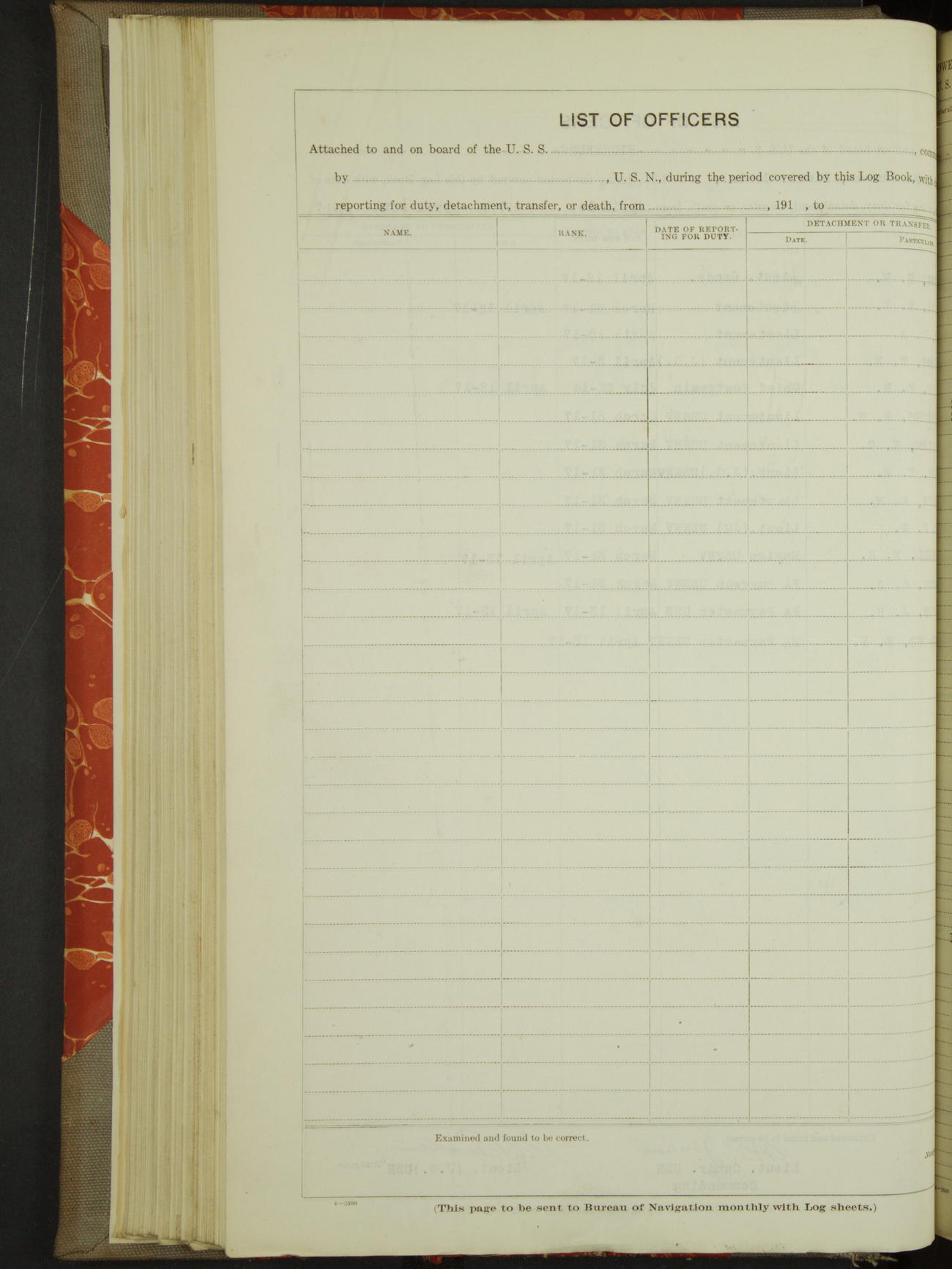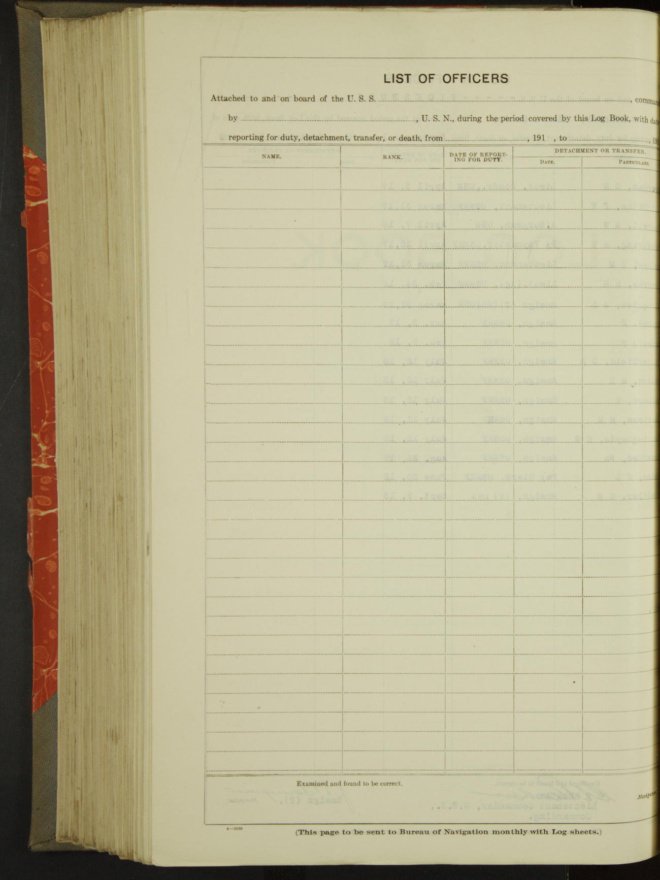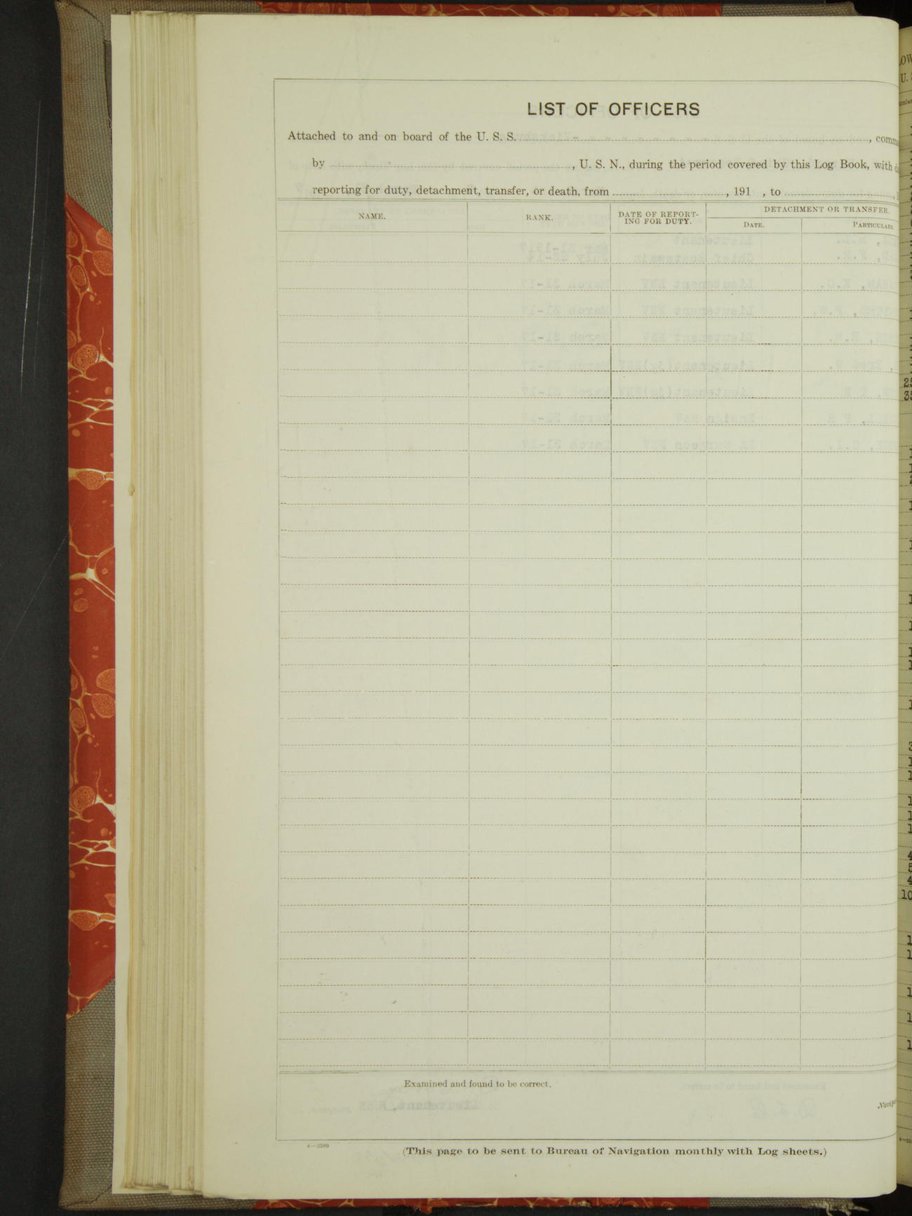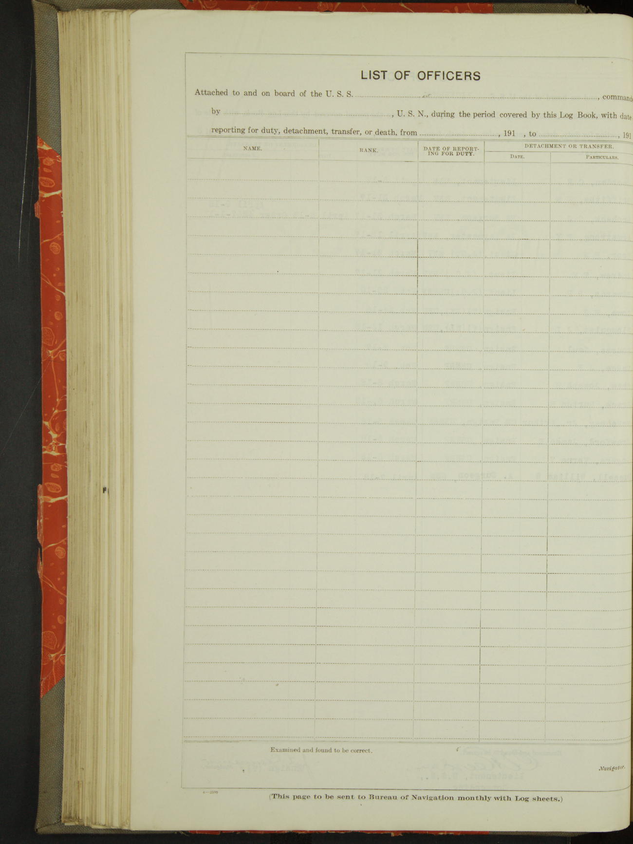 List of Officers attached to and on board of the USS "Vicksburg", commanded by F R Hazard, Chief Boatswain, USN, during the period covered by this Log book with date of reporting for duty, detachment, transfer or death from January 1st, 1917, to January 31st, 1917