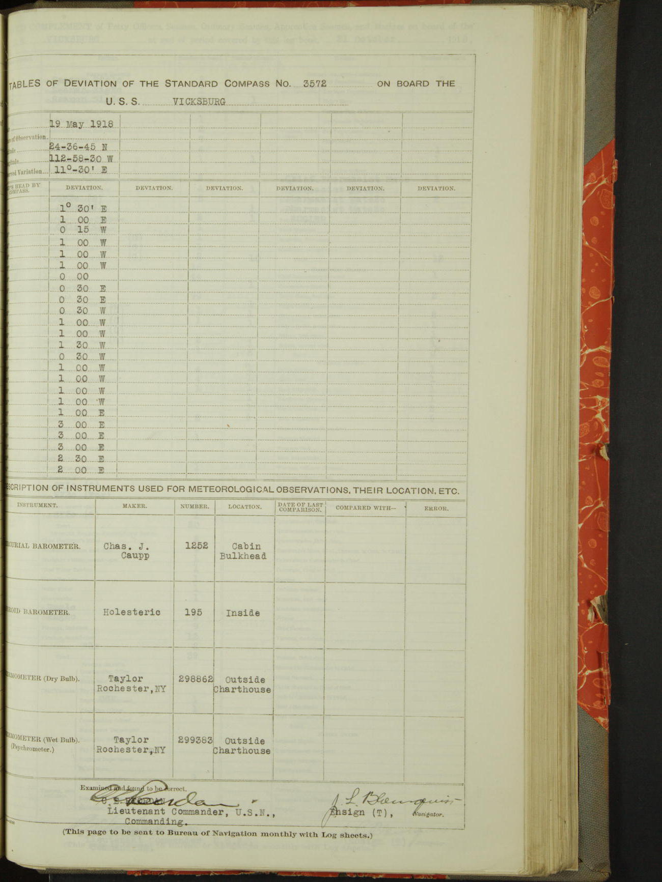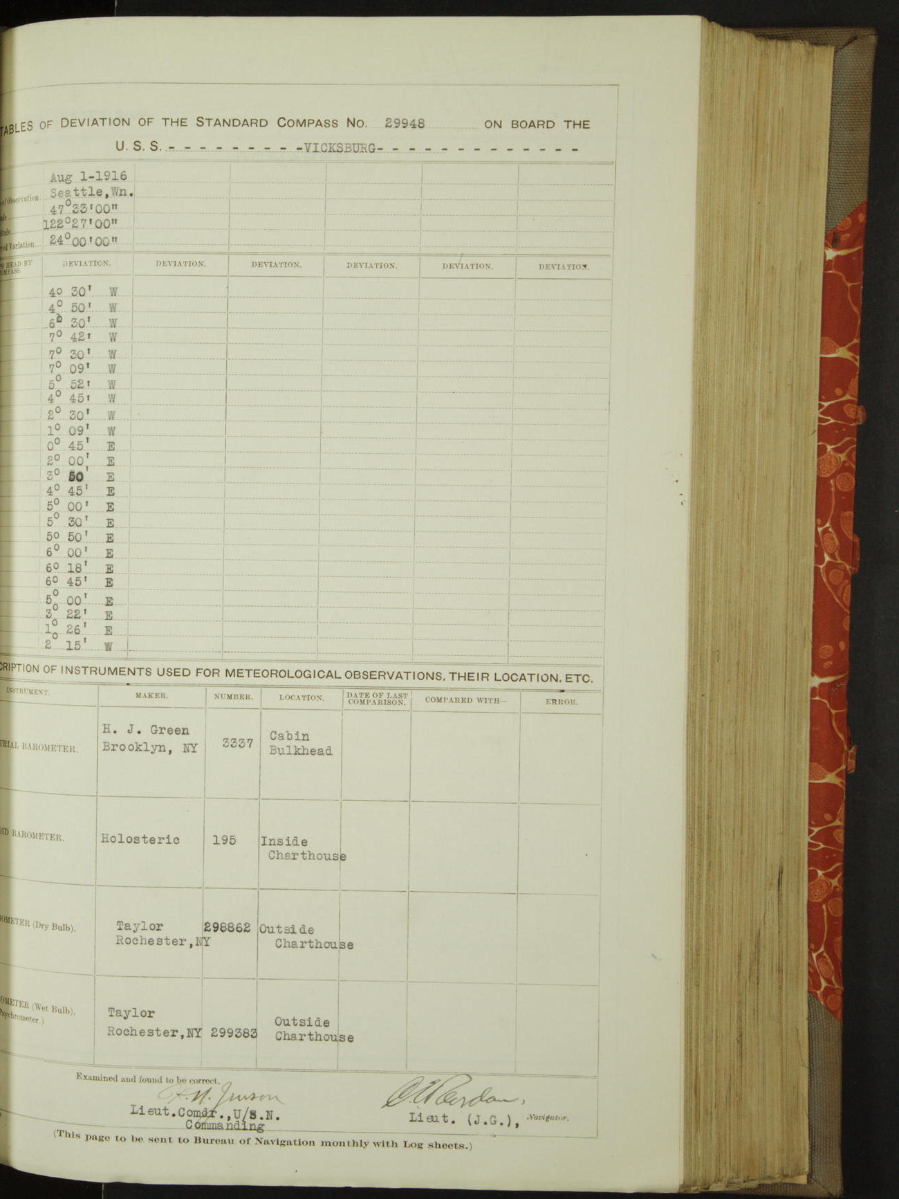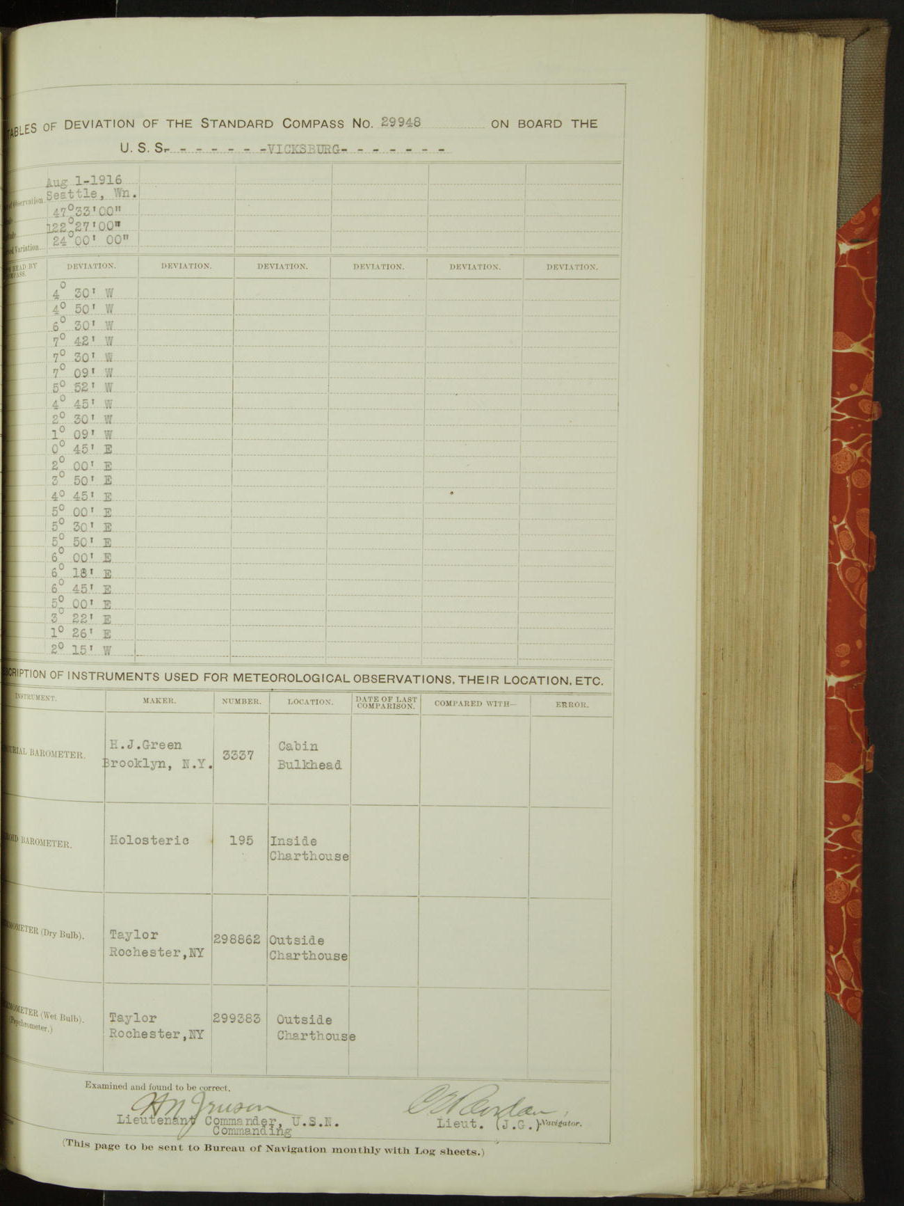 Tables of deviation of the standard compass N° 29948 on board the USS Vicksburg