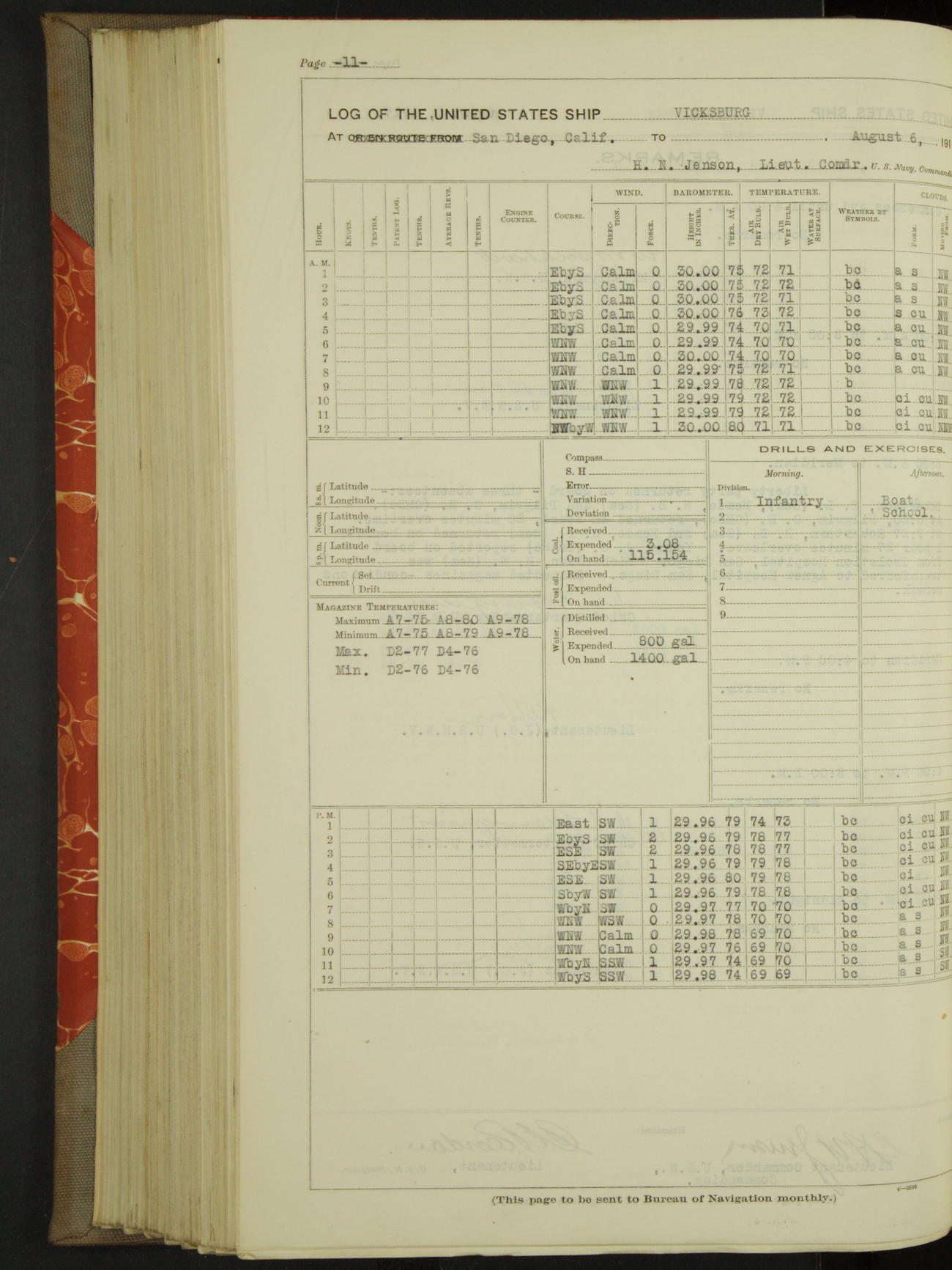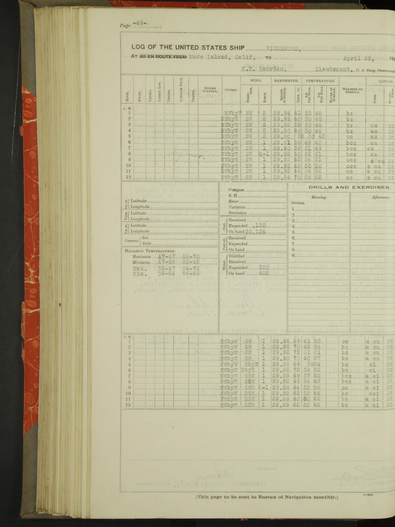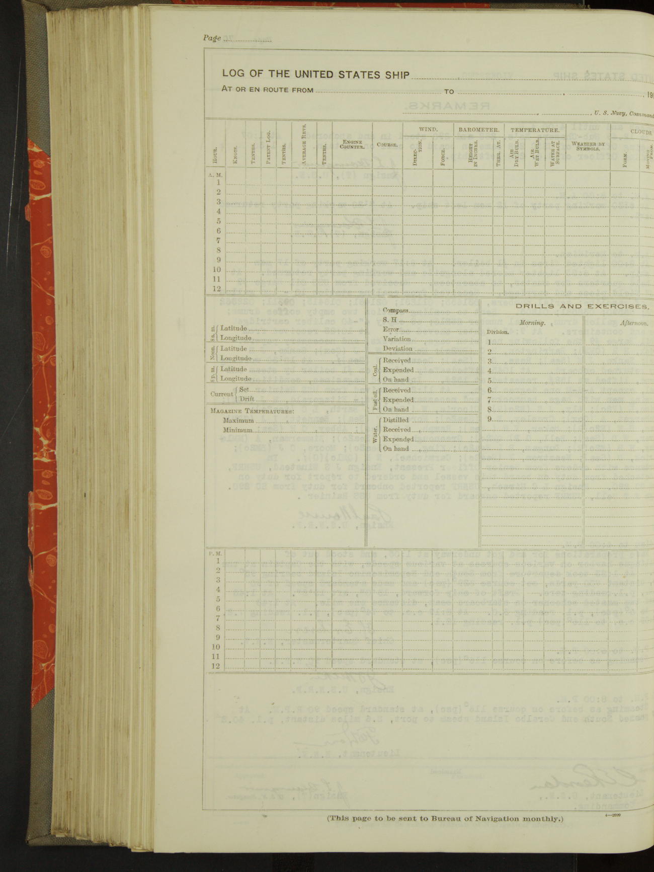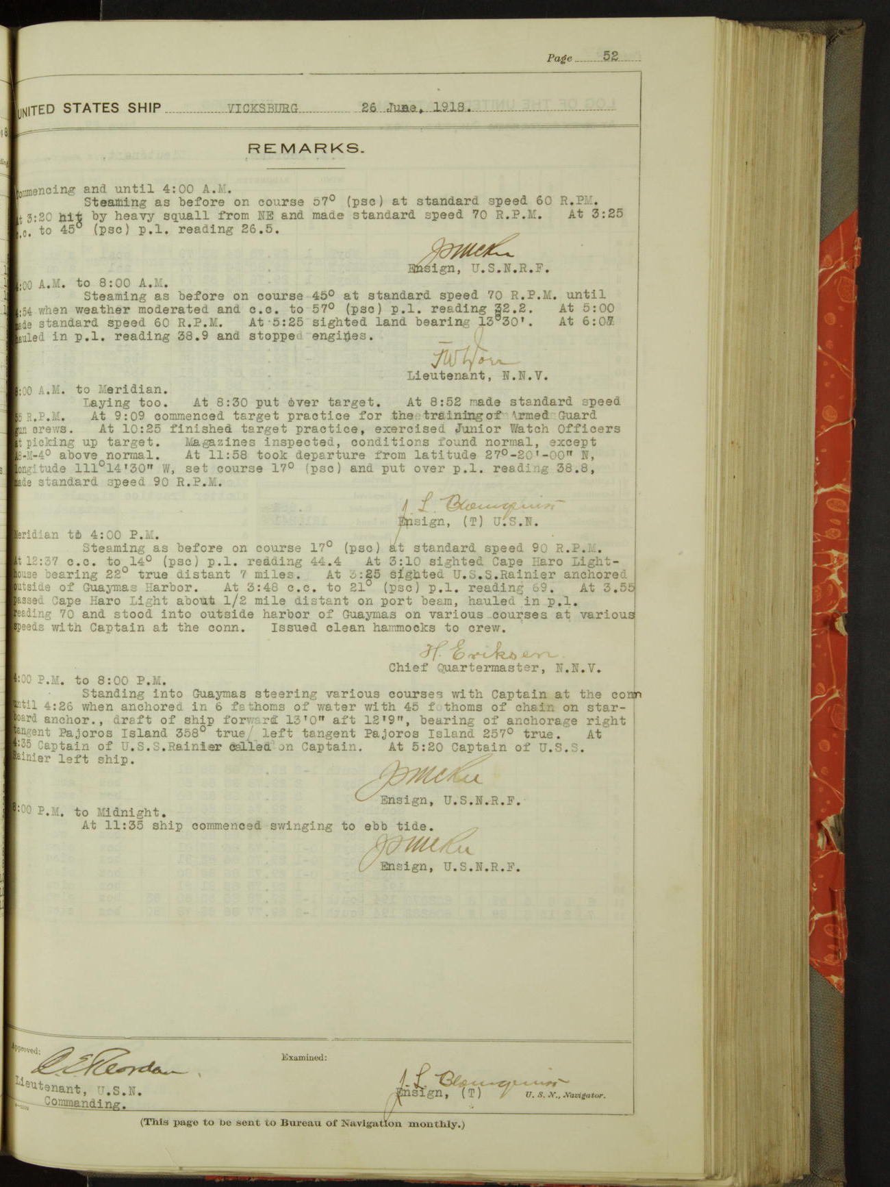 8:00 A.M. to Meridian At 9:05 unmoored ship and stood out on various courses. Draft of ship fore 12'9" aft 12'6". At 8:50 the following officers abd enlisted men of the Washington Naval Militia came aboard. for cruise. Lieut-Comdr Stetson, Ensign R.A. McKay, Ensign W.R. McAdams, 2 C.P.O. and 52 enlisted men. Naval Militia held following, fire quarters, collision drill, general guarters, life boat drill.
