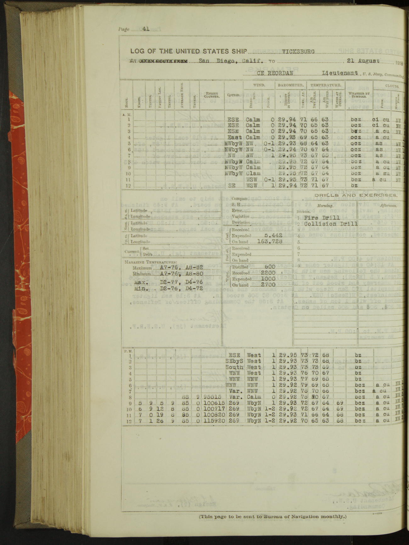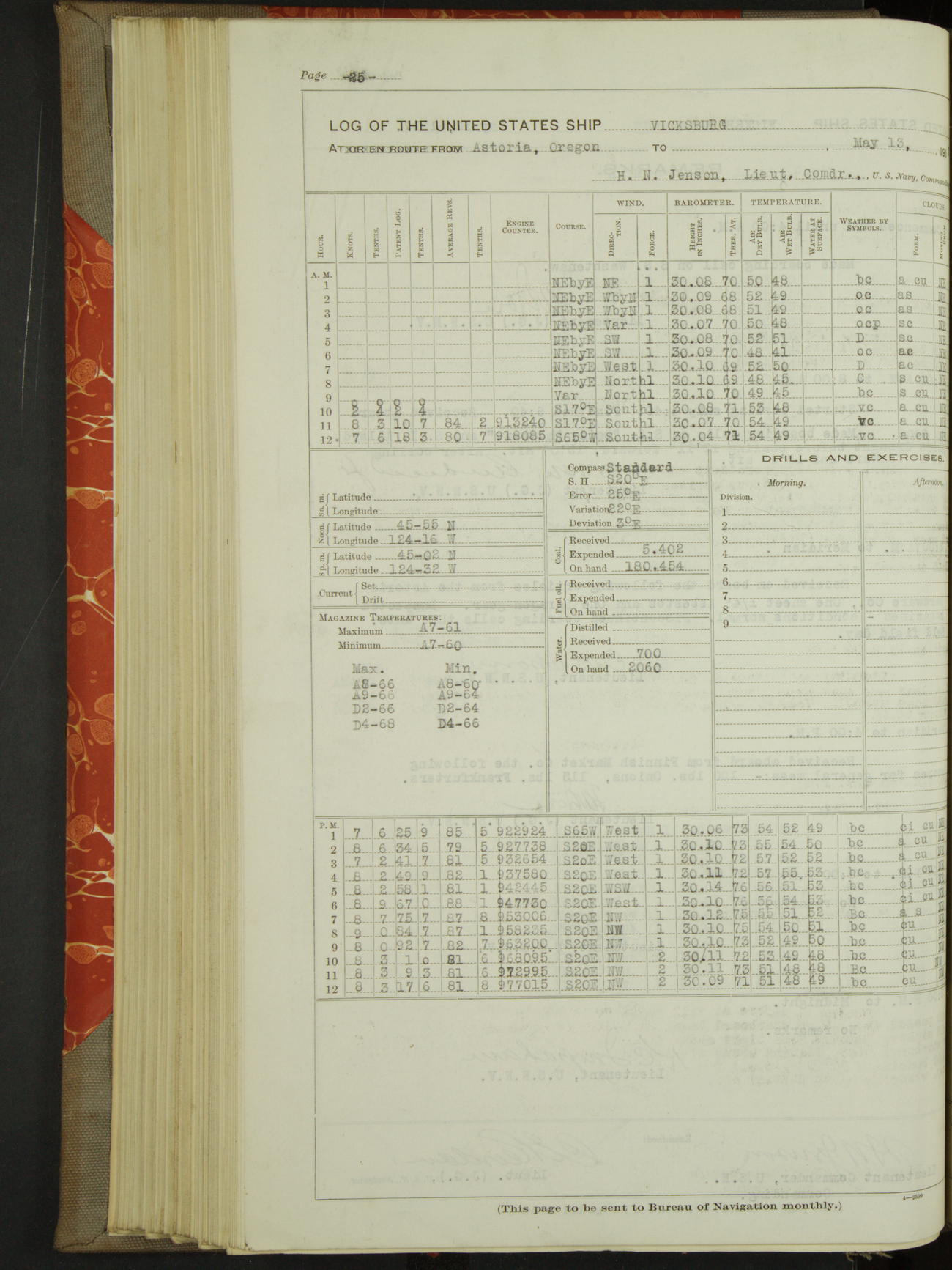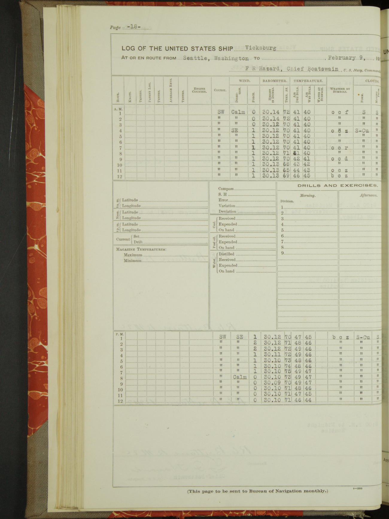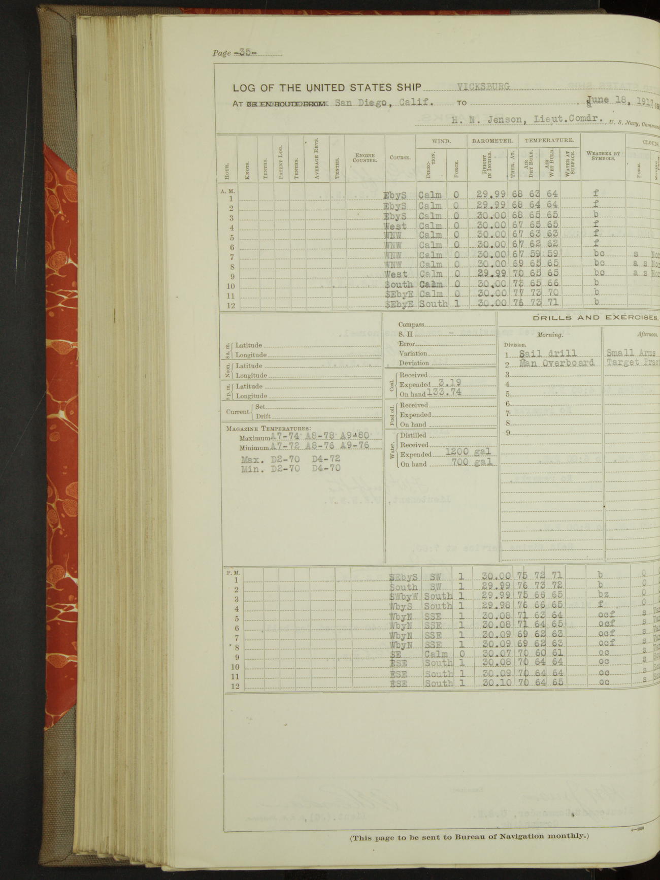 8:00 A.M. to Meridian At 9:05 unmoored ship and stood out on various courses. Draft of ship fore 12'9" aft 12'6". At 8:50 the following officers abd enlisted men of the Washington Naval Militia came aboard. for cruise. Lieut-Comdr Stetson, Ensign R.A. McKay, Ensign W.R. McAdams, 2 C.P.O. and 52 enlisted men. Naval Militia held following, fire quarters, collision drill, general guarters, life boat drill.