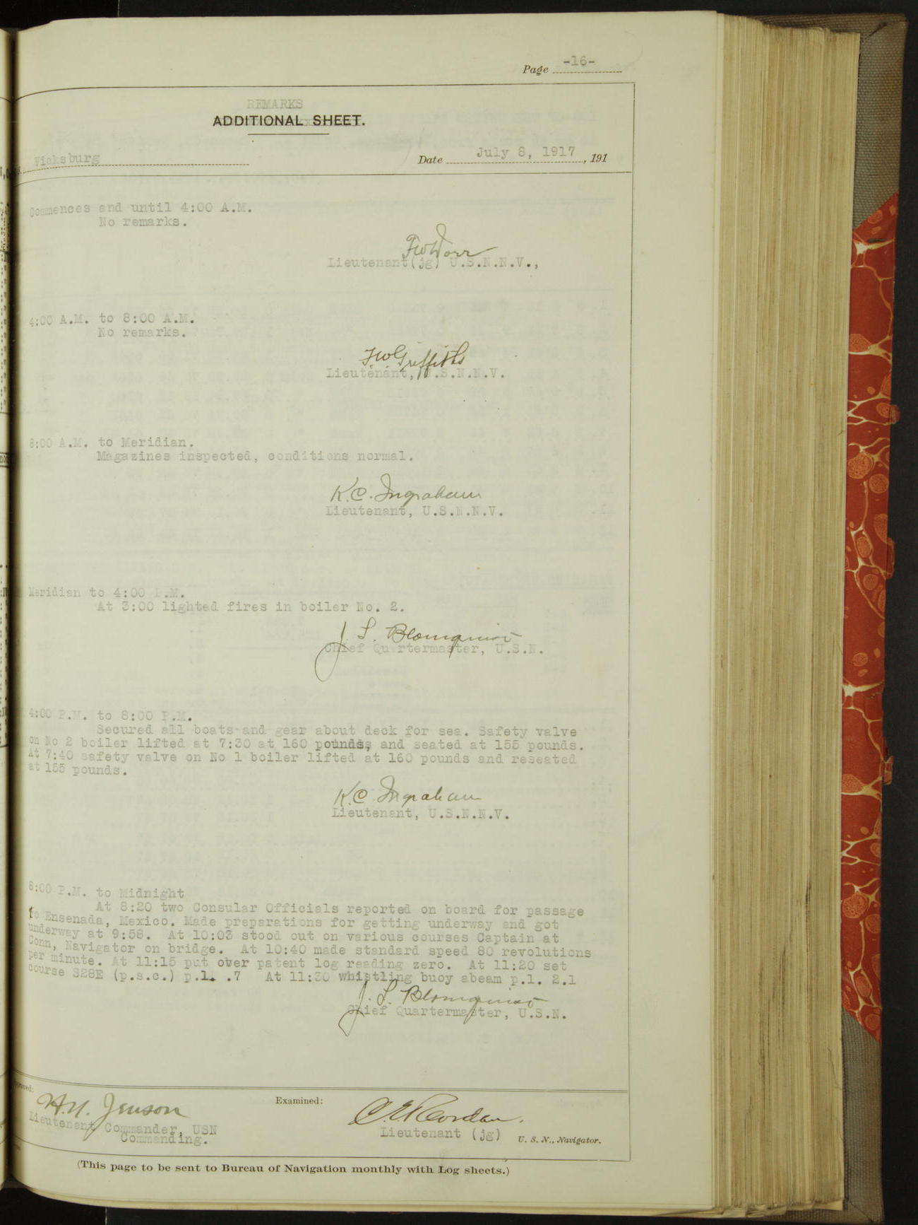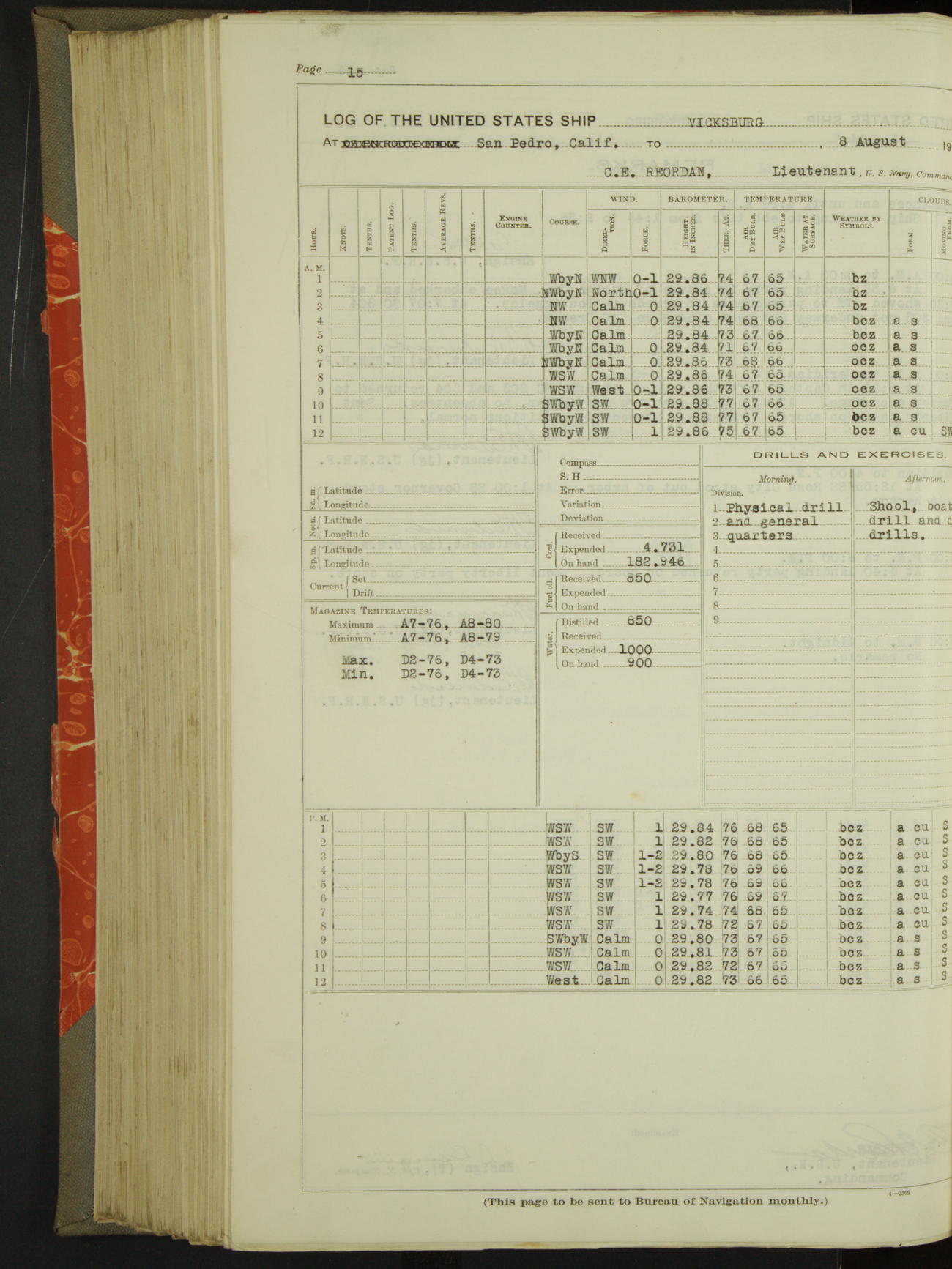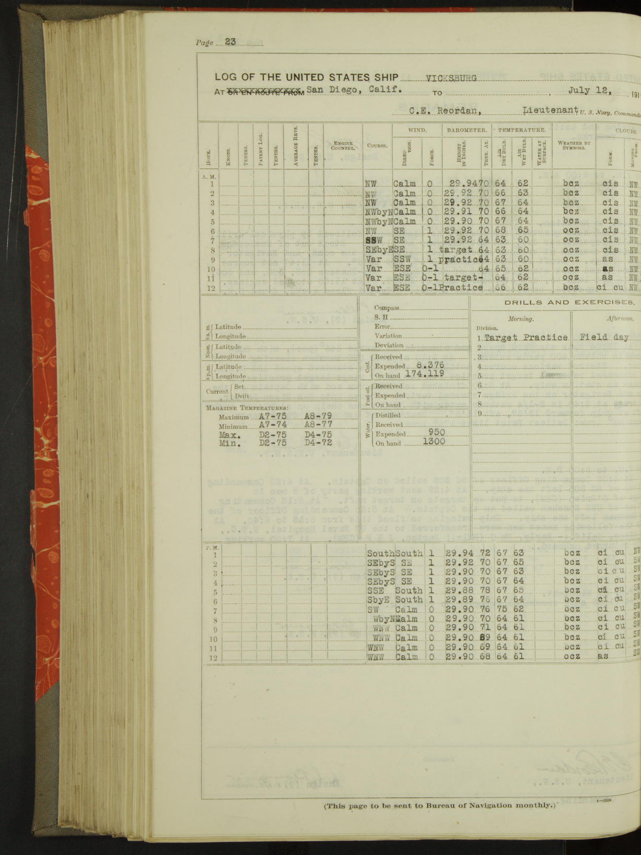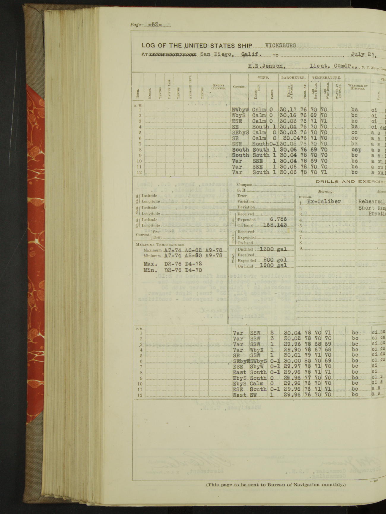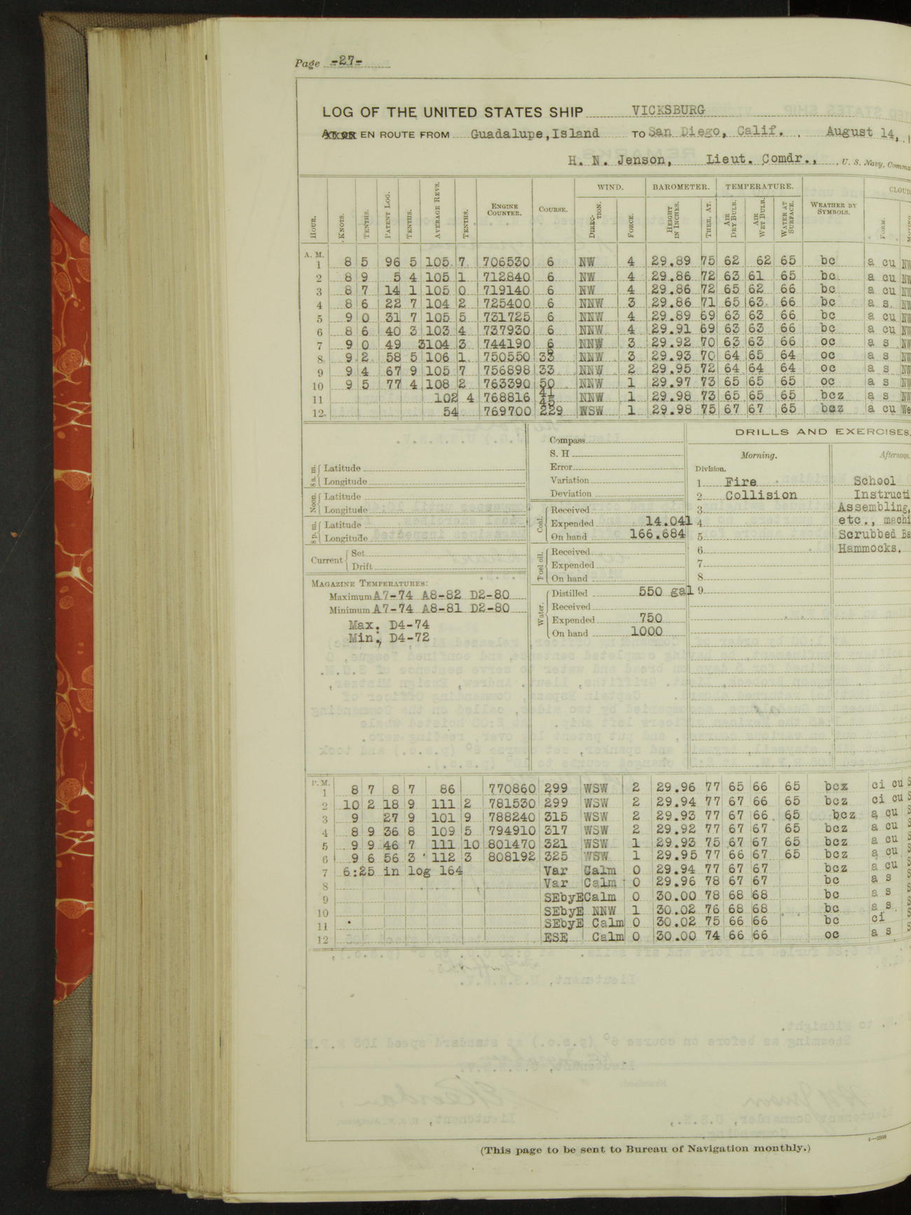 8:00 A.M. to Meridian At 9:05 unmoored ship and stood out on various courses. Draft of ship fore 12'9" aft 12'6". At 8:50 the following officers abd enlisted men of the Washington Naval Militia came aboard. for cruise. Lieut-Comdr Stetson, Ensign R.A. McKay, Ensign W.R. McAdams, 2 C.P.O. and 52 enlisted men. Naval Militia held following, fire quarters, collision drill, general guarters, life boat drill.