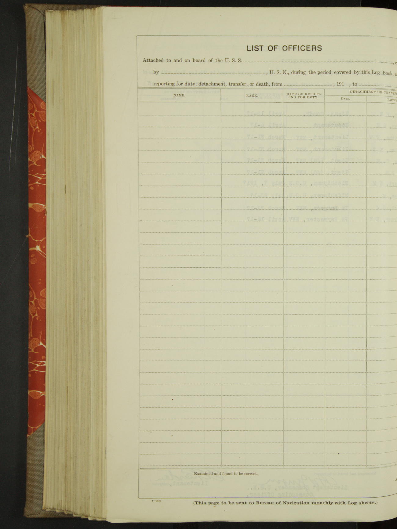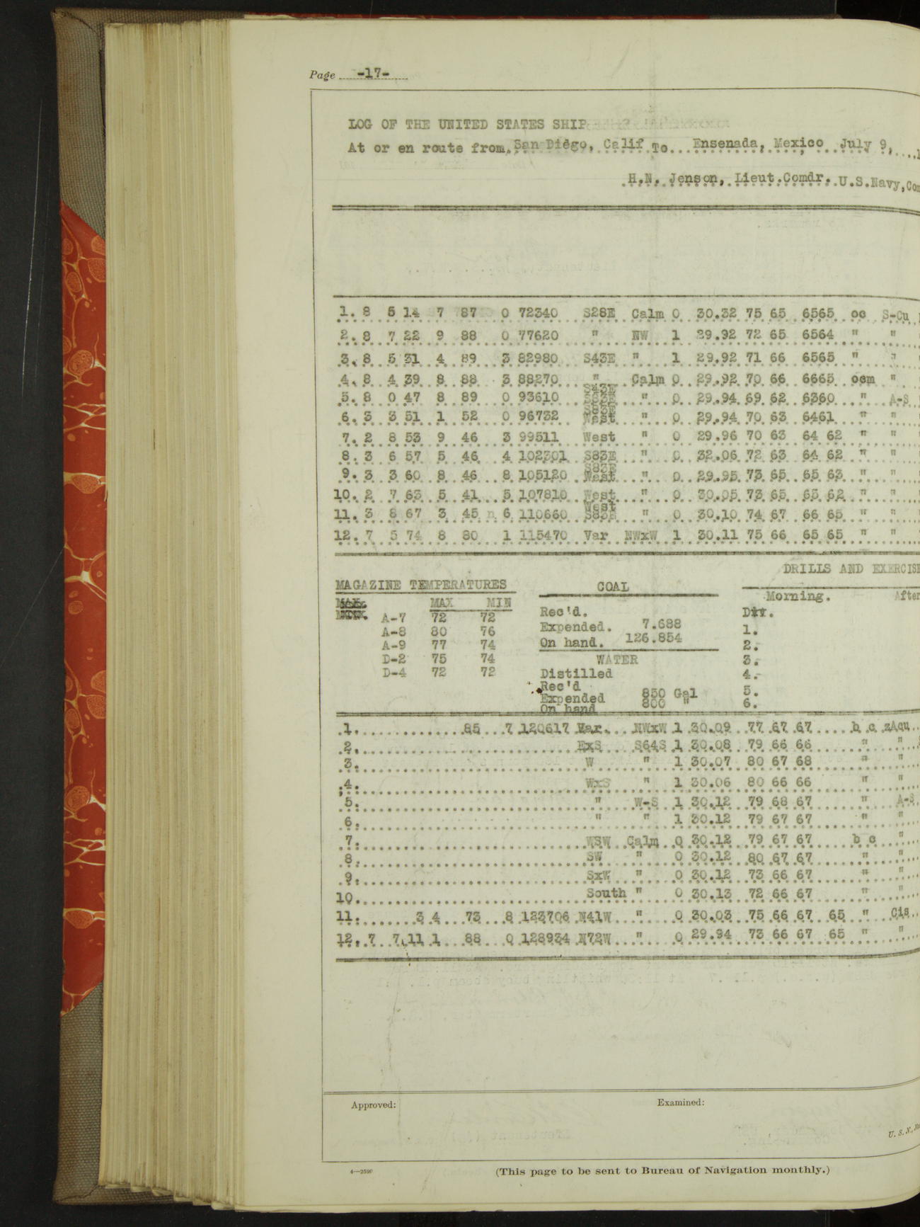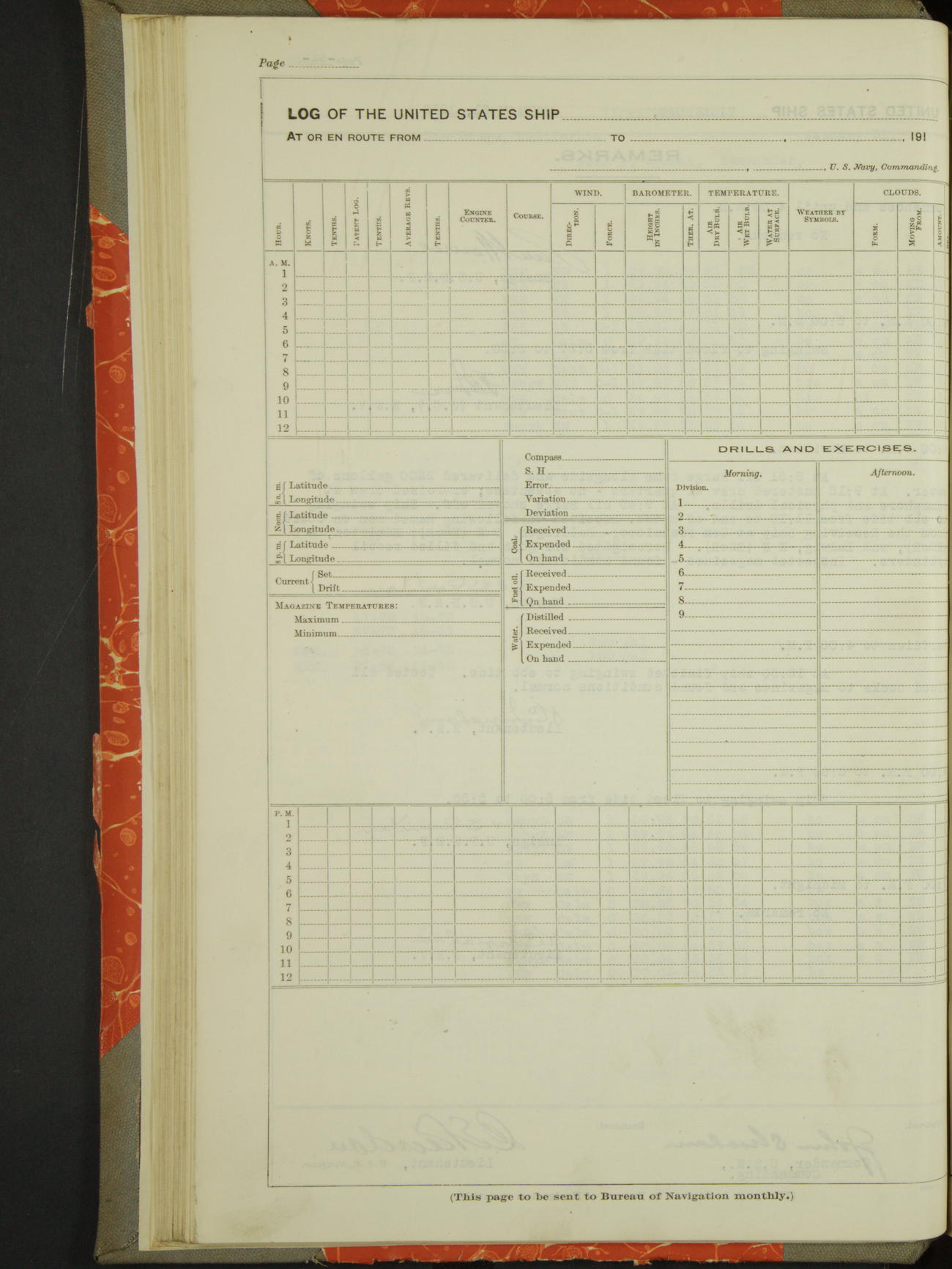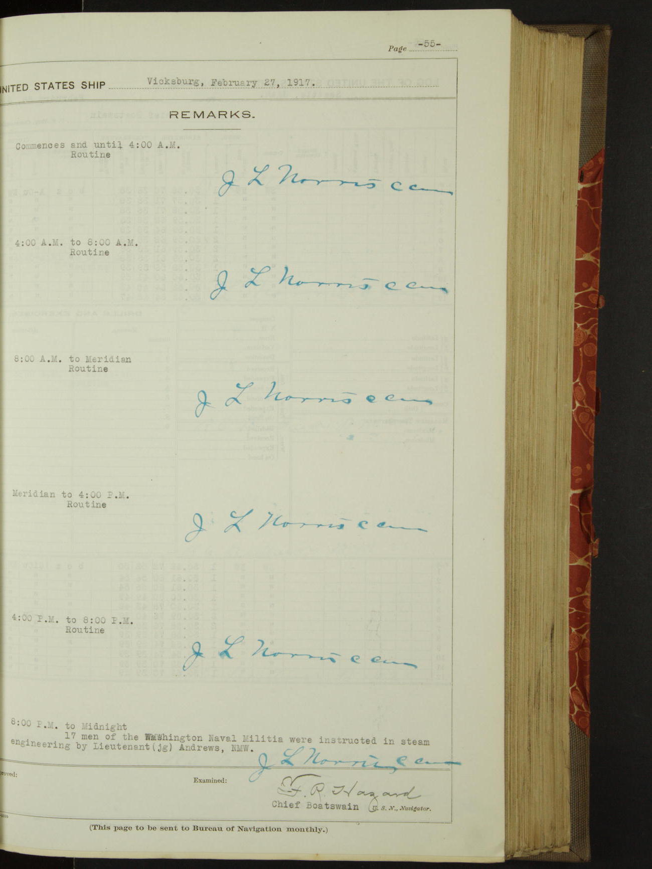 8:00 A.M. to Meridian At 9:05 unmoored ship and stood out on various courses. Draft of ship fore 12'9" aft 12'6". At 8:50 the following officers abd enlisted men of the Washington Naval Militia came aboard. for cruise. Lieut-Comdr Stetson, Ensign R.A. McKay, Ensign W.R. McAdams, 2 C.P.O. and 52 enlisted men. Naval Militia held following, fire quarters, collision drill, general guarters, life boat drill.