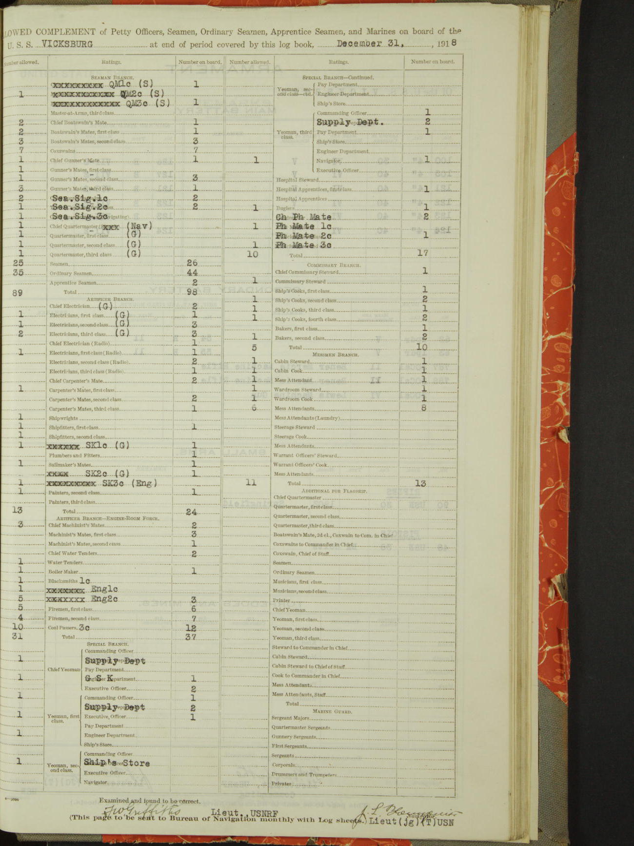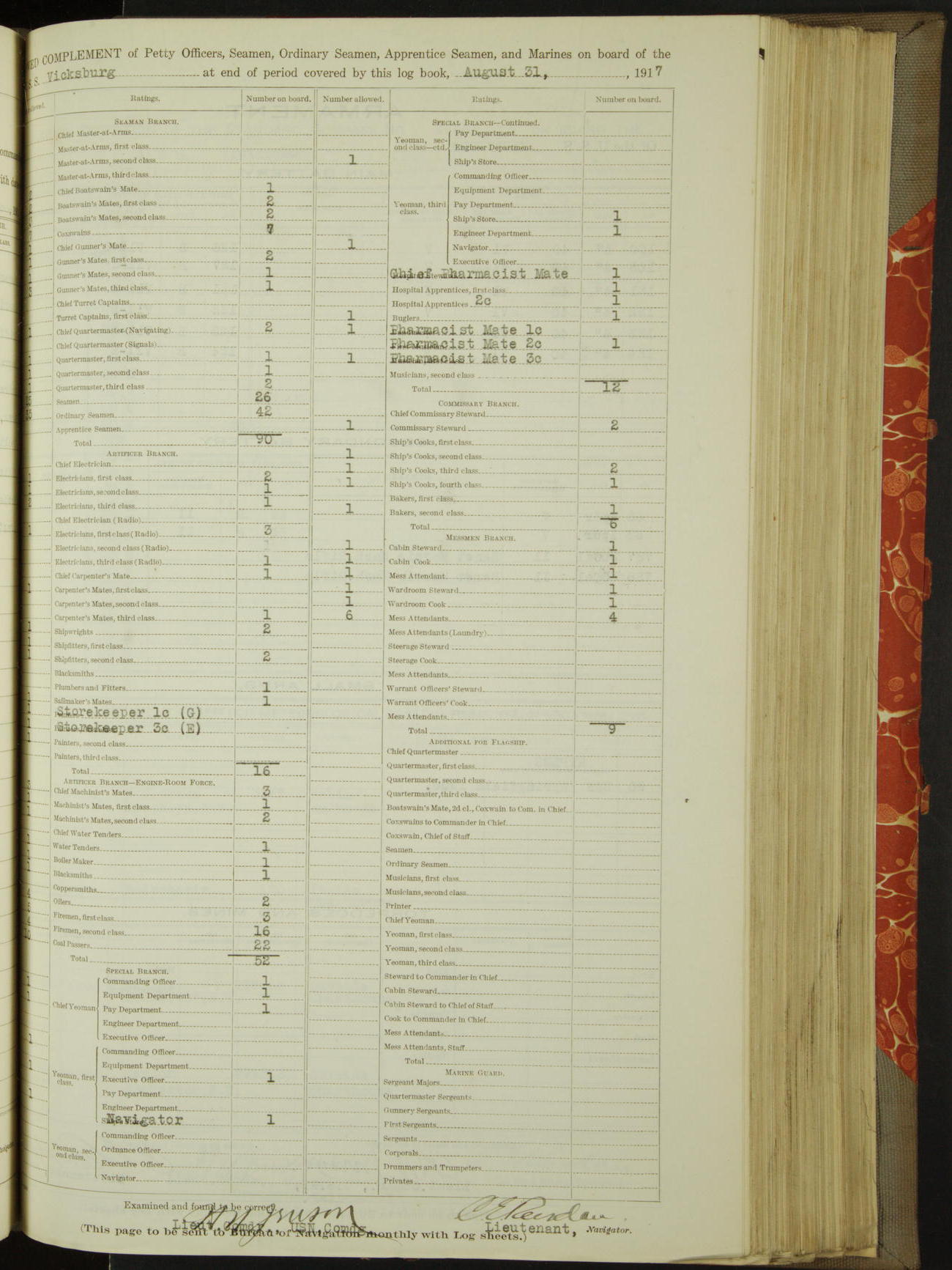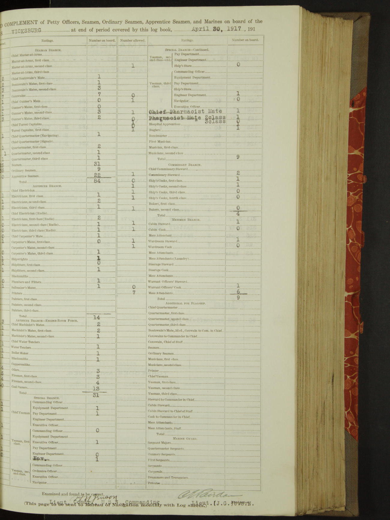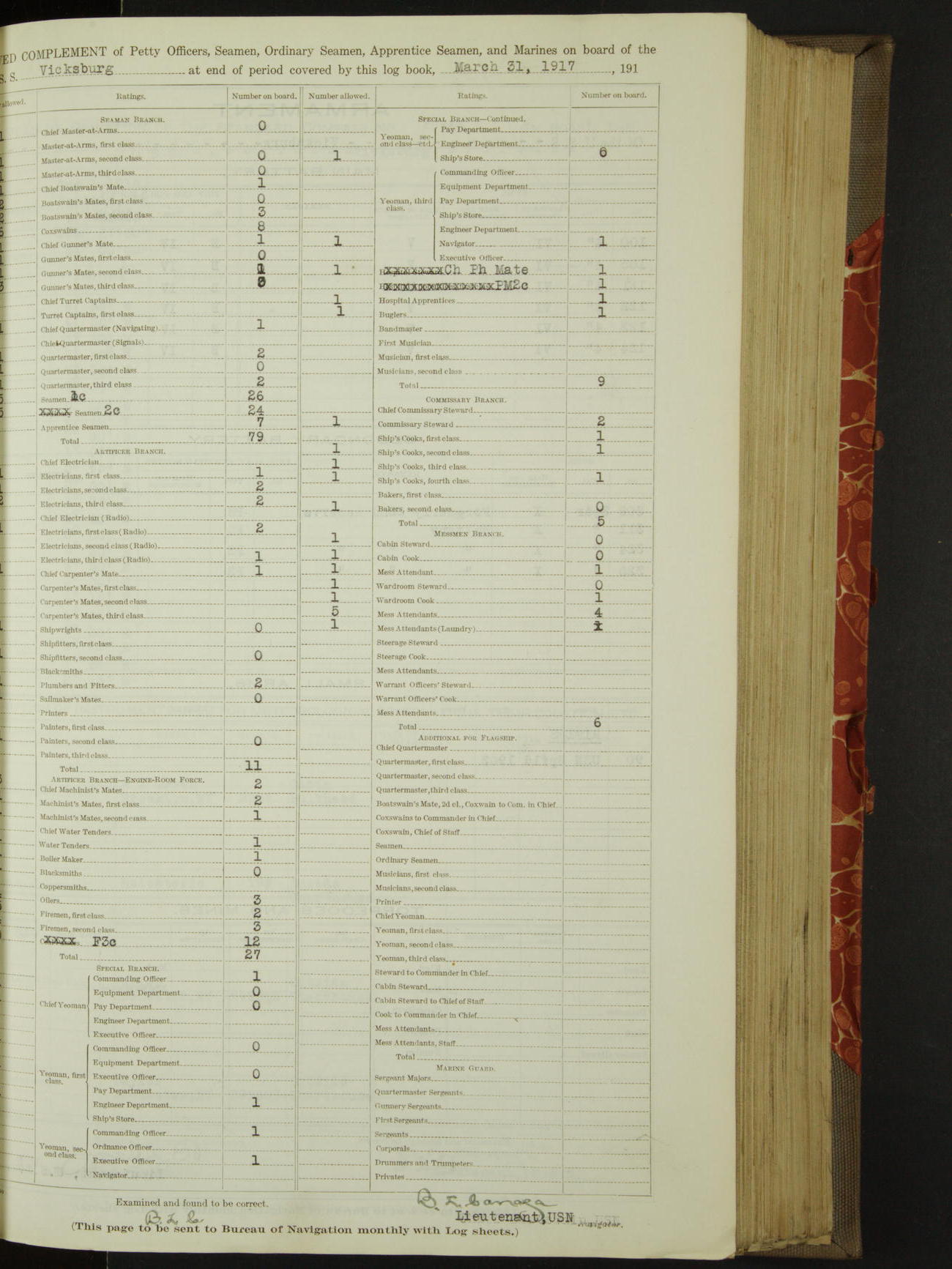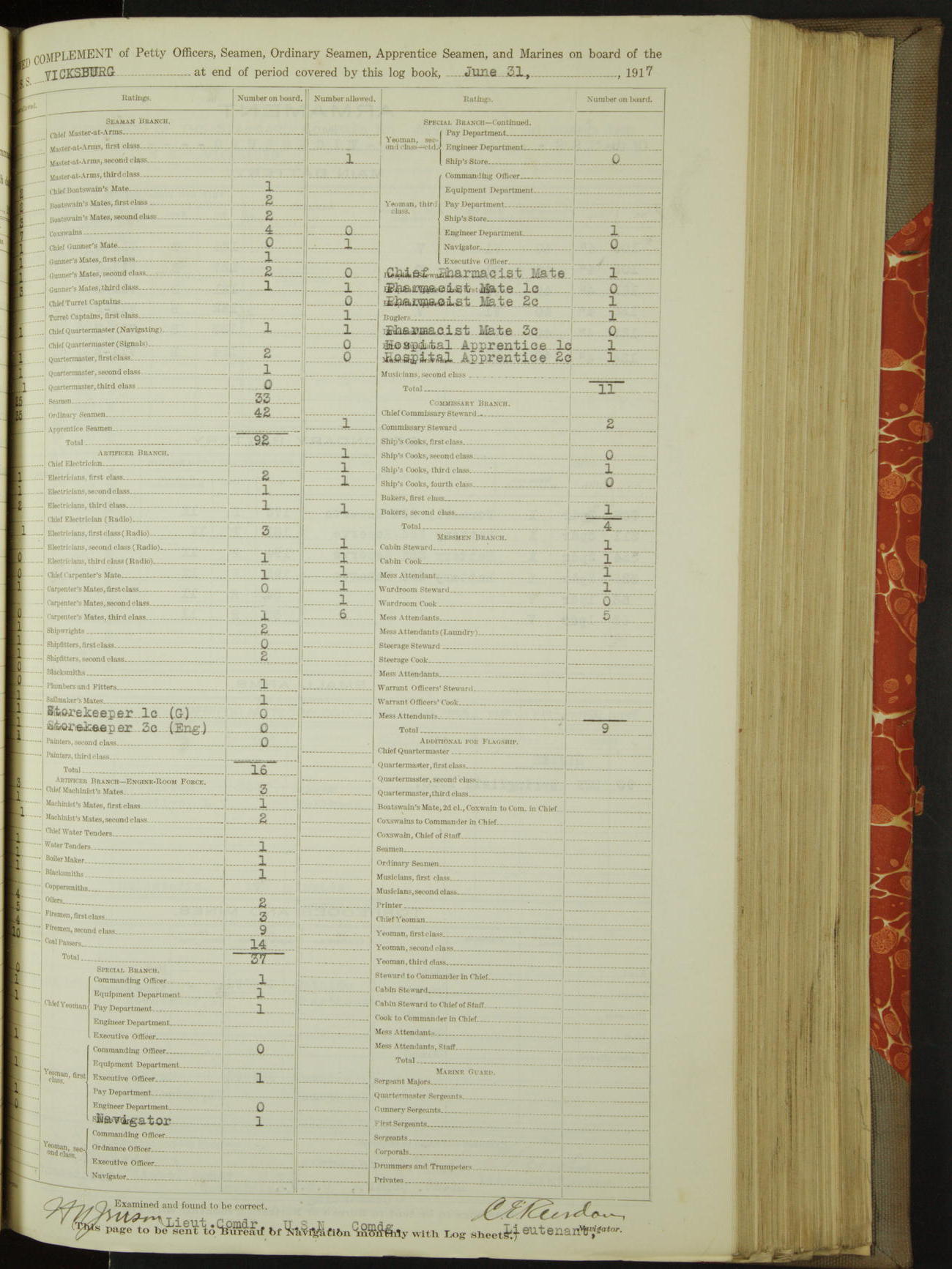Complement of Petty Officers, Seamen, Ordinary Seamen, Apprentice Seamen, and Marines on board of the USS "Vicksburg", 3rd rate, at the end of period covered by this log book, January 31st, 1917