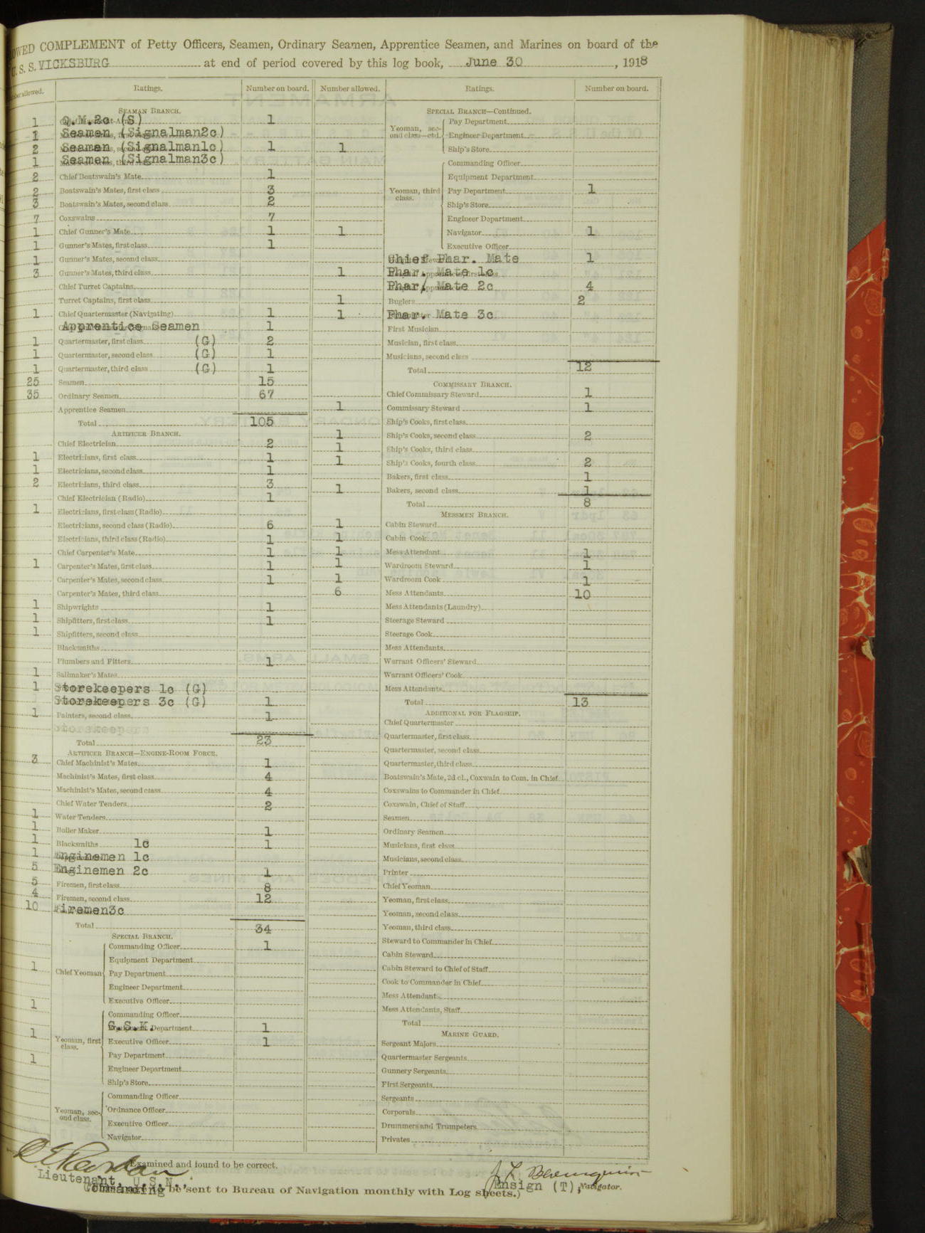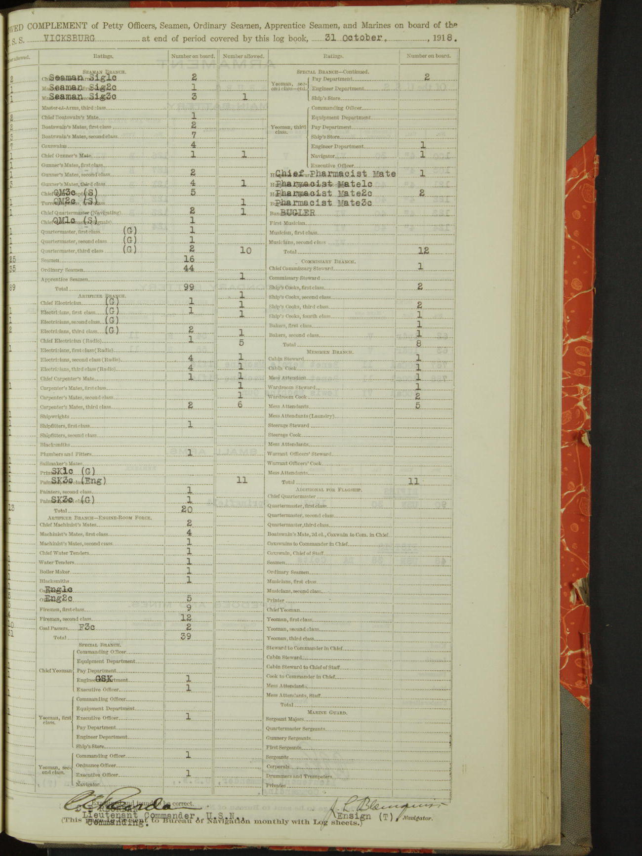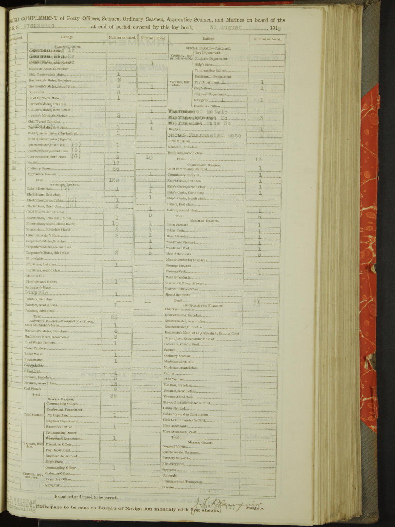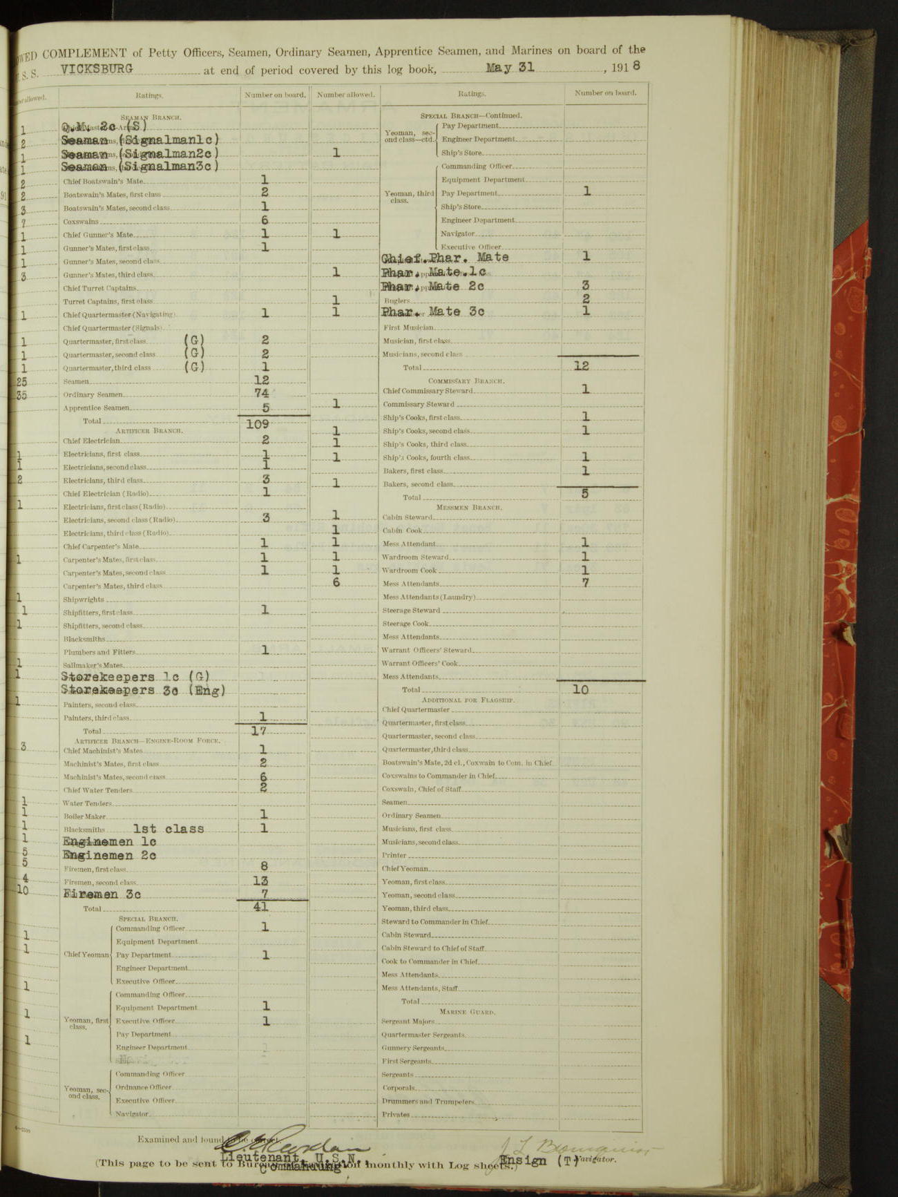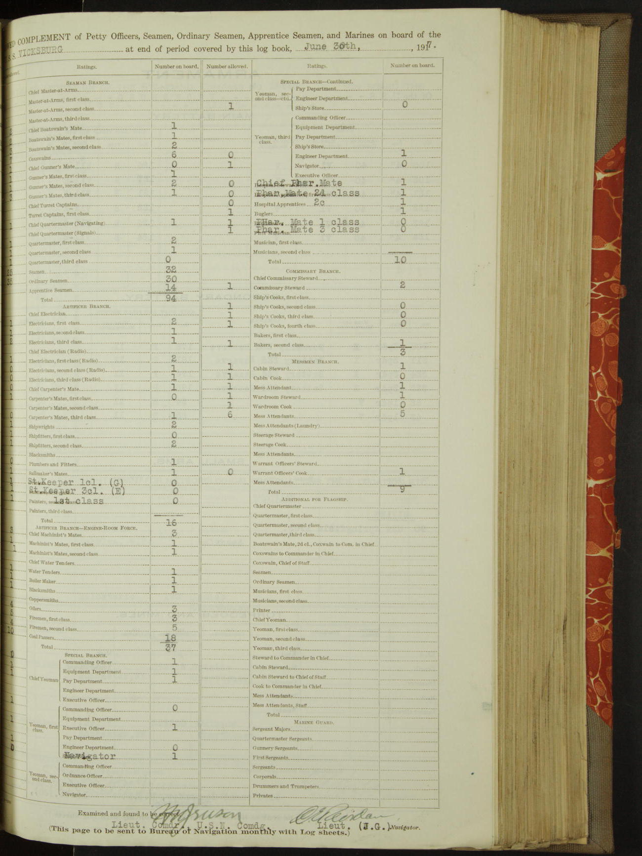 Complement of Petty Officers, Seamen, Ordinary Seamen, Apprentice Seamen, and Marines on board of the USS "Vicksburg", 3rd rate, at the end of period covered by this log book, January 31st, 1917