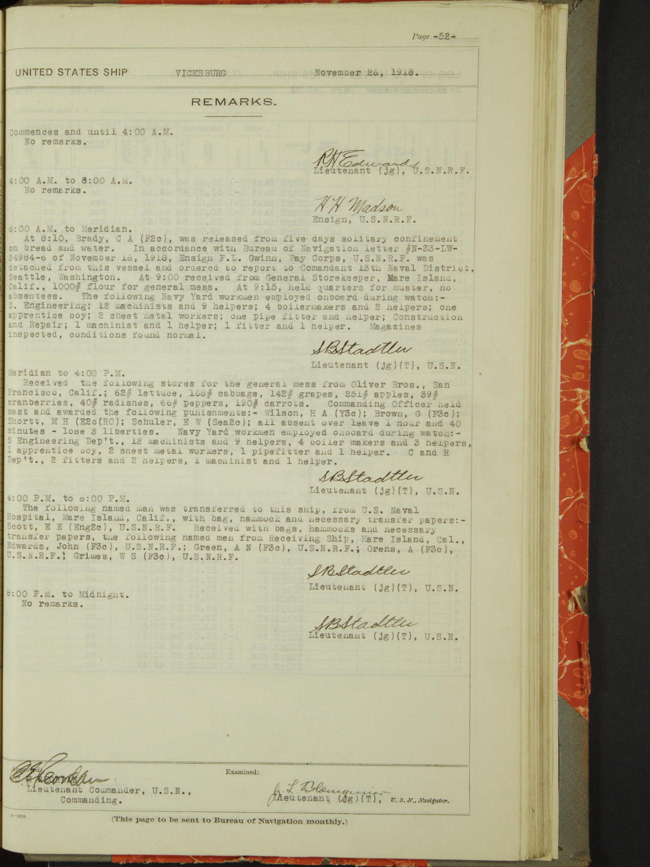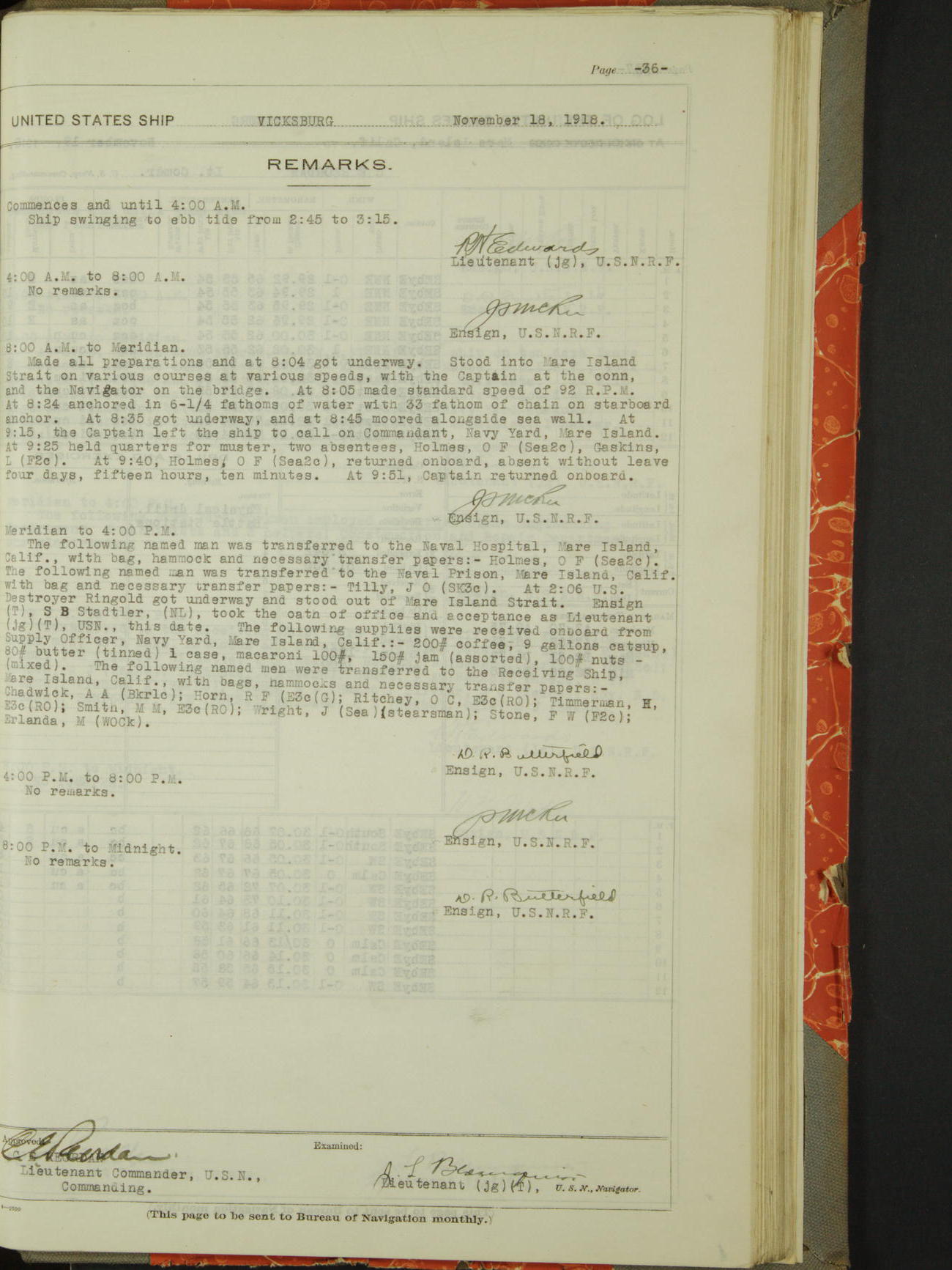 Von Hatten RH (Eleclc (G) - At 8.30 received on board from the Receiving Ship at San Francisco
