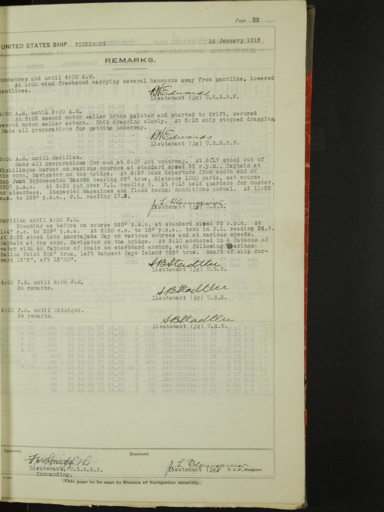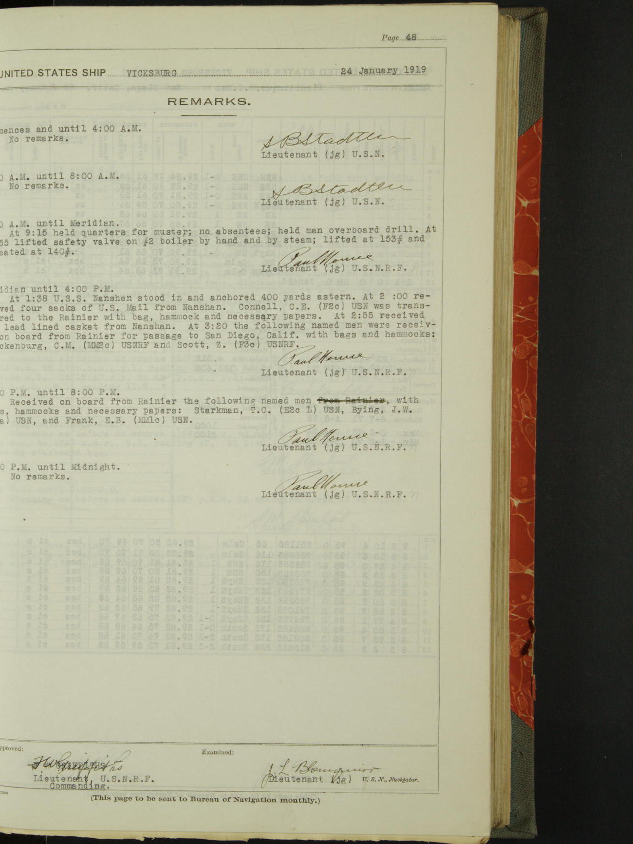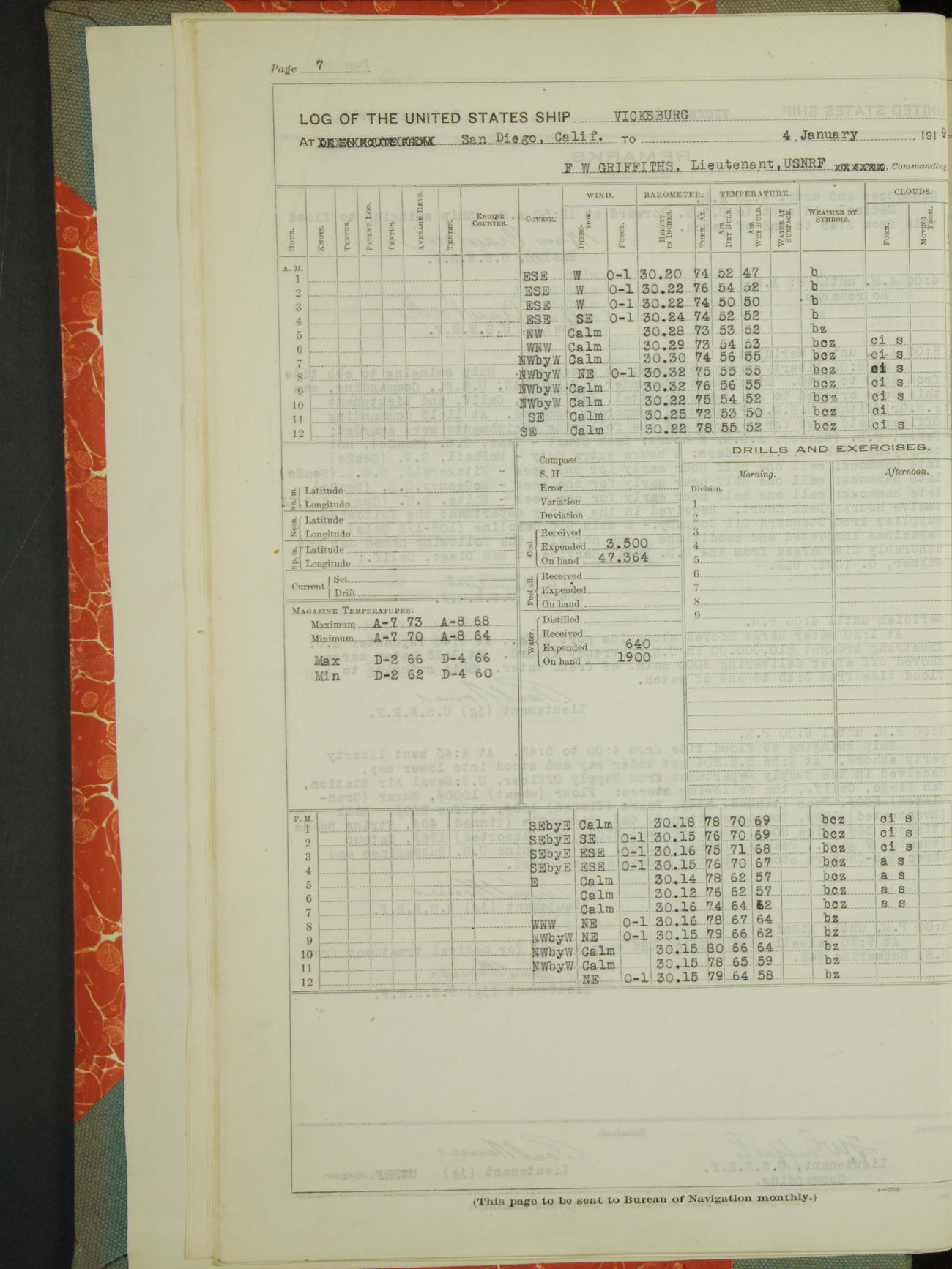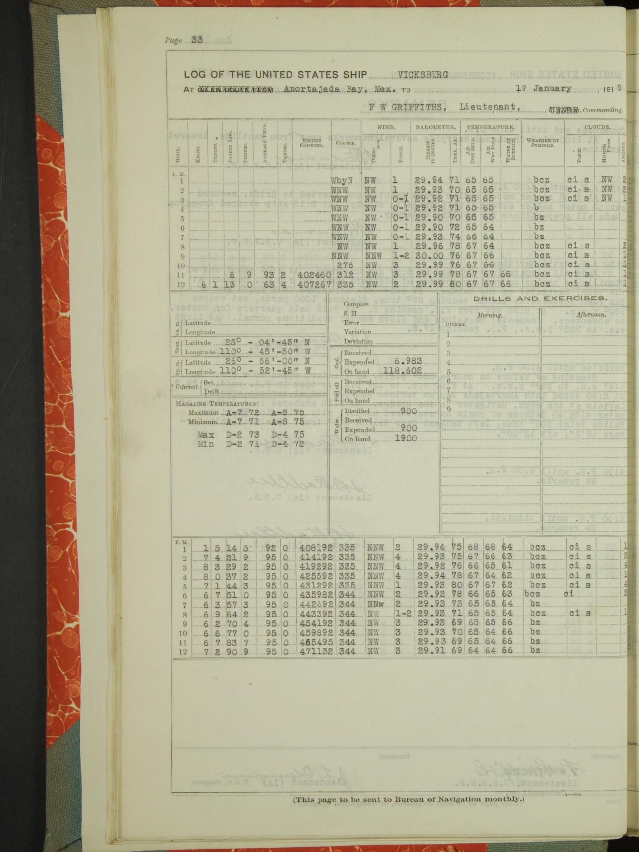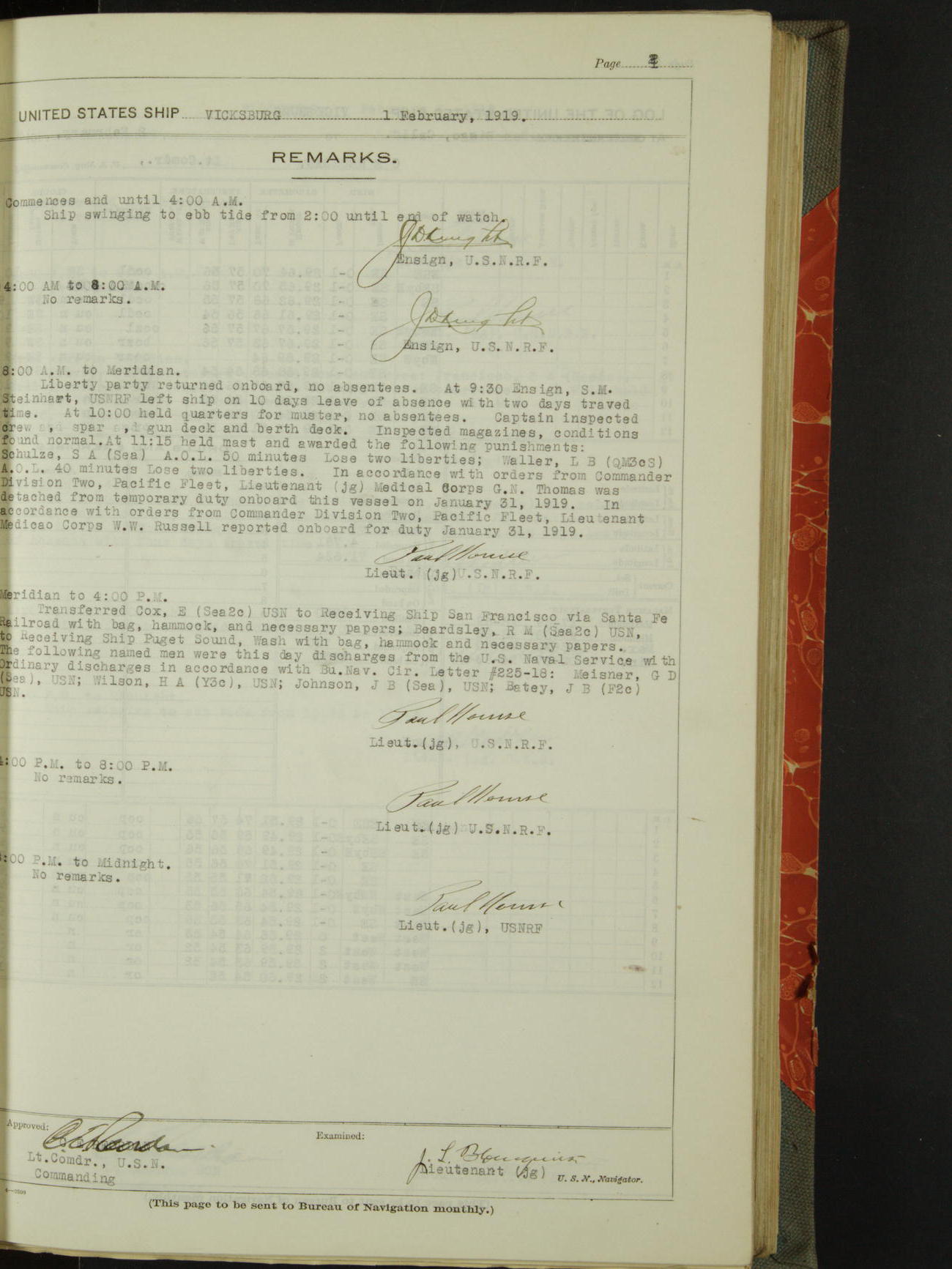 Log BoLog book of the USS "Vicksburg", 3rd rate, commanded by Charles E Reordan, Lieutenet Commander, US Navy, Second Division, Pacific Fleet, Commencing January 1st, 1919, at 1.0am, and ending January 31st, 1919, at Midnight