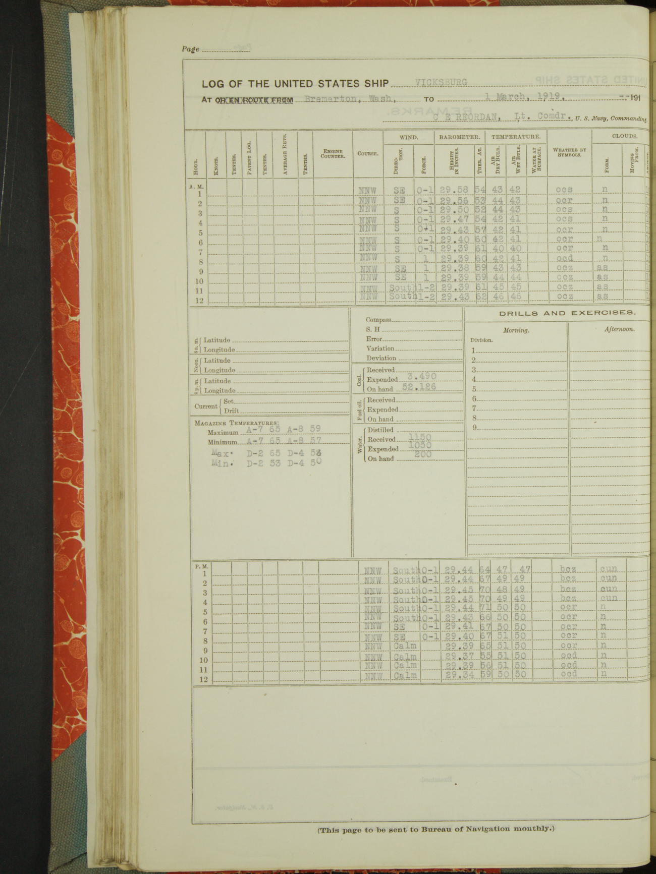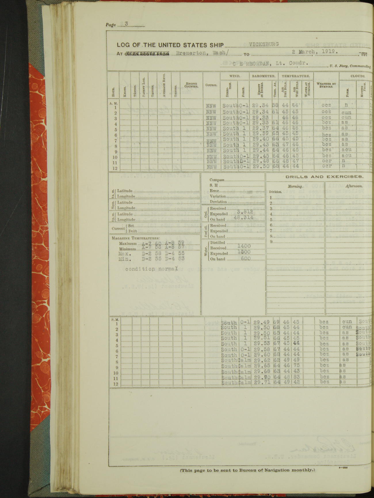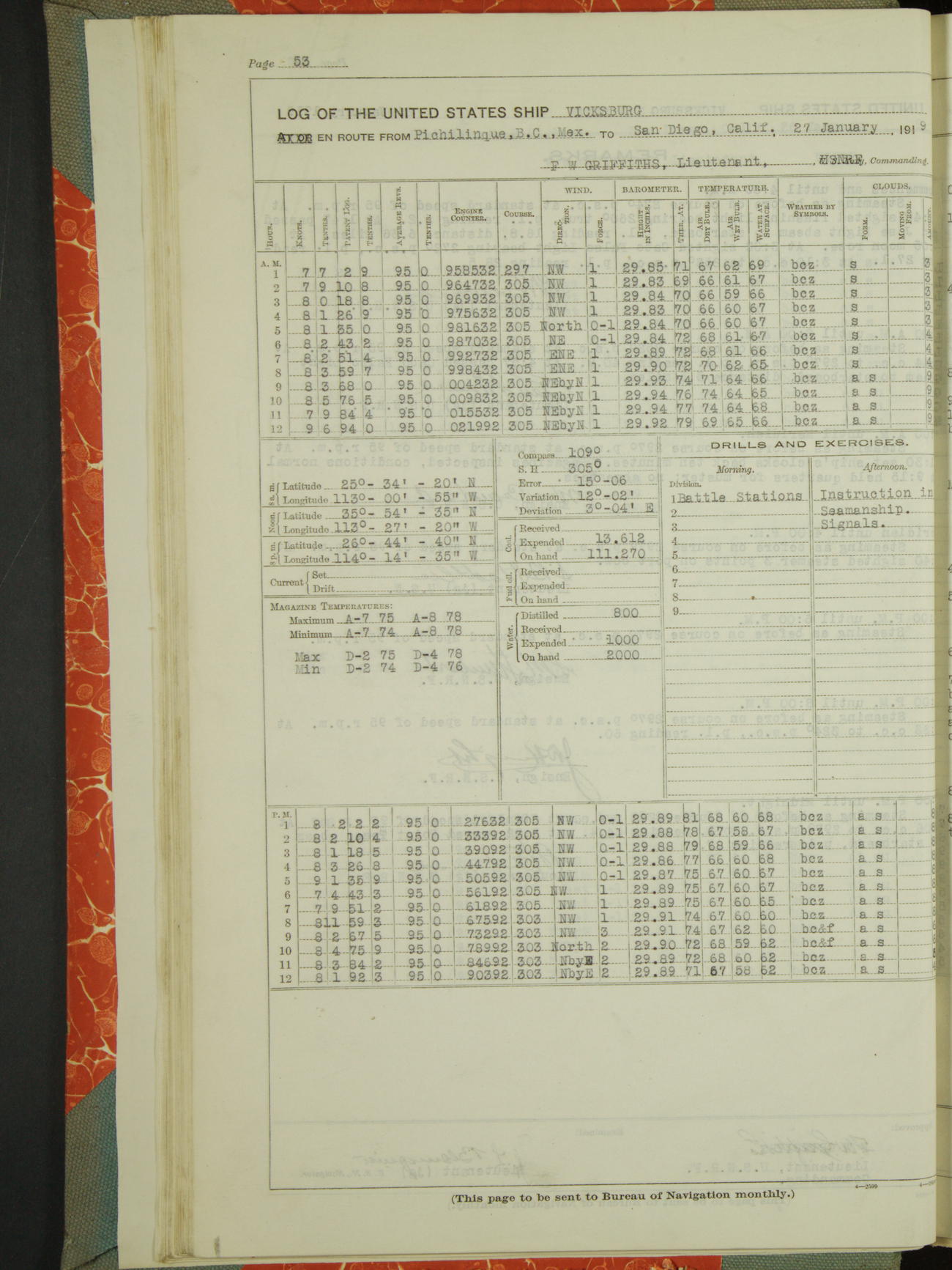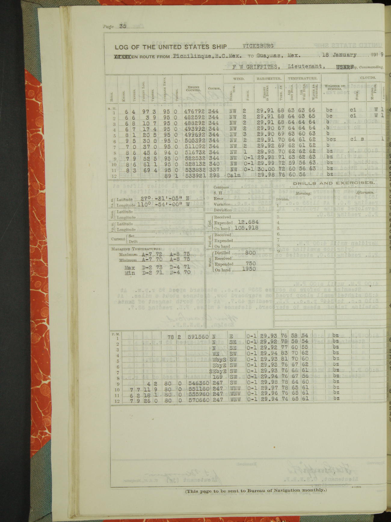 Log BoLog book of the USS "Vicksburg", 3rd rate, commanded by Charles E Reordan, Lieutenet Commander, US Navy, Second Division, Pacific Fleet, Commencing January 1st, 1919, at 1.0am, and ending January 31st, 1919, at Midnight