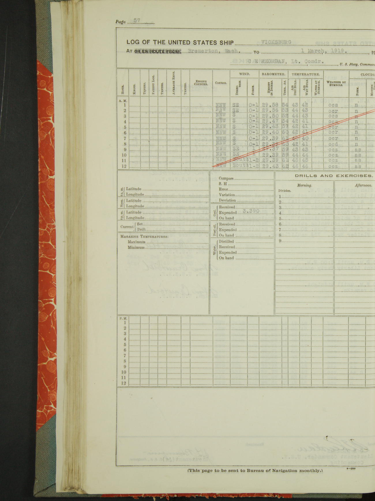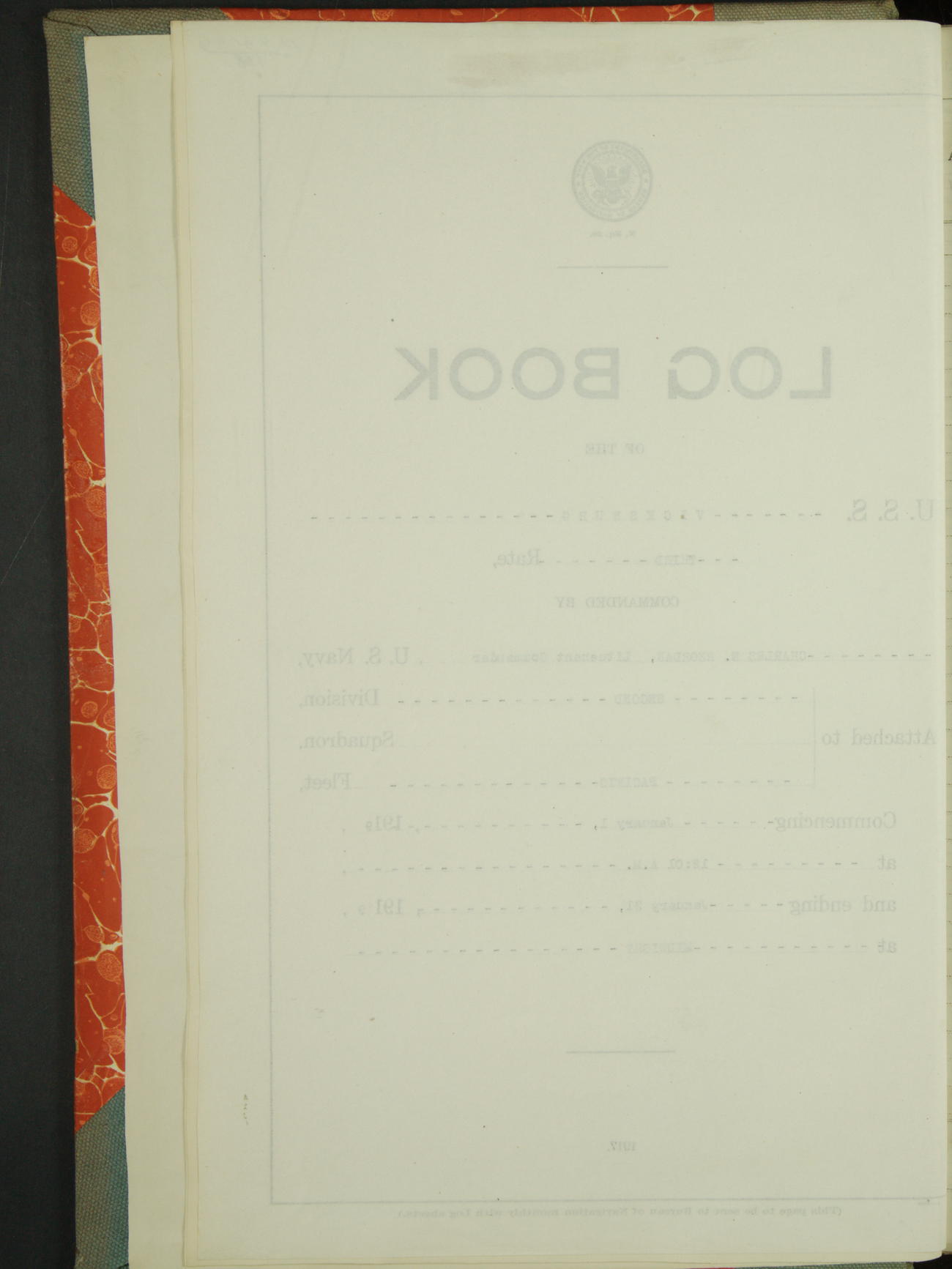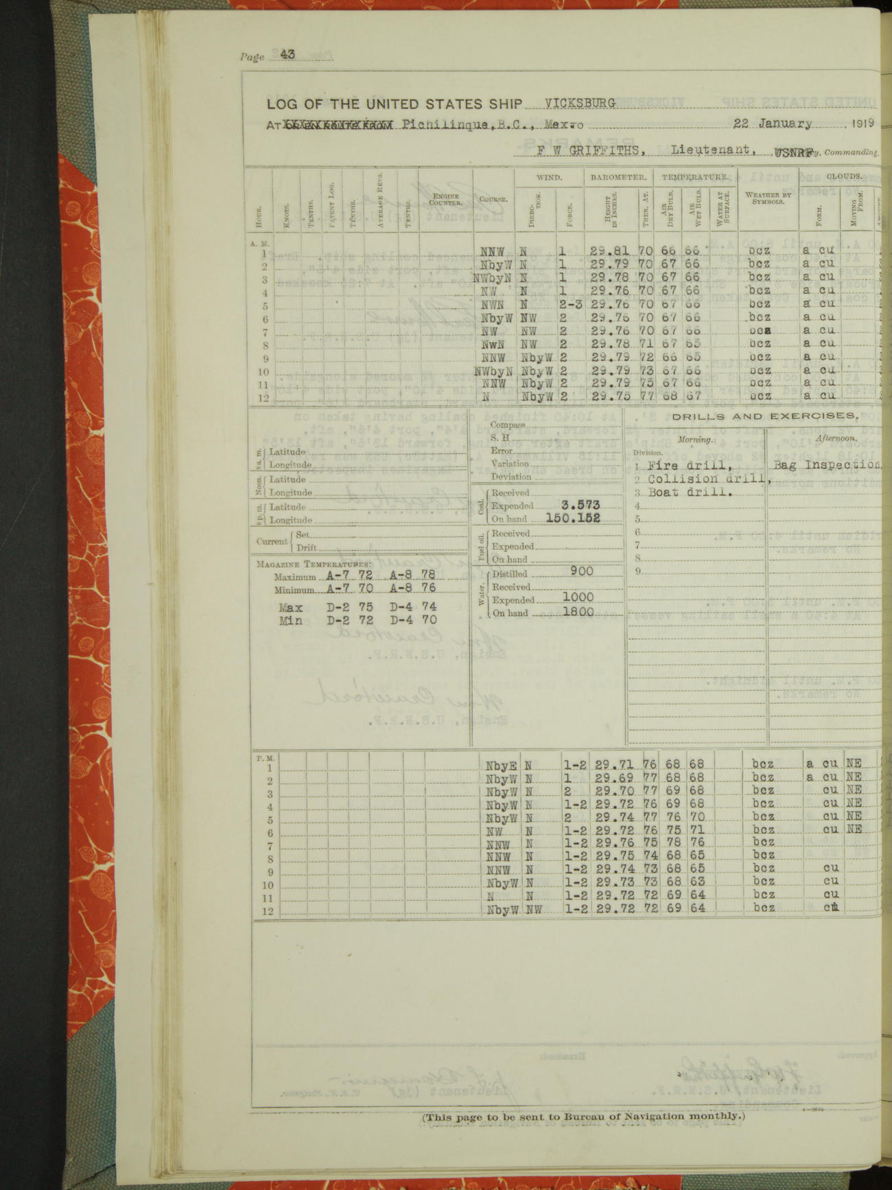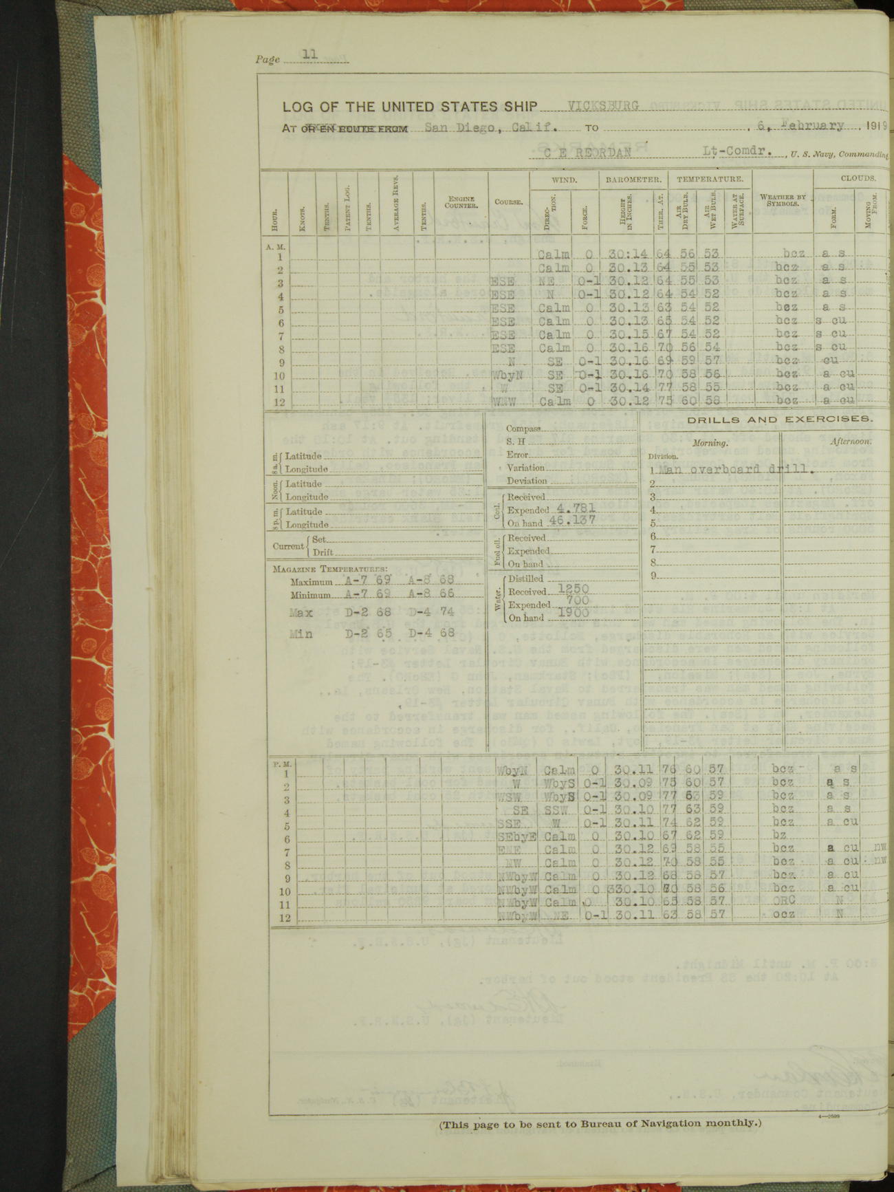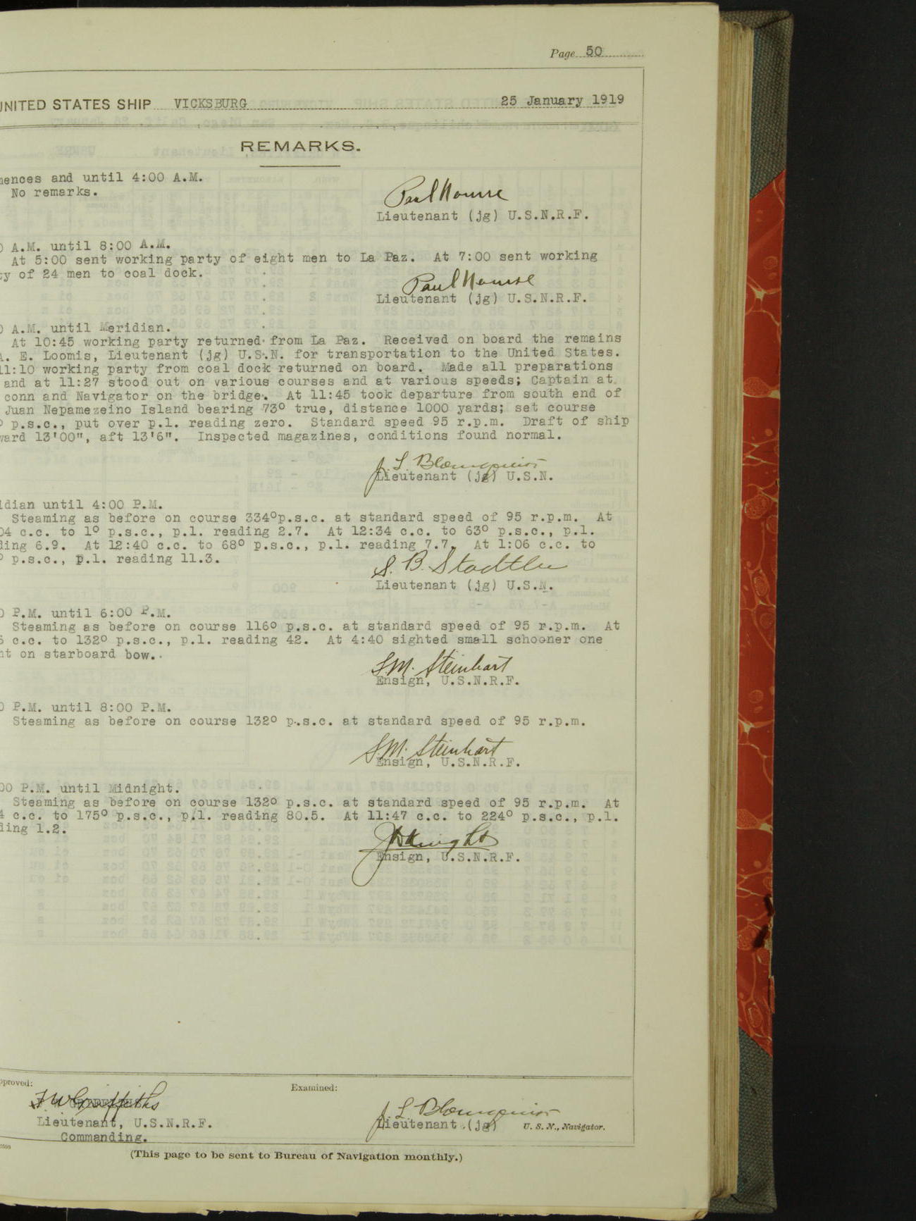 Log BoLog book of the USS "Vicksburg", 3rd rate, commanded by Charles E Reordan, Lieutenet Commander, US Navy, Second Division, Pacific Fleet, Commencing January 1st, 1919, at 1.0am, and ending January 31st, 1919, at Midnight