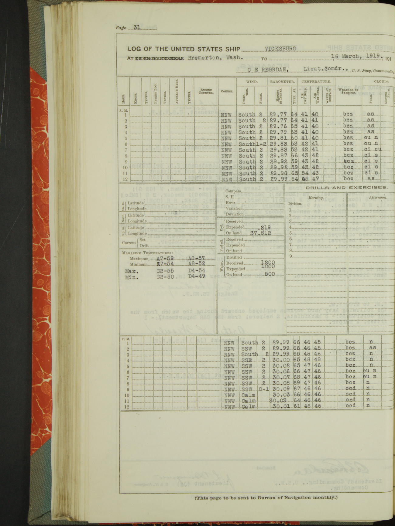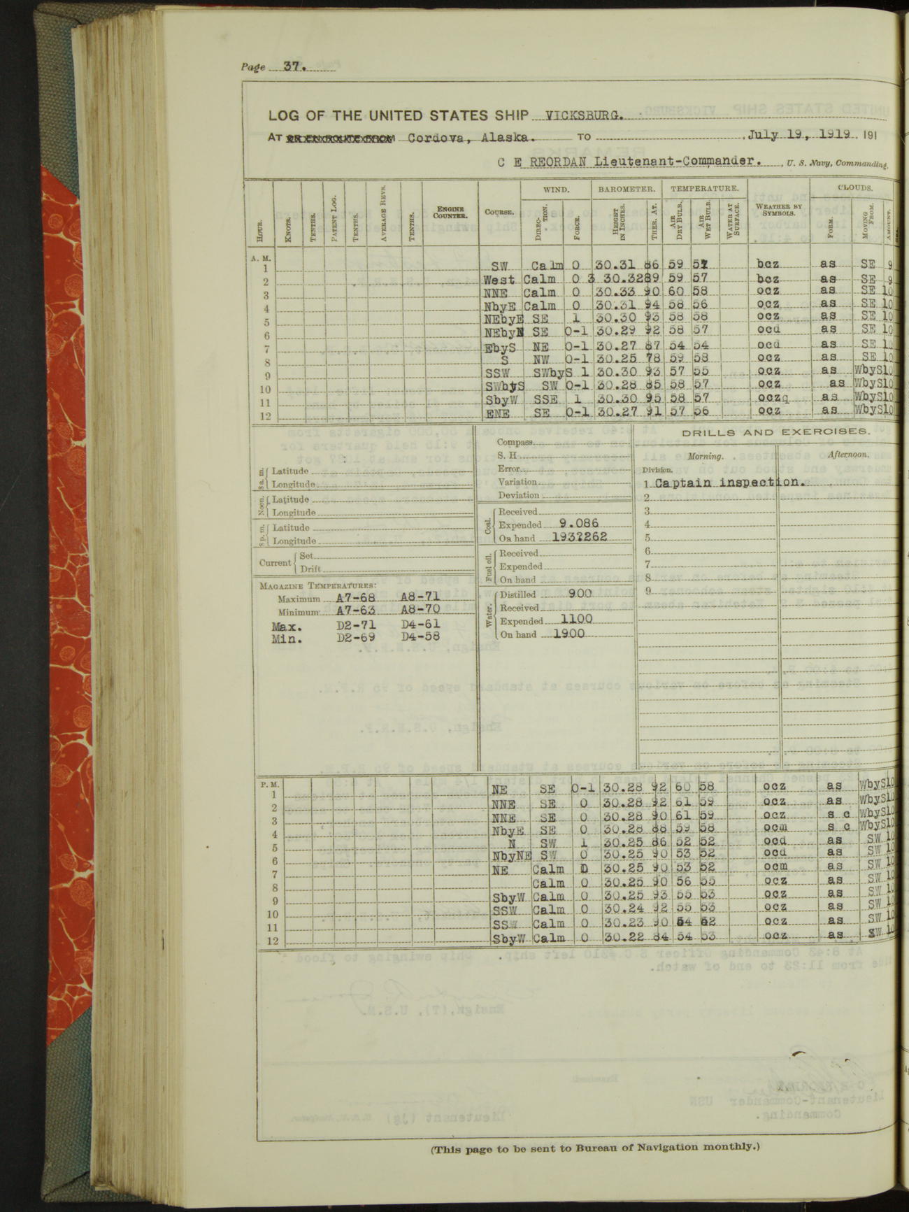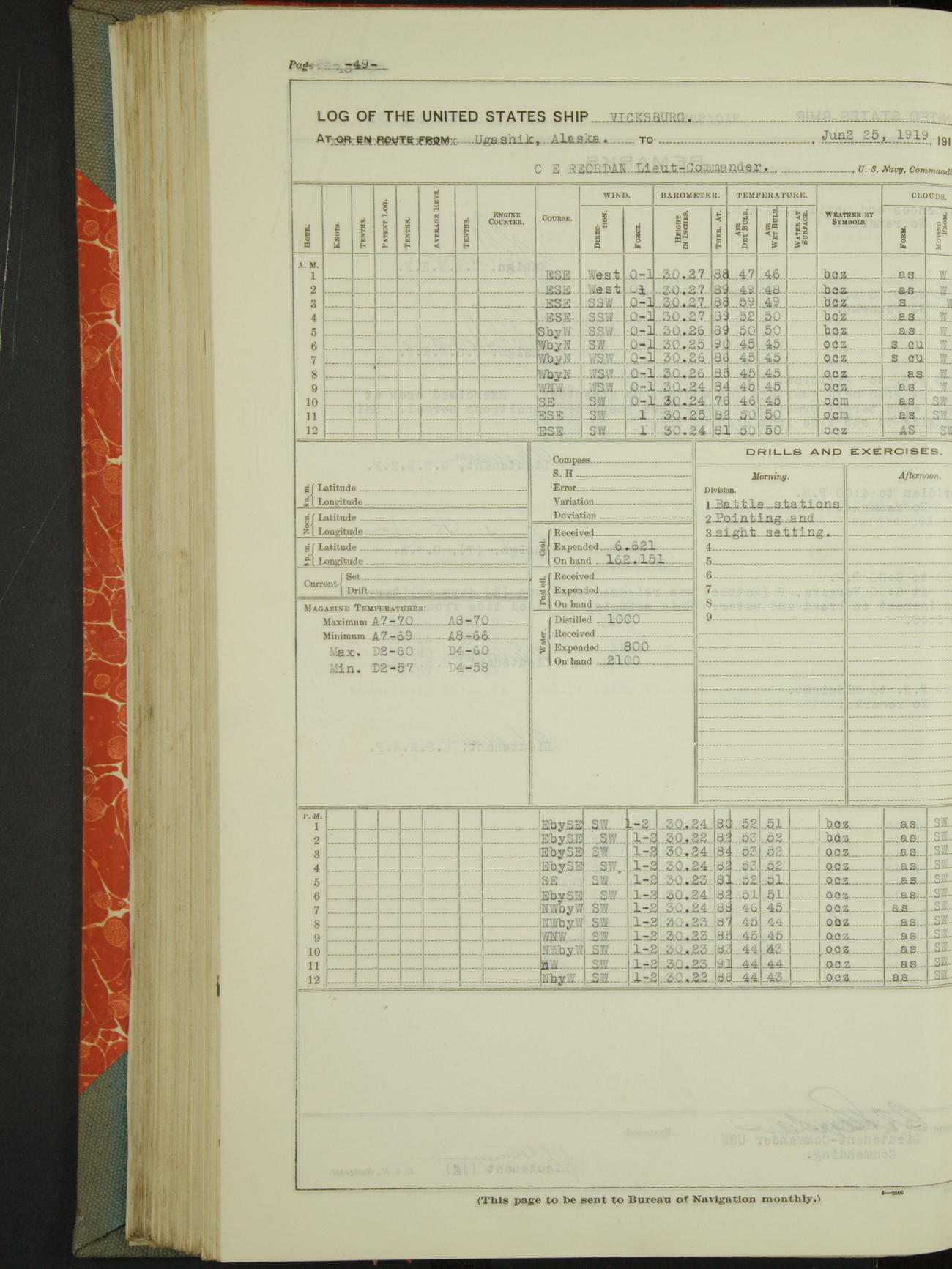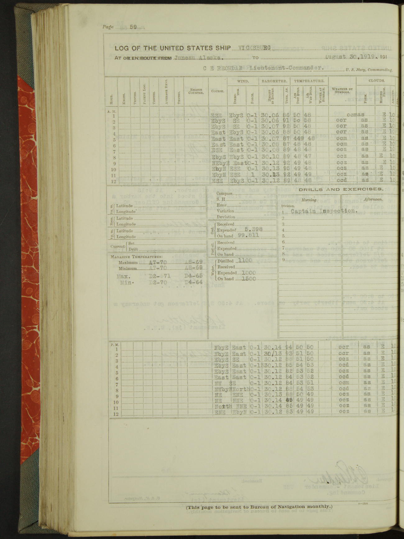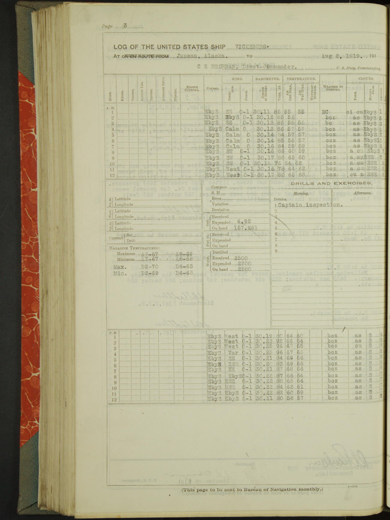Log BoLog book of the USS "Vicksburg", 3rd rate, commanded by Charles E Reordan, Lieutenet Commander, US Navy, Second Division, Pacific Fleet, Commencing January 1st, 1919, at 1.0am, and ending January 31st, 1919, at Midnight