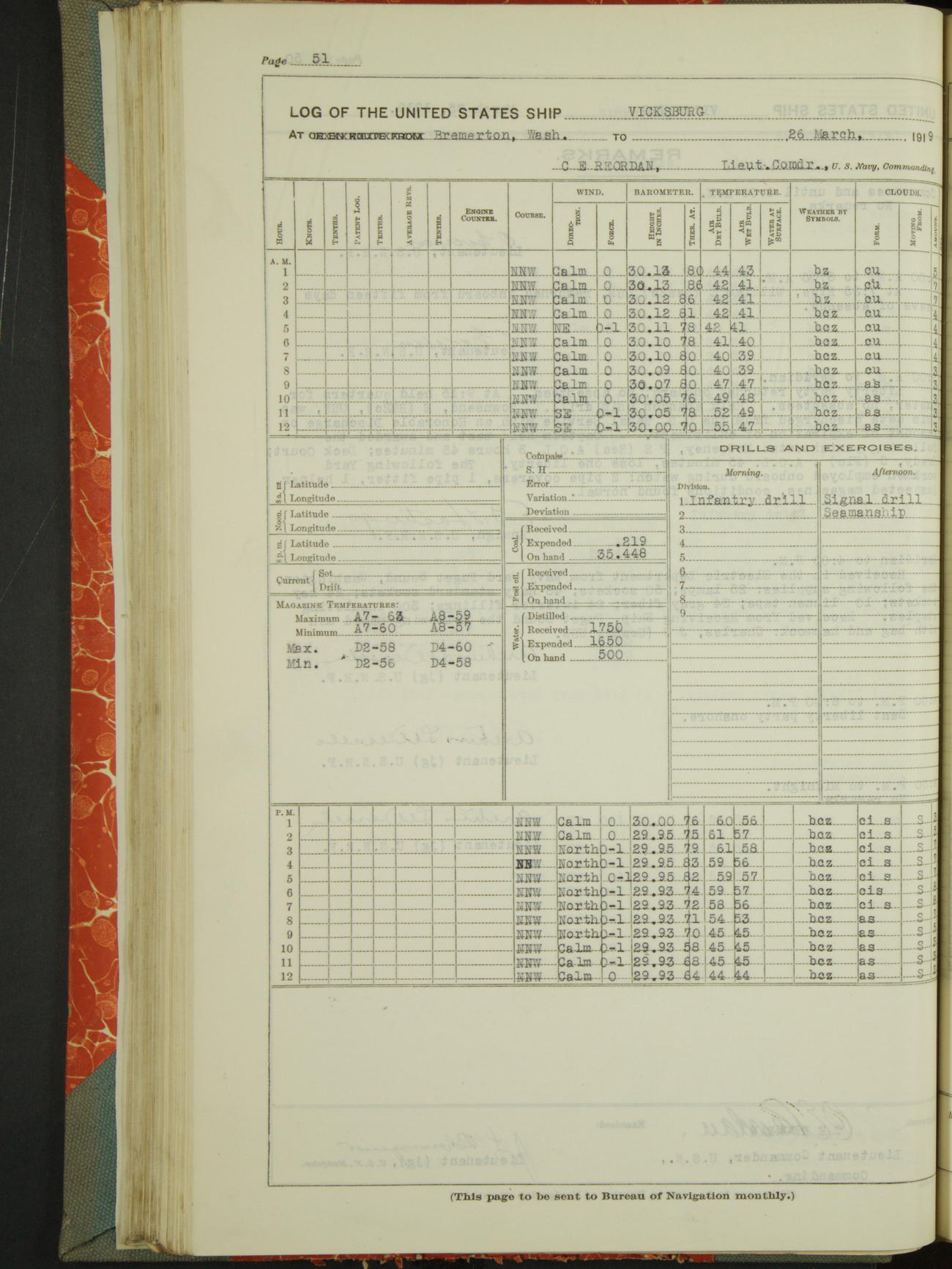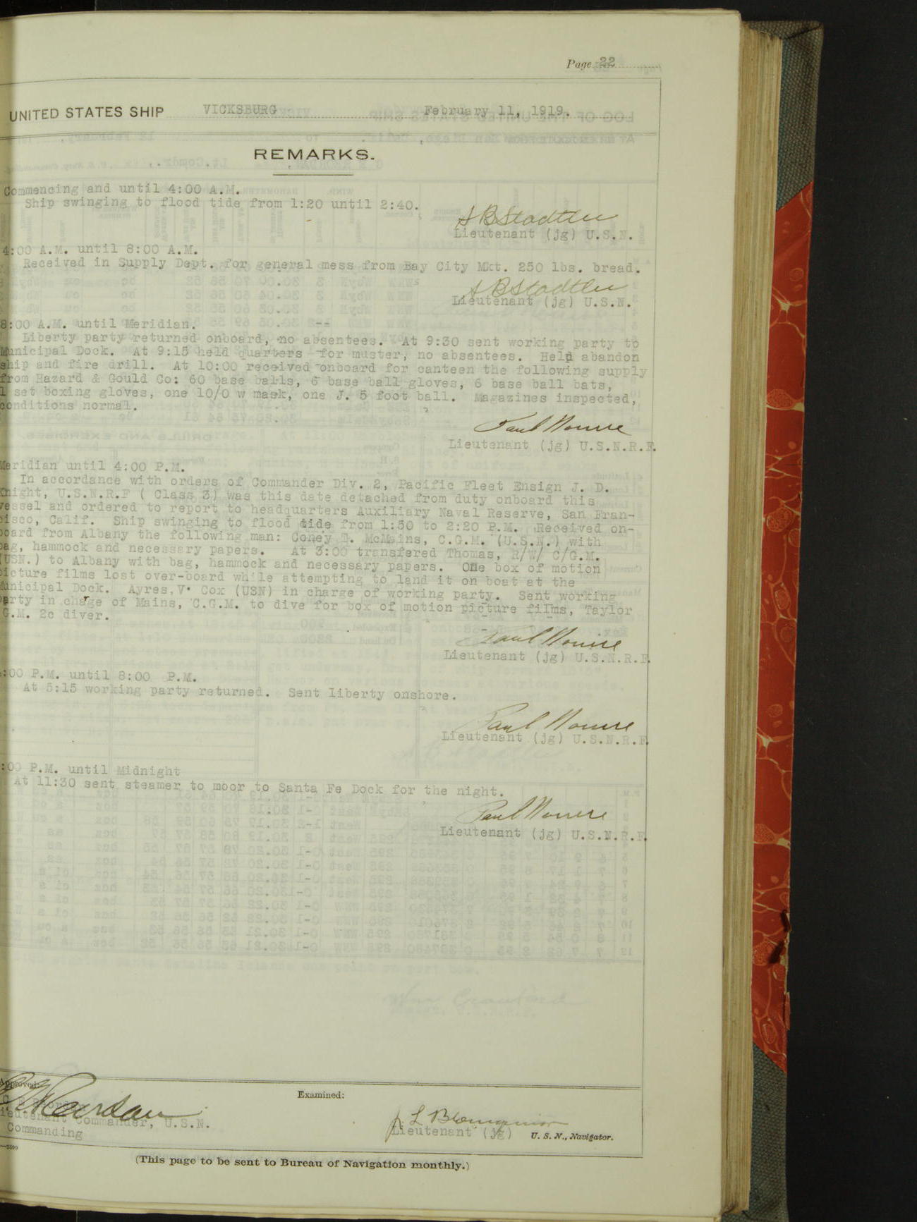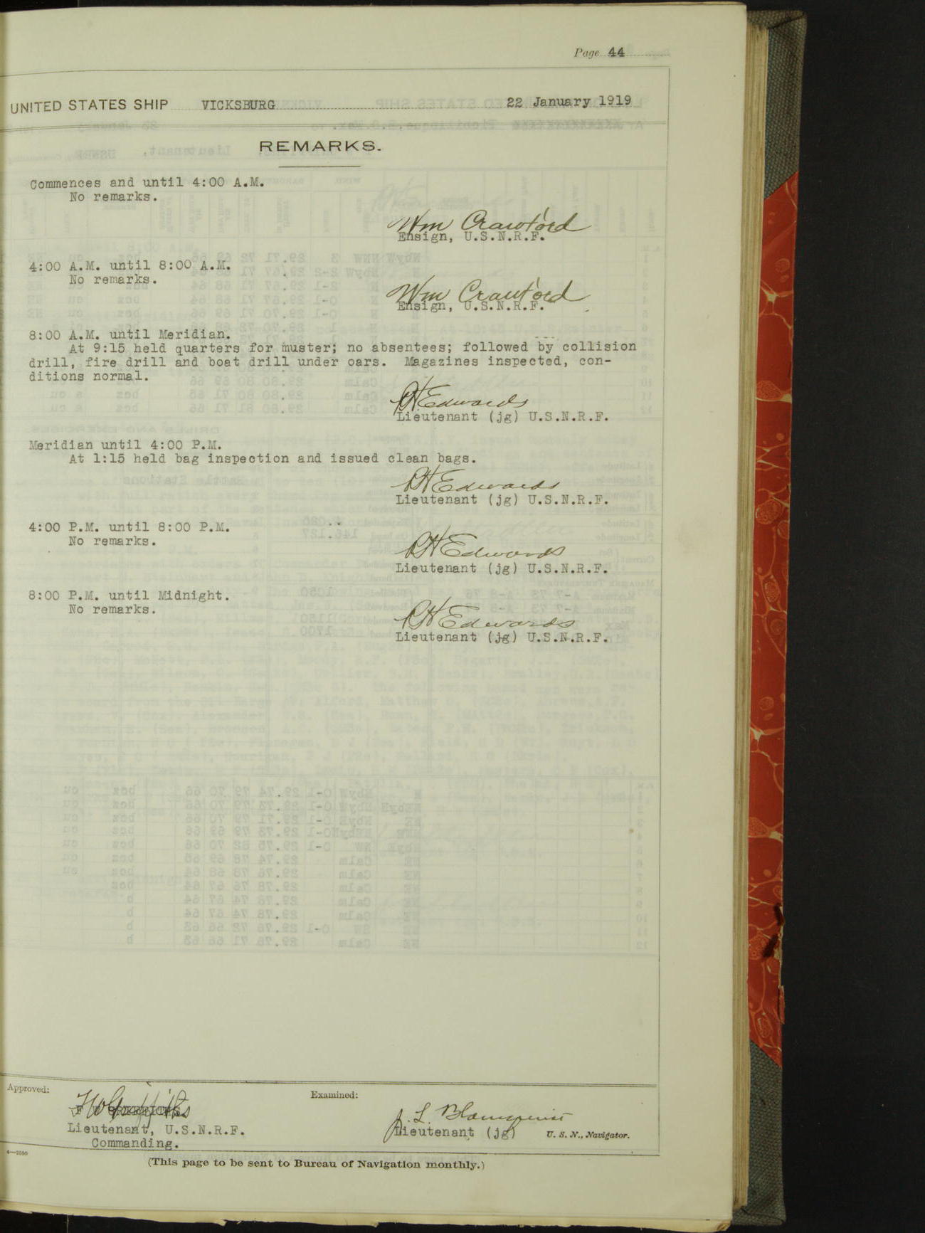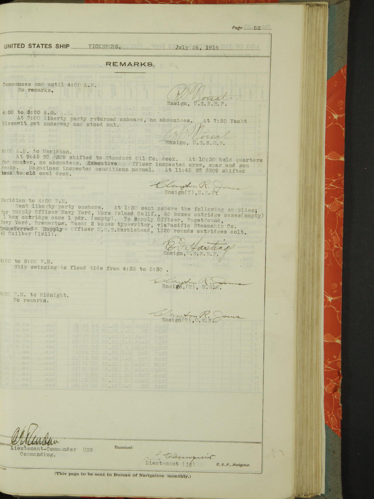 Log BoLog book of the USS "Vicksburg", 3rd rate, commanded by Charles E Reordan, Lieutenet Commander, US Navy, Second Division, Pacific Fleet, Commencing January 1st, 1919, at 1.0am, and ending January 31st, 1919, at Midnight