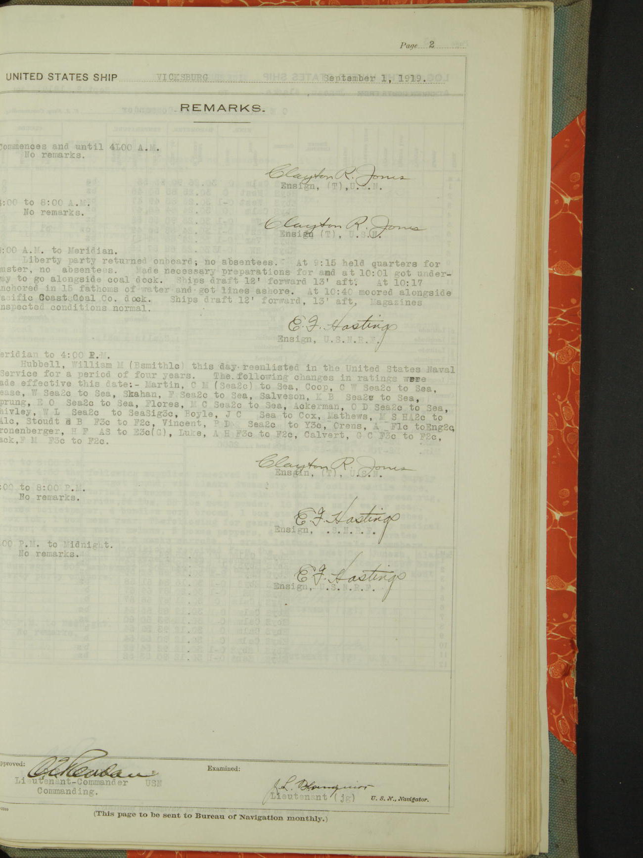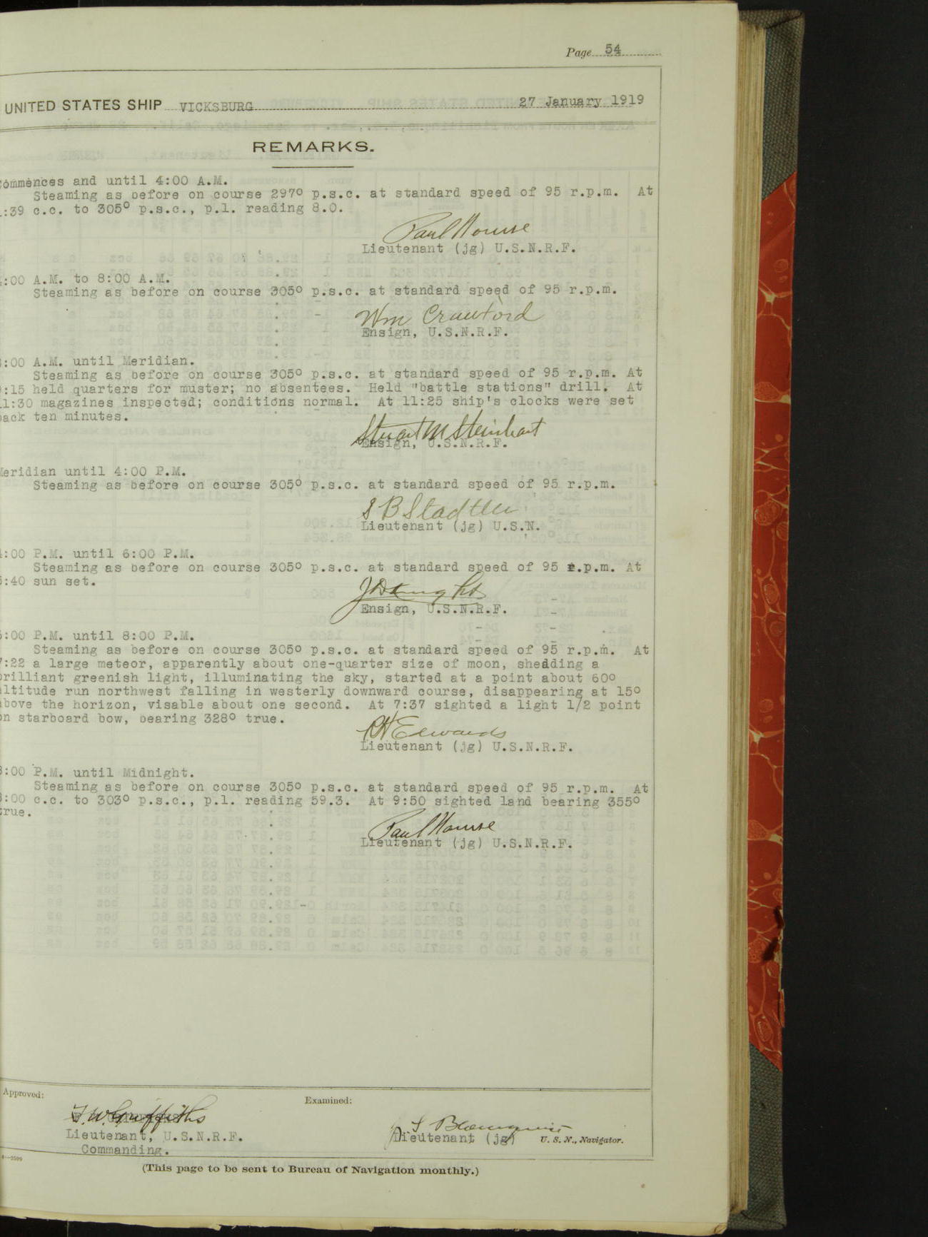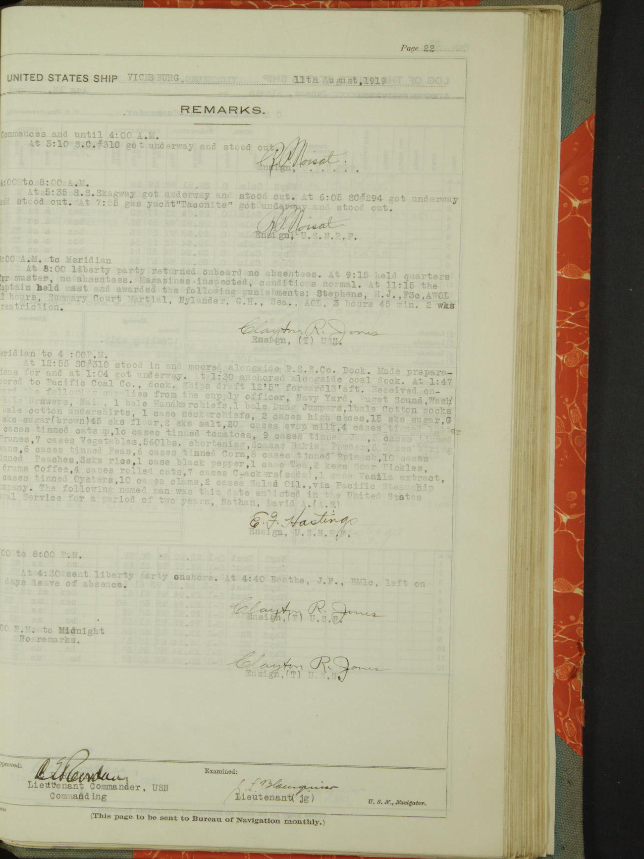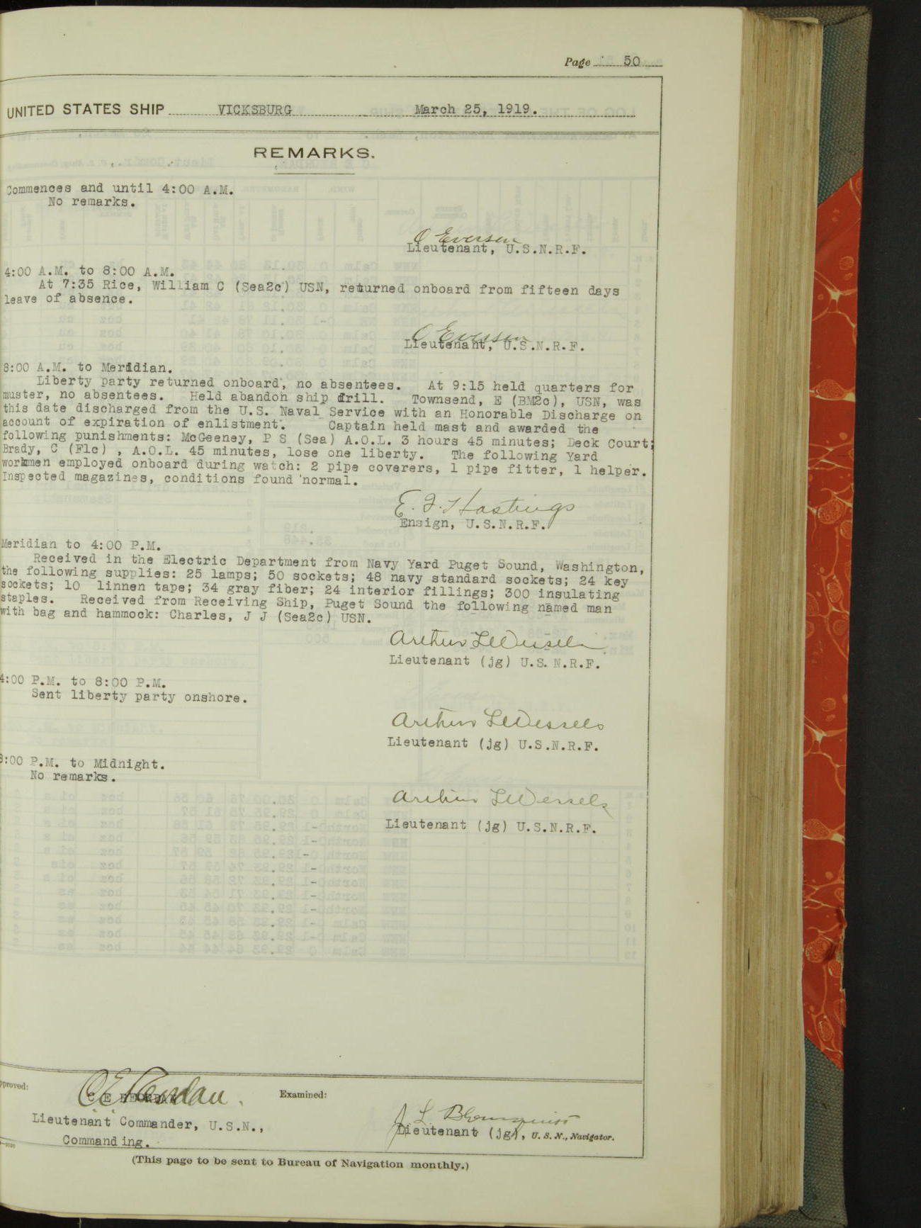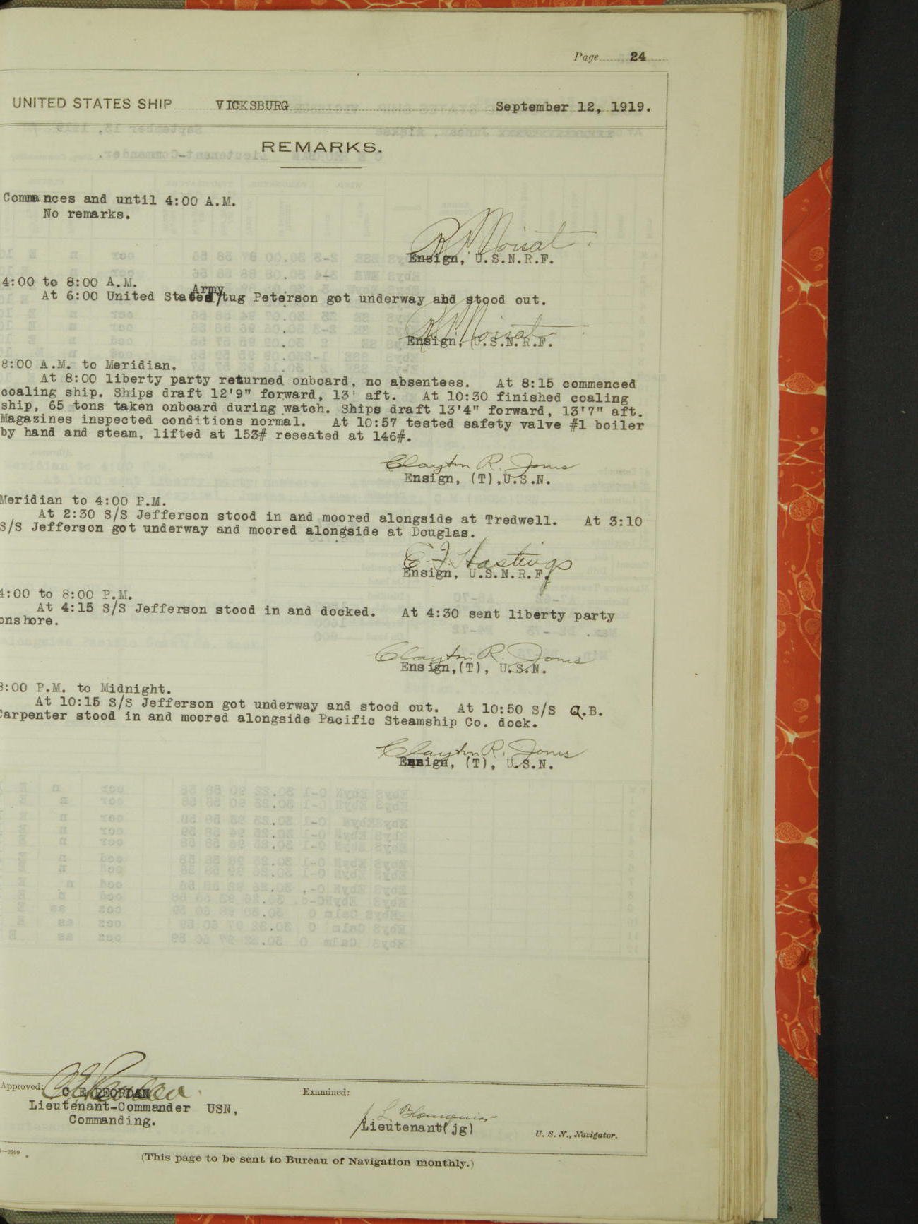 Log BoLog book of the USS "Vicksburg", 3rd rate, commanded by Charles E Reordan, Lieutenet Commander, US Navy, Second Division, Pacific Fleet, Commencing January 1st, 1919, at 1.0am, and ending January 31st, 1919, at Midnight