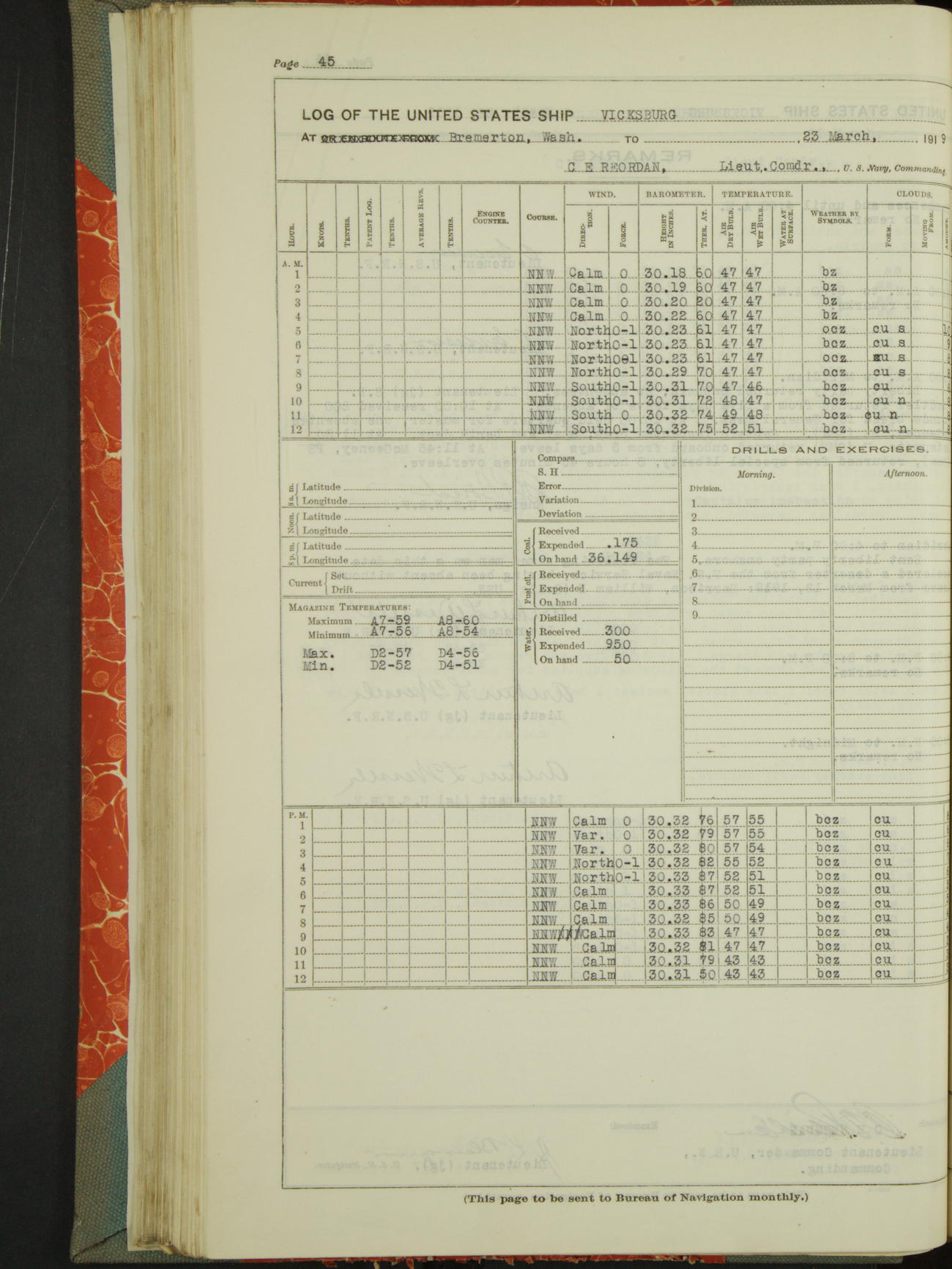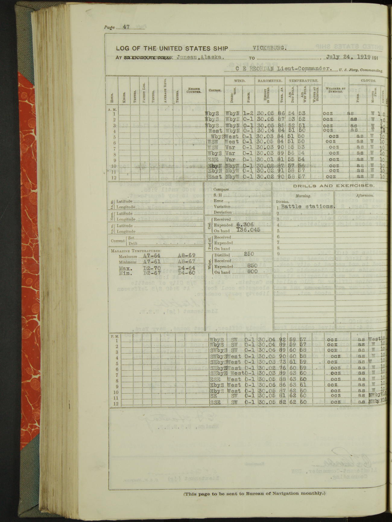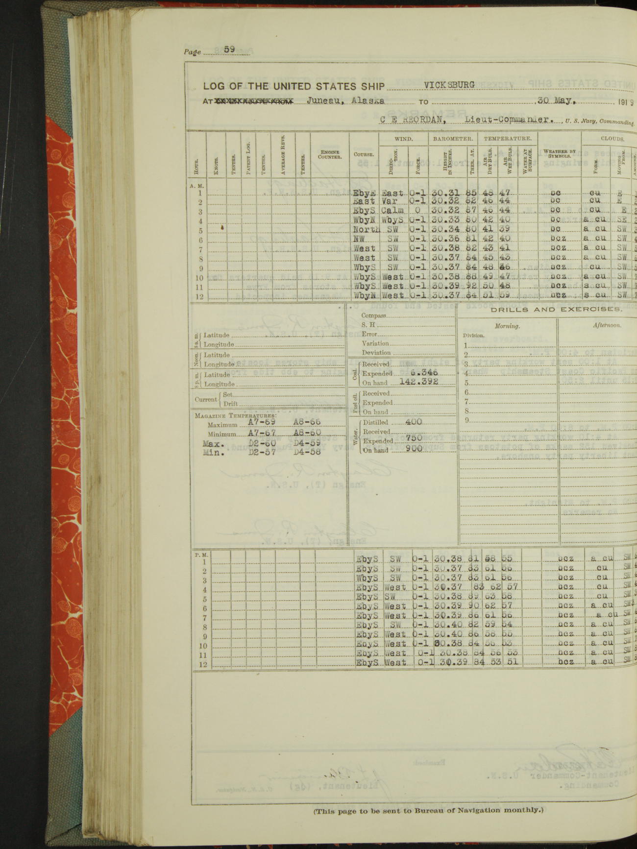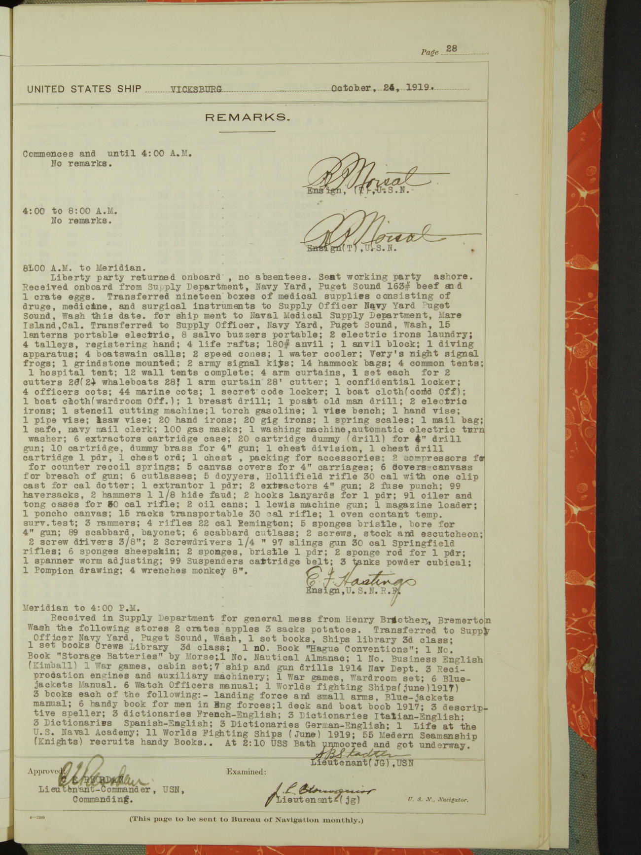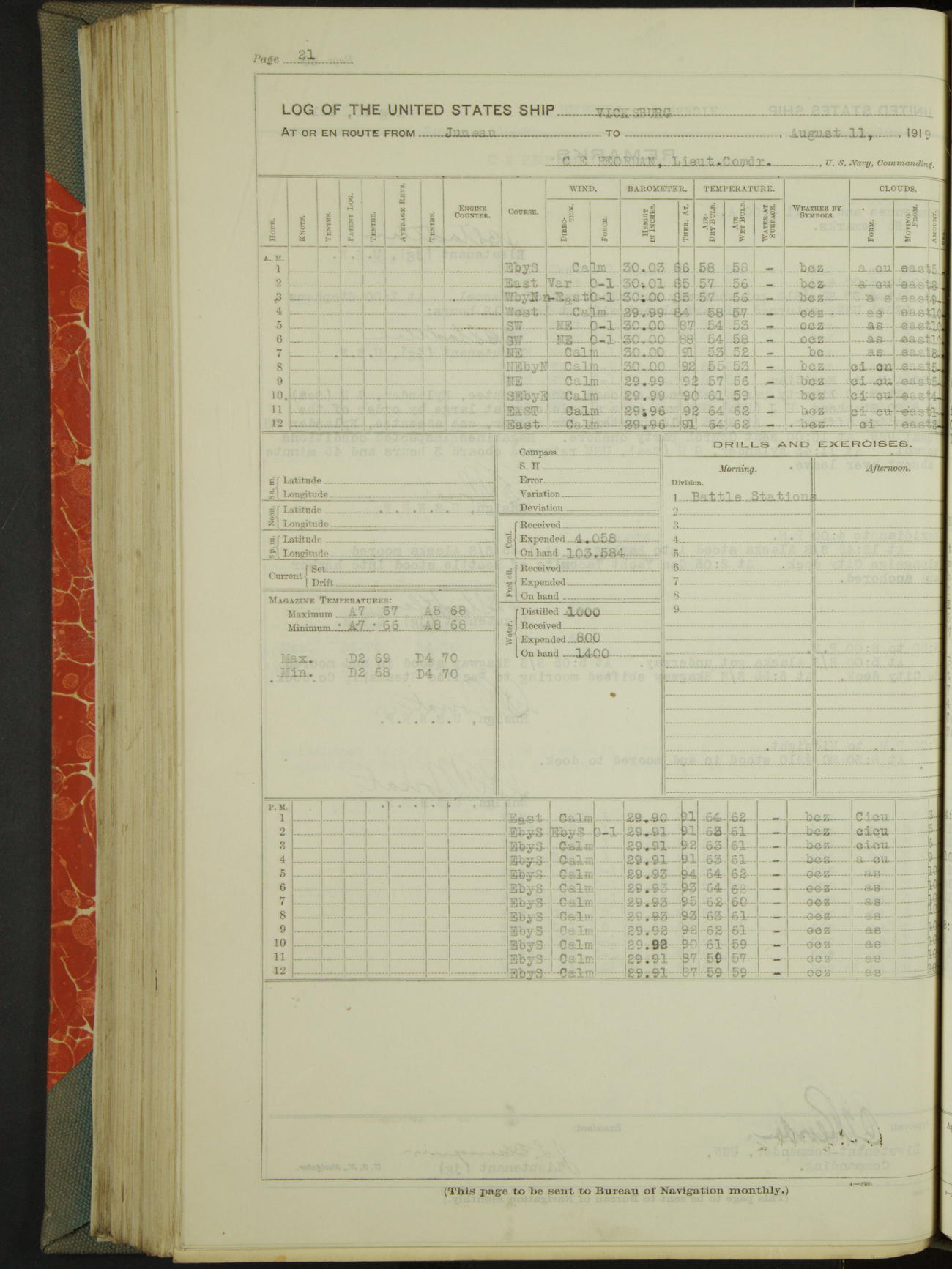 Log BoLog book of the USS "Vicksburg", 3rd rate, commanded by Charles E Reordan, Lieutenet Commander, US Navy, Second Division, Pacific Fleet, Commencing January 1st, 1919, at 1.0am, and ending January 31st, 1919, at Midnight