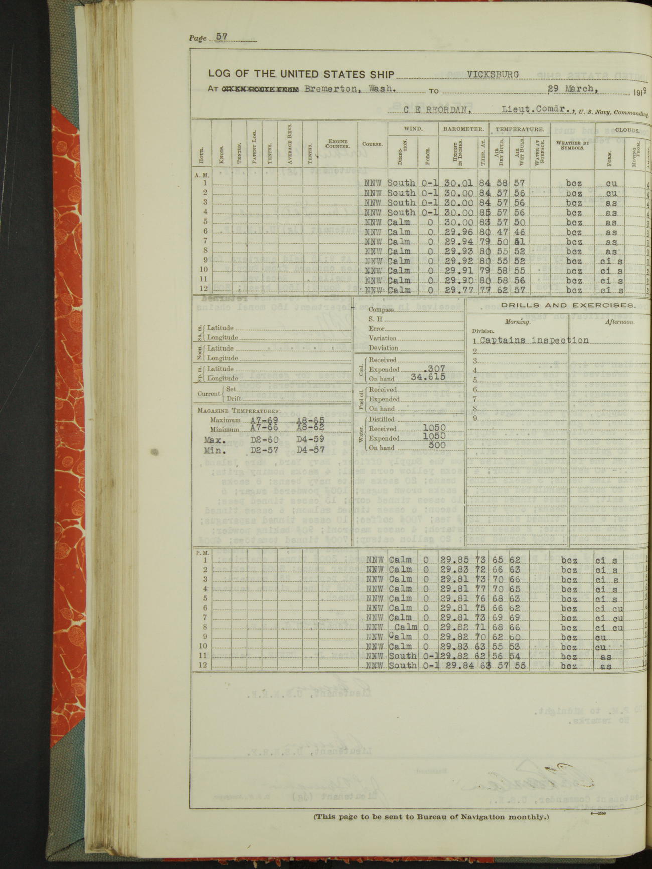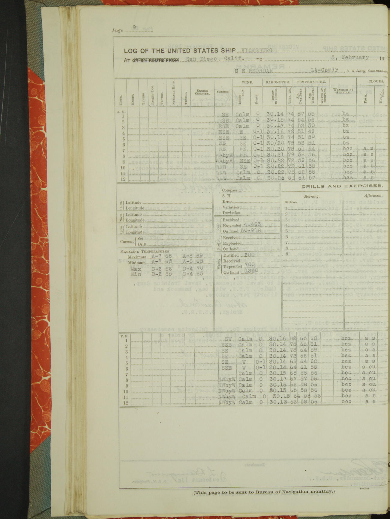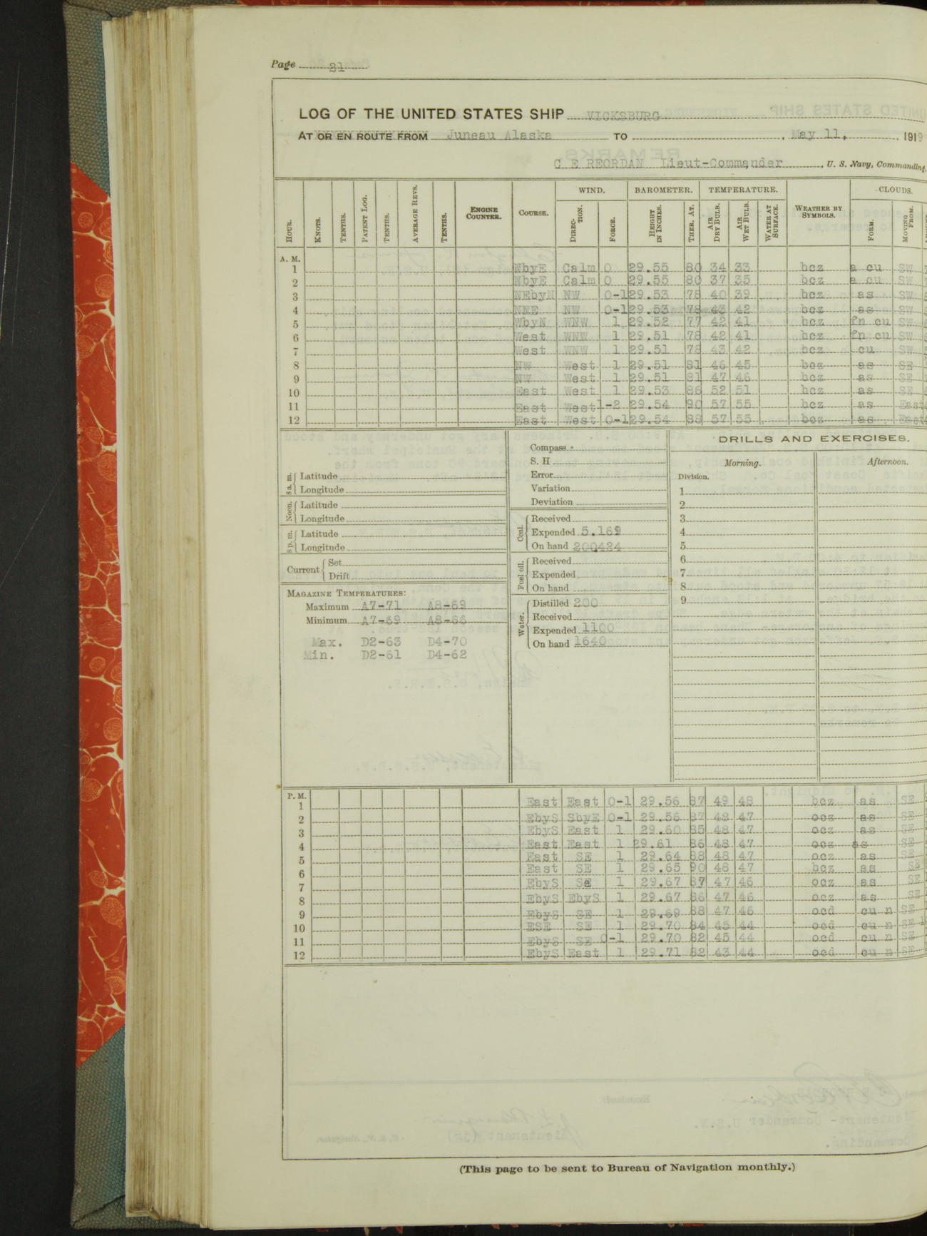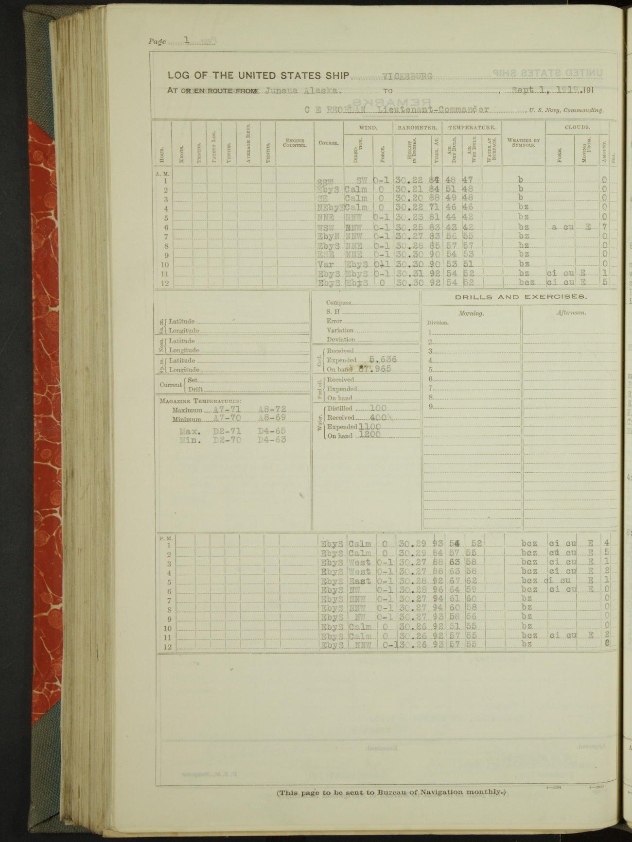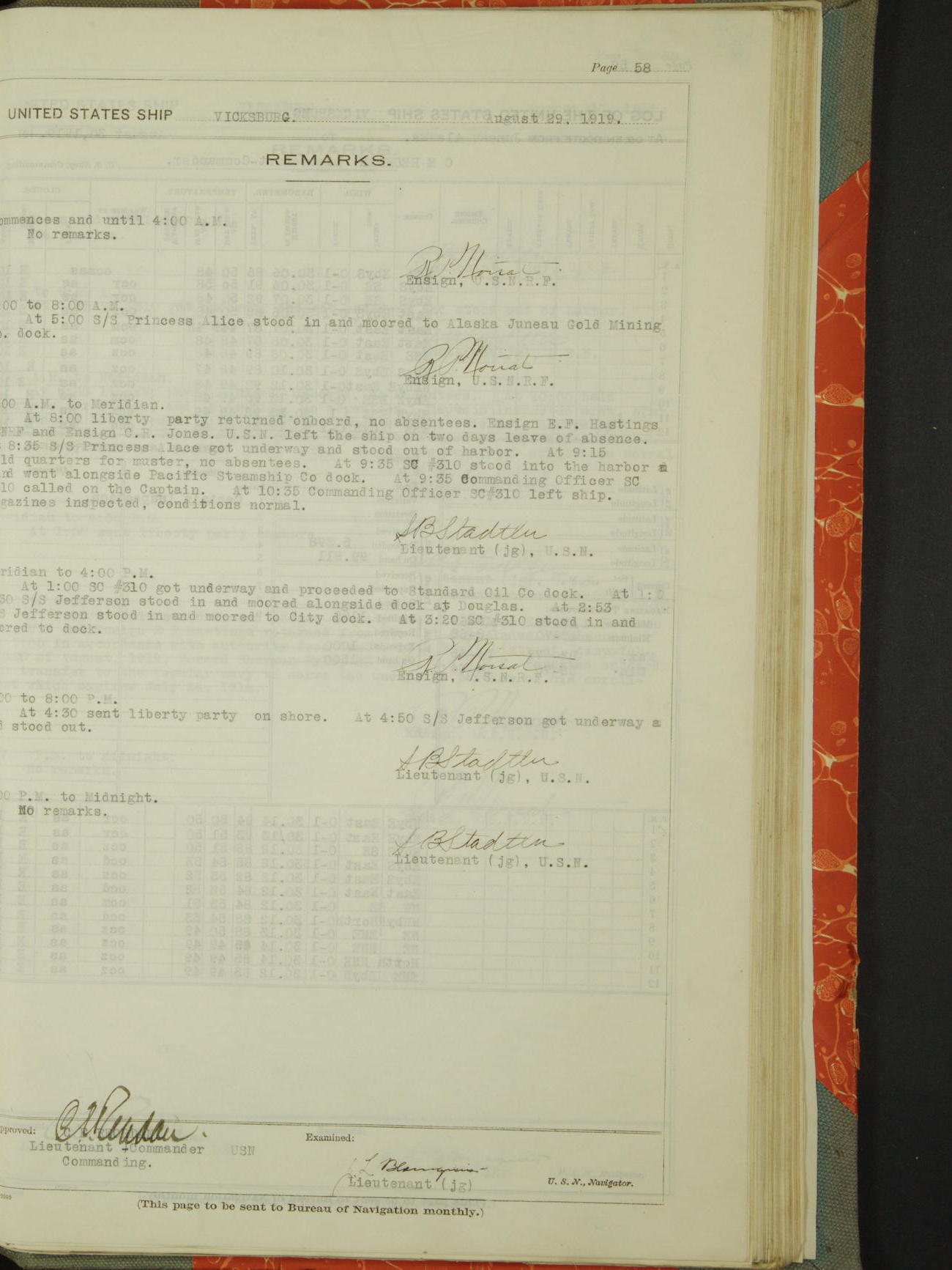 Log BoLog book of the USS "Vicksburg", 3rd rate, commanded by Charles E Reordan, Lieutenet Commander, US Navy, Second Division, Pacific Fleet, Commencing January 1st, 1919, at 1.0am, and ending January 31st, 1919, at Midnight