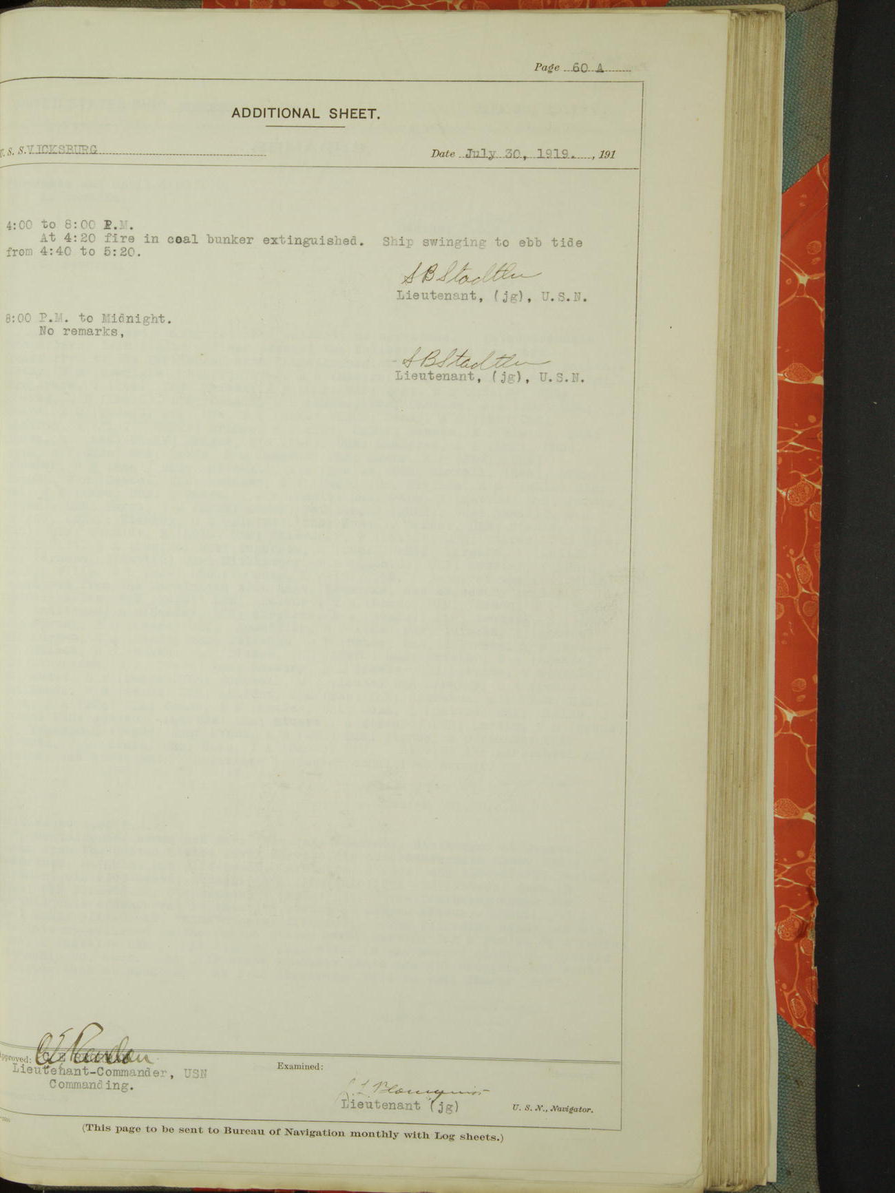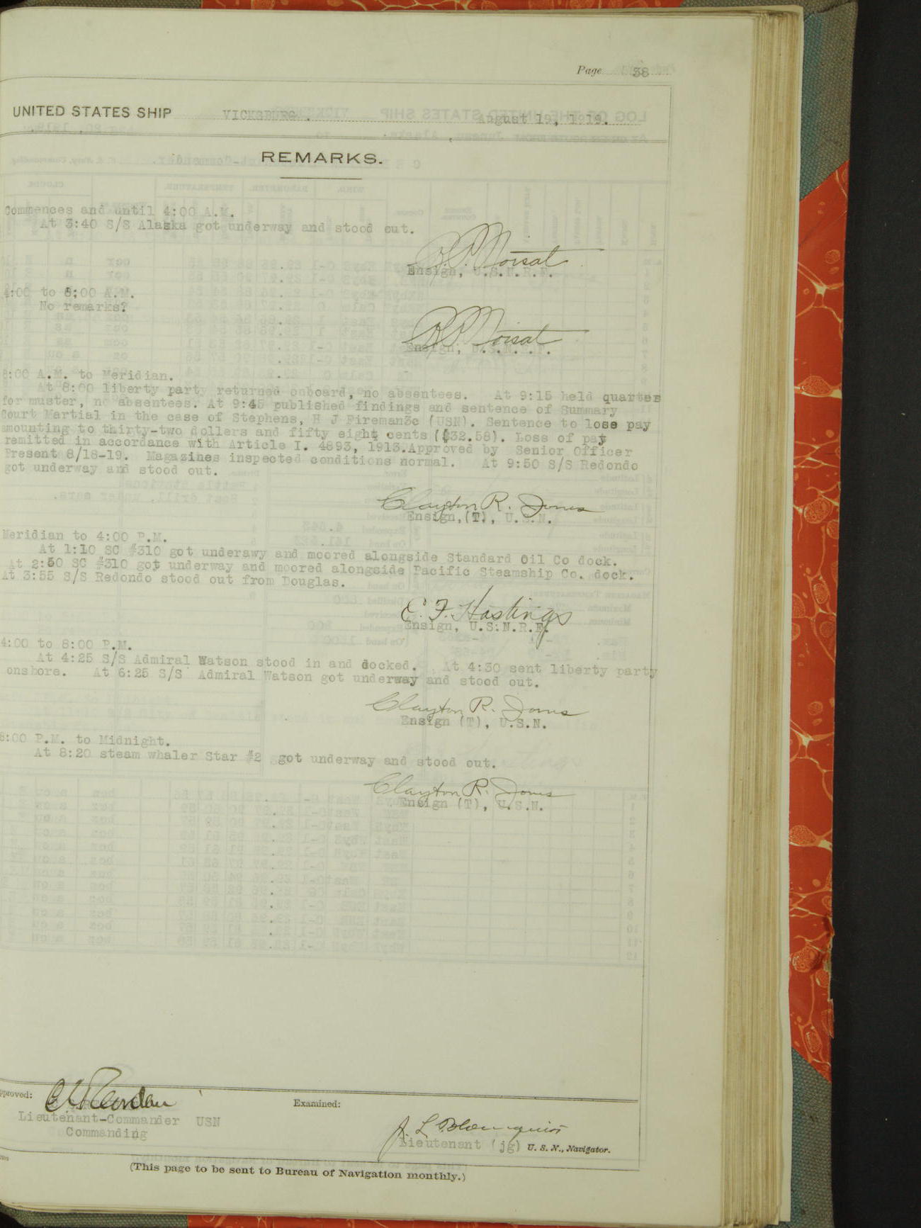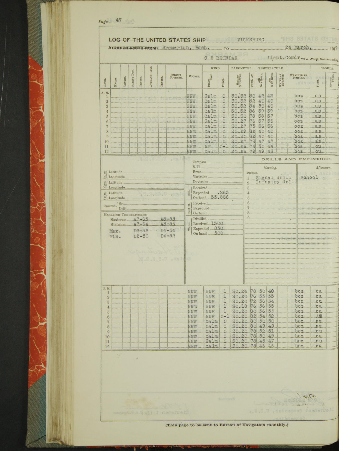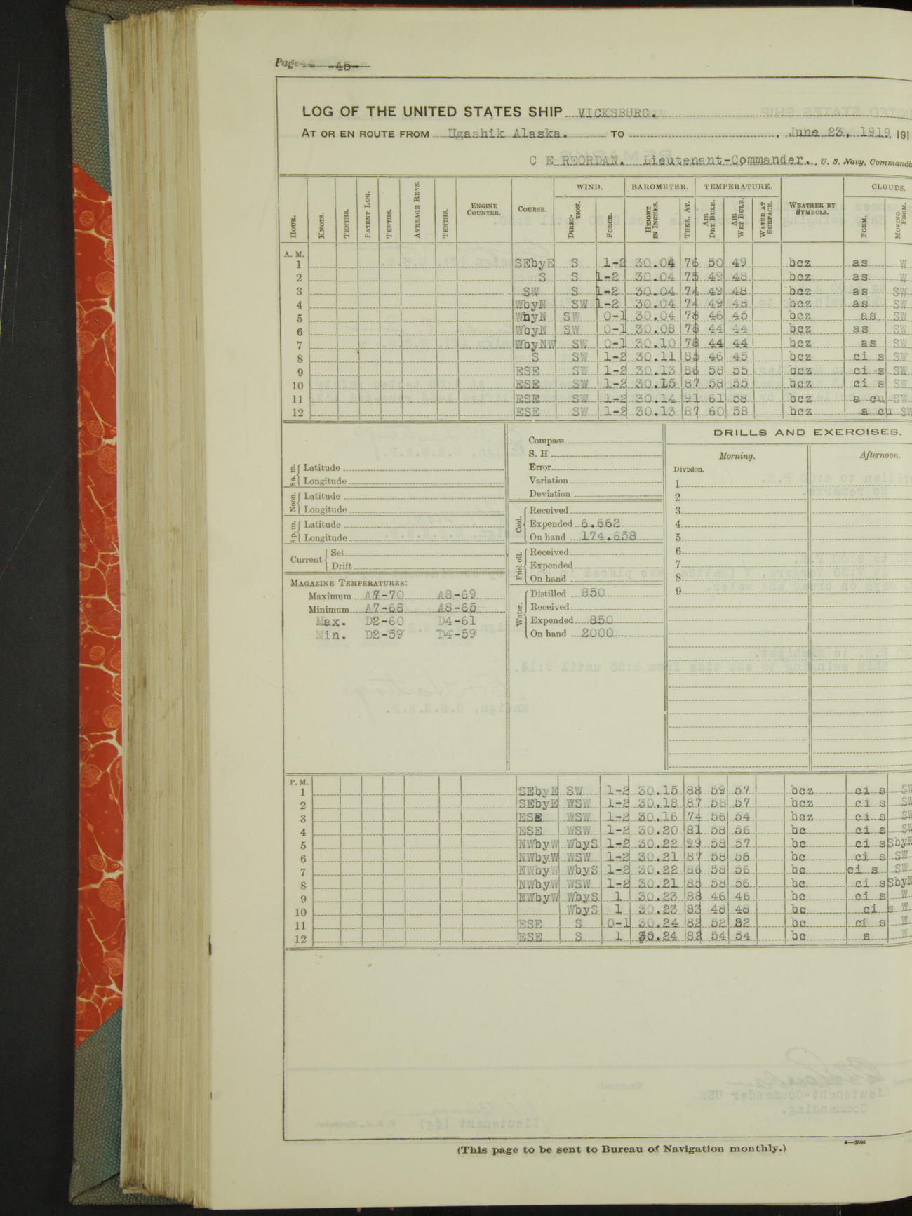 Log BoLog book of the USS "Vicksburg", 3rd rate, commanded by Charles E Reordan, Lieutenet Commander, US Navy, Second Division, Pacific Fleet, Commencing January 1st, 1919, at 1.0am, and ending January 31st, 1919, at Midnight