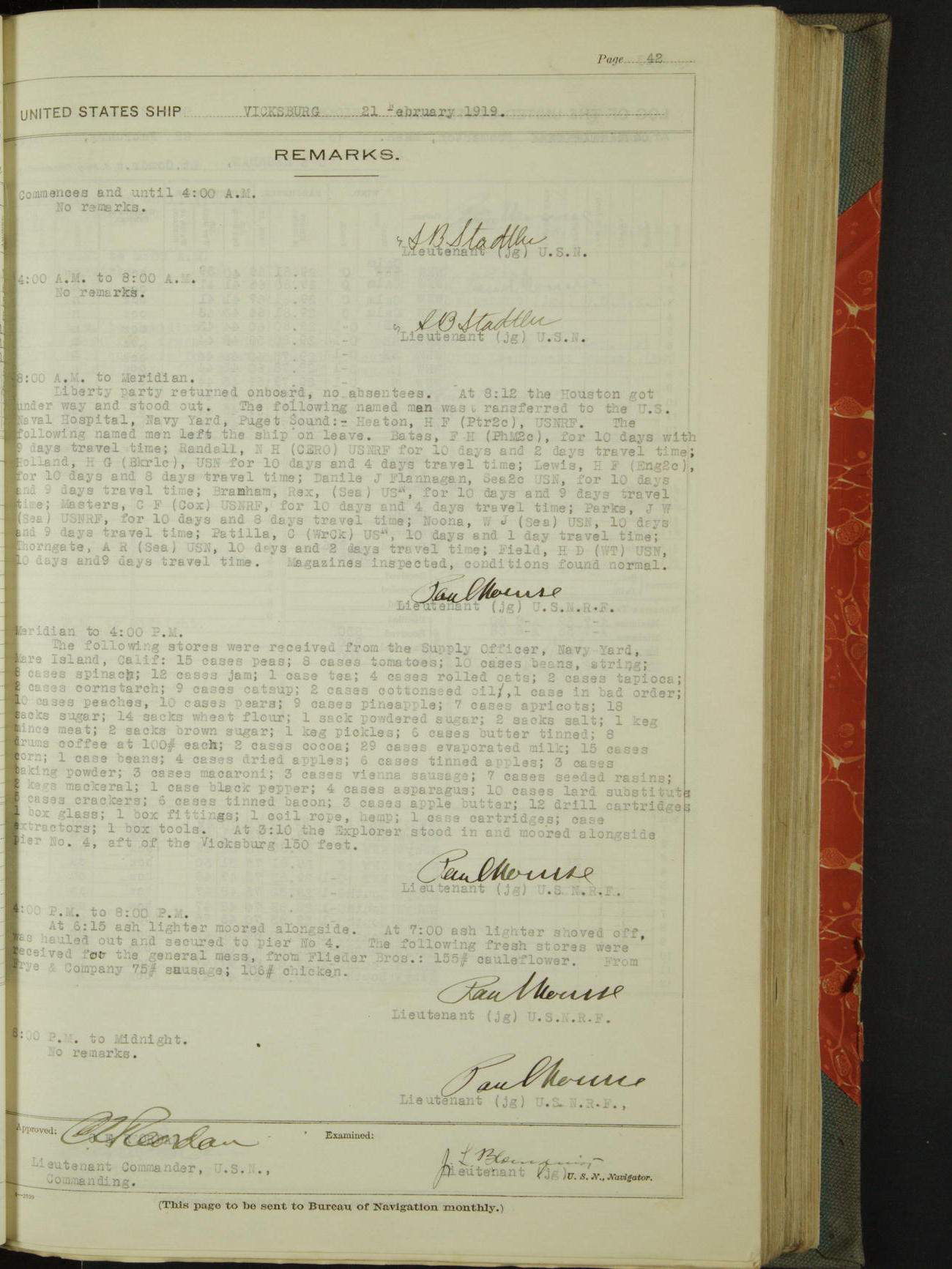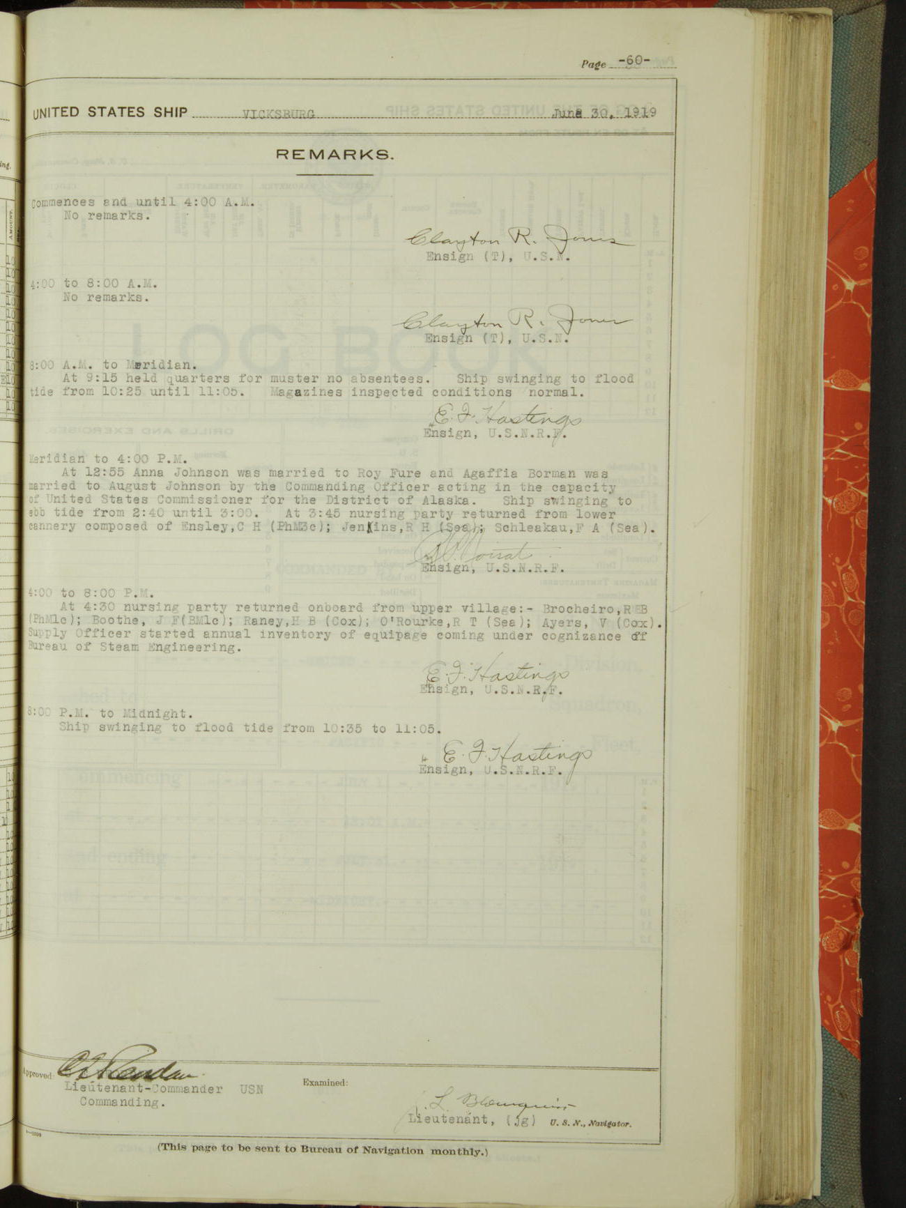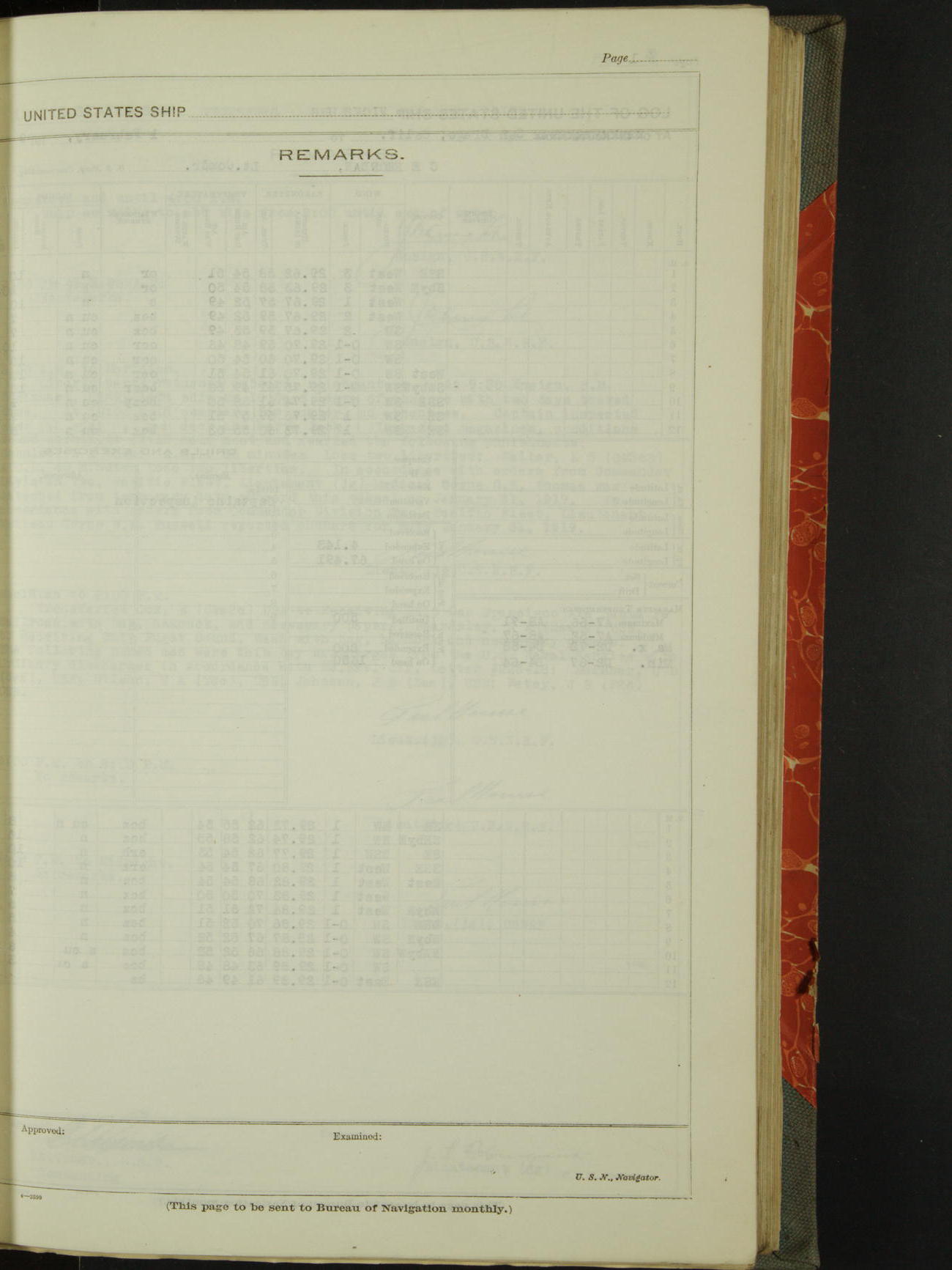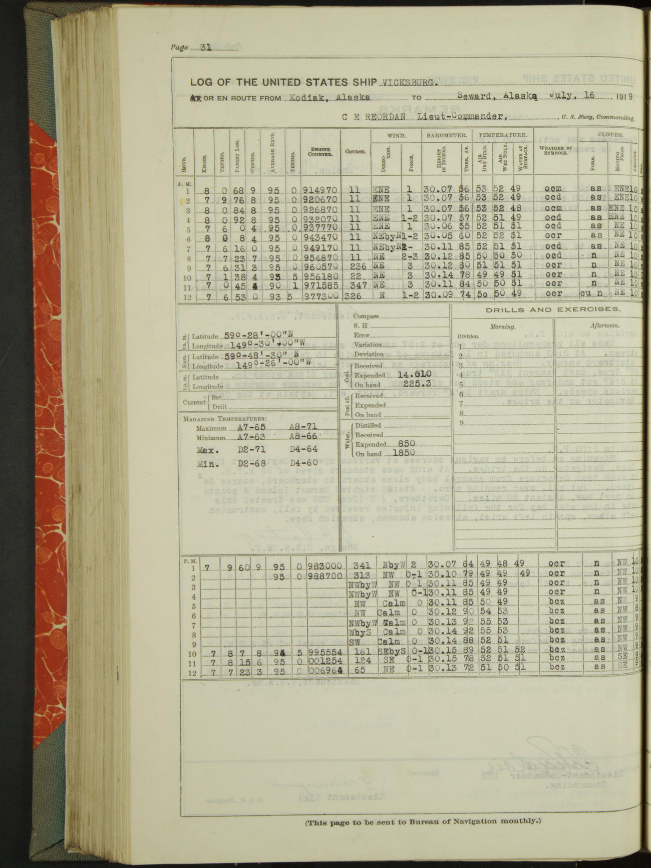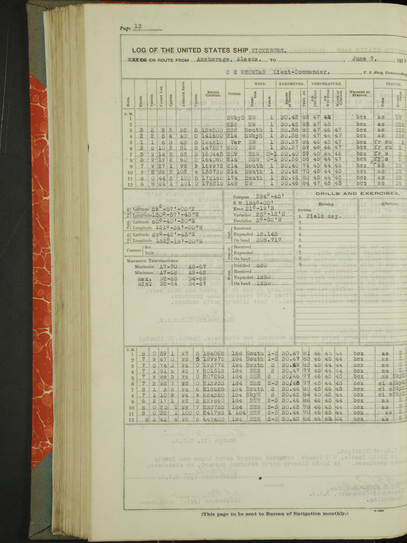 Log BoLog book of the USS "Vicksburg", 3rd rate, commanded by Charles E Reordan, Lieutenet Commander, US Navy, Second Division, Pacific Fleet, Commencing January 1st, 1919, at 1.0am, and ending January 31st, 1919, at Midnight